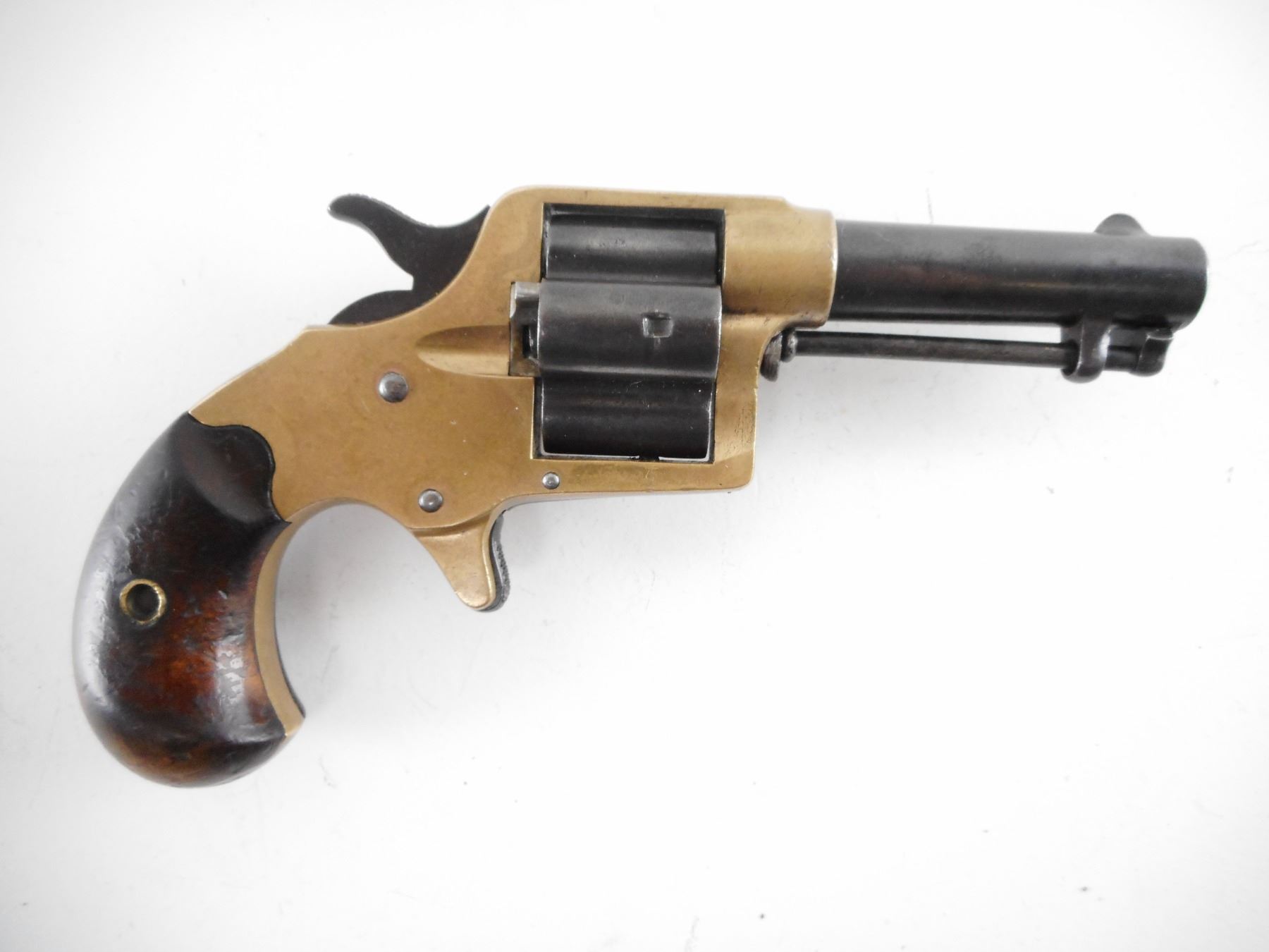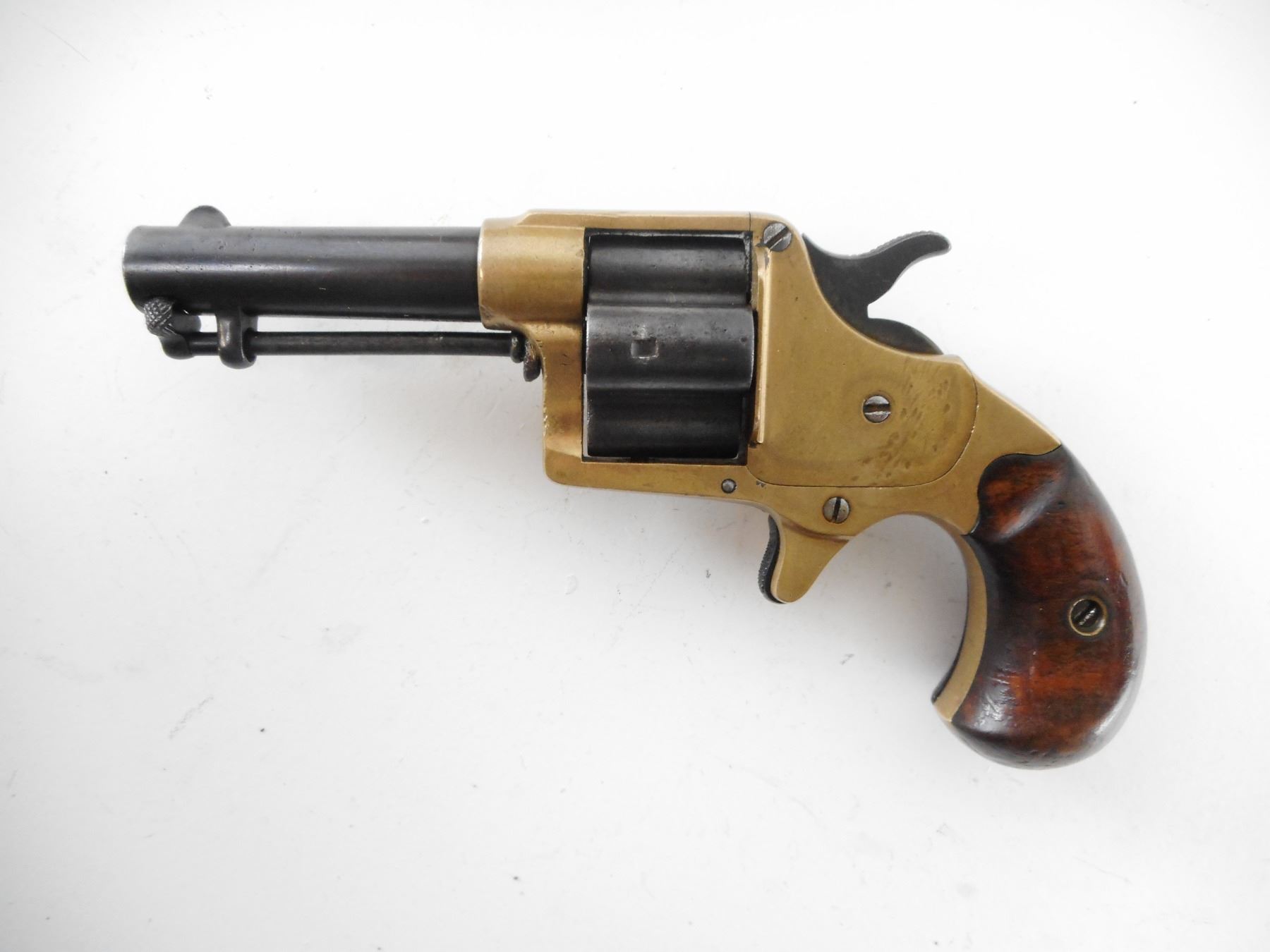 COLT , MODEL: HOUSE PISTOL AKA CLOVERLEAF PISTOL , CALIBER: 41 LONG RIM FIRE , MANUFACTURE 1871 FIRST YEAR OF PRODUCTION. BORE IS GOOD. BLADE FRONT SIGHT AND NOTCH REAR SIGHT. TWO PIECE WOOD GRIPS. BRASS FRAME. HOLDS COCK, SINGLE ACTION ARMY. SHOWS SOME HANDLING MARKS. , ACTION: REVOLVER , BARREL LENGTH: 76MM , SERIAL# 3462 , CONDITION:7/10 ANTIQUE , CLASS: NO LICENSE REQUIRED TO PURCHASE