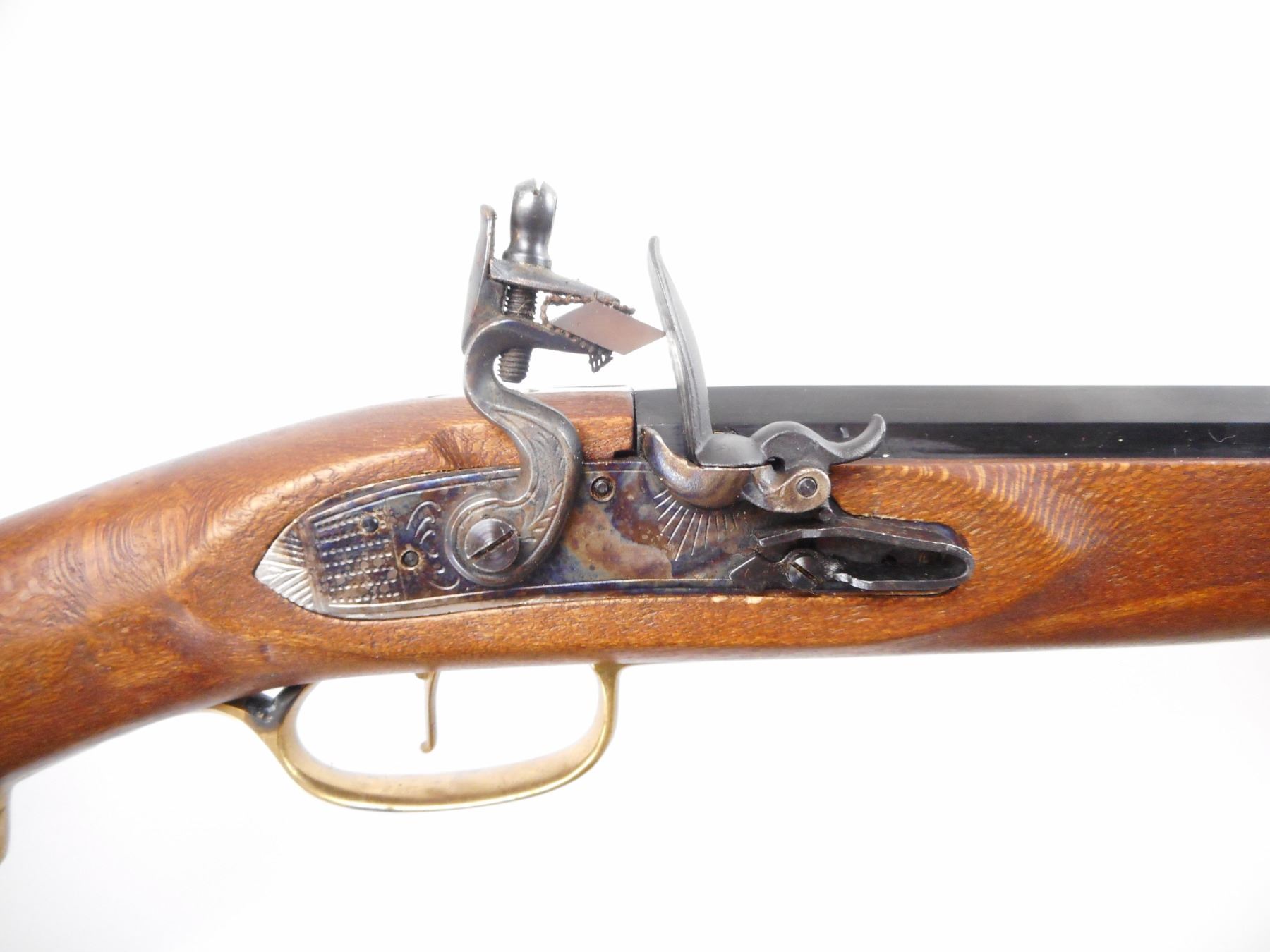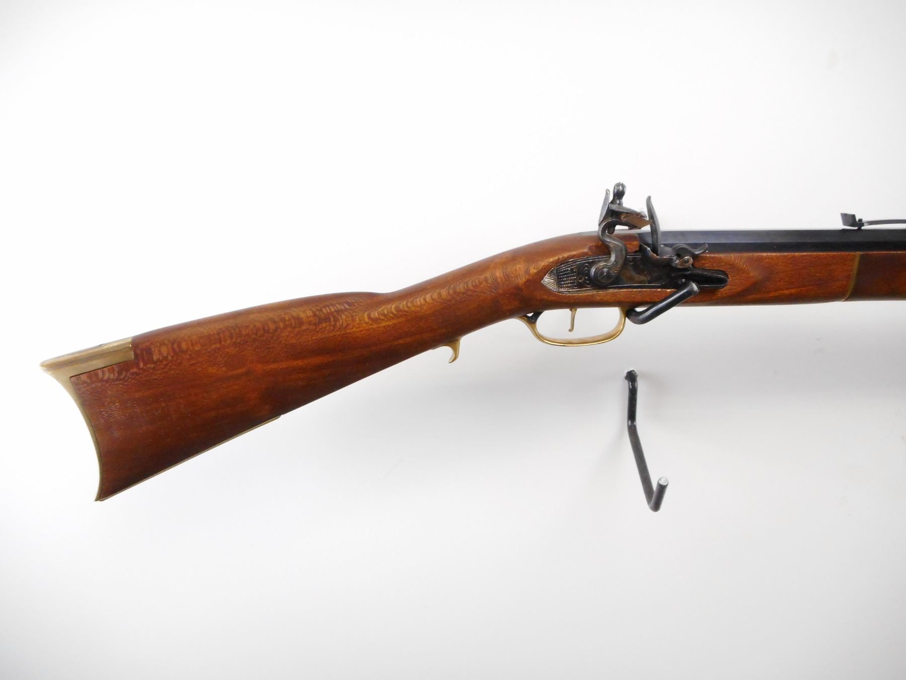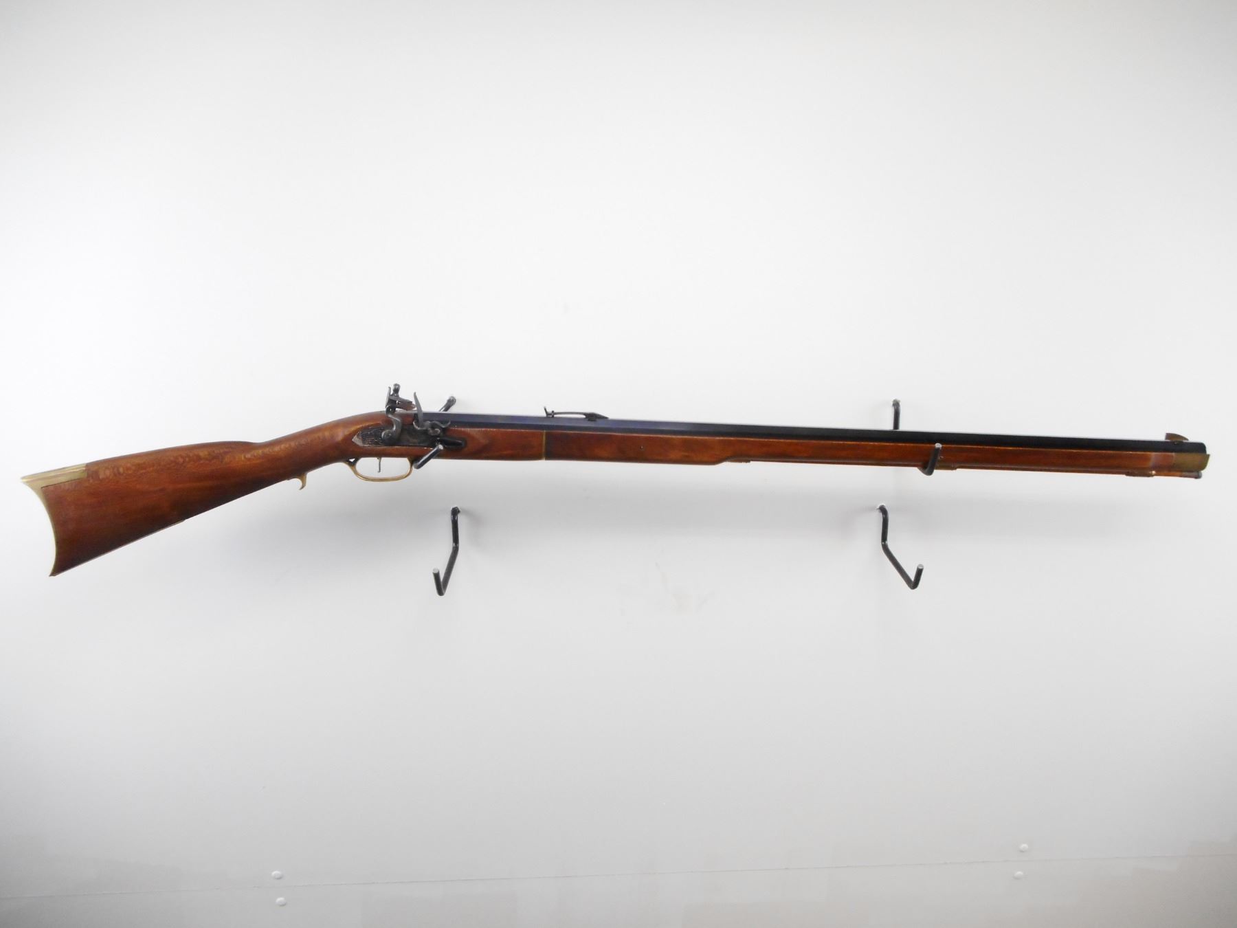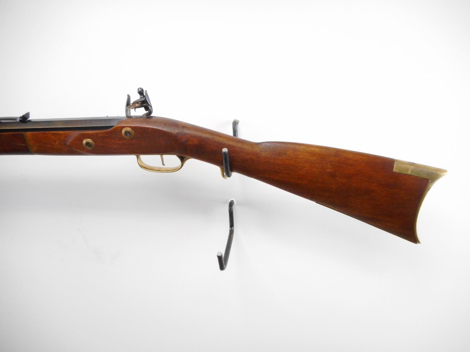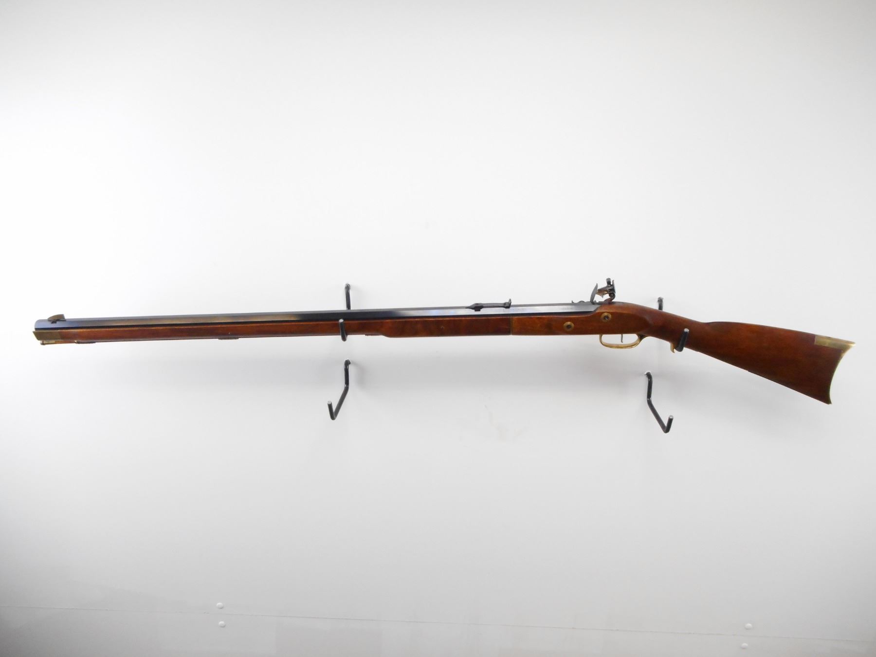 DIKAR , MODEL: KENTUCKY RIFLE , CALIBER: 45 CAL , BORE IS VERY GOOD. BLADE FRONT SIGHT. ADJUSTABLE U NOTCH REAR SIGHT. BLUE OCTAGONAL BARREL. TWO PIECE SMOOTH WOOD STOCK. BRASS BUTT PLATE. TRIGGER GUARD. FOREND CAP. WOOD RAM ROD WITH THREE PIPES. BLUEING SHOWS SOME HANDLING MARKS AND WEAR. STOCK SHOWS SOME HANDLING MARKS AND WEAR , ACTION: FLINT LOCK , BARREL LENGTH: 32" , SERIAL# 213935 , CONDITION:7/10 ANTIQUE , CLASS: NO LICENSE REQUIRED TO PURCHASE
