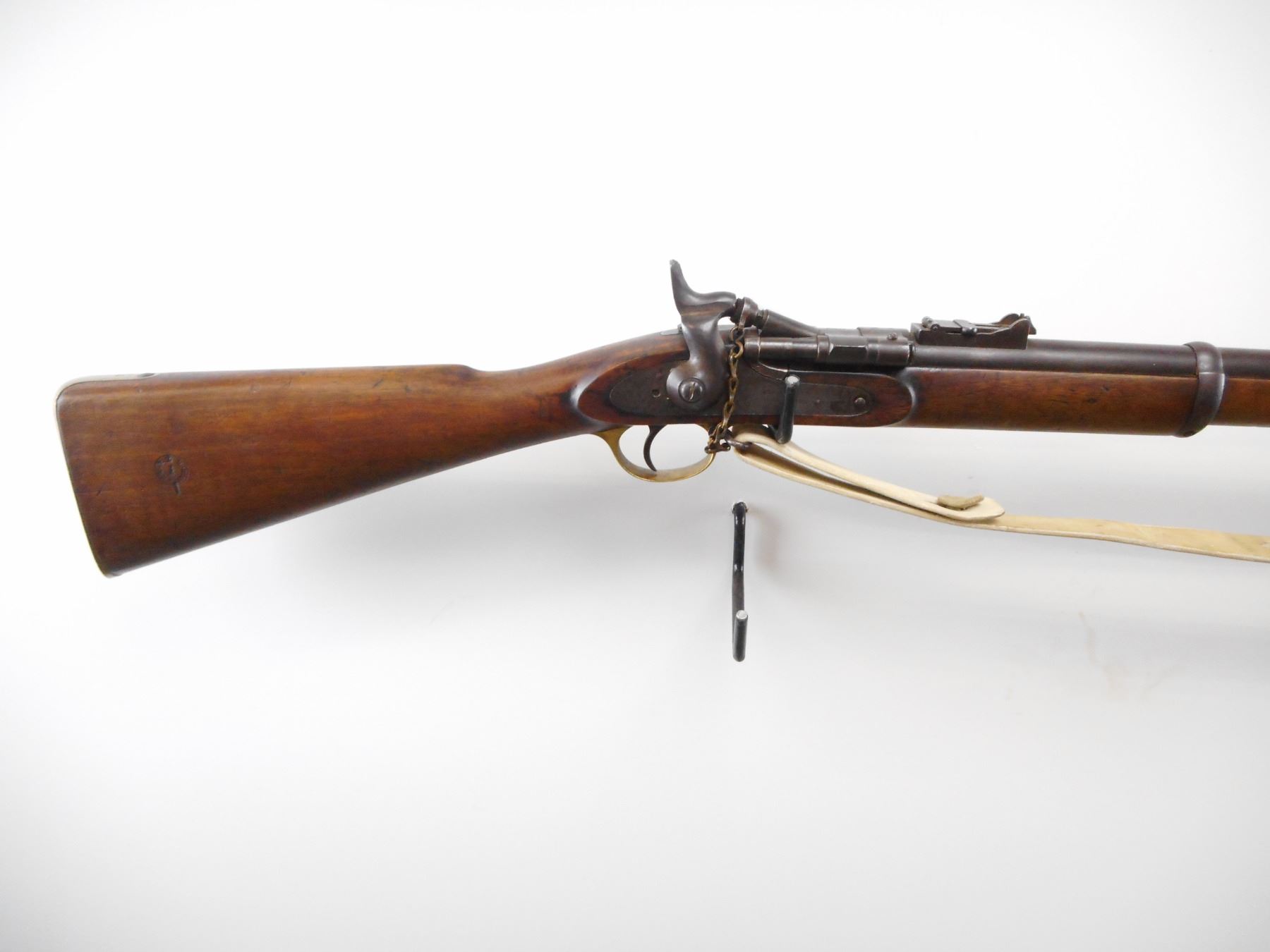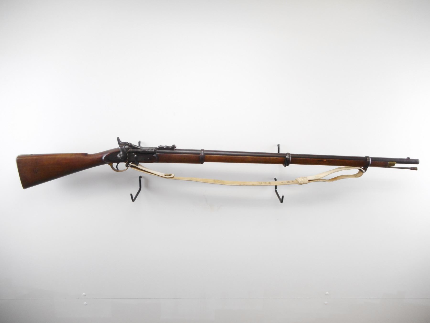 SNIDER , MODEL: MK II 3 BAND , CALIBER: 577 SNIDER , BORE IS GOOD, LIGHT PITTING. MFG'D BY ENFIELD. 1864. COMES WITH WHITE LEATHER SLING. BLADE FRONT SIGHT. U NOTCH LADDER REAR SIGHT. NIPPLE PROTECTOR WITH CHAIN. ONE PIECE SMOOTH FULL MILITARY STOCK. BRASS BUTT PLATE AND TRIGGER GUARD. LEFT SIDE OF STOCK MARKED DC IN A DIAMOND. SS VIKING, 4. RAM ROD. METAL FINISH TURNING BROWN, SOME WEAR. STOCK HAD NUMEROUS HANDLING MARKS AND DINGS. , ACTION: HINGE SINGLE SHOT , BARREL LENGTH: 35" , SERIAL# N/A , CONDITION:6/10 ANTIQUE , CLASS: NO LICENSE REQUIRED TO PURCHASE