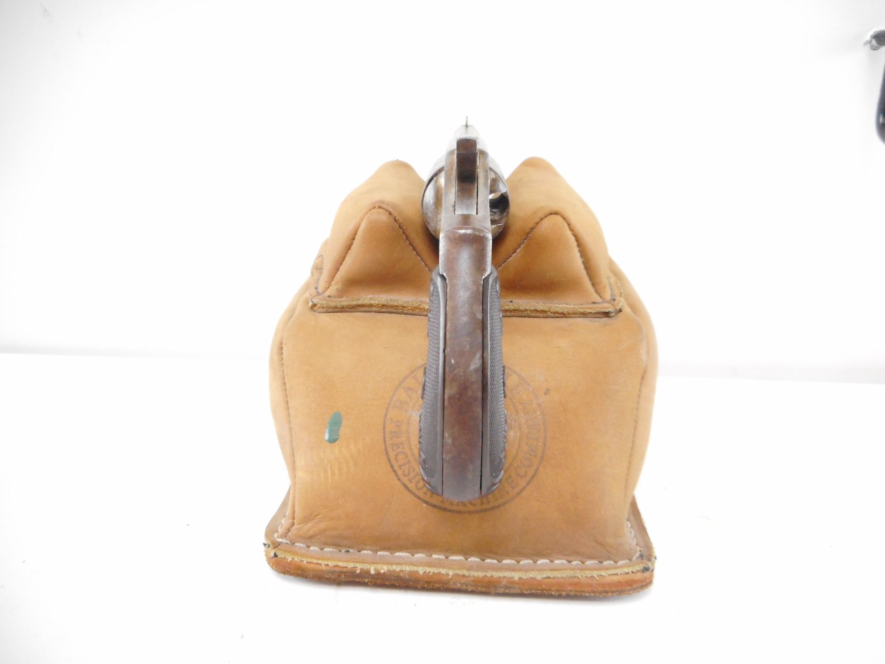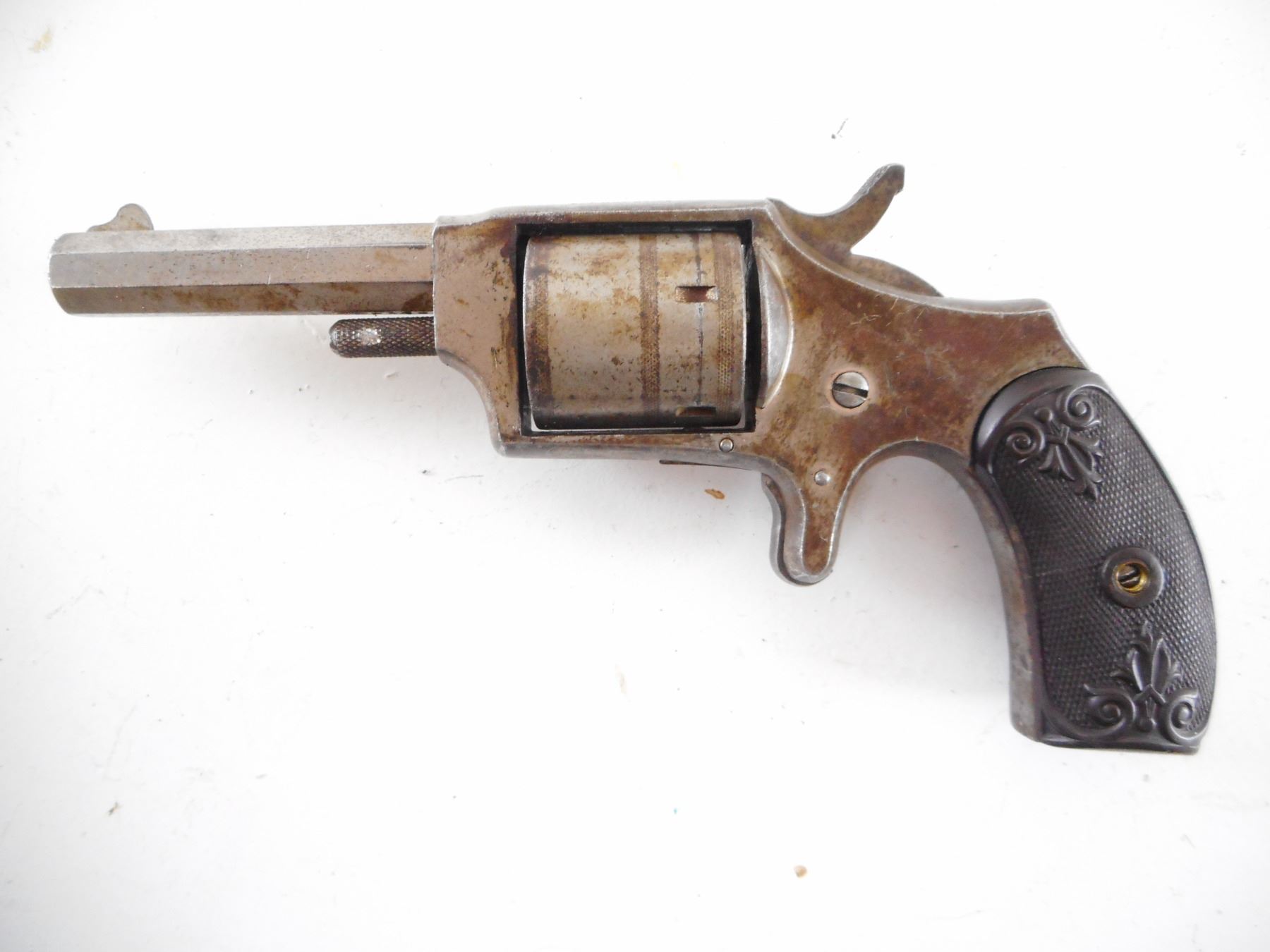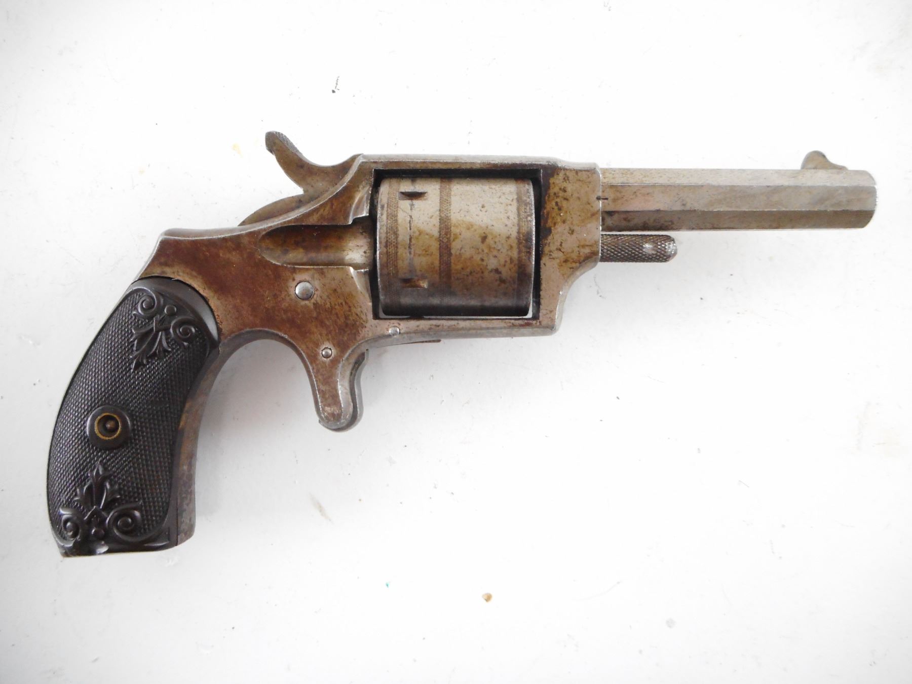 HOPKINS & ALLEN , MODEL: DICTATOR , CALIBER: 32 RIM FIRE , BORE IS DARK. BLADE FRONT AND NO REAR SIGHT. CHECKERED BROWN PLASTIC GRIPS THAT ARE EXTENSIVLY CHIPPED AND CRACKED. PREVIOUS OWNERS INITIALS ON LEFT SIDE OF THE RECEIVER. SHOWS EXTENSIVE HANDLING MARKS. HOLDS COCK. SINGLE ACTION ONLY. , ACTION: REVOLVER , BARREL LENGTH: 73MM , SERIAL# N/A , CONDITION:4/10 ANTIQUE , CLASS: NO LICENSE REQUIRED TO PURCHASE