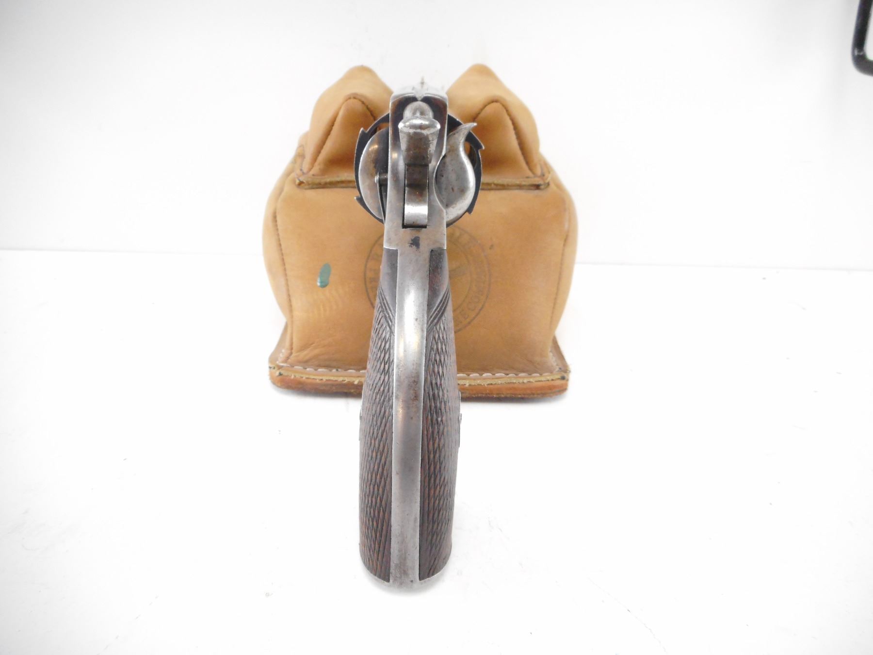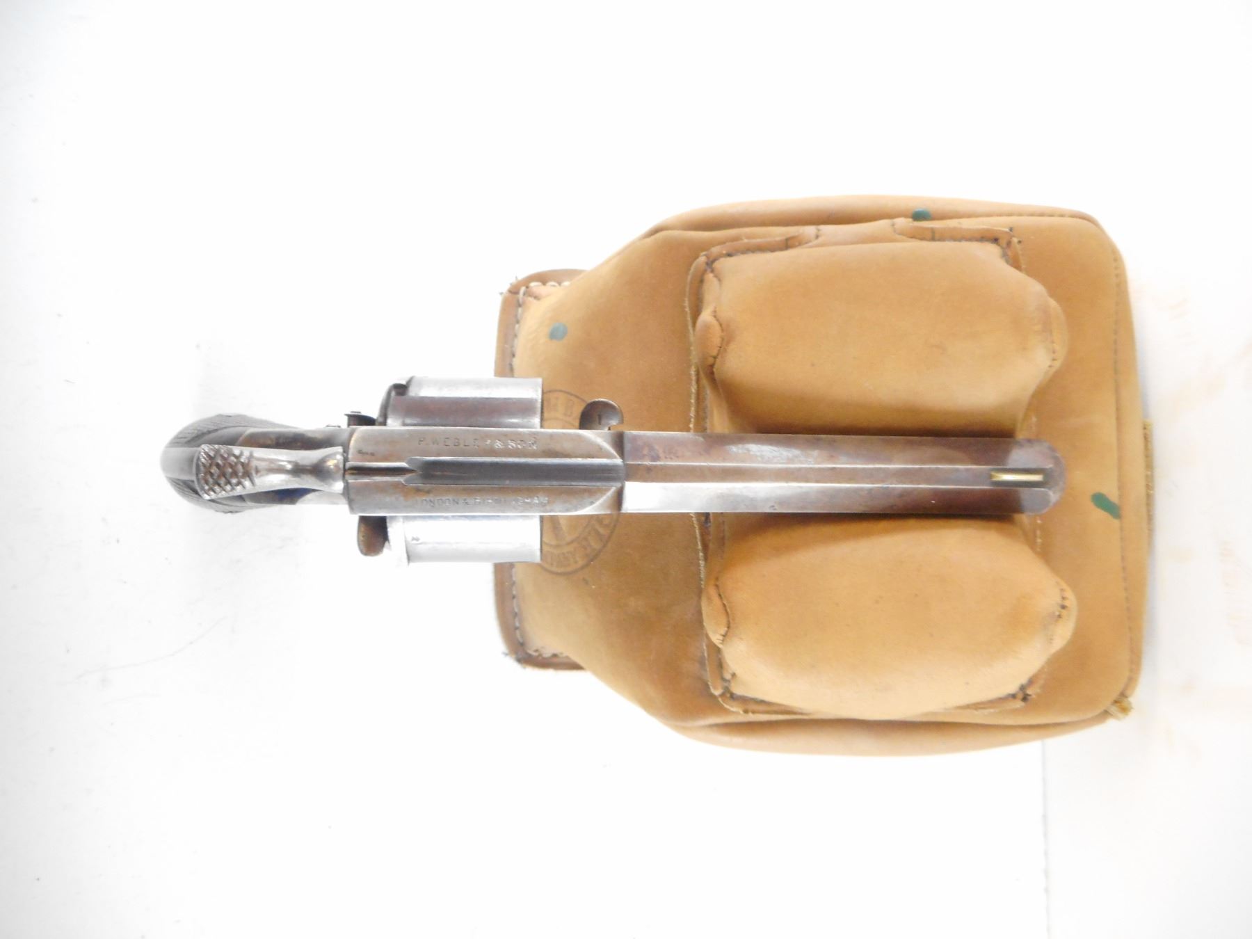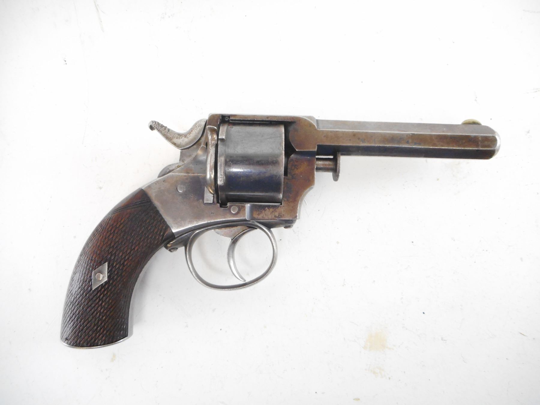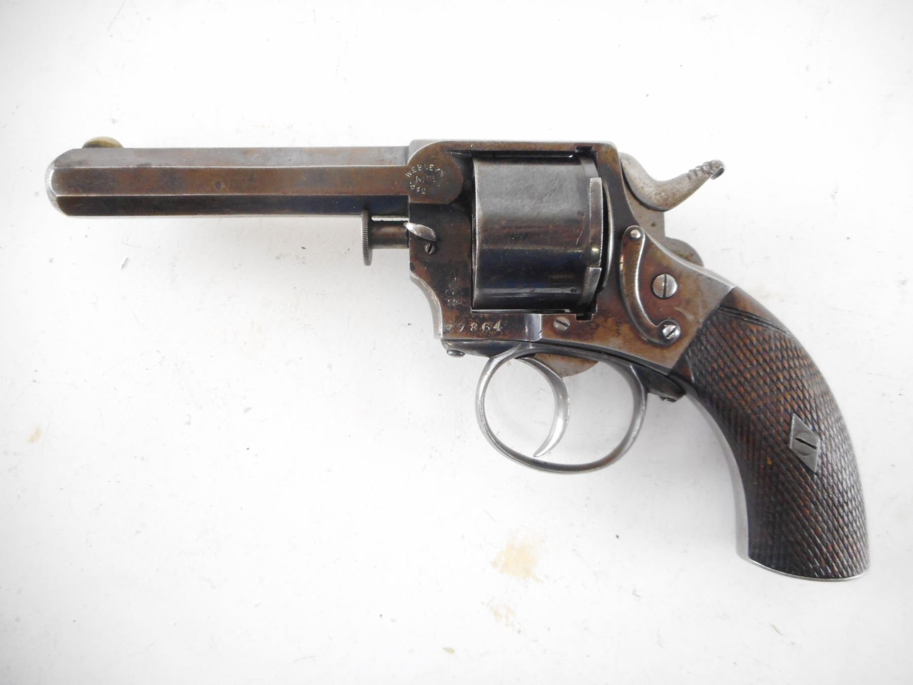 WEBLEY , MODEL: NO 1 1/2 , CALIBER: 442 REVOLVER , BORE IS GOOD WITH SHARP RIFLING. BLADE FRONT SIGHT AND NOTCH REAR SIGHT ON AN OCTAGONAL BARREL. CHECKERED TWO PIECE WOOD GRIPS, MISSING THE LANYARD LOOP. EARLY NON FLUTED CYLINDER. HOLDS COCK, INDEXES WELL, ACTION IS TIGHT. SHOWS SOME HANDLING MARKS. , ACTION: REVOLVER , BARREL LENGTH: 108MM , SERIAL# 27864 , CONDITION:7/10 ANTIQUE , CLASS: NO LICENSE REQUIRED TO PURCHASE