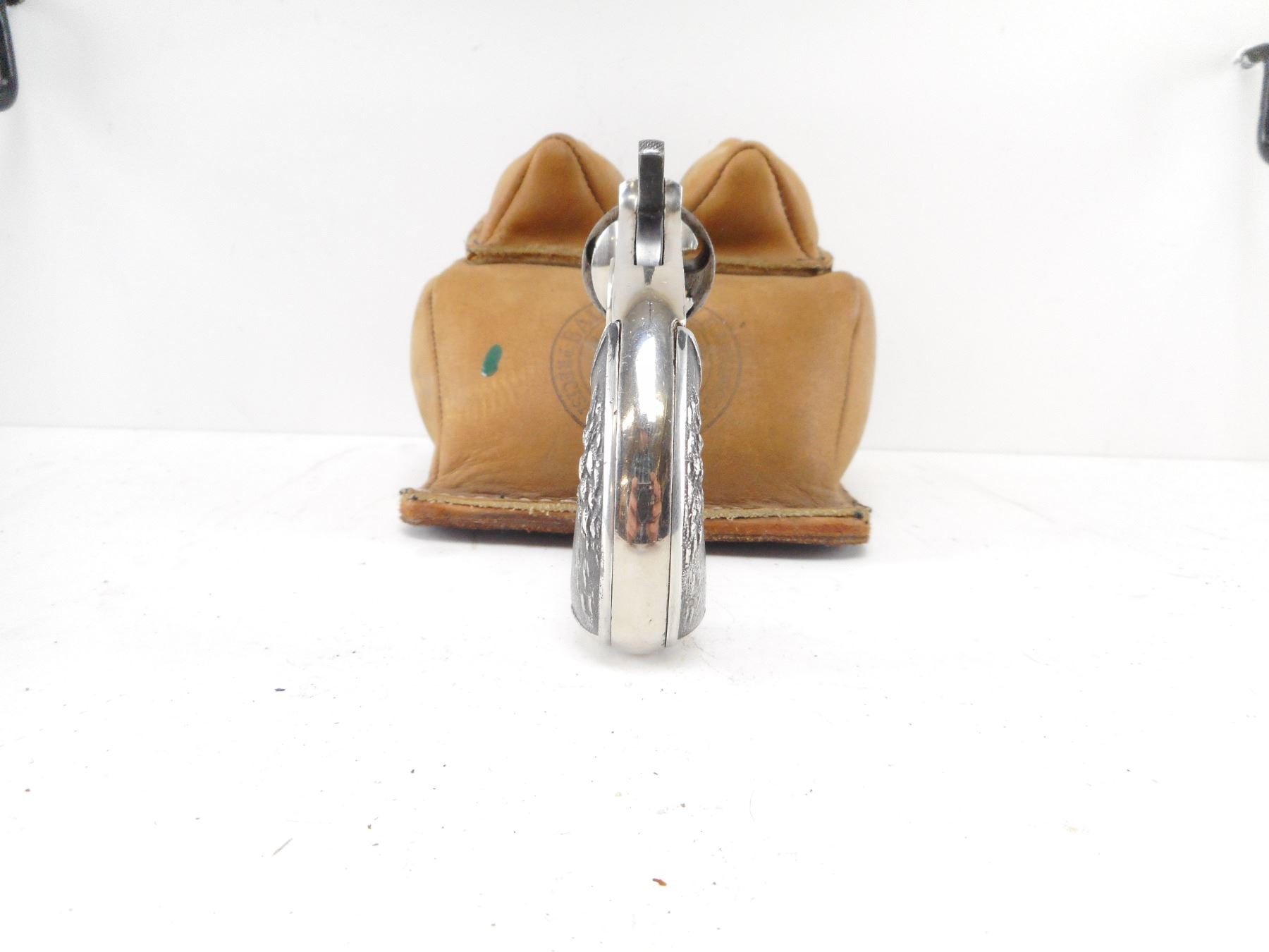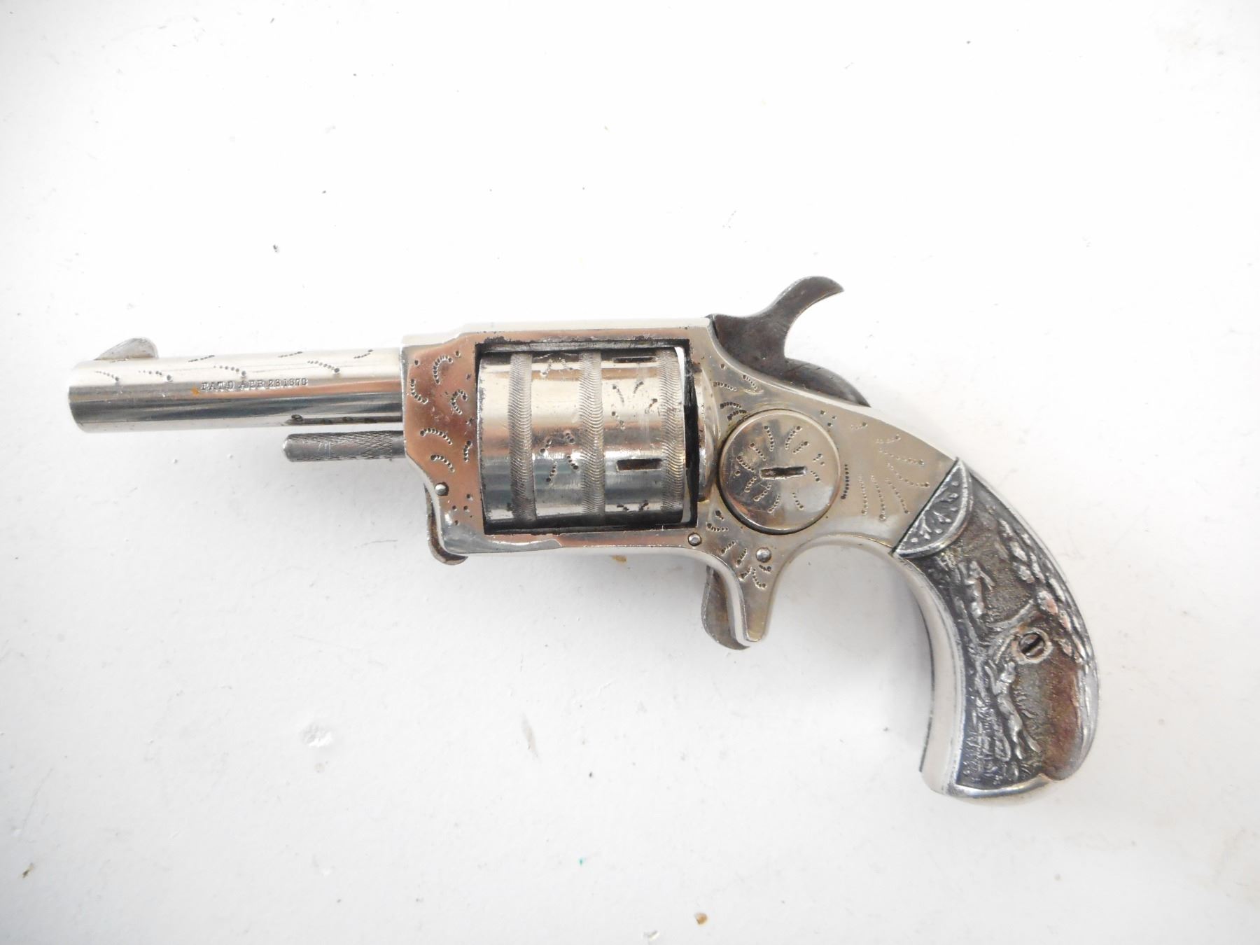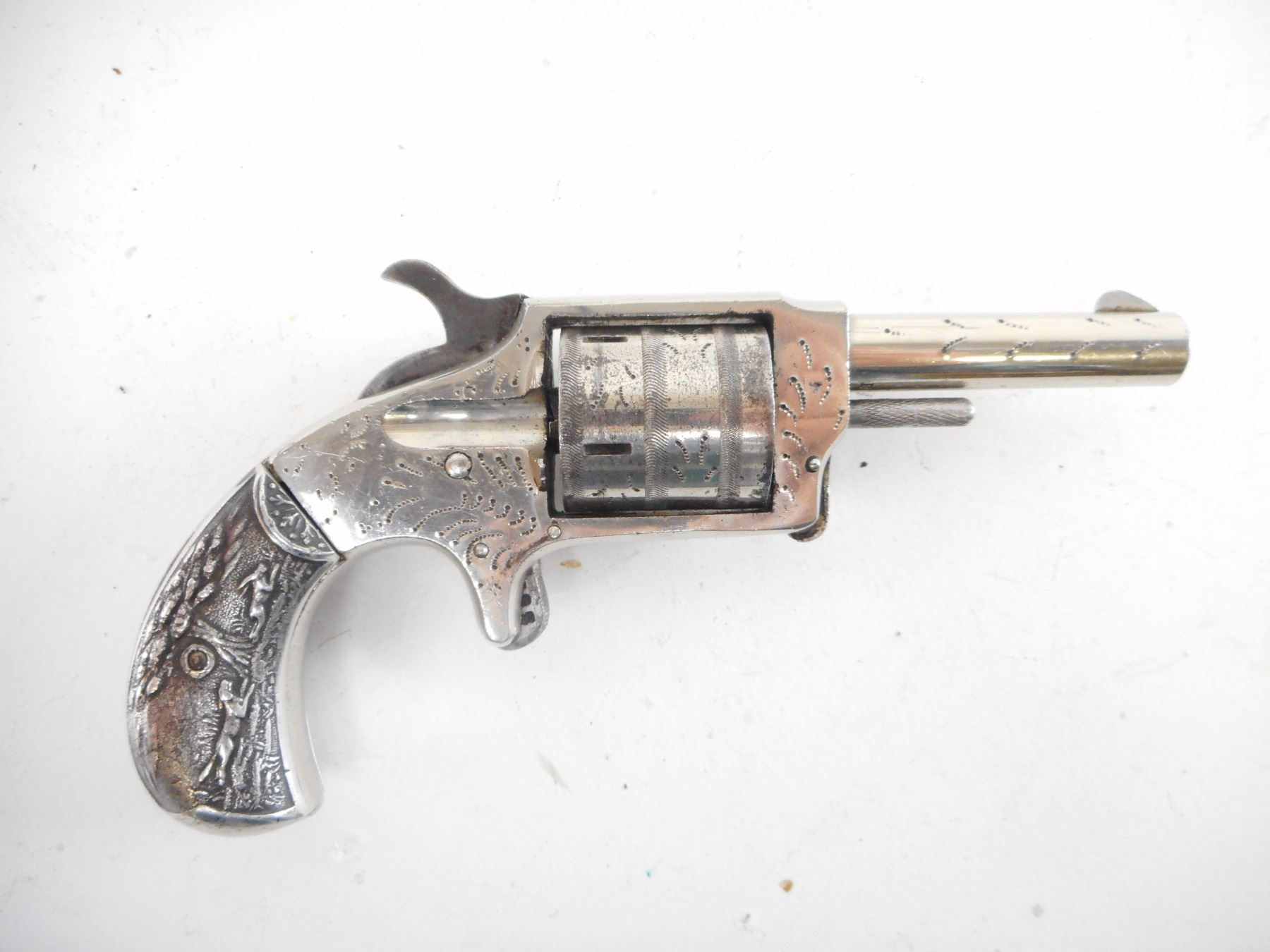 PROTECTOR , MODEL: PROTECTOR , CALIBER: 32 RIM FIRE , BORE IS GOOD WITH SOME LIGHT PITTING. BLADE FRONT SIGHT. NO REAR SIGHT. UNIQUE METAL GRIP PANELS WITH HUNTING SCENE. LIGHTLY ENGRAVED RECEIVER AND CYLINDER. HOLDS COCK, SINGLE ACTION ONLY. SHOWS SOME HANDLING MARKS. , ACTION: REVOVLER , BARREL LENGTH: 64MM , SERIAL# N/A , CONDITION:5/10 ANTIQUE , CLASS: NO LICENSE REQUIRED TO PURCHASE