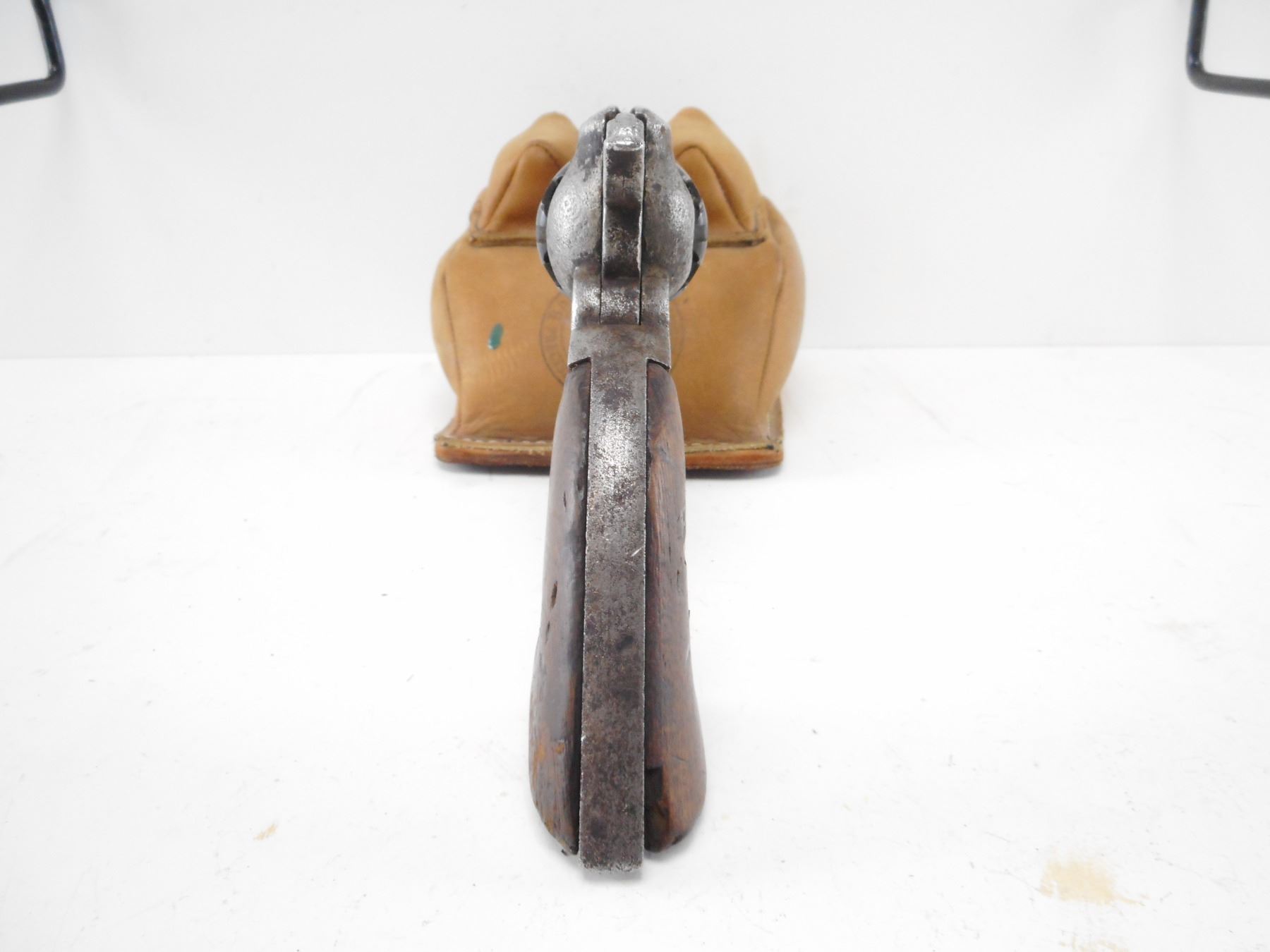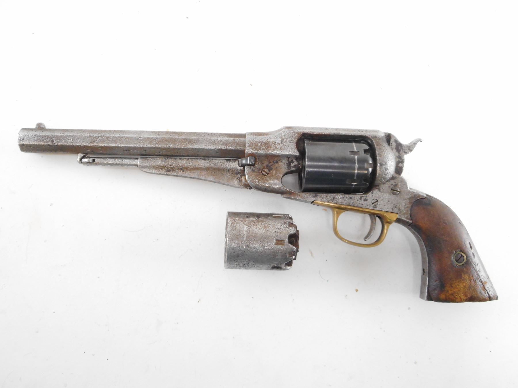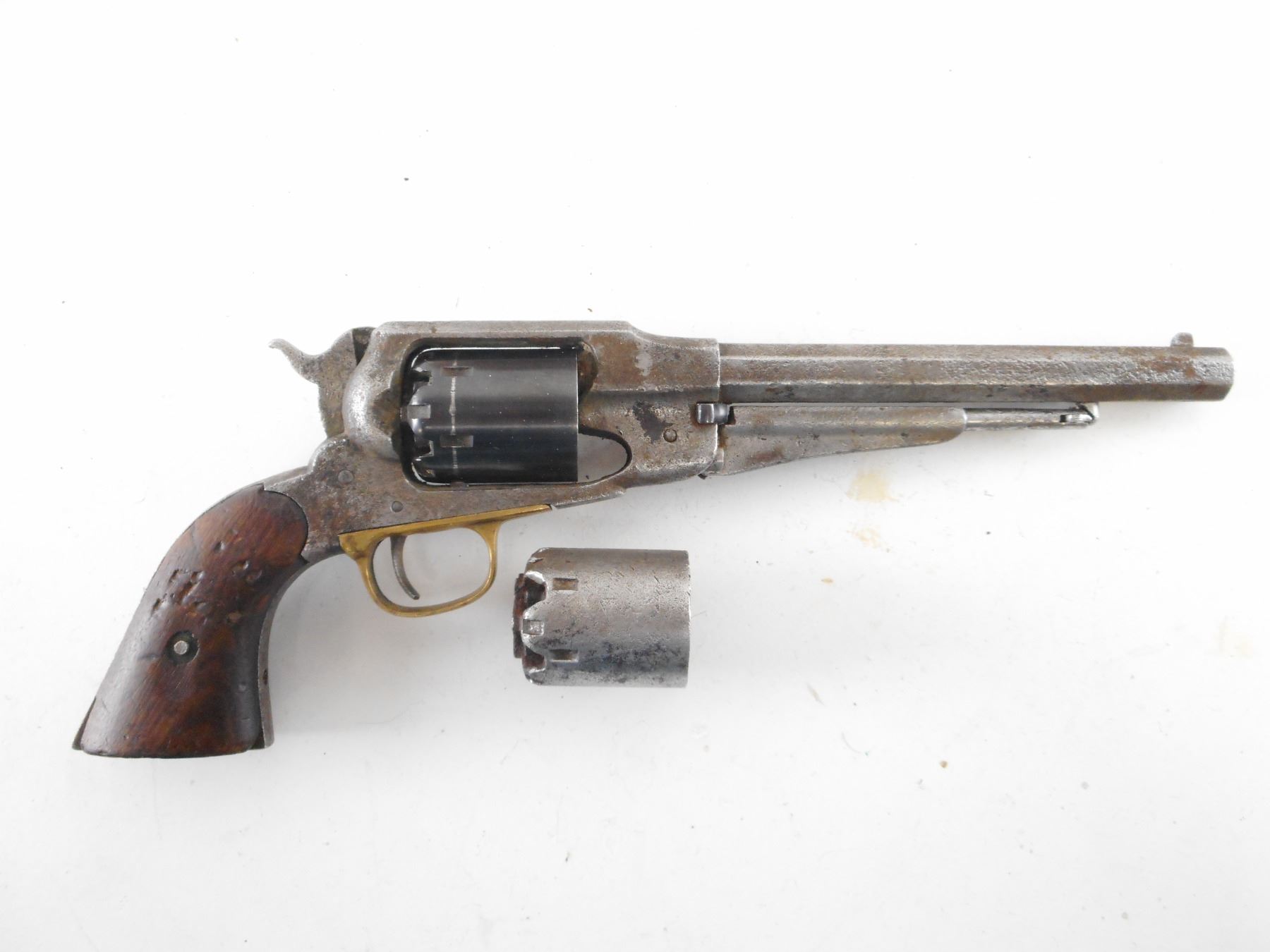REMINGTON , MODEL: NEW MODEL ARMY , CALIBER: 44 CAL PERC , COMES WITH REPLACEMENT CYLINDER INSTALLED. ORIGINAL CYLINDER IS PRESENT. BORE IS DARK. HOLDS COCK, SINGLE ACTION ONLY. BLADE FRONT SIGHT AND NOTCH REAR SIGHT. TWO PIECE WOOD GRIPS THAT ARE EXTENSIVLY CRACKED AND CHIPPED. EXTREMLY DEEP PITTED ON ALL METAL SURFACES. RELIC CONDITION. CONSIGNOR SAYS THEY HAD INFORMATION FROM REMINGTONS HISTORICAL RECORDS THAT SAID THIS WAS PURCHASED BY A CAPTAIN ON THE UNION SIDE DURING THE AMERICAN CIVIL WAR. SADLY THEY HAVE NOT BEEN ABLE TO FIND THIS INFORMATION AGAIN. MAYBE SOME RESEARCH WILL MAKE THIS A FANTASTIC PURCHASE FOR SOMEONE. , ACTION: REVOLVER , BARREL LENGTH: 203MM , SERIAL# 91022 , CONDITION:3/10 ANTIQUE , CLASS: NO LICENSE REQUIRED TO PURCHASE