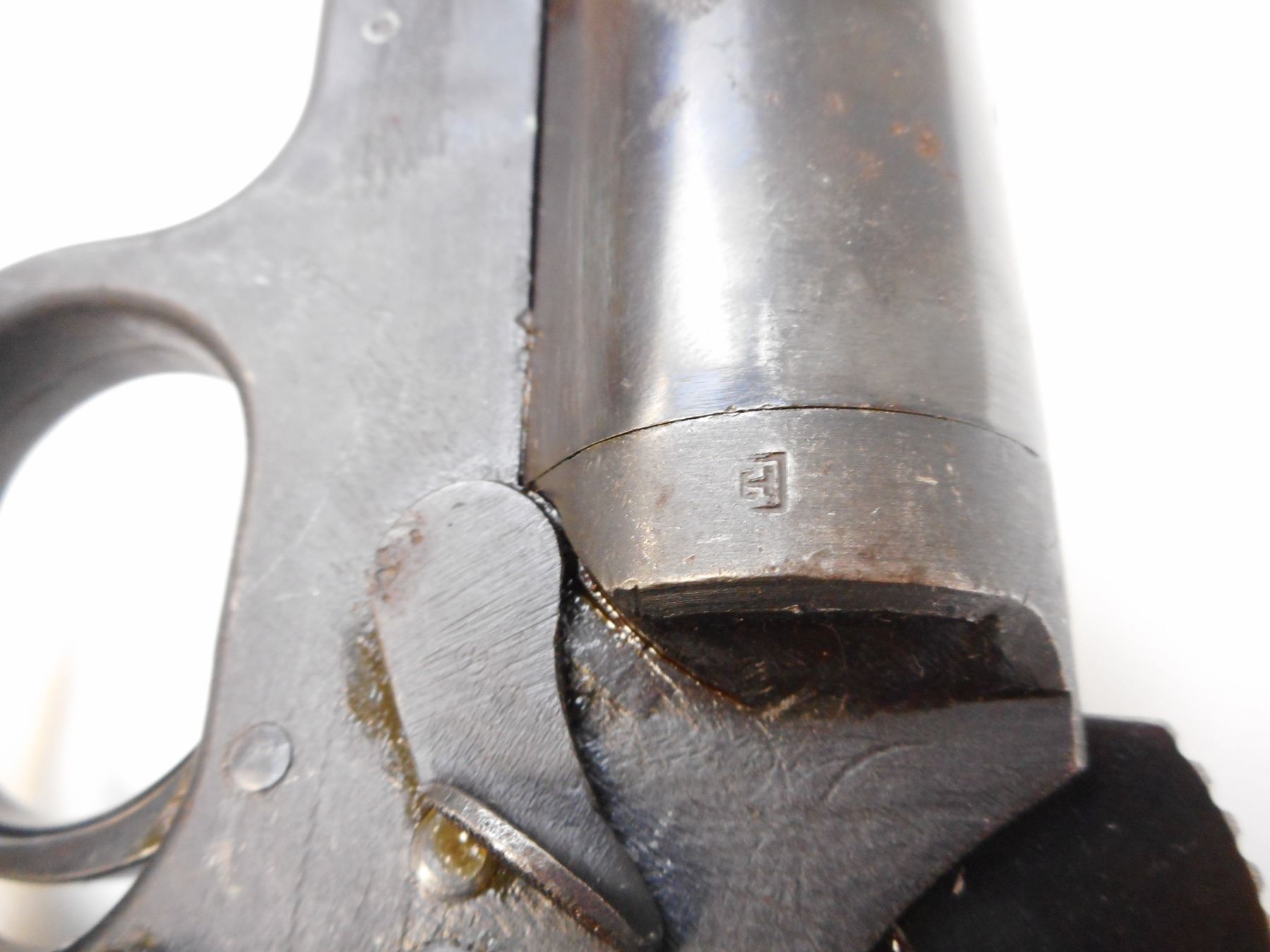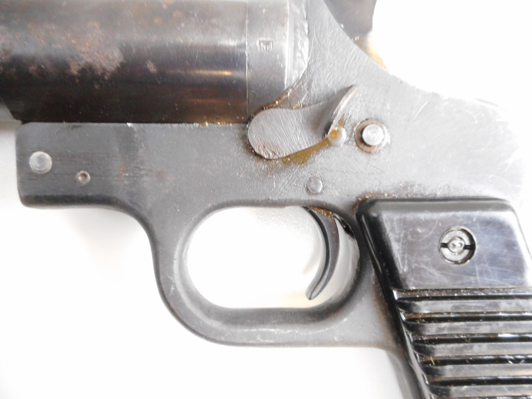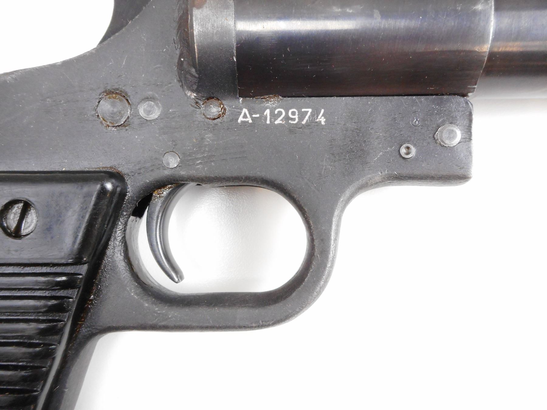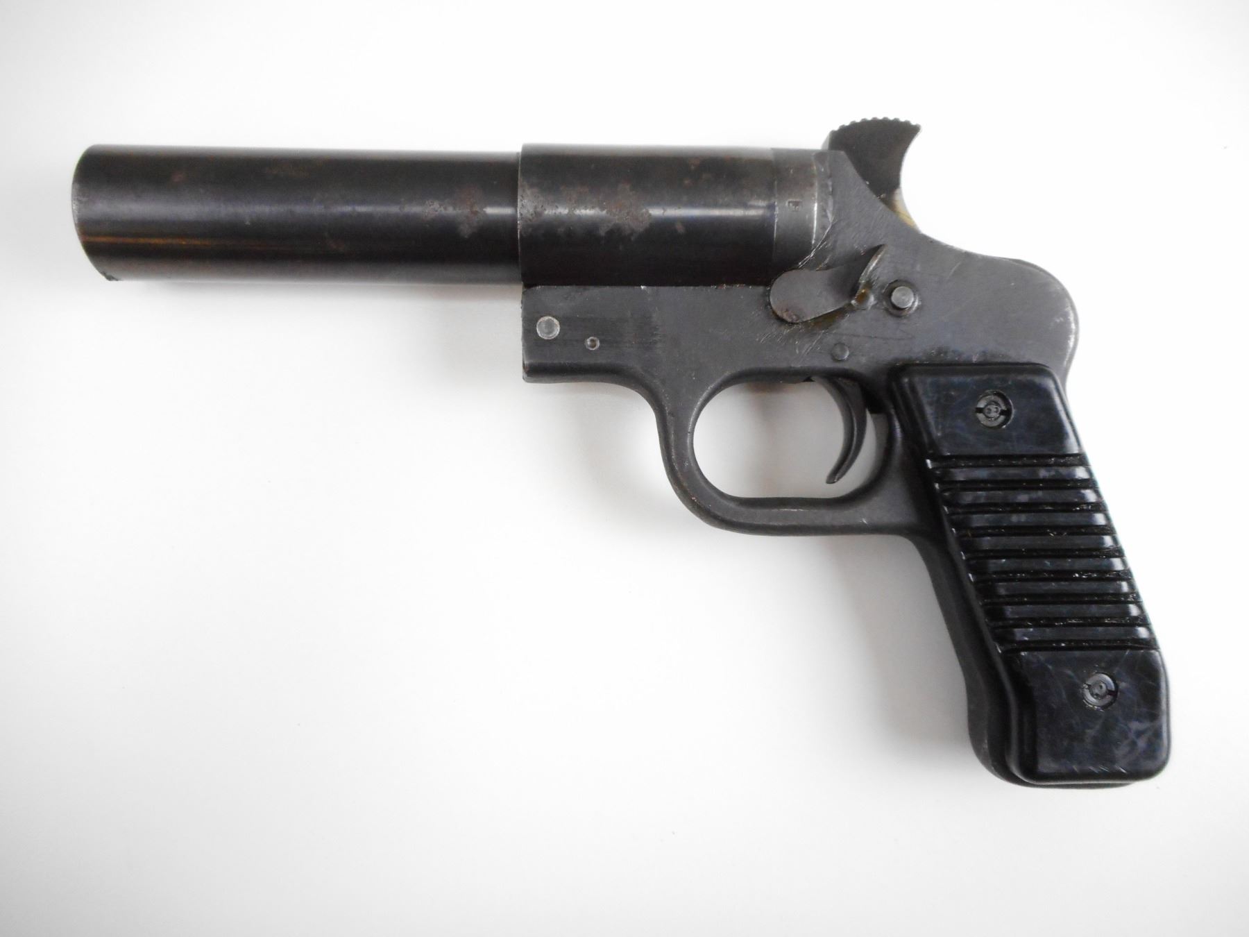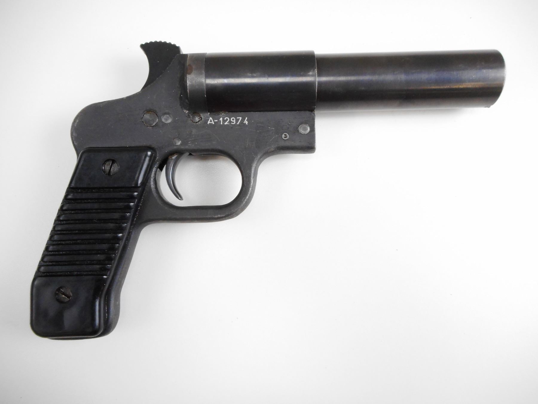 YUGOSLAV , MODEL: M57 , CALIBER: 26.5MM , BORE IS GOOD. YUGOSLAV CREST. BLUED FINISH SHOWS LIGHT PITTING AND WEAR. GROOVED BLACK POLYMER GRIPS SHOW WEAR. , ACTION: HINGE SINGLE SHOT , BARREL LENGTH: 6" , SERIAL# A12974 , CONDITION:6/10 ANTIQUE , CLASS: NO LICENSE REQUIRED TO PURCHASE