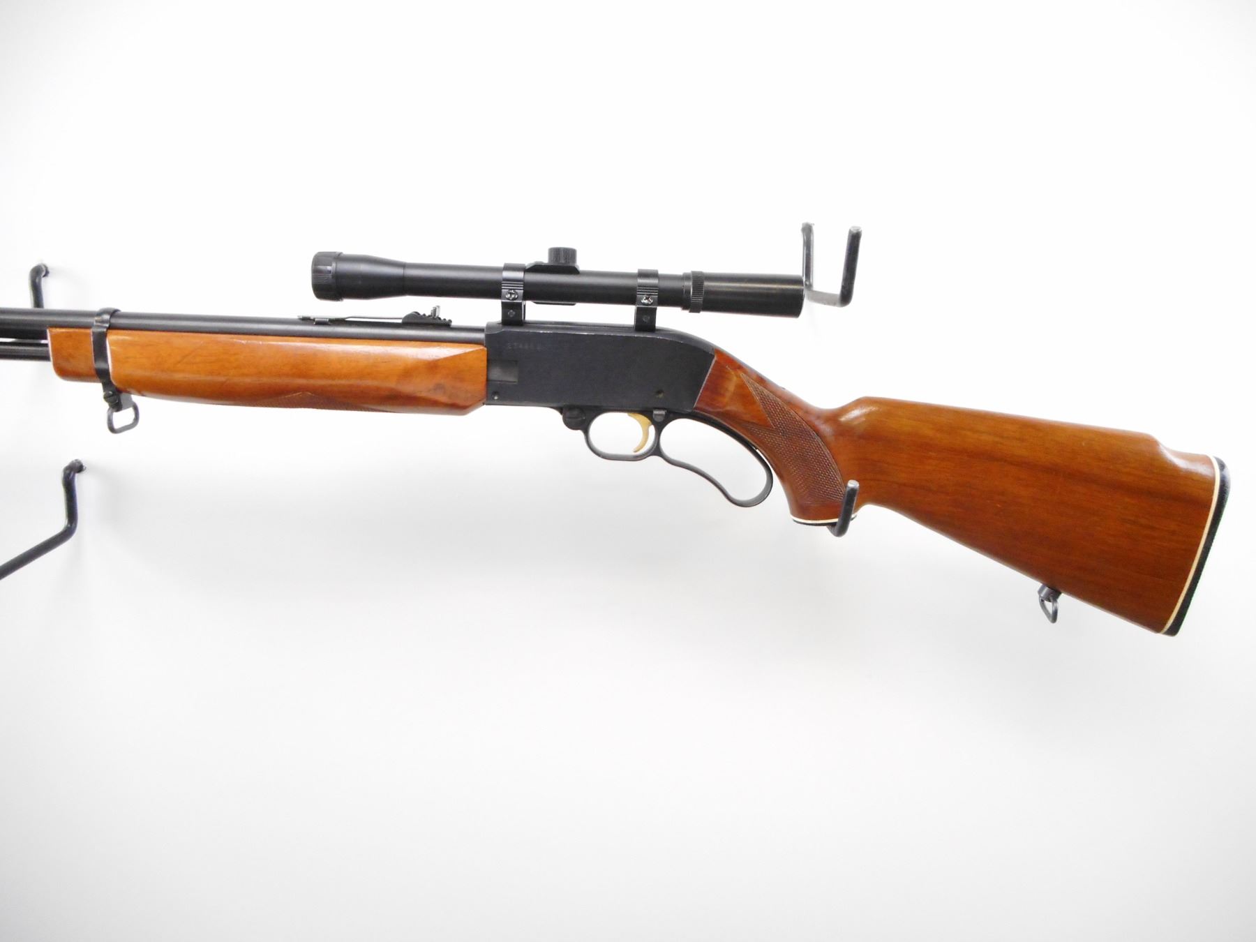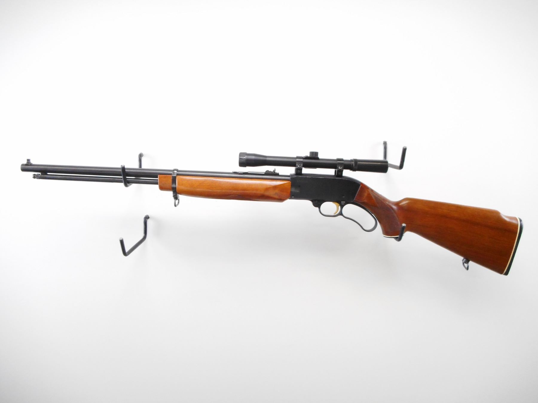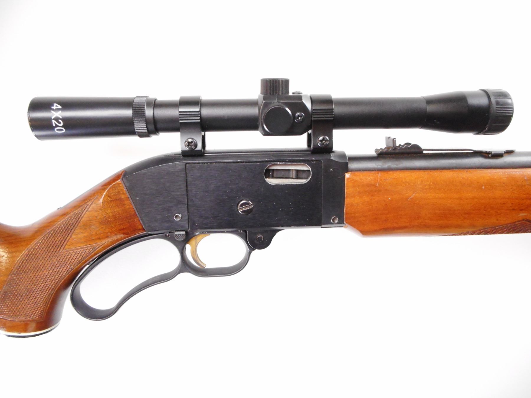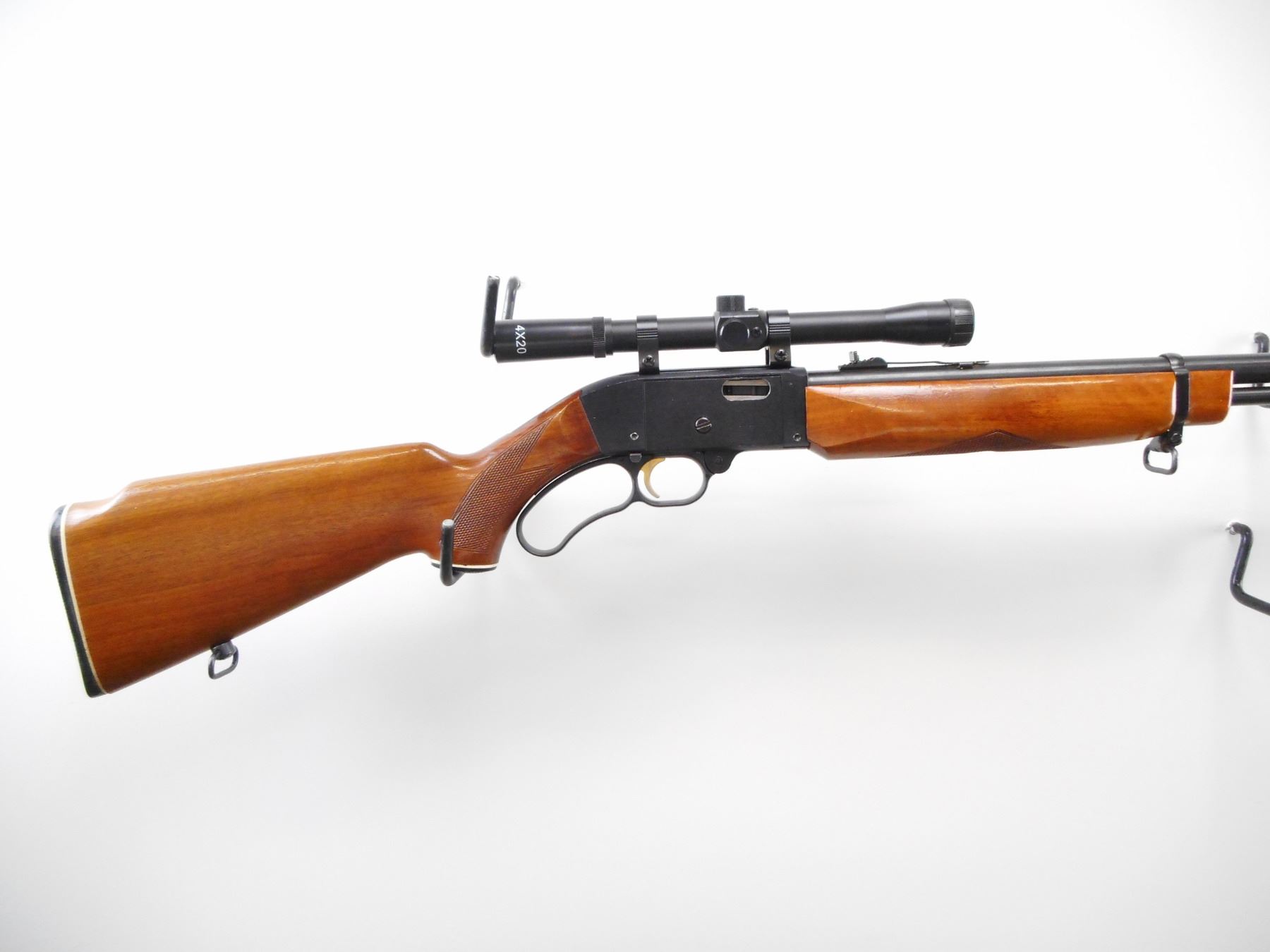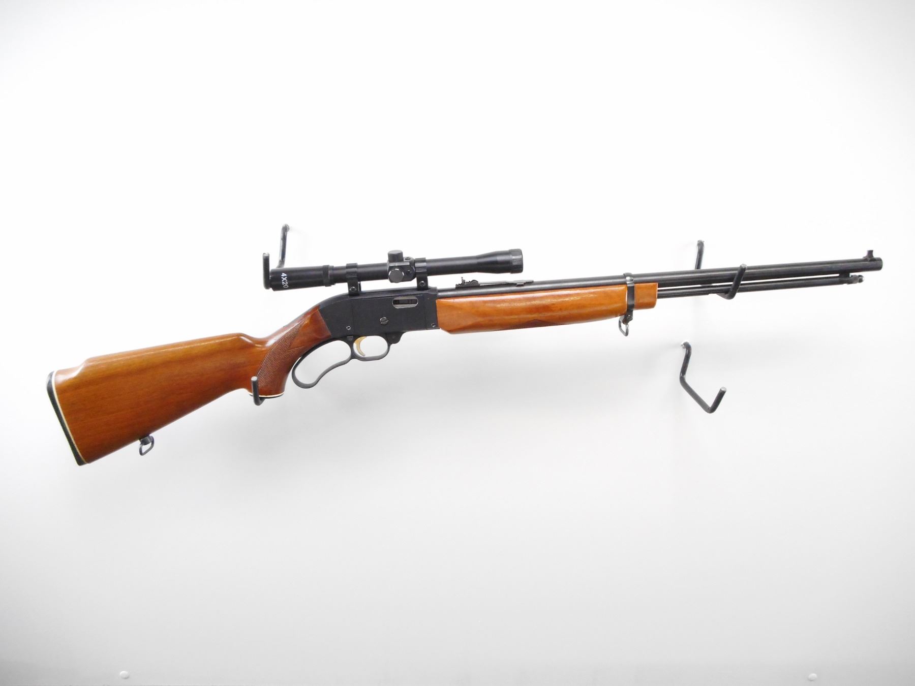 MOSSBERG , MODEL: 402 PALOMINO , CALIBER: 22 LR , BORE IS VERY GOOD. BLADE FRONT SIGHT. ADJUSTABLE U NOTCH REAR SIGHT. 4 X 20 SCOPE, CLEAR OPTICS WITH DUPLEX CROSS HAIRS. BLUED BARREL MAG TUBE. TWO PIECE WOOD STOCK. CHECKERED FOREARM AND PISTOL GRIP. CHECKERED BLACK POLYMER BUTT PLATE AND GRIP CAP. SLING SWIVELS. METAL SHOWS MINOR HANDLING MARKS. STOCKS SHOW MINOR HANDLING MARKS AND SCRATCHES. , ACTION: LEVER ACTION RIFLE , BARREL LENGTH: 20" , SERIAL # 23486B , CONDITION: 8/10 , CLASS: CANADIAN NON RESTRICTED CLASS