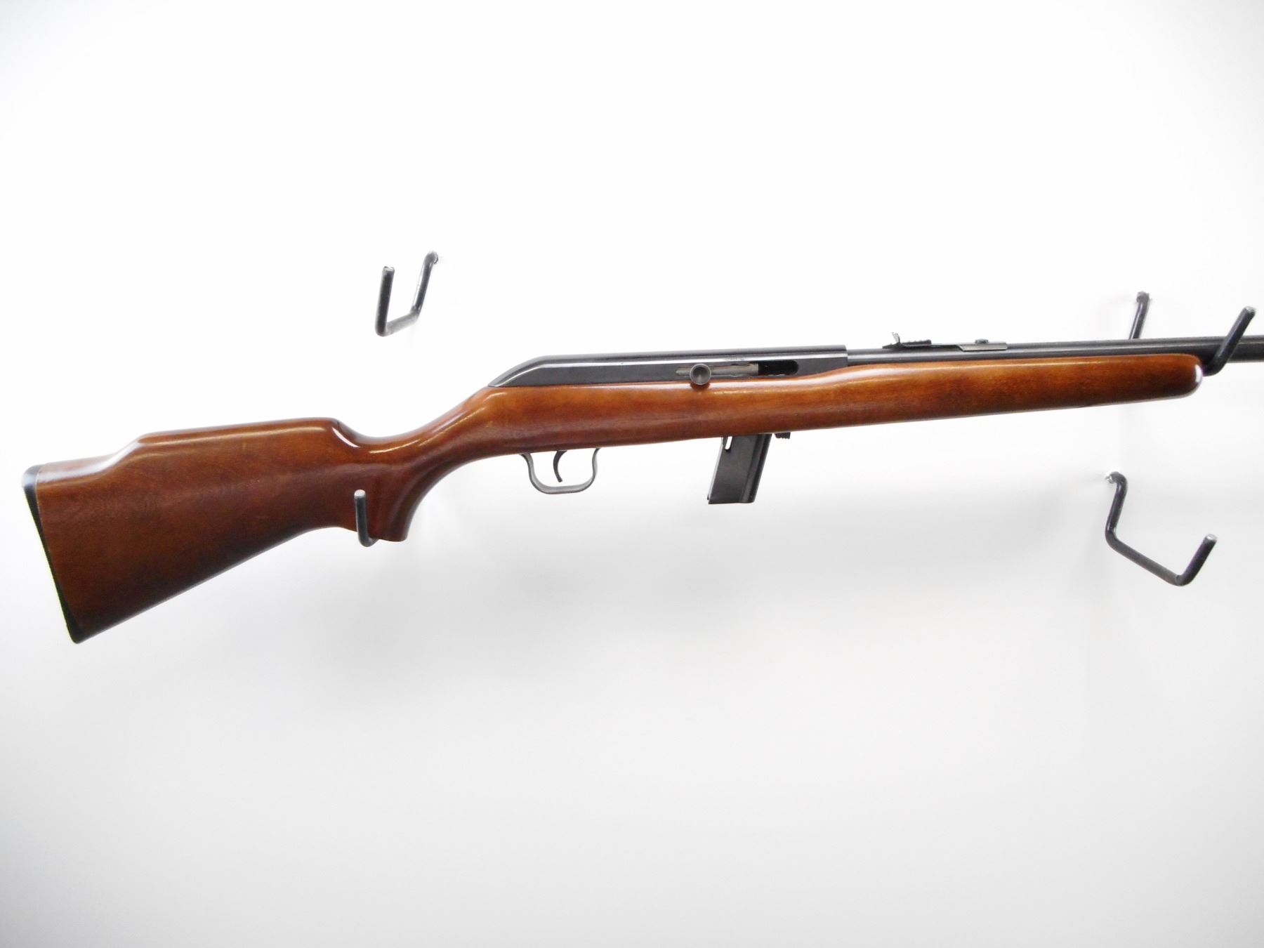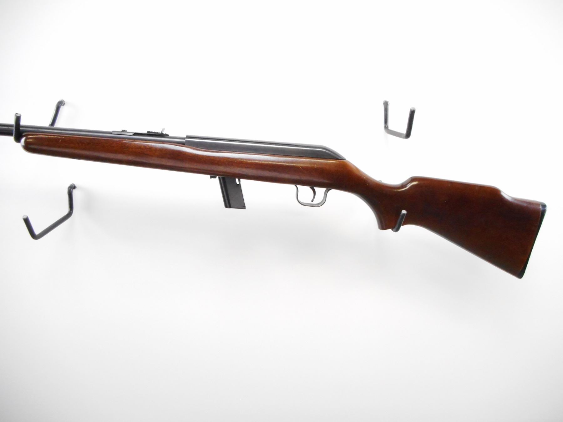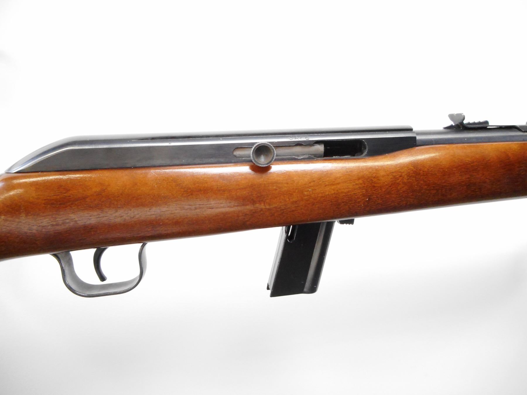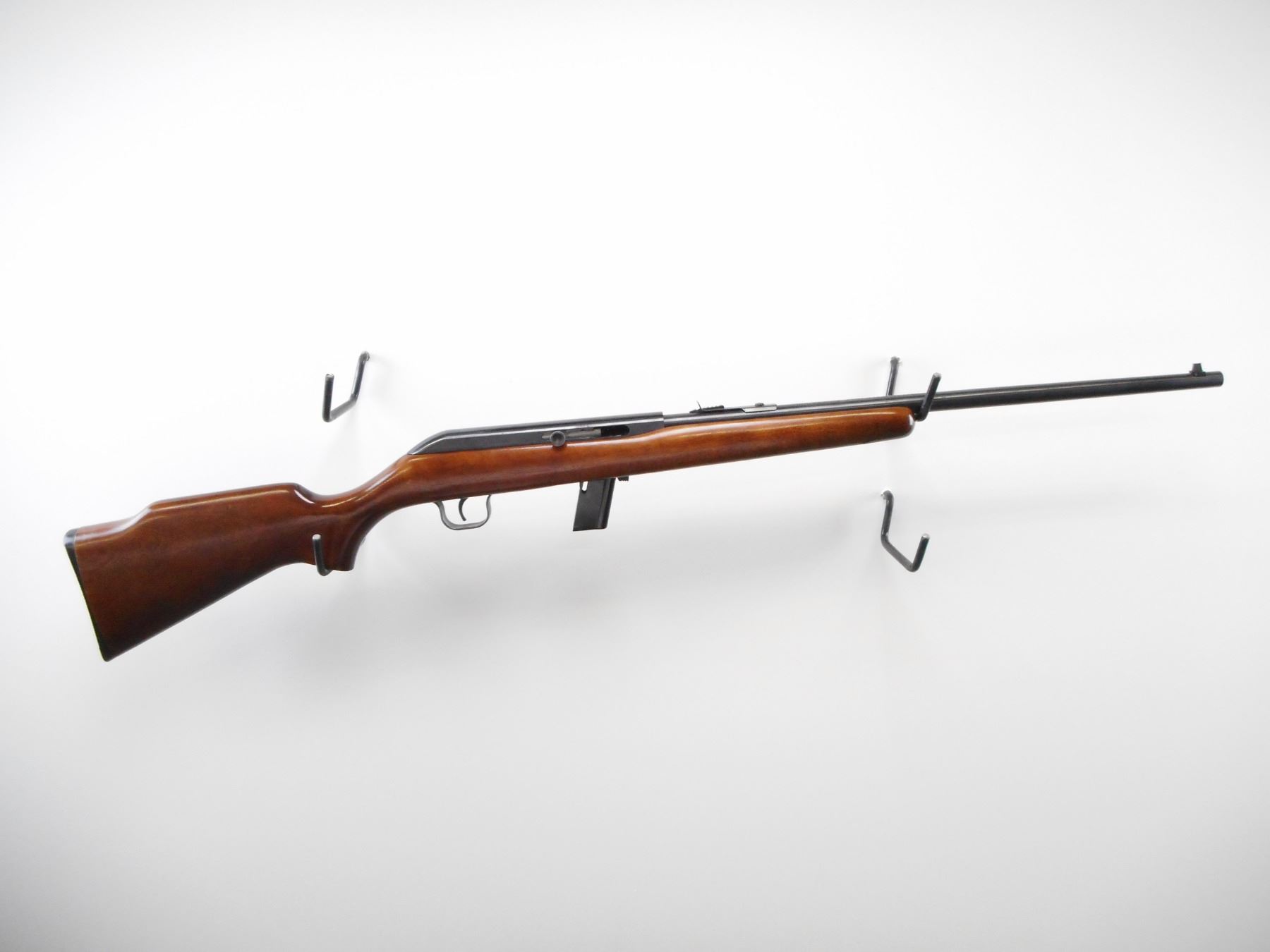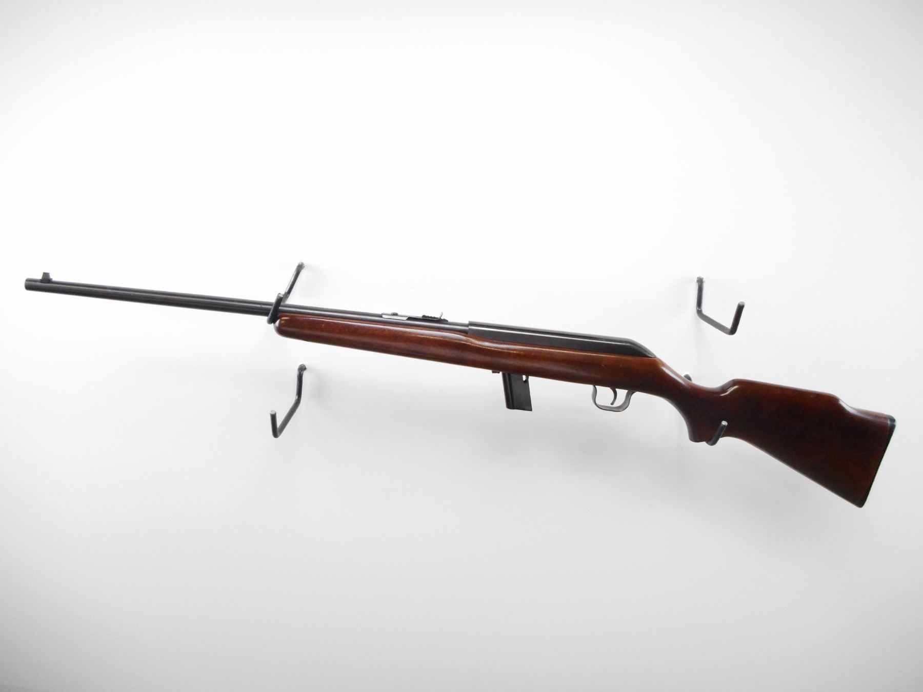 COOEY , MODEL: 64A , CALIBER: 22 LR , COMES WITH MAGAZINE, BORE IS VERY GOOD, BLADE FRONT SIGHT, ADJUSTABLE REAR U NOTCH REAR SIGHT, RECEIVER GROOVED FOR SCOPE, BLUED FINISH ON METAL PARTS, SMOOTH ONE PIECE WOOD STOCK, GROOVED BLACK POLYMER BUTT PLATE, STEEL TRIGGER GUARD, METAL SHOWS SLIGHT HANDLING MARKS, STOCK SHOWS MINOR HANDLING MARKS , ACTION: SEMI AUTOMATIC RIFLE , BARREL LENGTH: 20" , SERIAL # N/A , CONDITION: 8/10 , CLASS: CANADIAN NON RESTRICTED CLASS