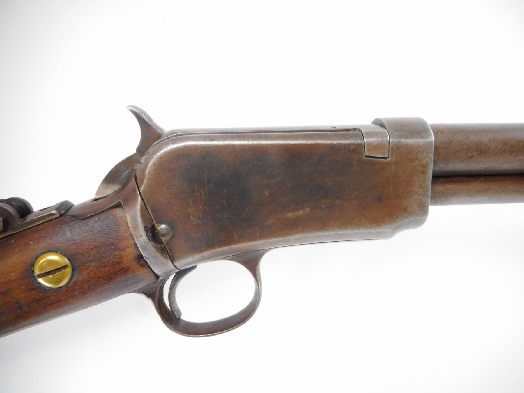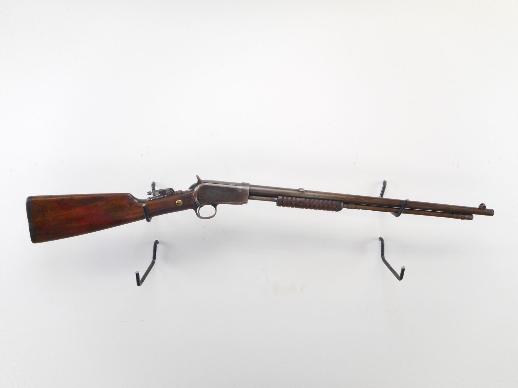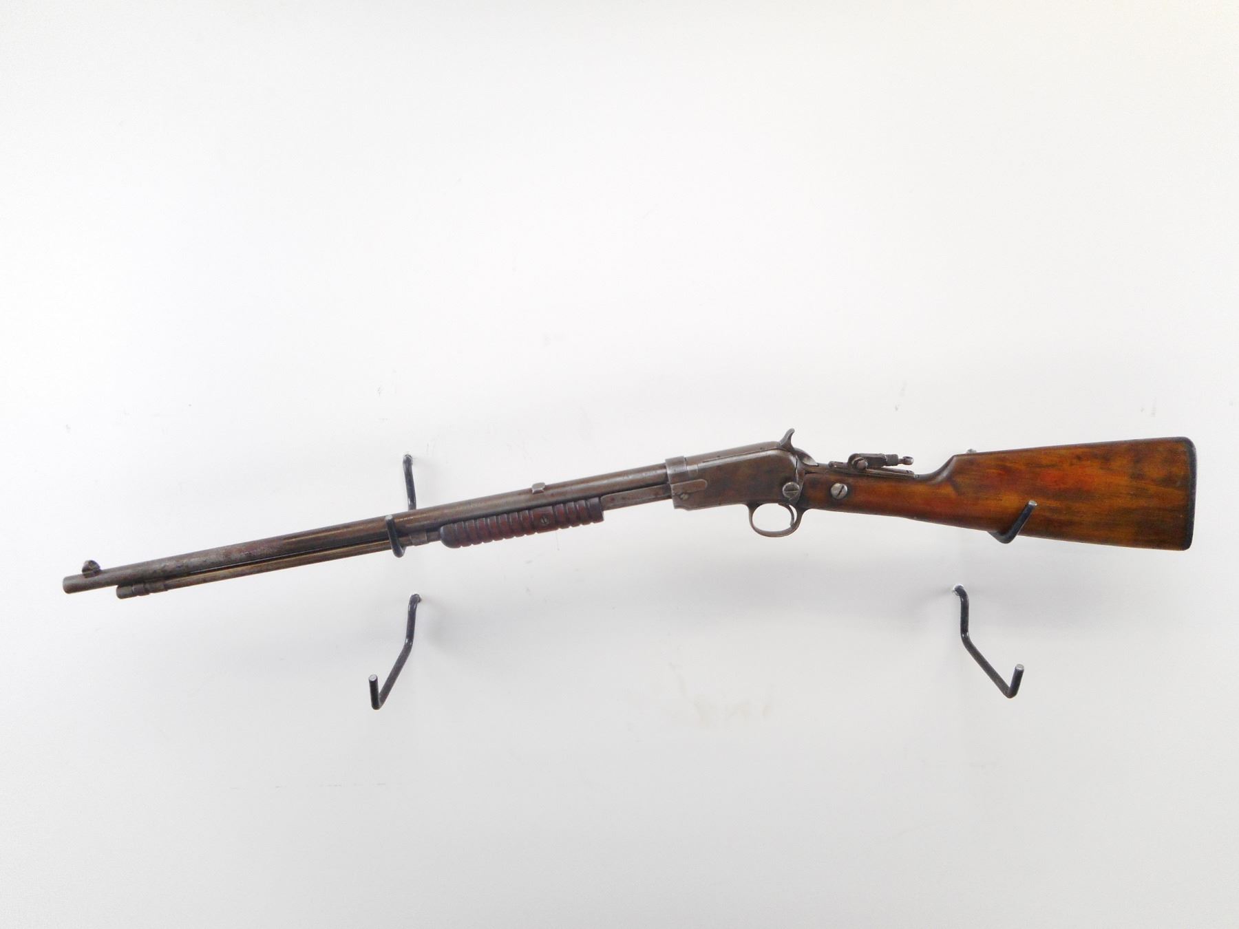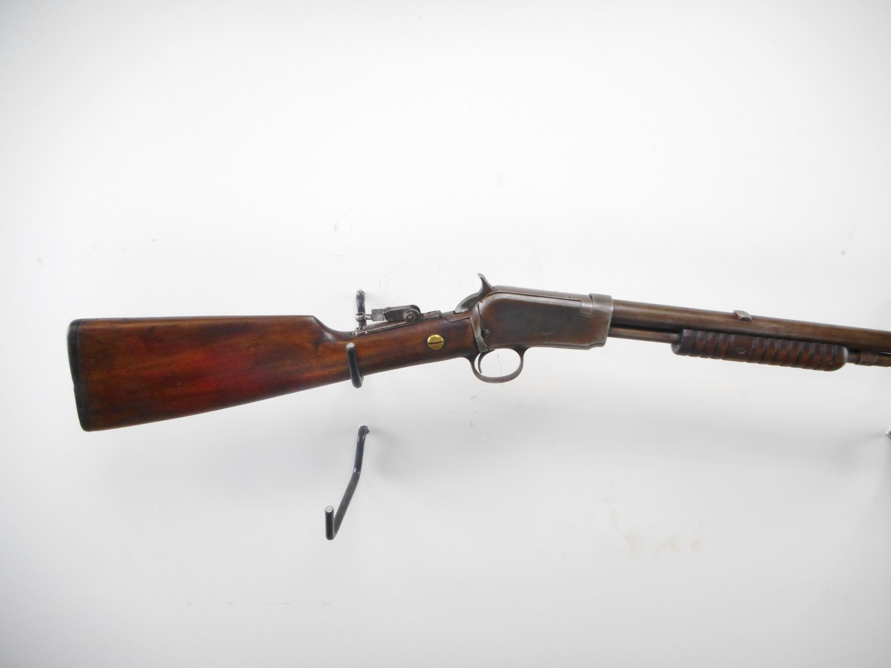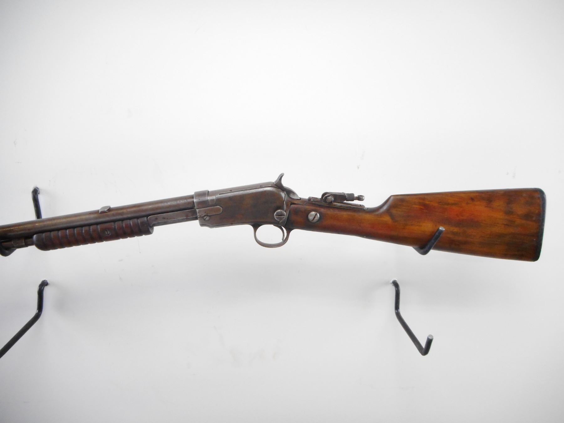 WINCHESTER , MODEL: 6 , CALIBER: 22 LR , BORE IS GOOD. PIN TYPE FRONT SIGHT WITH HOOD. REAR SIGHT REMOVED. SLOT BLANK INSTALLED. UNKNOWN TANG PEEP. TWO PIECE WOOD STOCK. GROOVED FOREND. BLACK POLYMER BUTT PLATE. METAL FINISH TURNED SILVER GREY. LIGHT PITTING. STOCK CRACKED AND REPAIRED AT WRIST. SHOWS NUMEROUS HANDLING MARKS AND WEAR. , ACTION: PUMP ACTION RIFLE , BARREL LENGTH: 20" , SERIAL # 776889 , CONDITION: 5/10 , CLASS: CANADIAN NON RESTRICTED CLASS
