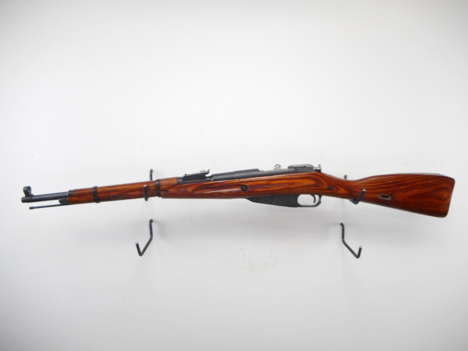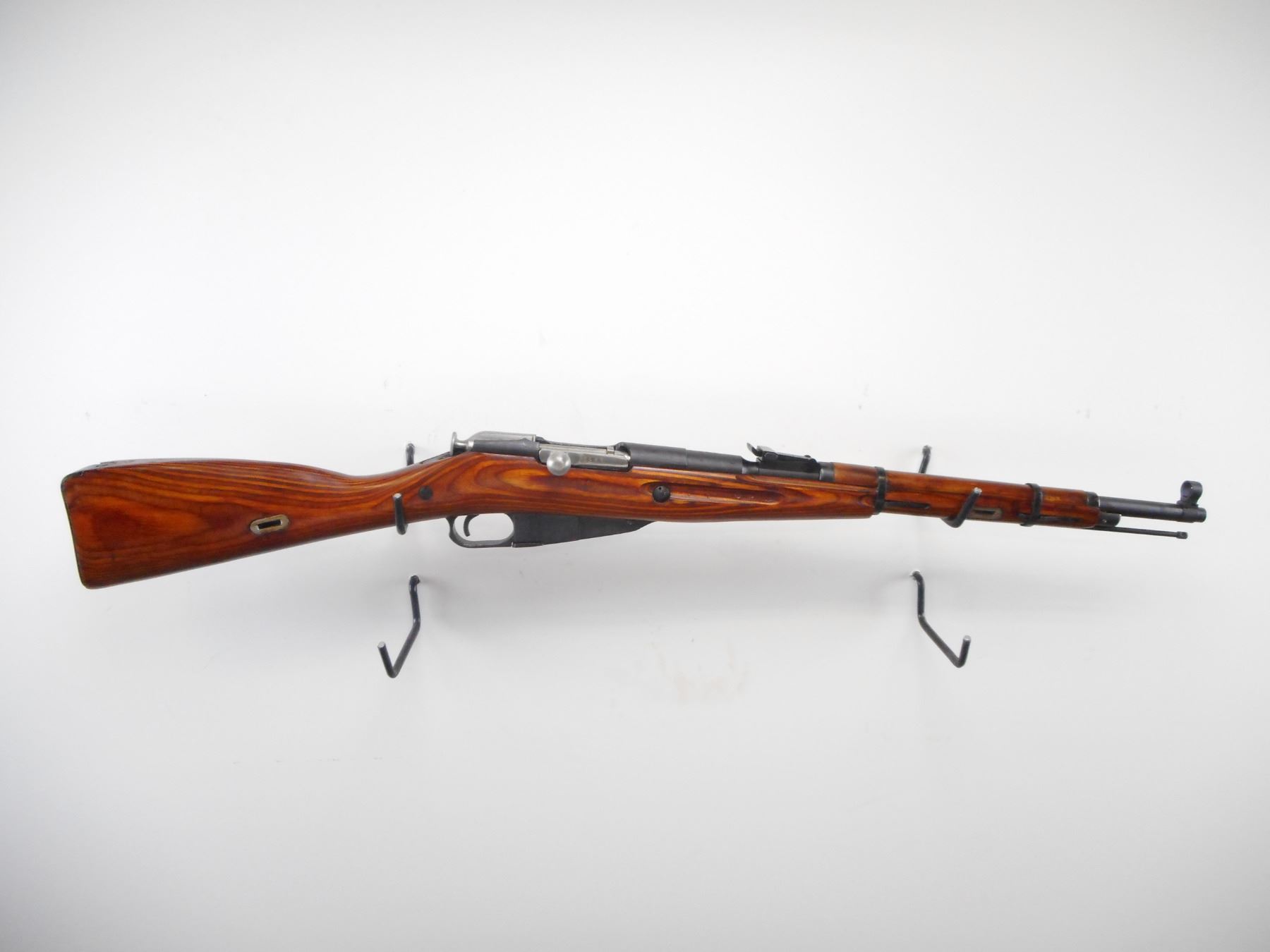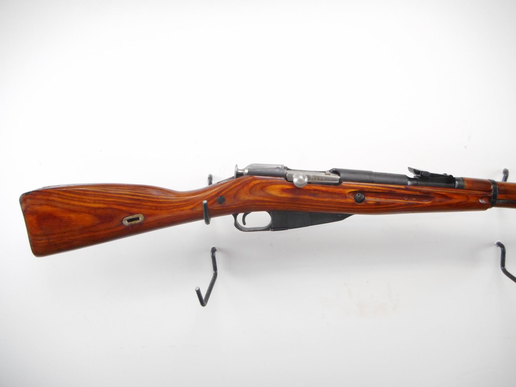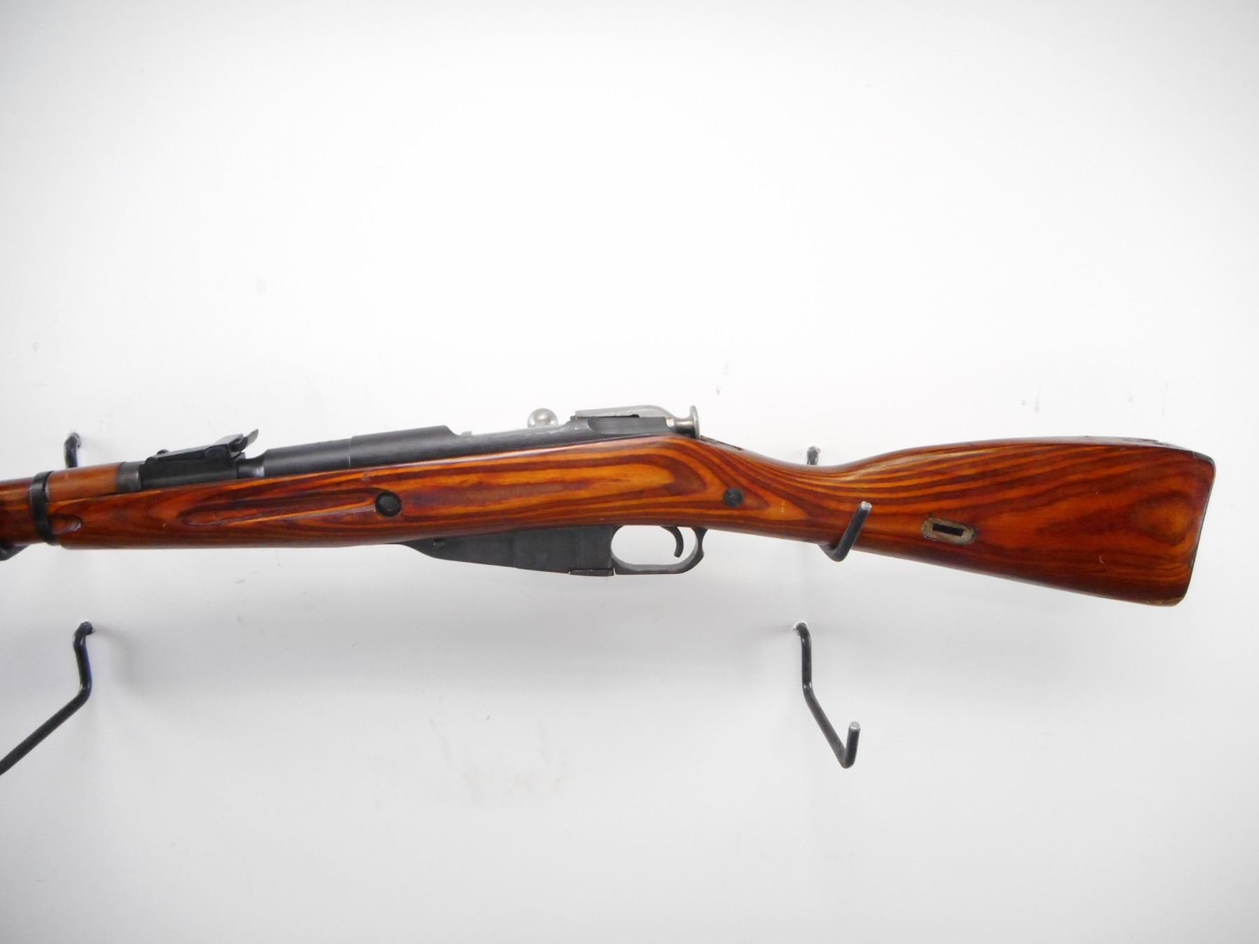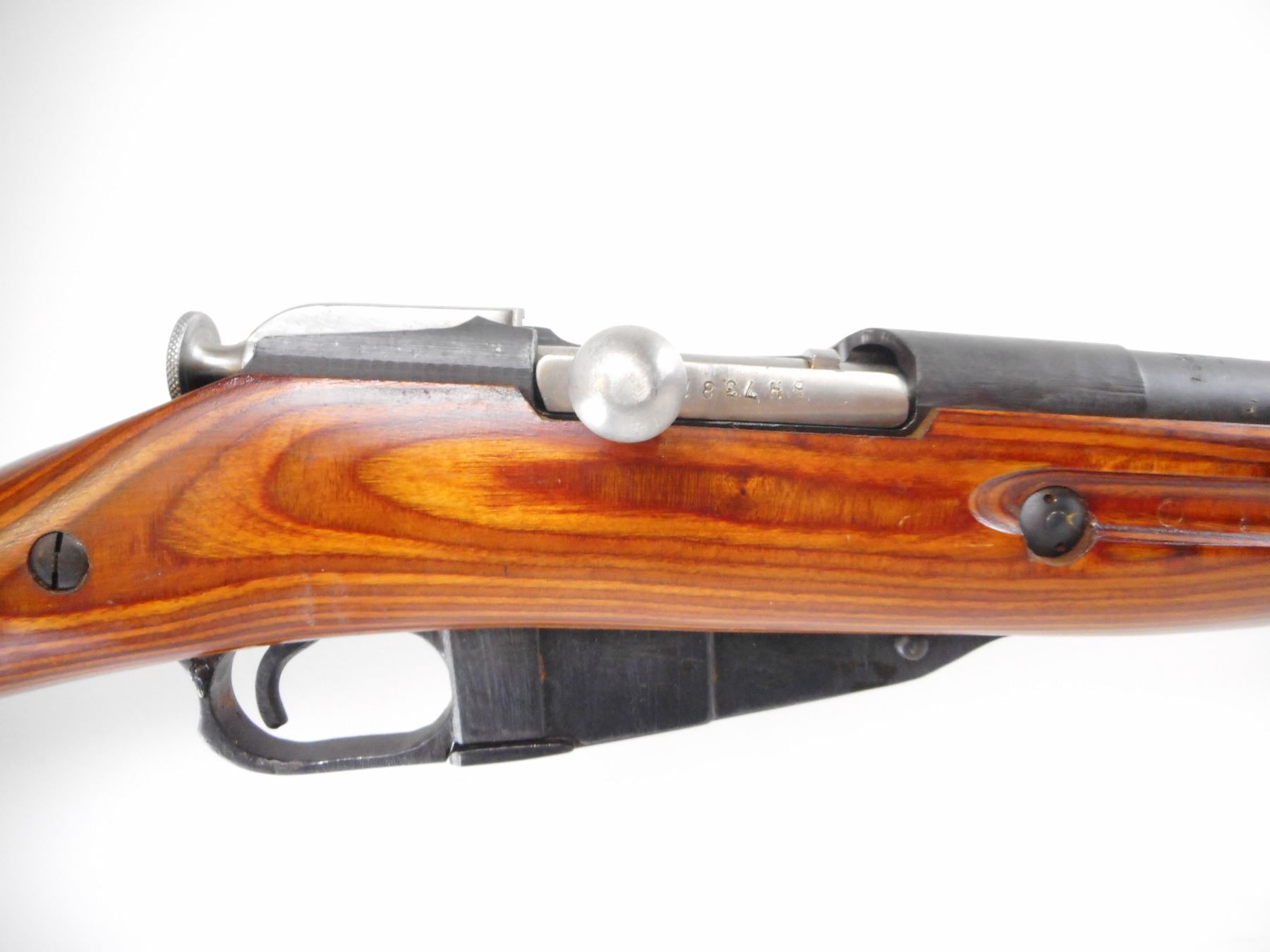 MOSIN NAGANT , MODEL: M38 CARBINE , CALIBER: 7.62 X 54R , BORE IS GOOD. COUNTER BORED. MFG'D IZHEVSK 1943. ARSENAL REBUILD. POST FRONT SIGHT WITH HOOD. ADJUSTABLE U NOTCH REAR SIGHT. ROUND RECEIVER. TWO PIECE LAMINATE STOCKS. SMOOTH STEEL BUTT PLATE. CLEANING ROD. METAL SHOWS SLIGHT HANDLING MARKS. STOCKS SHOWS HANDLING MARKS AND WEAR , ACTION: BOLT ACTION RIFLE , BARREL LENGTH: 20" , SERIAL # BH7381 , CONDITION: 7/10 , CLASS: CANADIAN NON RESTRICTED CLASS