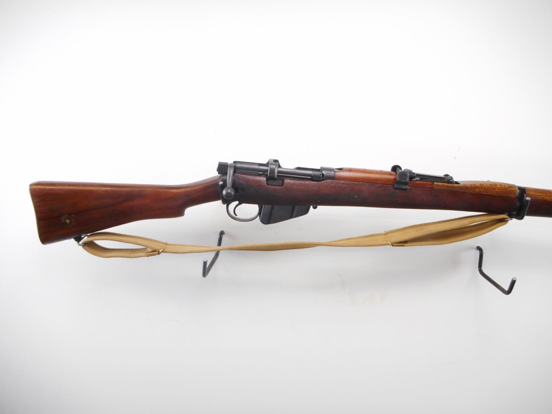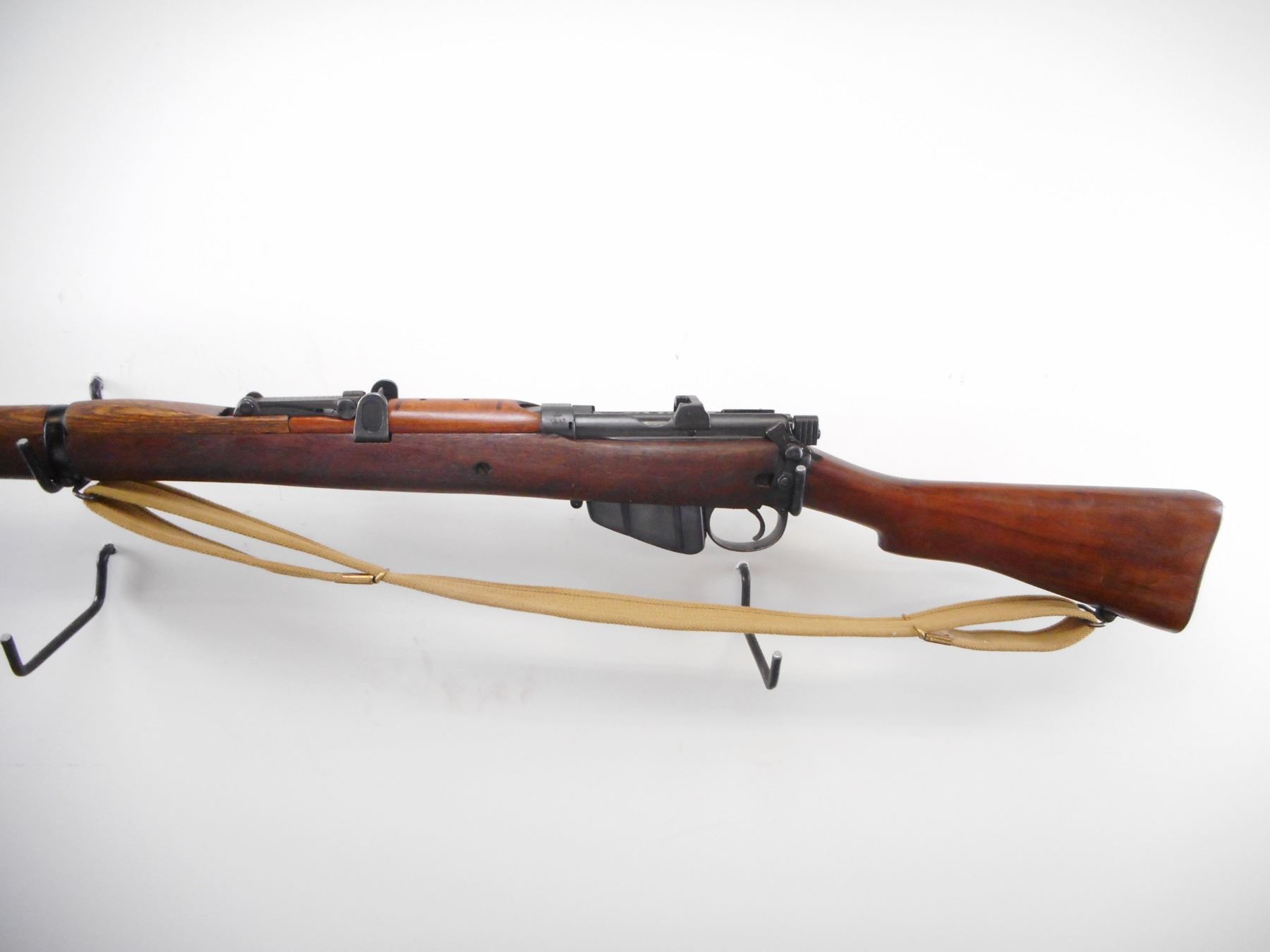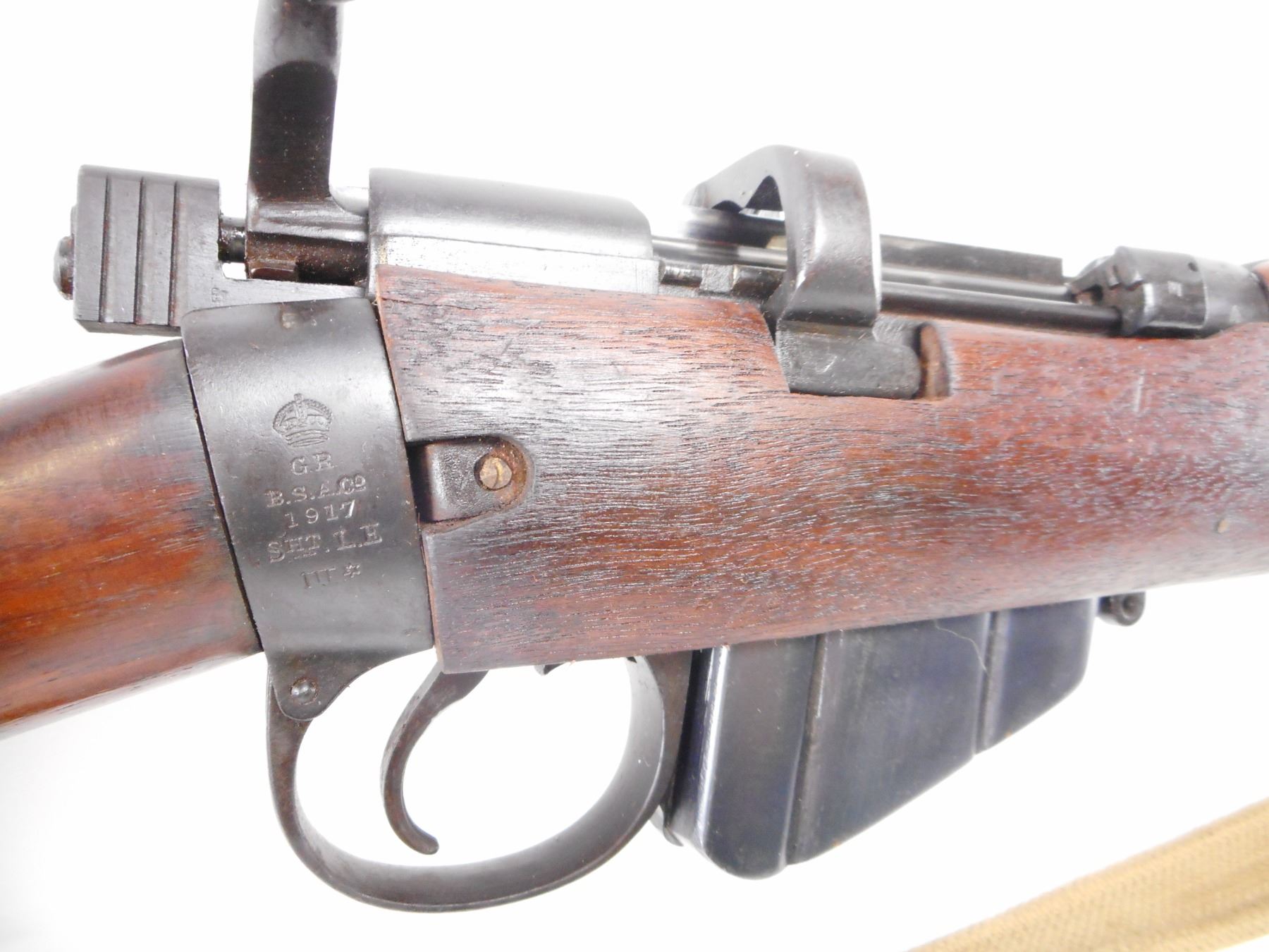 LEE ENFIELD , MODEL: NO1 MK III* , CALIBER: 303 BR , BORE IS FAIR, LIGHT PITTING. COMES WITH MAGAZINE. MFG'D BY BSA CO 1917. SERIAL NUMBERS DO NOT MATCH. BLADE FRONT SIGHT WITH EARS. ADJUSTABLE U NOTCH REAR SIGHT. FOUR PIECE FULL MILITARY STOCK. BRASS BUTT PLATE WITH TRAP. THREE SWIVELS. CANVAS SLING. NEW ZEALAND OWNERSHIP MARKS ON RECEVER, REBUILT. METAL FINISH SHOWS WEAR, HANDLING MARKS. STOCKS MISMATCHED WITH HANDLING MARKS AND WEAR , ACTION: BOLT ACTION RIFLE , BARREL LENGTH: 25 1/4" , SERIAL # 38196 , CONDITION: 7/10 , CLASS: CANADIAN NON RESTRICTED CLASS