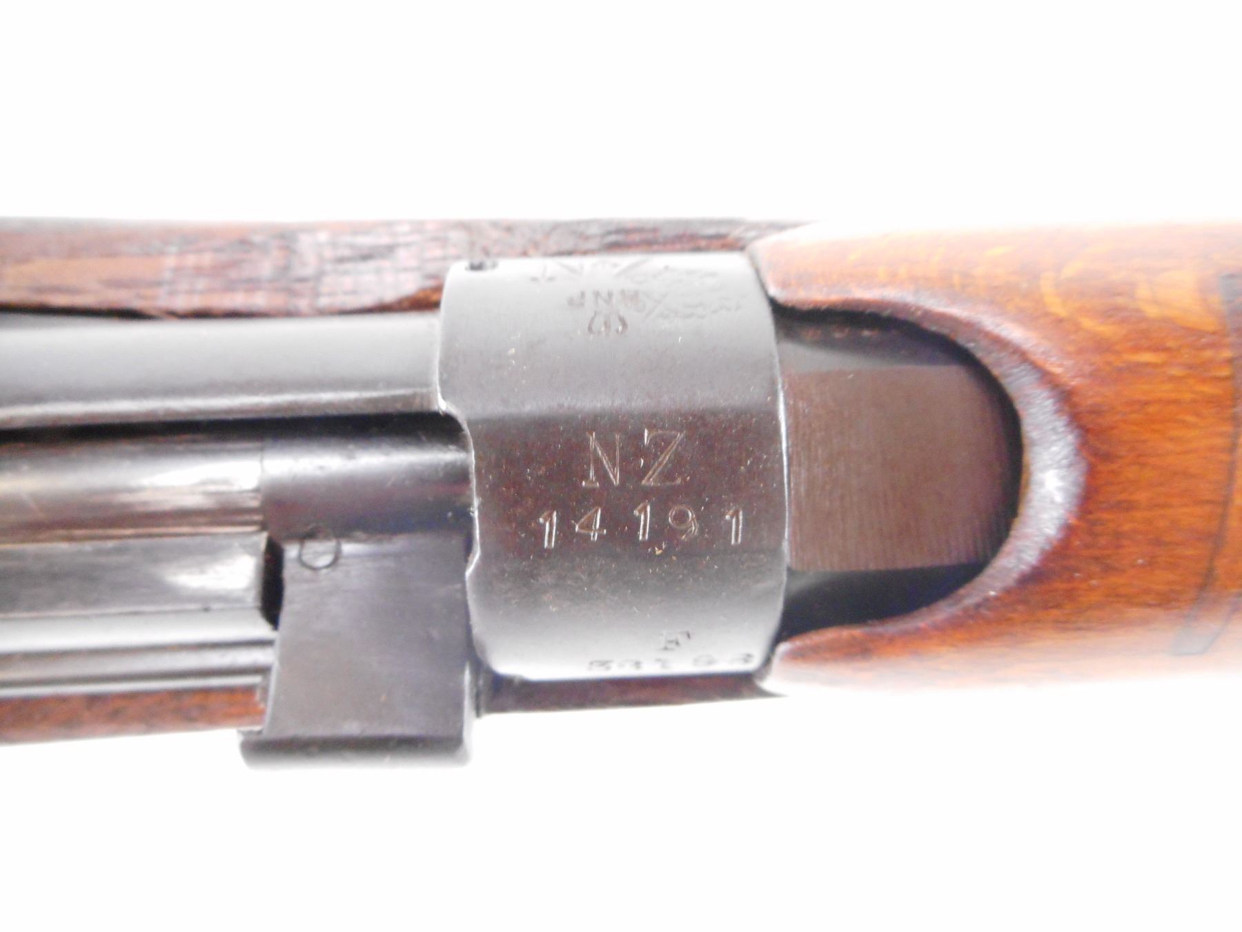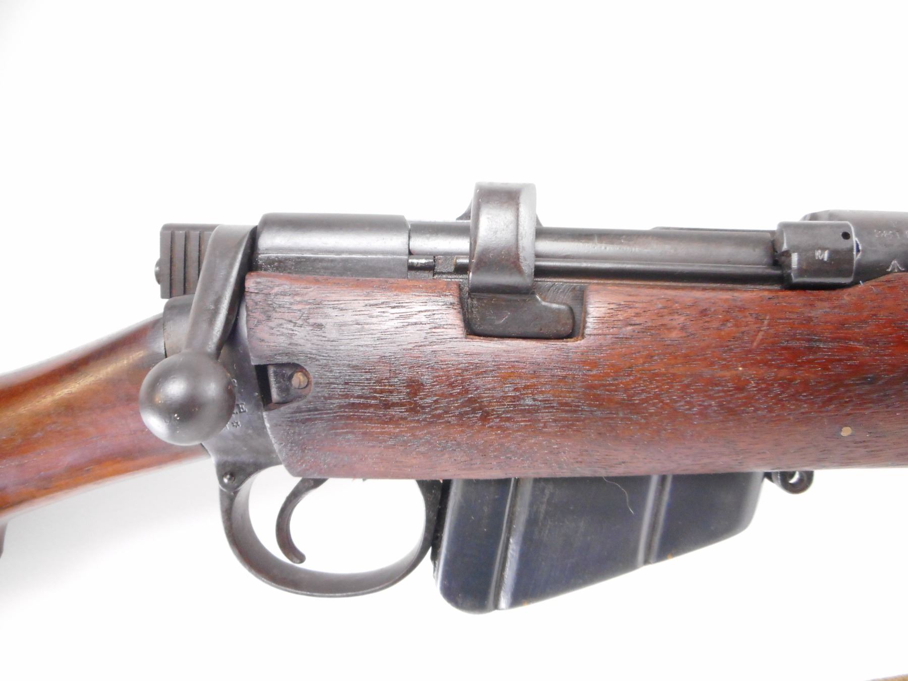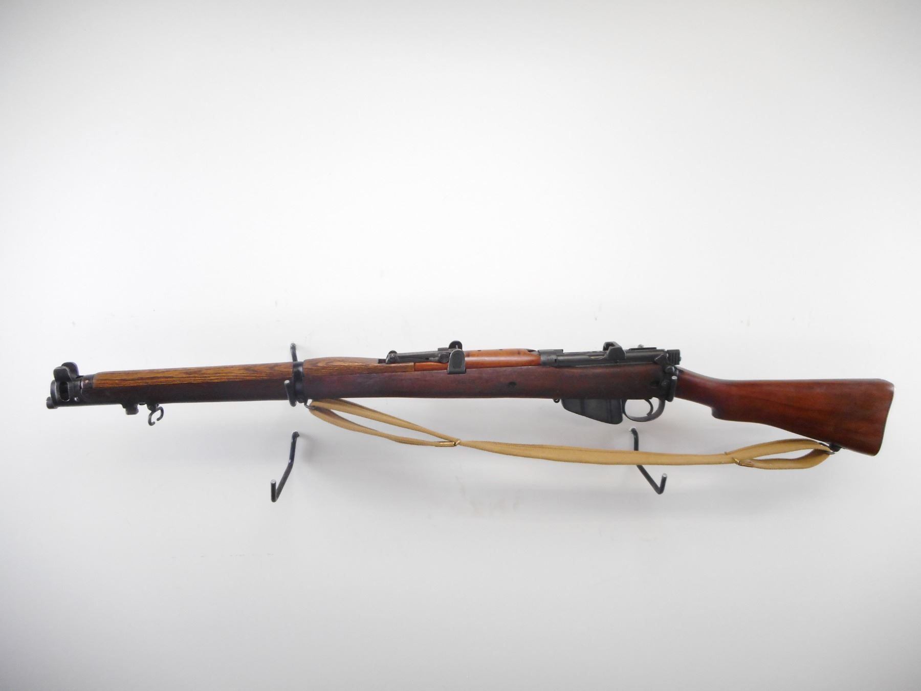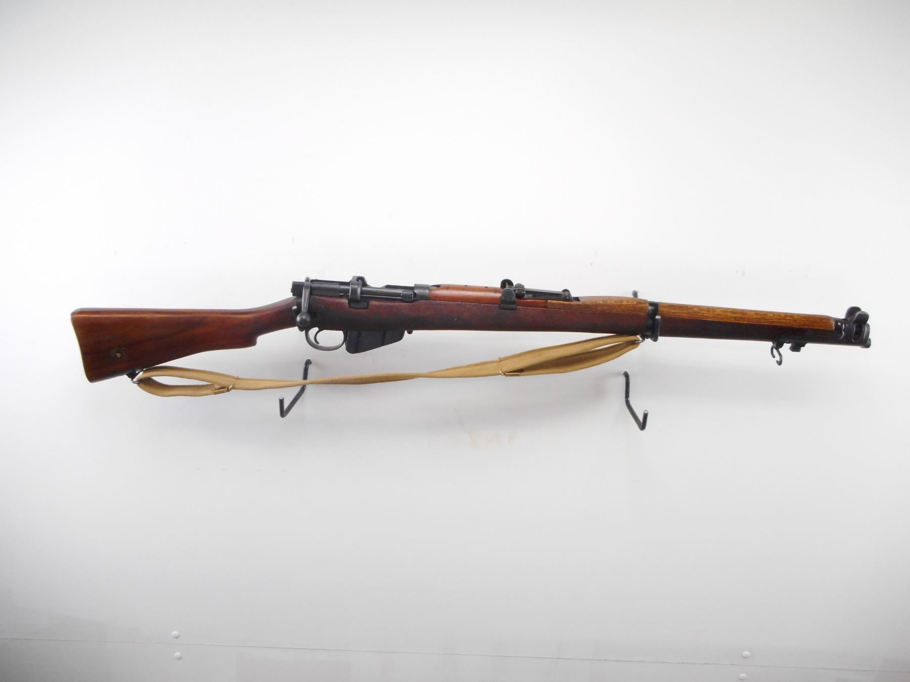 LEE ENFIELD , MODEL: NO1 MK III* , CALIBER: 303 BR , BORE IS FAIR, LIGHT PITTING. COMES WITH MAGAZINE. MFG'D BY BSA CO 1917. SERIAL NUMBERS DO NOT MATCH. BLADE FRONT SIGHT WITH EARS. ADJUSTABLE U NOTCH REAR SIGHT. FOUR PIECE FULL MILITARY STOCK. BRASS BUTT PLATE WITH TRAP. THREE SWIVELS. CANVAS SLING. NEW ZEALAND OWNERSHIP MARKS ON RECEVER, REBUILT. METAL FINISH SHOWS WEAR, HANDLING MARKS. STOCKS MISMATCHED WITH HANDLING MARKS AND WEAR , ACTION: BOLT ACTION RIFLE , BARREL LENGTH: 25 1/4" , SERIAL # 38196 , CONDITION: 7/10 , CLASS: CANADIAN NON RESTRICTED CLASS