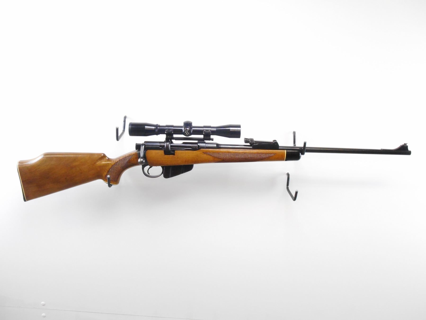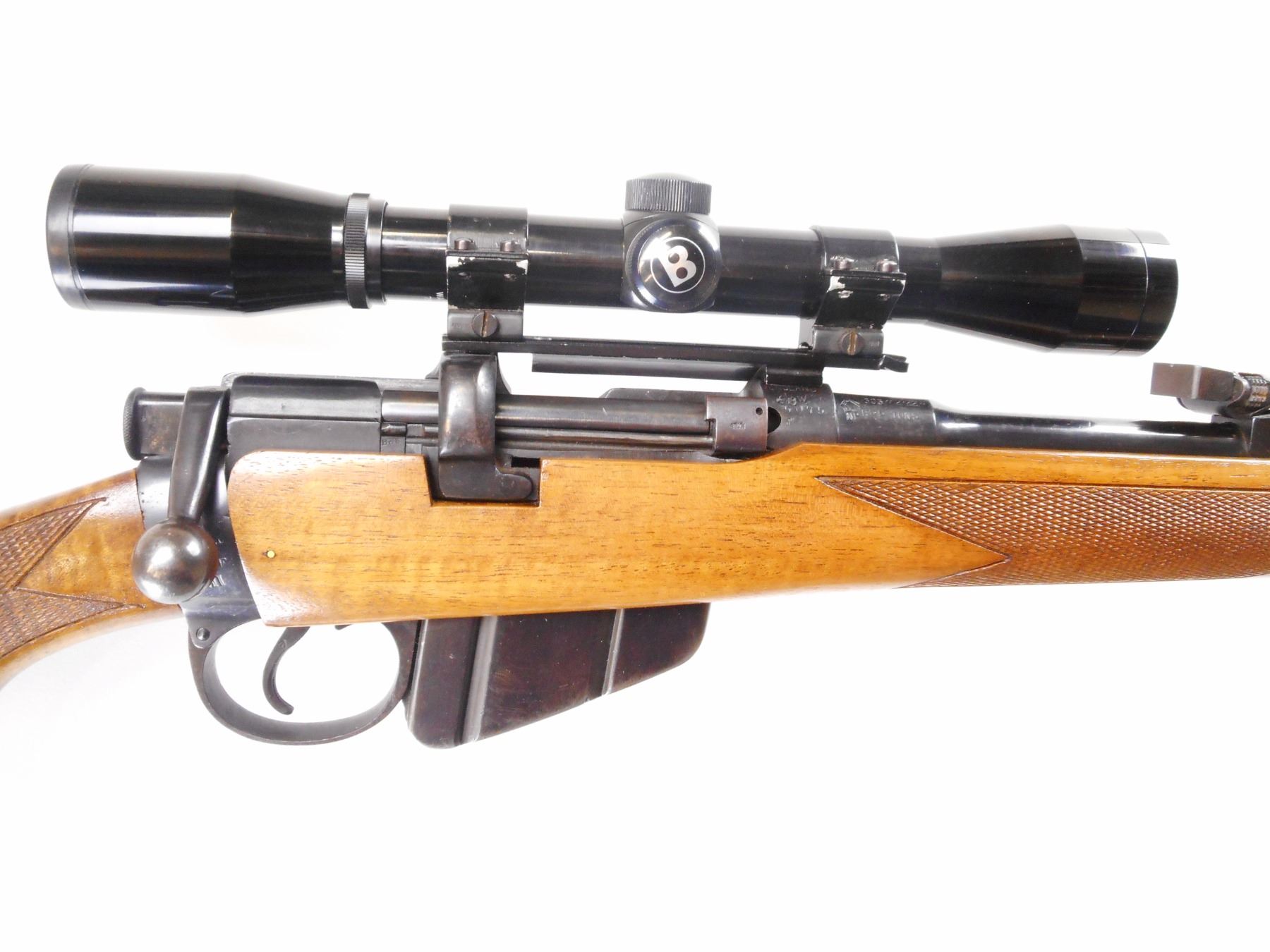 LEE ENFIELD , MODEL: NO 1 MK3 SPORTER , CALIBER: 303 BR , COMES WITH MAGAZINE. BORE IS GOOD. . BLADE FRONT SIGHT WITH RAMP. ADJUSTABLE REAR U NOTCH WITH SIGHT BUSHNELL SHARP SHOOTER SCOPE. CLEAR OPTICS. DUPLEX CROSS HAIR. TWO PIECE WOOD STOCKS. CHECKERED FOREARM AND PISTOL GRIPS. CHEEK REST. GROOVED BLACK POLYMER BUTT PLATE. GRIP CAP. FOREND CAP. SWIVEL STUDS REMOVED. HOLES PRESENT. BLUEING SHOWS HANDLING MARKS AND WEAR. STOCK SHOWS HANDLING MARKS AND WEAR. , ACTION: BOLT ACTION RIFLE , BARREL LENGTH: 23" , SERIAL # W5075 , CONDITION: 7/10 , CLASS: CANADIAN NON RESTRICTED CLASS