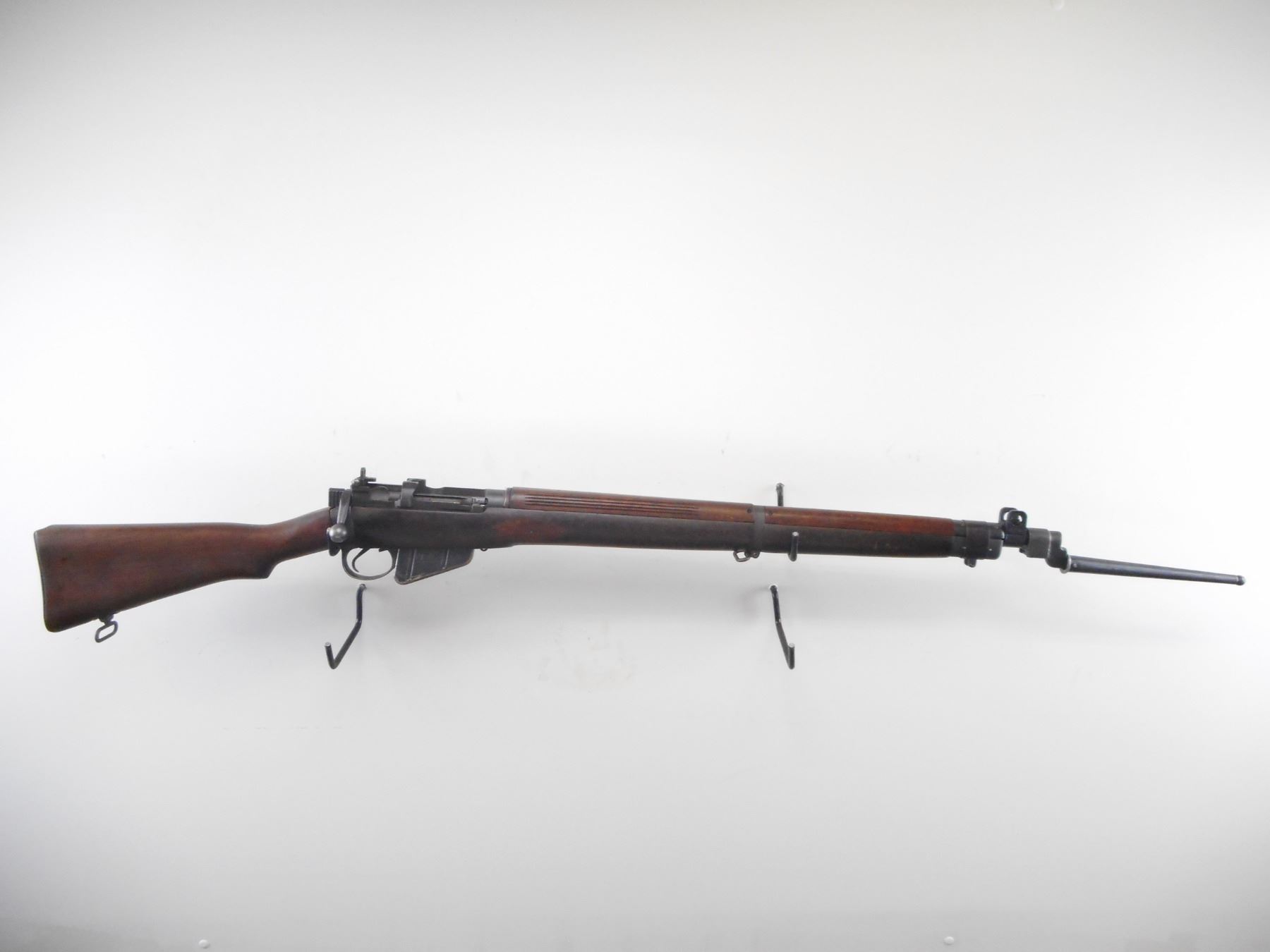 LEE ENFIELD , MODEL: NO 4 MK 1 STAR , CALIBER: 303 BR , COMES WITH MAGAZINE, BORE IS GOOD WORN. SPIKED BAYONET AND SCABBARD. BLADE FRONT SIGHT WITH EARS. L-FLIP REAR PEEP. FOUR PIECE FULL MILITARY STOCK. ALLOY BUTT PLATE. SLING SWIVELS. FOREND HAS ISHAPORE SCREW. RECEIVER MARKED US PORPERTY, MFG'D BY SAVAGE. METAL SHOWS SOME WEAR AND HANDLING MARKS. WOOD SHOWS SOME HANDLING MARKS AND WEAR. , ACTION: BOLT ACTION RIFLE , BARREL LENGTH: 25" , SERIAL # 55C9240 , CONDITION: 7/10 , CLASS: CANADIAN NON RESTRICTED CLASS