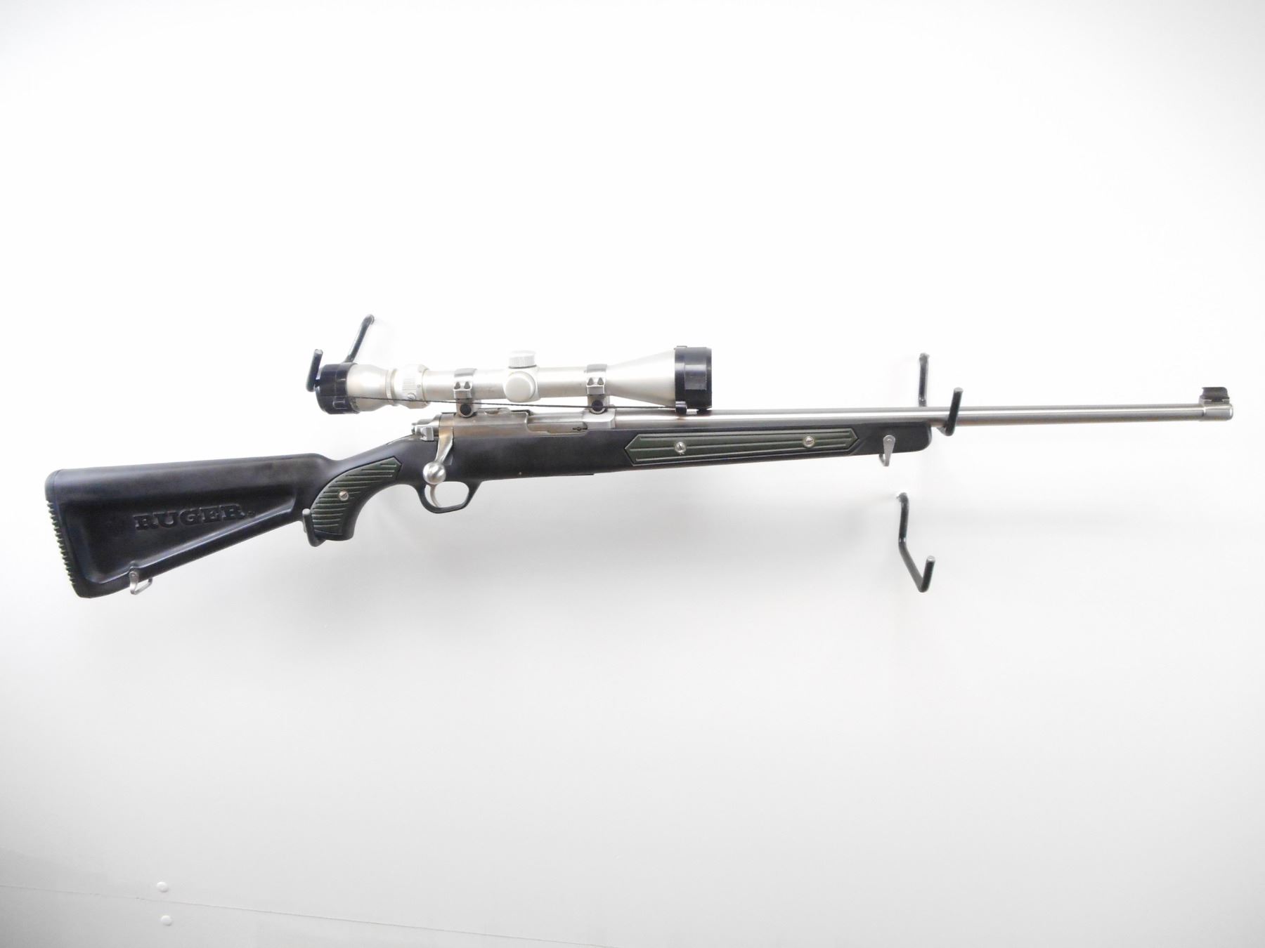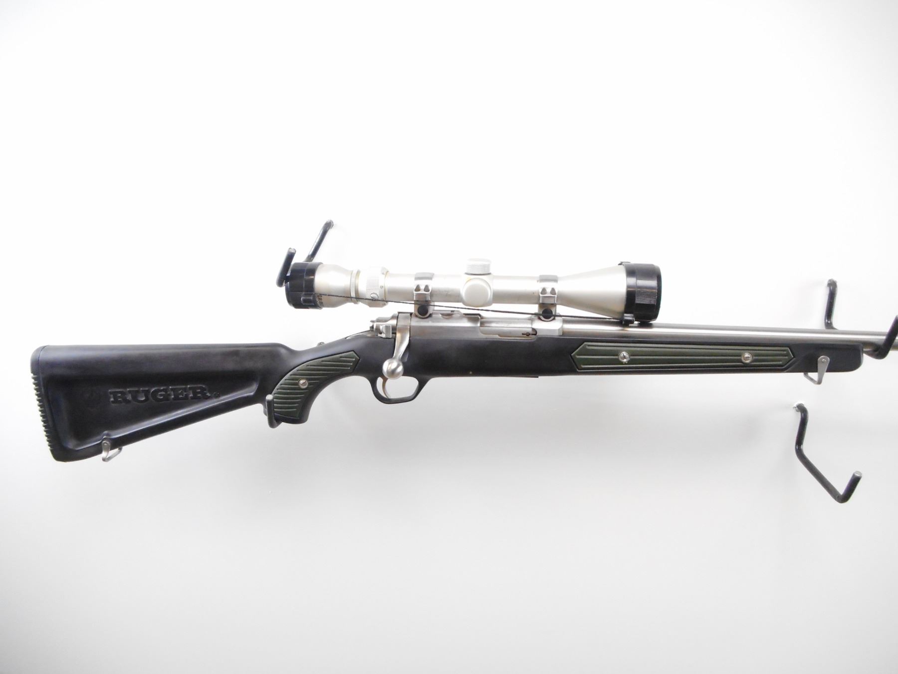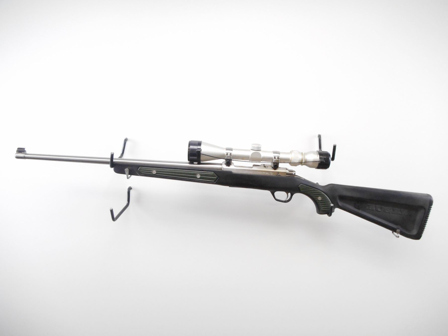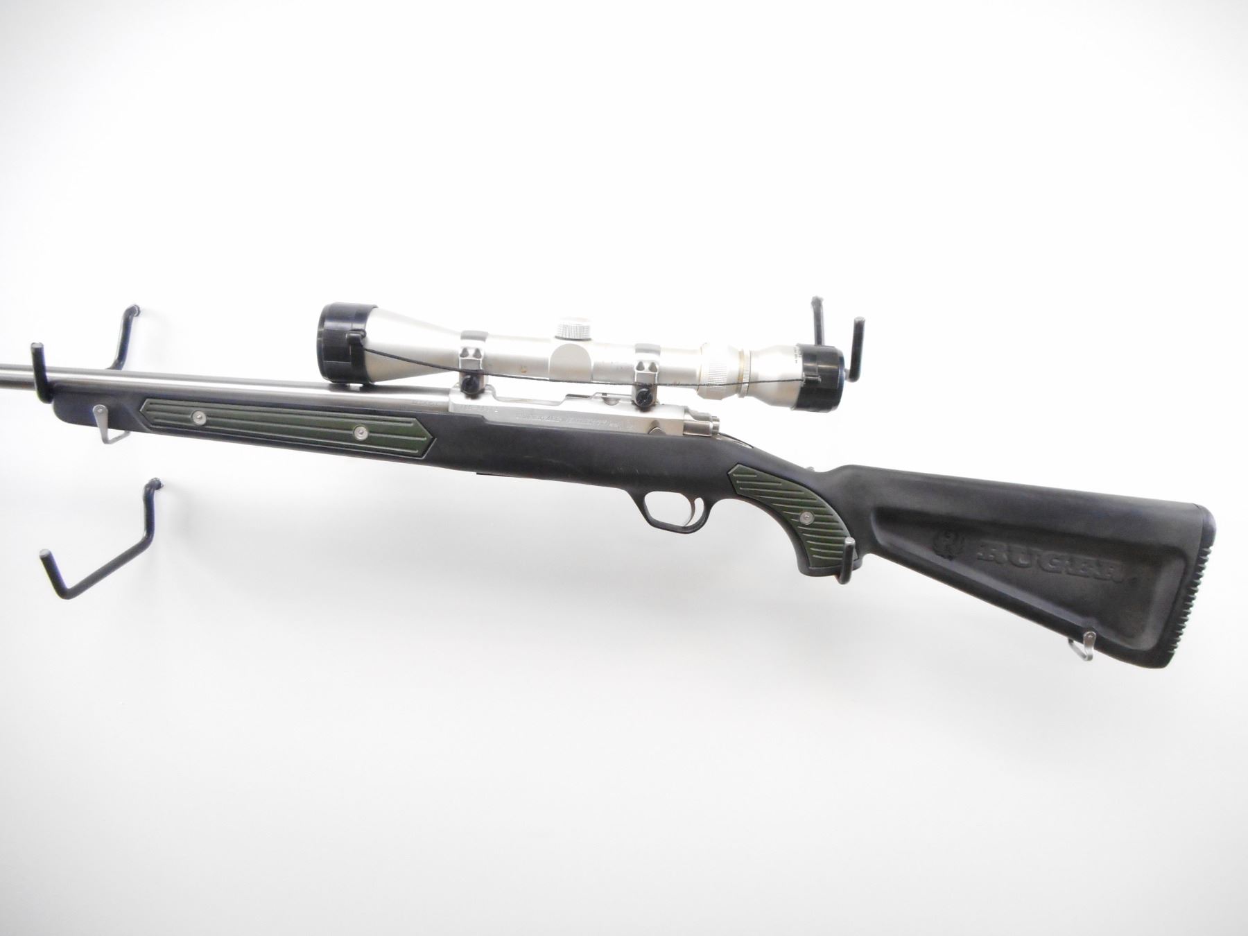 RUGER , MODEL: 77/22 ALL WEATHER , CALIBER: 22 LR , BORE IS EXCELLENT. BLADE FRONT SIGHT. REAR SIGHT REMOVED. TASCO 3-9 X 40 SCOPE. CLEAR OPTICS. DUPLEX RETICLE. STAINLESS METAL. ONE PIECE BLACK SYNTHETIC STOCK W/GREEN METAL INSERTS. GROOVED BLACK RUBBER RECOIL PAD. SWIVELS. METAIL SHOWS MINOR HANDLING MARKS, STOCK SHOWS SOME HANDLING MARKS. , ACTION: BOLT ACTION RIFLE , BARREL LENGTH: 20" , SERIAL # 70090572 , CONDITION: 7/10 , CLASS: CANADIAN NON RESTRICTED CLASS