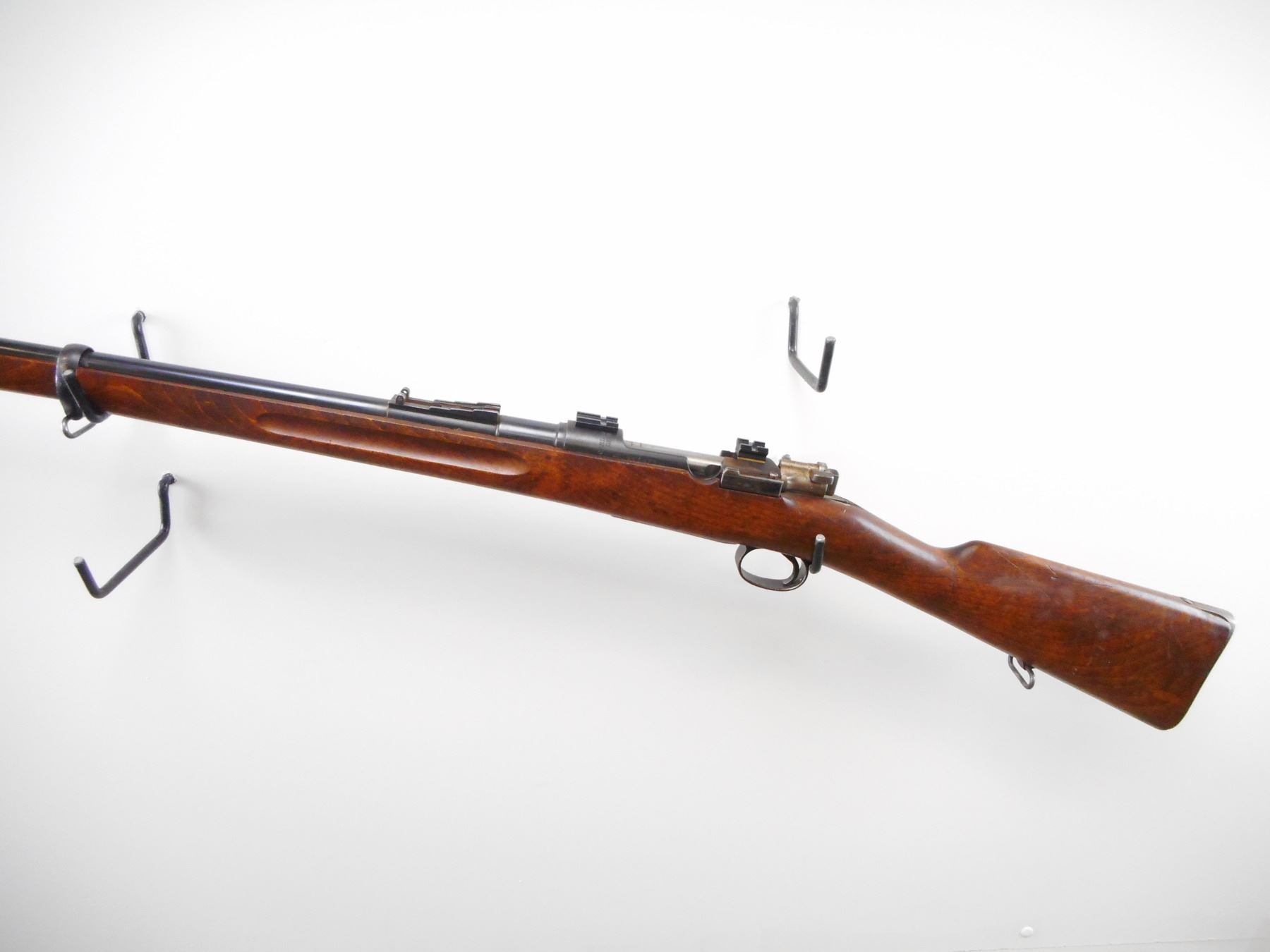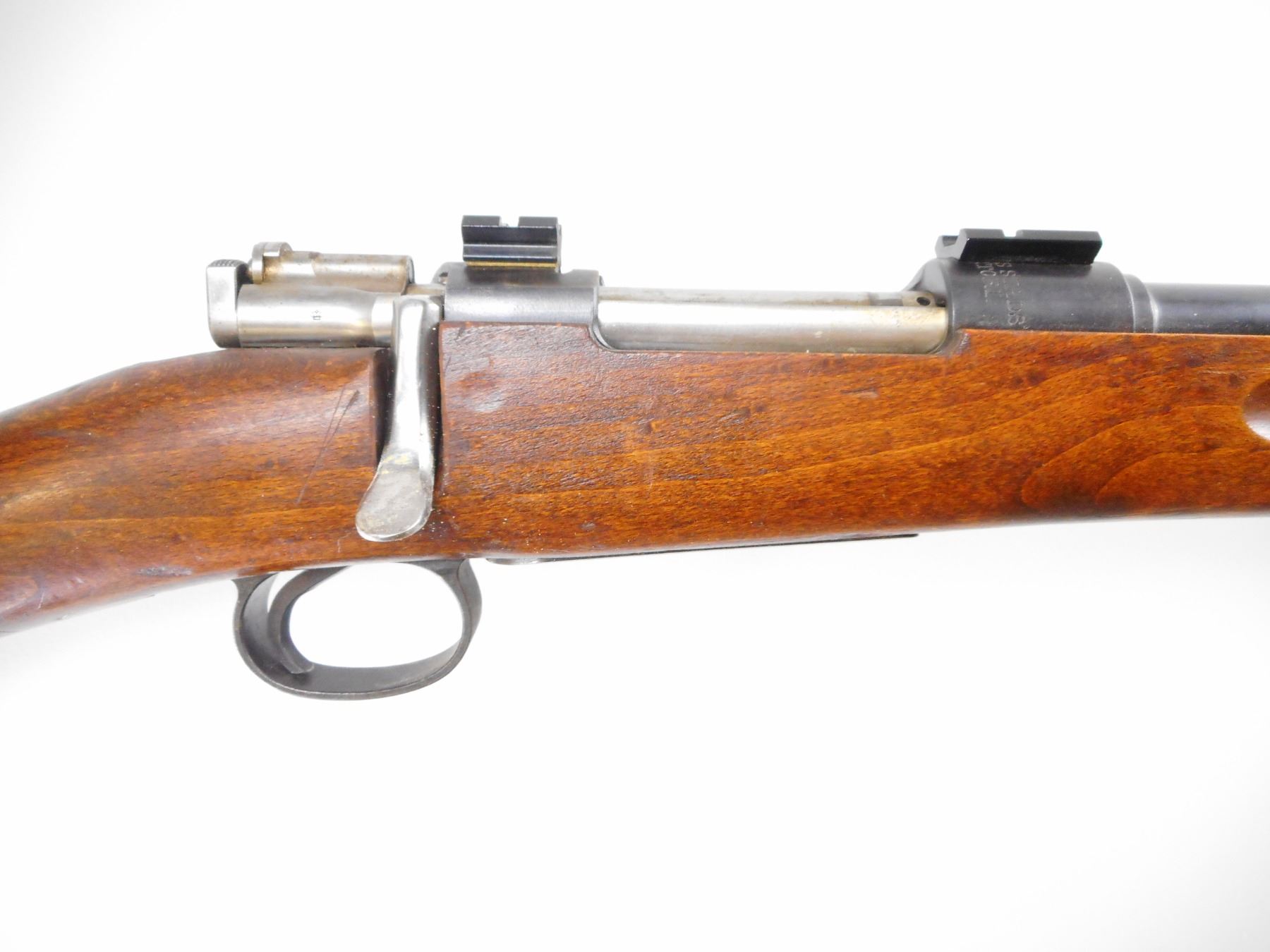 CARL GUSTAFS SWEDISH MAUSER , MODEL: 1896 , CALIBER: 6.5 X 55 SWED , BORE IS VERY GOOD, VISIBLE SERIAL NUMBERS DO NOT MATCH. BLADE FRONT SIGHT. REAR SIGHT REMOVED. RECEIVER DRILLED AND TAPPED WITH LEVER BASES. BOLT HANDLE MODIFIED . BOLT HAS LIGHT RUST SPECKLES. TWO PIECE FULL MILITARY STOCK MISSING TOP HAND GUARD. SMOOTH STEEL BUTT PLATE. BRASS MARKING DISC. SLING SWIVELS. BLUEING SHOWS SOME WEAR AND HANDLING MARKS. STOCK HAS SOME WEAR AND HANDLING MARKS. , ACTION: BOLT ACTION RIFLE , BARREL LENGTH: 29" , SERIAL # 465471 , CONDITION: 6/10 , CLASS: CANADIAN NON RESTRICTED CLASS
