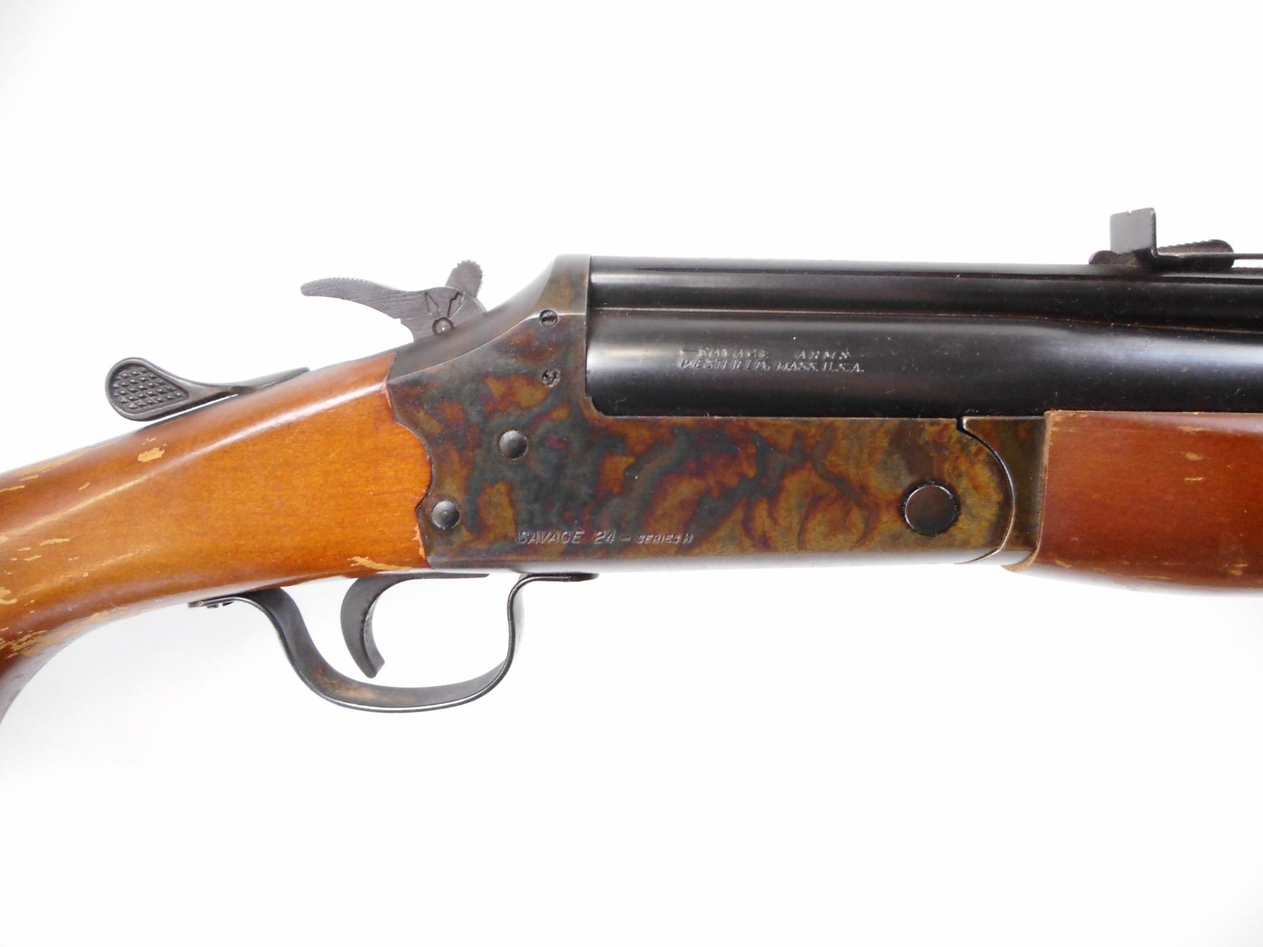 SAVAGE ARMS , MODEL: 24 SERIES M , CALIBER: 22 LR/20 GA 3" , I/M. BORES ARE EXCELLENT. BLADE FRONT SIGHT. ADJUSTABLE U NOTCH REAR SIGHT. BARREL GROOVED FOR SCOPE MOUNT. COLOUR CASE HARDENED RECEIVER. BARREL SELECTOR ON HAMMER. TWO PIECE SMOOTH WOOD STOCK. GROOVED BLACK POLYMER BUTT PLATE. SLING SWIVELS. METAL SHOWS SOME WEAR AND HANDLING MARKS. STOCK FINISH WORN, HANDLING MARKS. , ACTION: HINGED COMBINATION , BARREL LENGTH: 24" , SERIAL # A973120 , CONDITION: 6/10 , CLASS: CANADIAN NON RESTRICTED CLASS