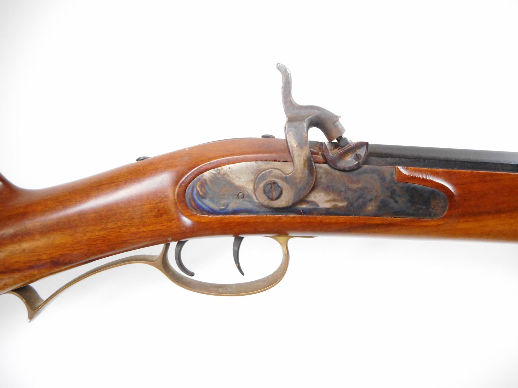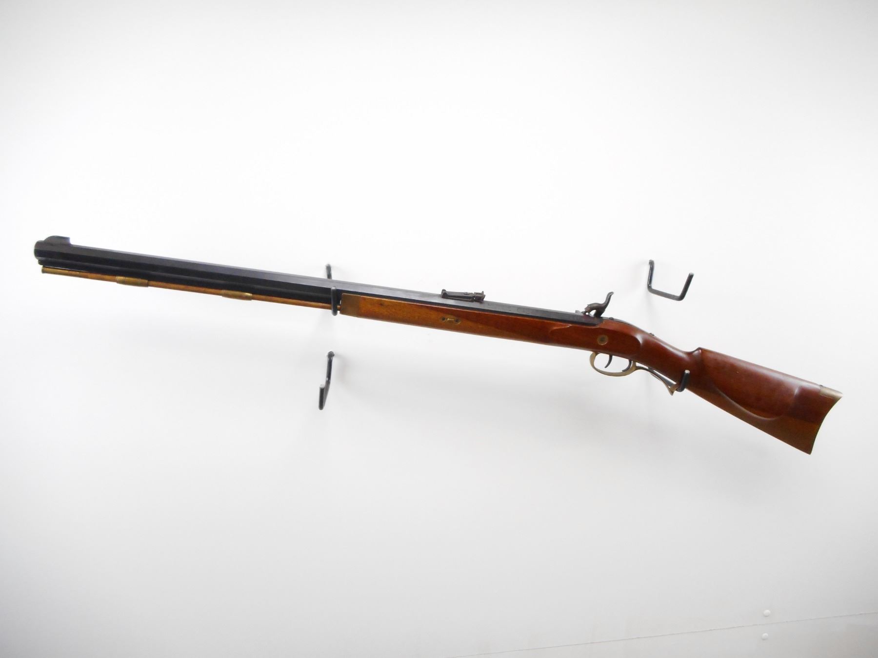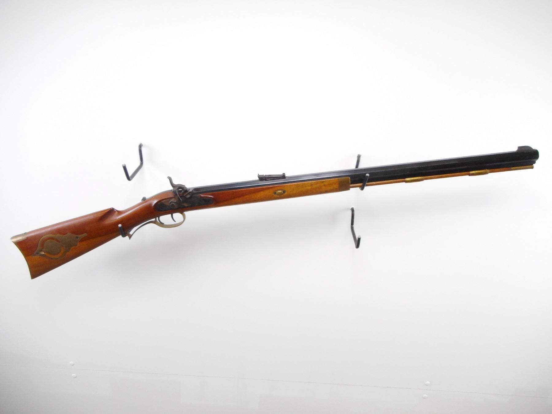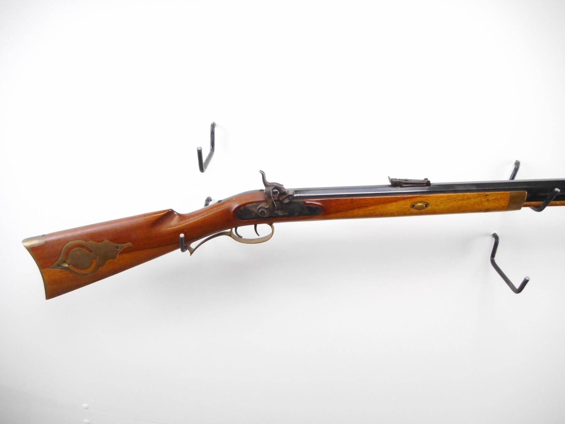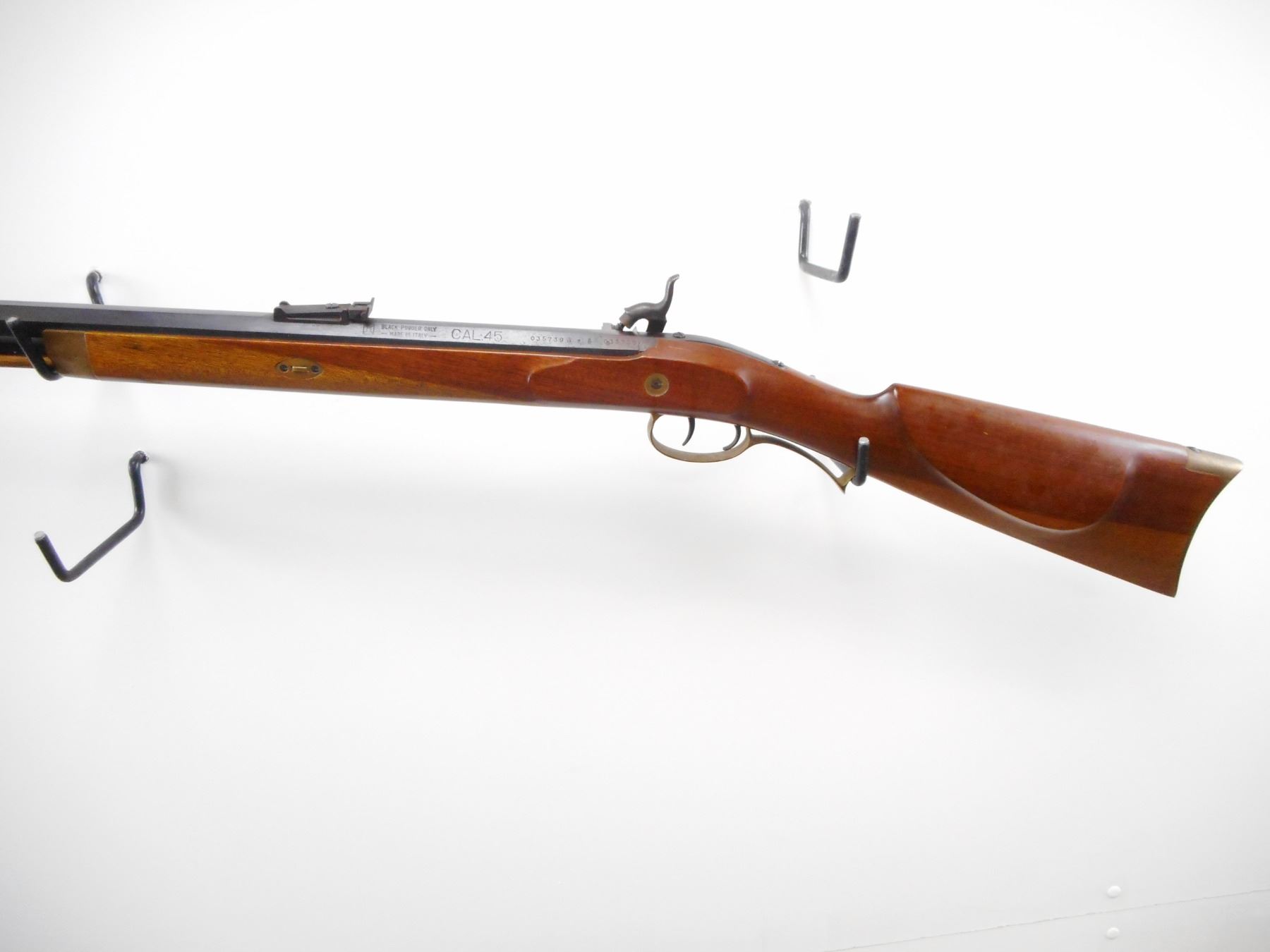 INTER ARMS , MODEL: HAWKEN , CALIBER: 45 , BORE IS VERY GOOD. BLADE FRONT SIGHT. ADJUSTABLE U NOTCH REAR SIGHT. OCTAGONAL BARREL. SMOOTH WOOD HALF STOCK. CHEEK REST. CURVED BRASS BUTT PLATE. PATCH BOX. TRIGGER GUARD, FOREND CAP. DOUBLE SET TRIGGERS. WOOD RAM ROD WITH TWO BRASS PIPES. METAL SHOWS SOME WEAR. STOCK SHOWS SOME HANDLING MARKS. , ACTION: PRECUSSION , BARREL LENGTH: 28" , SERIAL # 35739 , CONDITION: 7/10 , CLASS: CANADIAN NON RESTRICTED CLASS
