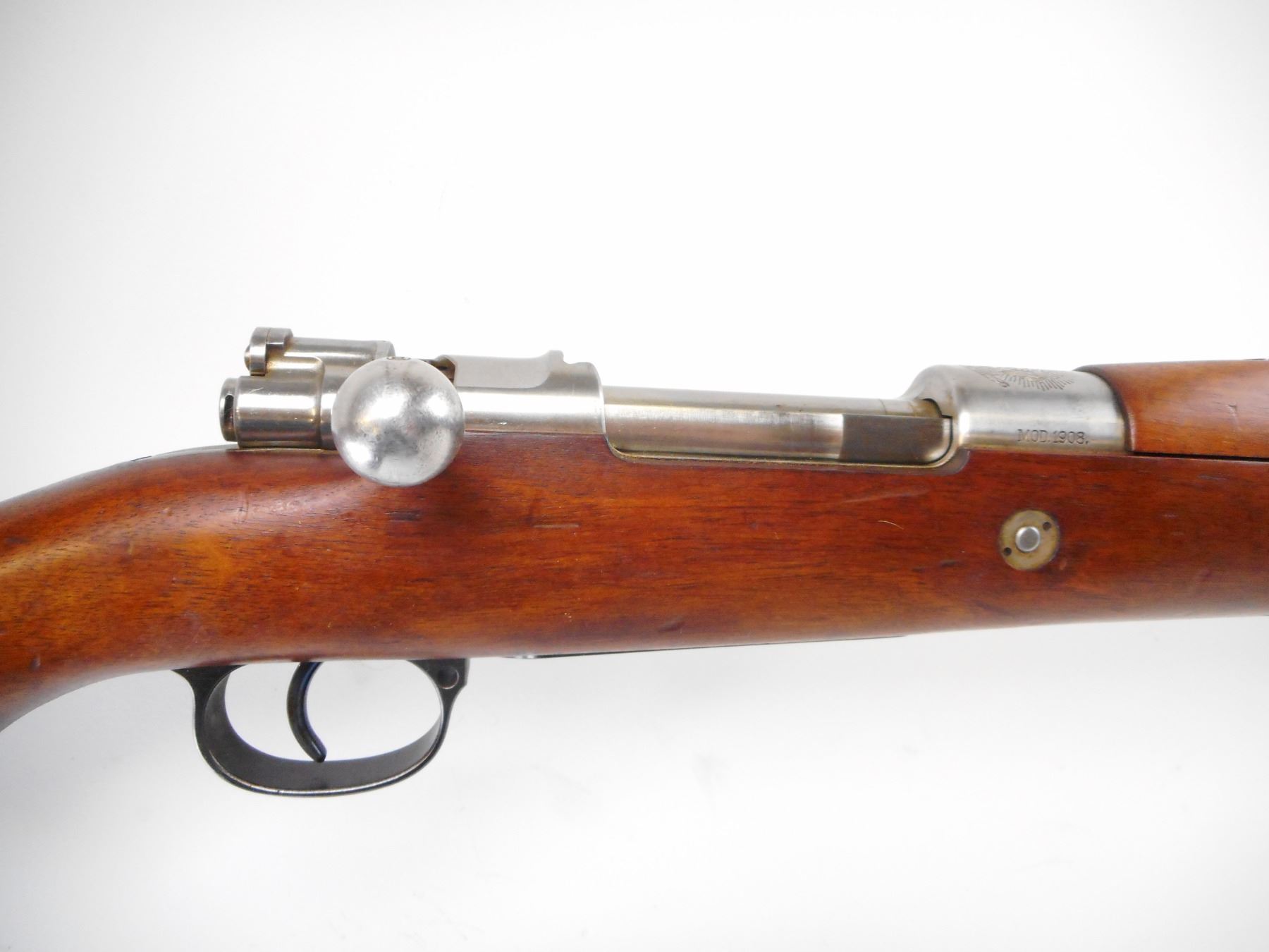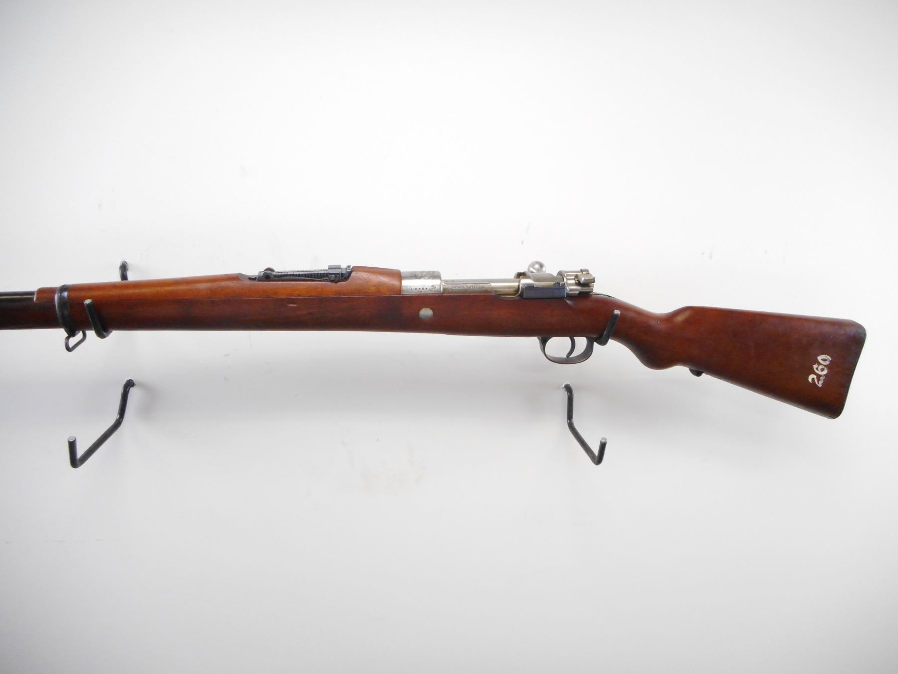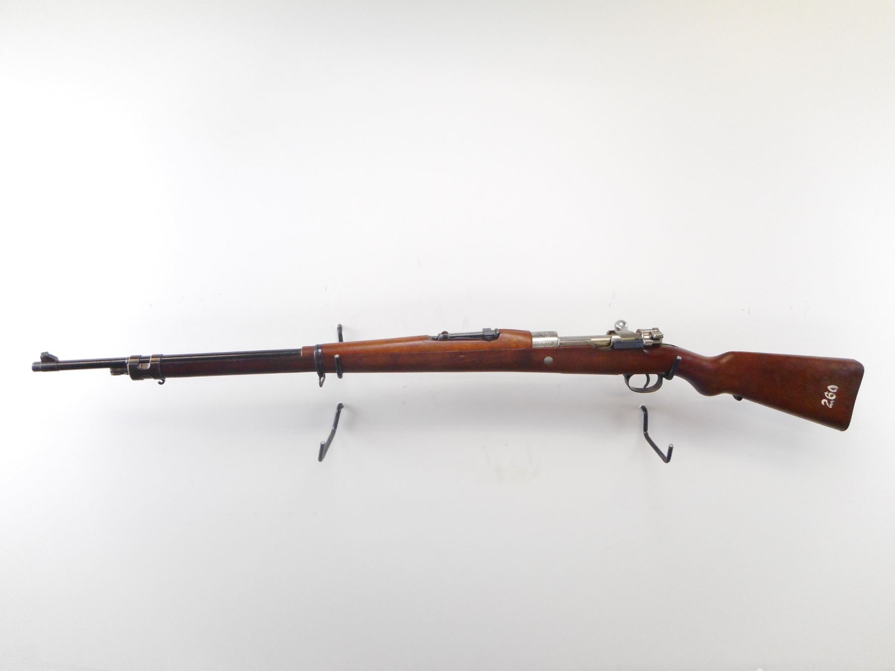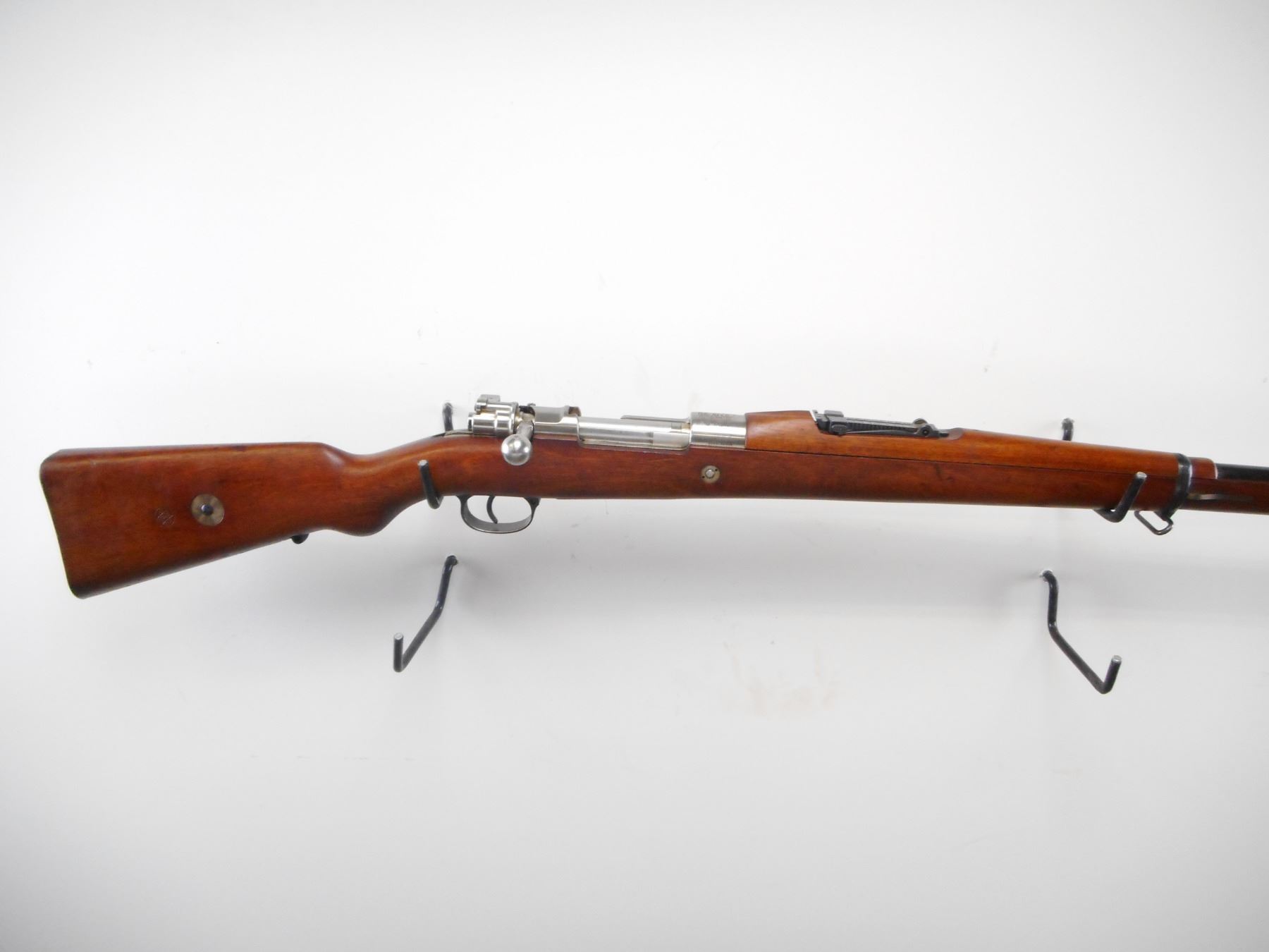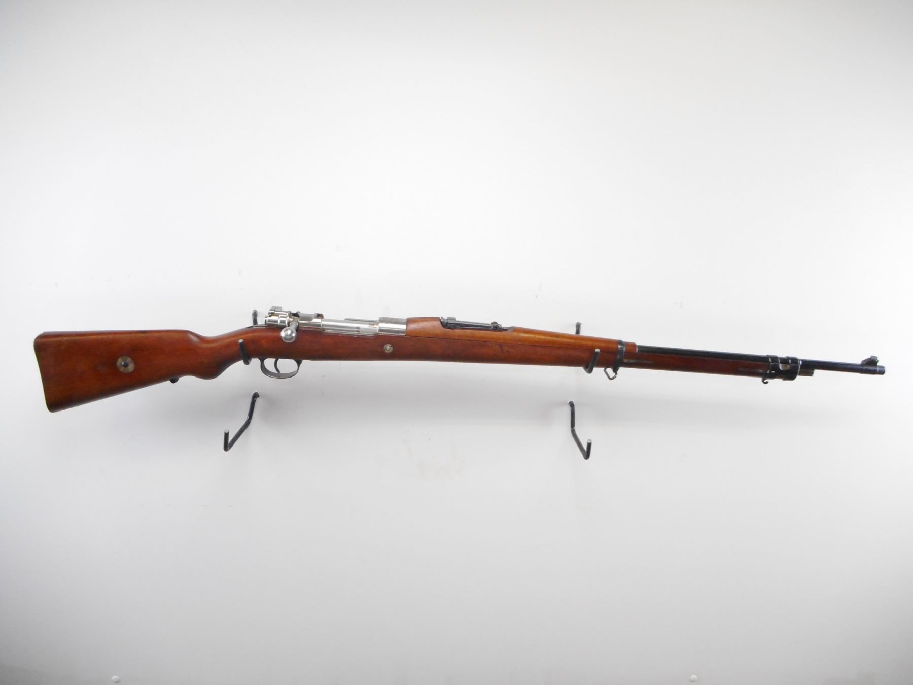 DWM , MODEL: 1908 , CALIBER: 7 X 57 MAUSER , BORE IS EXCELLENT. MATCHING SERIAL NUMBERS. BARELY CORN FRONT SIGHT WITH RAMP. ADJUSTABLE U NOTCH REAR SIGHT. SILVER RECEIVER AND BOLT. STARIGHT HANDLE. TWO PIECE FULL MILITARY STOCK. SMOOTH STEEL BUTT PLATE. STOCK DISK. NUMBER 260 ON LEFT SIDE. REAR SIVEL STUD. FRONT SWIVEL. HIGH POLISHED BLUEING SHOWING SOME WEAR. STOCK SHOWS SOME DING WEAR AND HANDLING MARKS. , ACTION: BOLT ACTION RIFLE , BARREL LENGTH: 29" , SERIAL # 4527N , CONDITION: 7/10 , CLASS: CANADIAN NON RESTRICTED CLASS