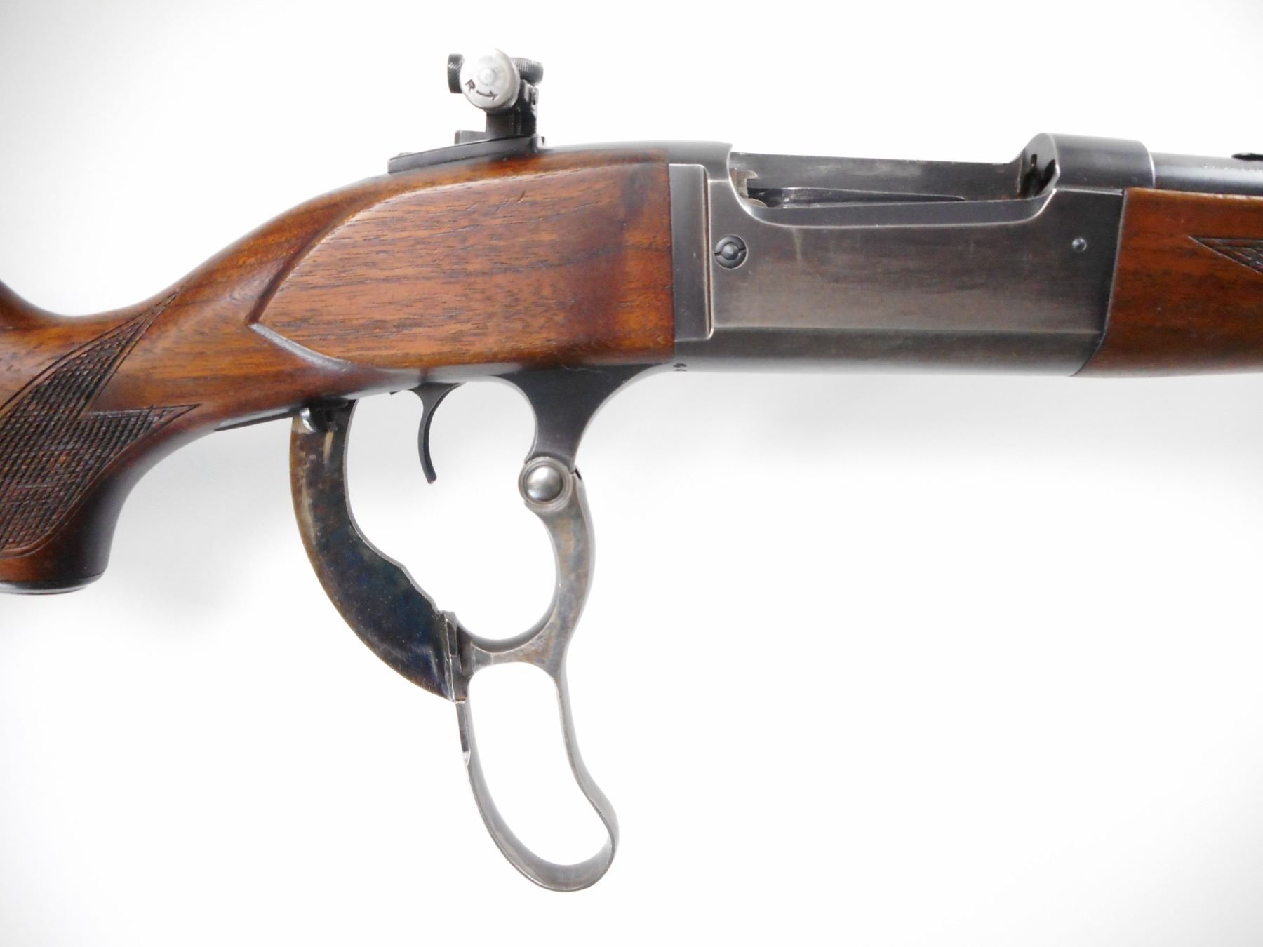 SAVAGE , MODEL: 99EG , CALIBER: 300 SAVAGE , BORE IS VERY GOOD. BLADE FRONT SIGHT WITH RAMP. U NOTCH SEMI BUCKHORN REAR SIGHT . REDFIELD PEEP SIGHT ON RECEIVER. TWO PIECE WOOD STOCKS. CHECKERED FOREARM AND PISTOL GRIP. GROOVED STEEL BUTT PLATE. GRIP CAP. SLING SWIVELS. BLUEING SHOWS SOME WEAR AND HANDLING MARKS. STOCK SHOWS SOME DING AND HANDLING MARKS. ONE CRACK BEHIND TOP TANG. , ACTION: LEVER ACTION RIFLE , BARREL LENGTH: 24" , SERIAL # 446453 , CONDITION: 7/10 , CLASS: CANADIAN NON RESTRICTED CLASS
