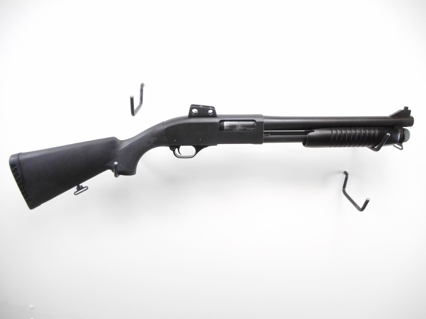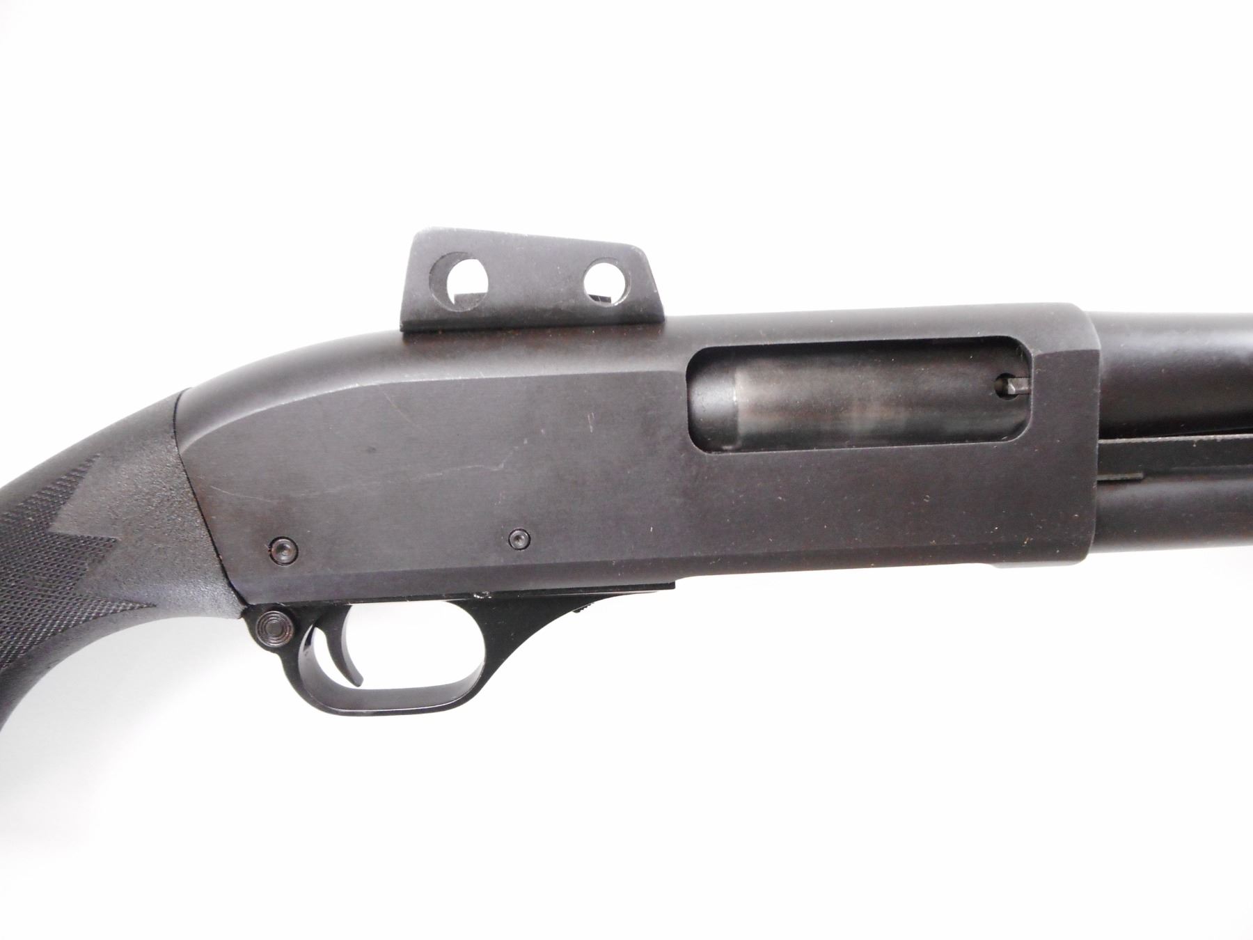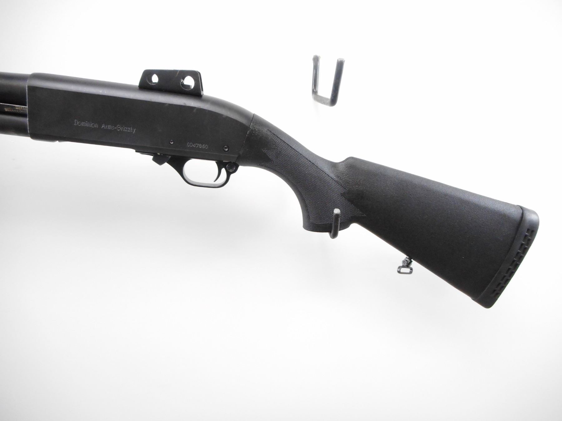 DOMINION ARMS , MODEL: GRIZZLEY , CALIBER: 12 GA X 3" , REMOVEABLE FULL CHOKE. BLADE FRONT SIGHT WITH RAMP. ADJUSTABLE REAR PEEP SIGHT WITH EARS. MATTE FINISH ON METAL PARTS. GROOVED BLACK SYNTHETIC FOREND. CHECKERED PISTOL GRIP. BLACK SYNTHTIC BUTTSTOCK. BLACK VENTED RUBBER RECOIL PAD. SLING SWIVELS. METAL FINISH SHOWS HANDLING MARKS AND WEAR. STOCK SHOWS HANDLING MARKS. , ACTION: PUMP ACTION SHOTGUN , BARREL LENGTH: 12 1/2" , SERIAL # 0047850 , CONDITION: 7/10 , CLASS: CANADIAN NON RESTRICTED CLASS