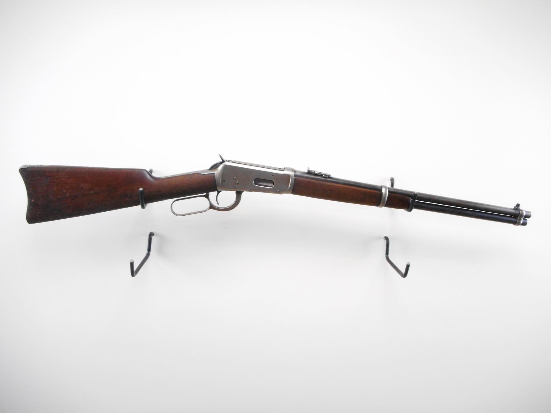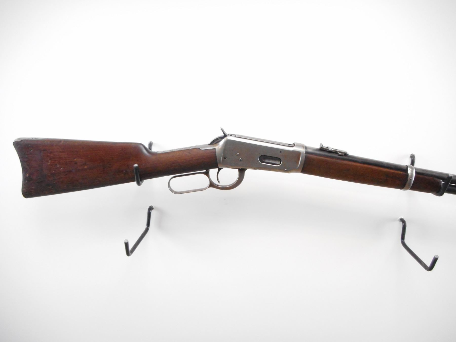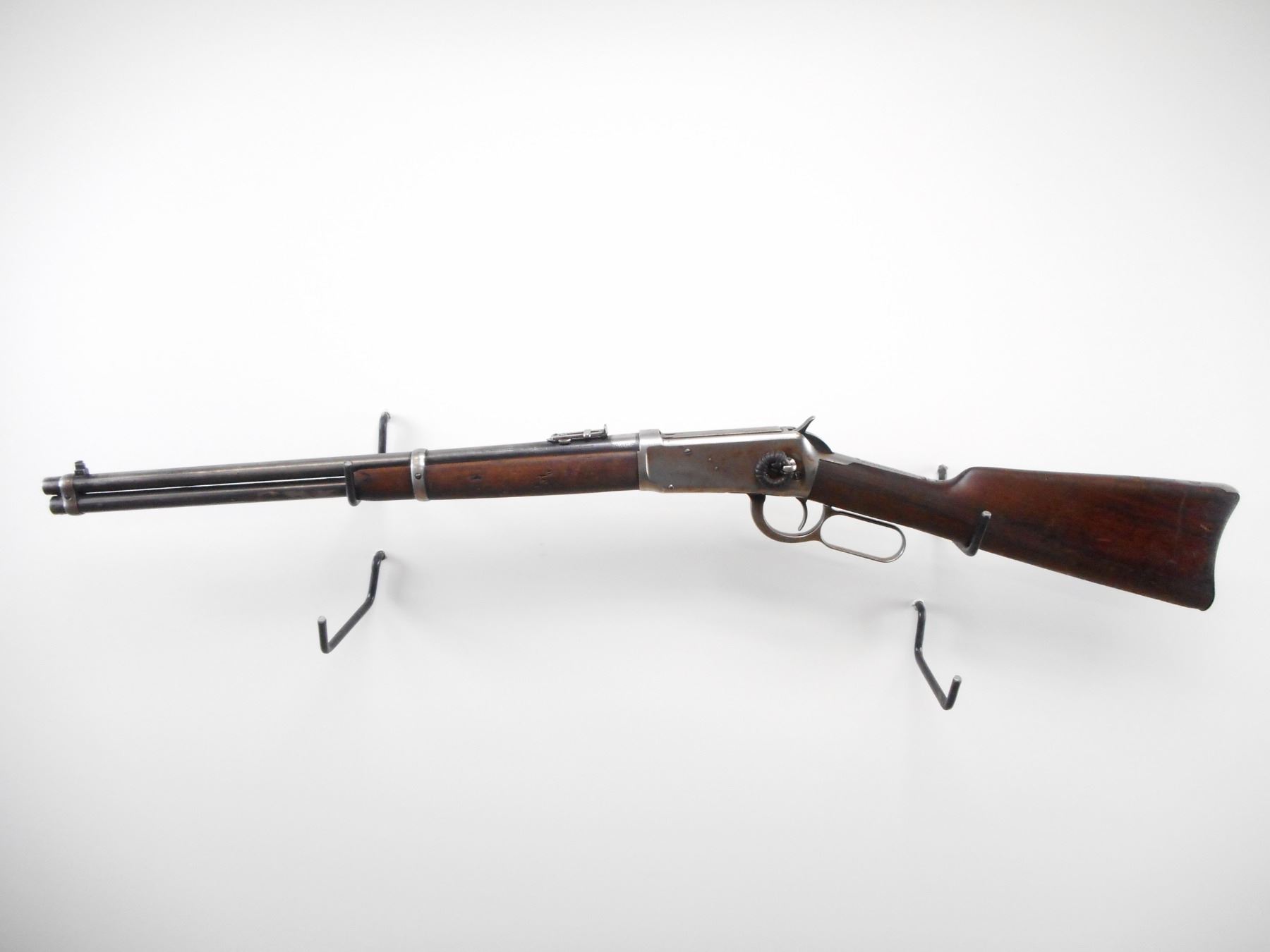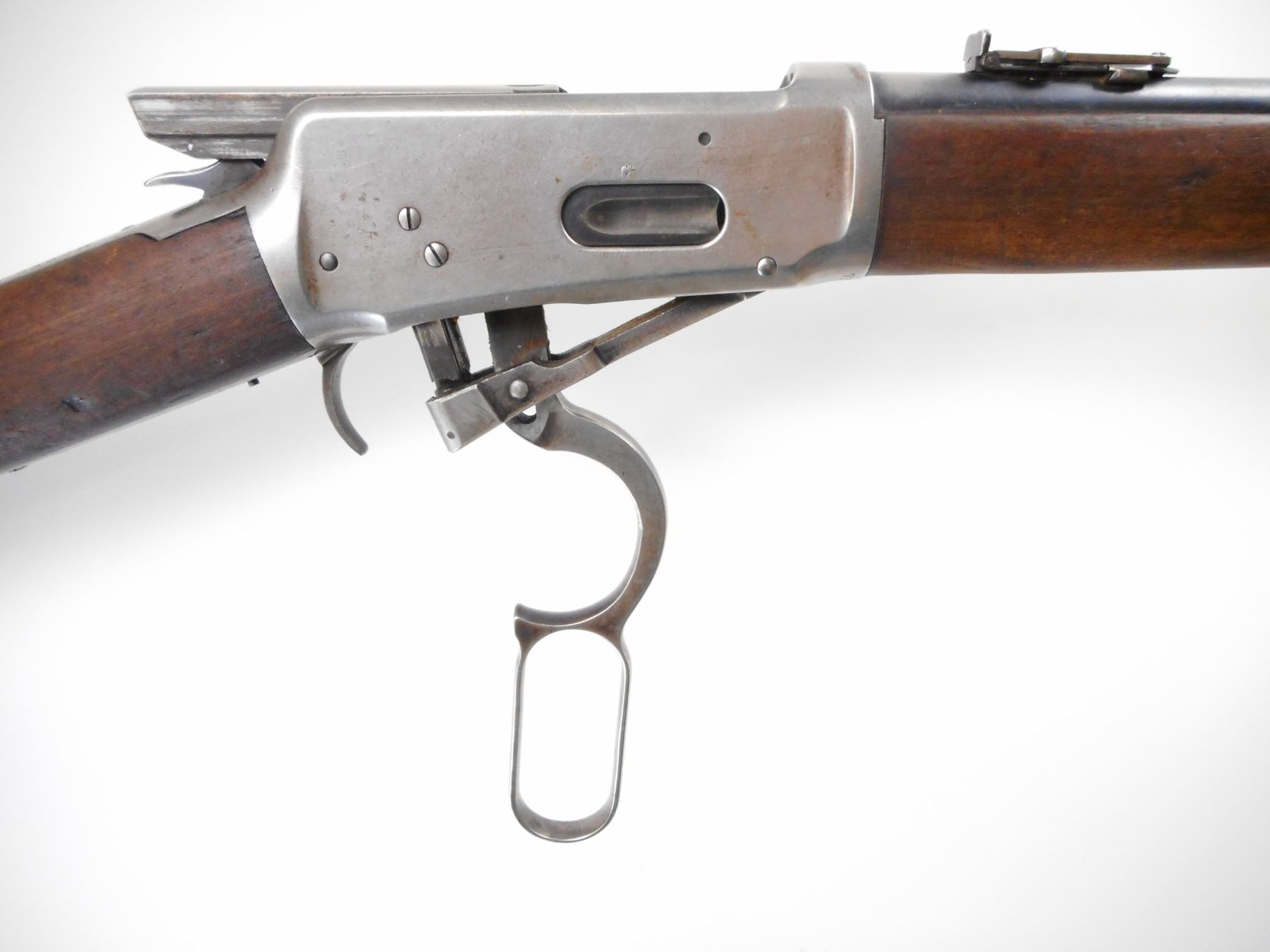 WINCHESTER , MODEL: 1894 SADDLE RING CARBINE , CALIBER: 30 WCF , BORE IS GOOD, WORN. MFG'D 1914. CANADIAN GOVERNMENT ISSUE. DCP PROOF MARK. BLADE FRONT SIGHT. U NOTCH FOLDING LADDER REAR SIGHT. BARREL MARKED NICKEL STEEL. SADDLE RING AND STUD PRESENT, RING WRAPPED IN LEATHER. GUMWOOD TWO PIECE WOOD STOCK. CURVED STEEL CARBINE BUTT PLATE. TANG DRILLED AND TAPPED FOR PEEP SIGHT. FULL LENGTH MAG TUBE. BLUEING FADING LIGHT PITTED SPOTS SHOWS WEAR. STOCK SHOWS HANDLING MARKS AND DINGS , ACTION: LEVER ACTION RIFLE , BARREL LENGTH: 20" , SERIAL # 750037 , CONDITION: 6/10 , CLASS: CANADIAN NON RESTRICTED CLASS
