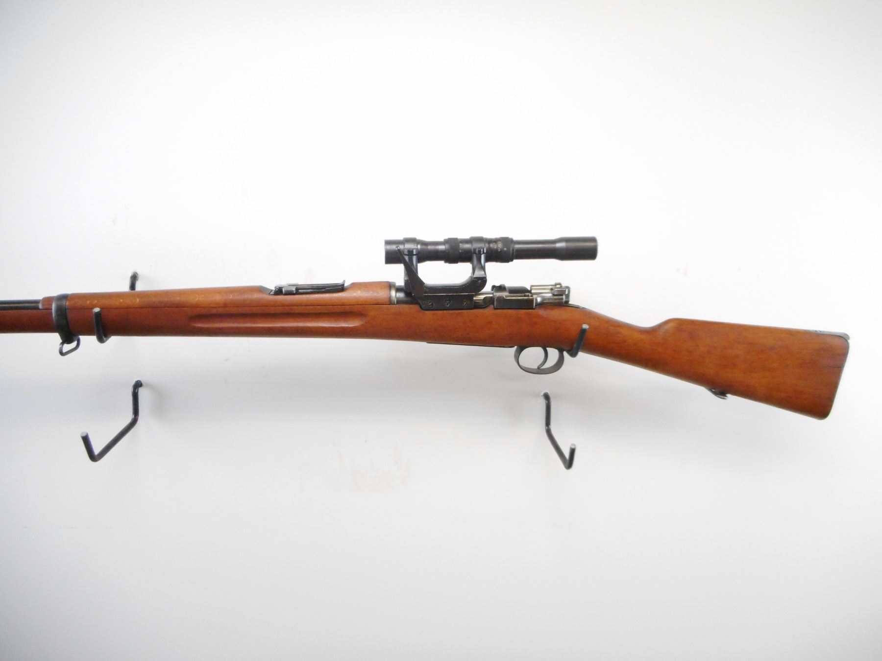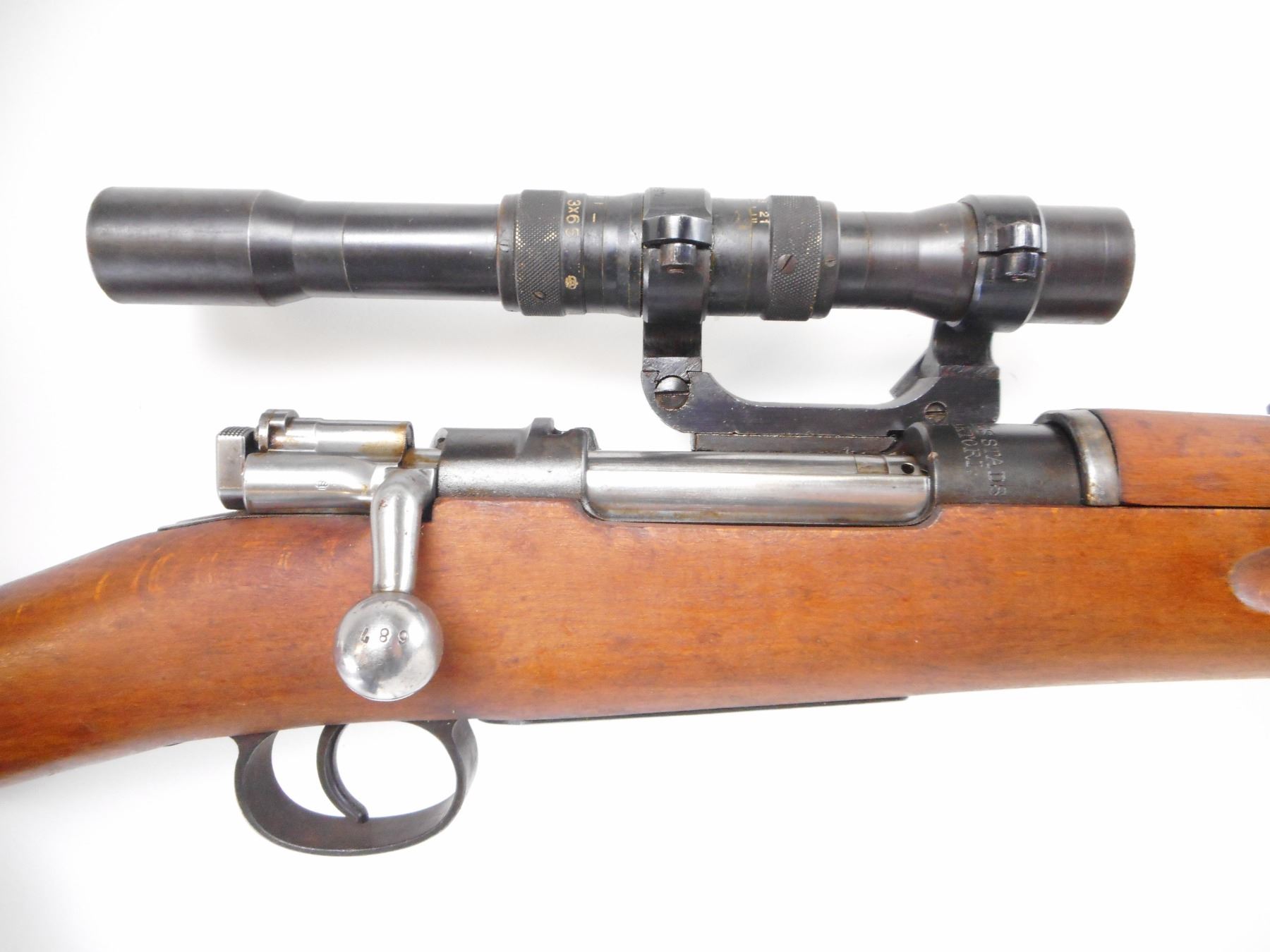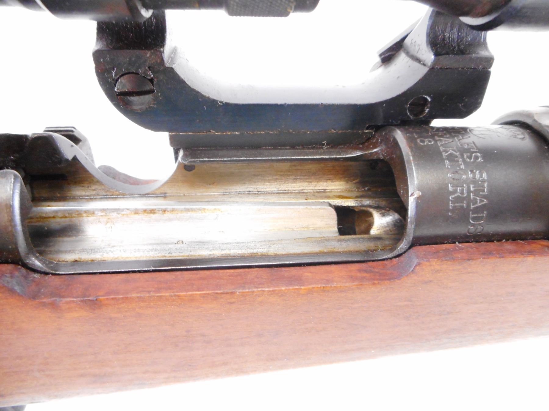 SWEDISH MAUSER , MODEL: M41B , CALIBER: 6.5 X 55 SWEDISH , BORE IS VERY GOOD. MFG'D BY CARL GUSTOFF 1918. RIFLE SERIAL NUMBER COVERED BY MOUNT. VISIBLE PARTS ON RIFLE MATCH. SCOPE MOUNT NUMBERED 897. SCOPE NUMBERED 685. BLADE FRONT SIGHT. ADJUSTABLE U NOTCH REAR SIGHT. SCOPE MARKED M42 AGA 3X65. CLEAR OPTICS. 3 POST RETICLE. TWO PIECE FULL MIILITARY STOCK. SMOOTH STEEL BUTT PLATE. STOCK MARKING DISK. SLING SWIVELS. CLEAING ROD. BLUEING SHOWS SOME WEAR. STOCK SHOWS SOME WEAR AND HANDLING MARKS. , ACTION: BOLT ACTION RIFLE , BARREL LENGTH: 29 1/2" , SERIAL # 687 , CONDITION: 8/10 , CLASS: CANADIAN NON RESTRICTED CLASS