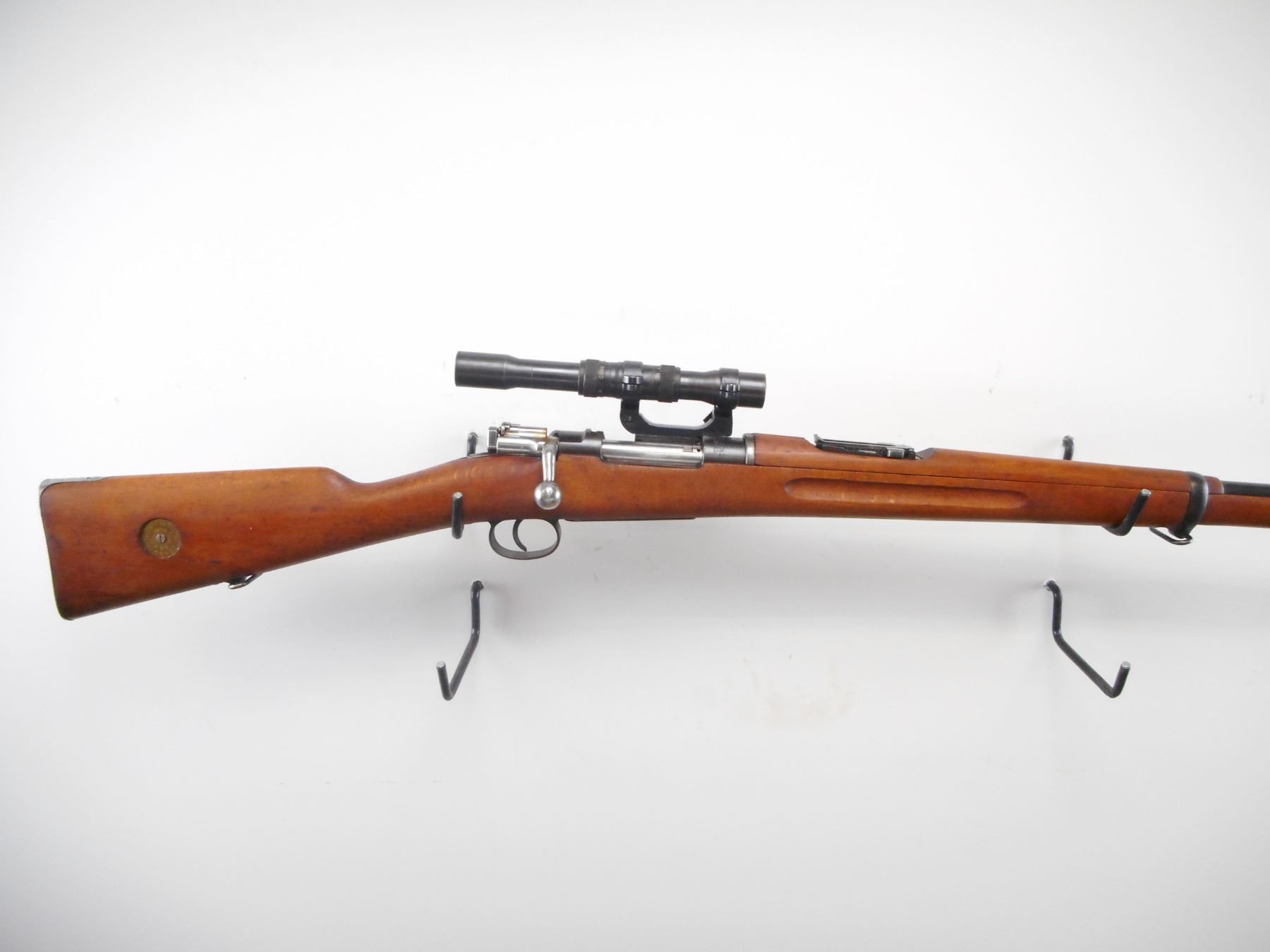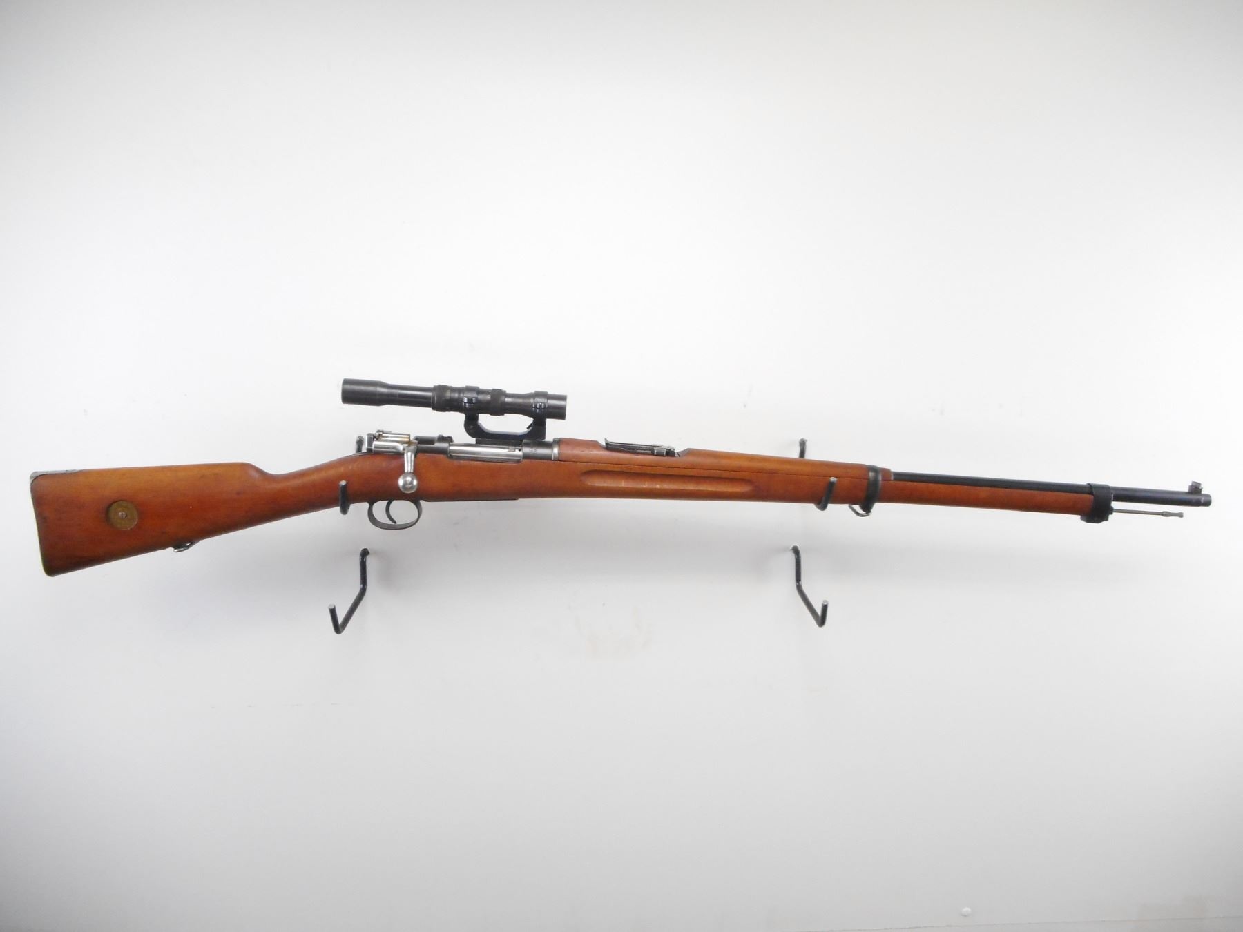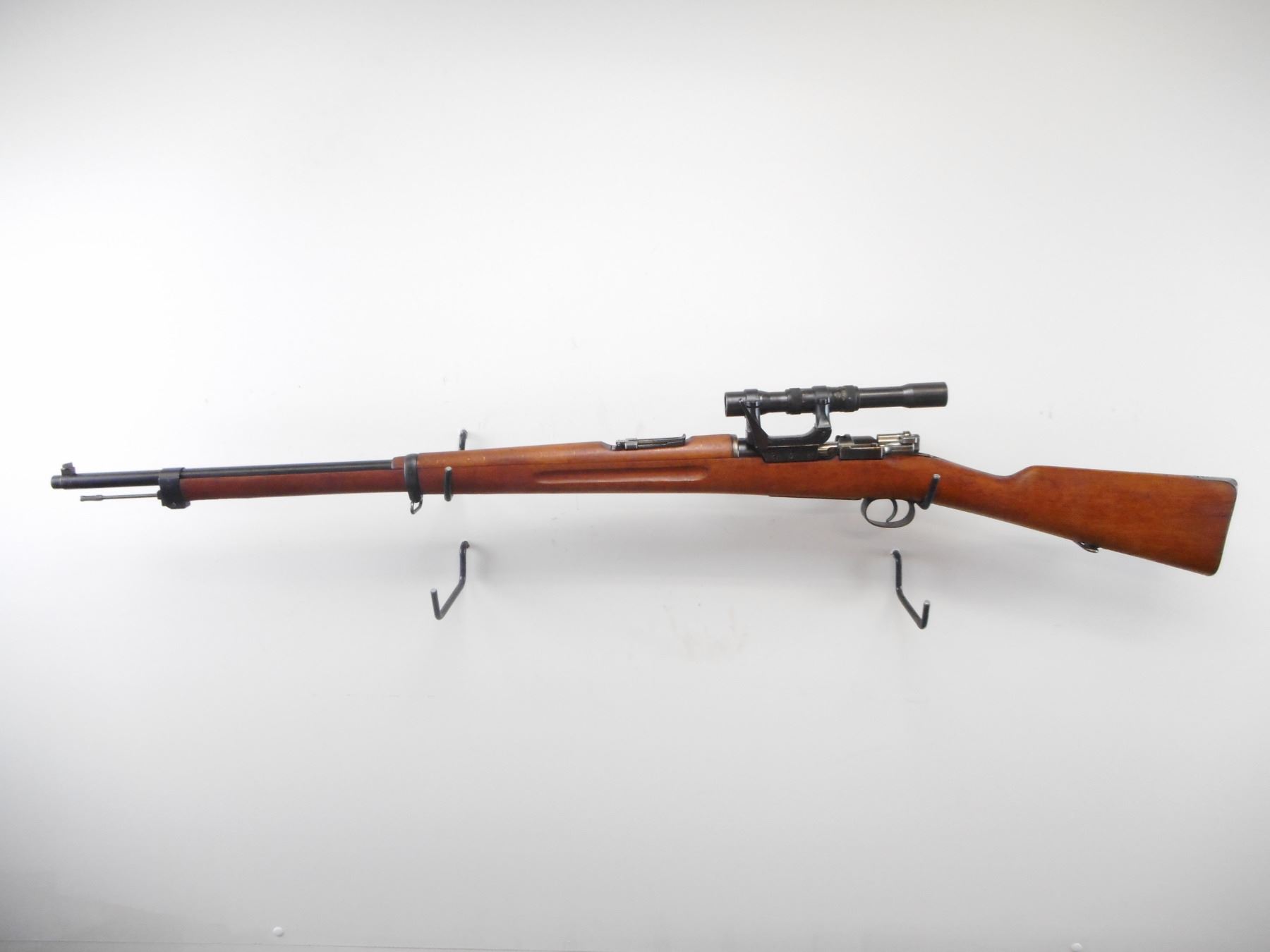SWEDISH MAUSER , MODEL: M41B , CALIBER: 6.5 X 55 SWEDISH , BORE IS VERY GOOD. MFG'D BY CARL GUSTOFF 1918. RIFLE SERIAL NUMBER COVERED BY MOUNT. VISIBLE PARTS ON RIFLE MATCH. SCOPE MOUNT NUMBERED 897. SCOPE NUMBERED 685. BLADE FRONT SIGHT. ADJUSTABLE U NOTCH REAR SIGHT. SCOPE MARKED M42 AGA 3X65. CLEAR OPTICS. 3 POST RETICLE. TWO PIECE FULL MIILITARY STOCK. SMOOTH STEEL BUTT PLATE. STOCK MARKING DISK. SLING SWIVELS. CLEAING ROD. BLUEING SHOWS SOME WEAR. STOCK SHOWS SOME WEAR AND HANDLING MARKS. , ACTION: BOLT ACTION RIFLE , BARREL LENGTH: 29 1/2" , SERIAL # 687 , CONDITION: 8/10 , CLASS: CANADIAN NON RESTRICTED CLASS