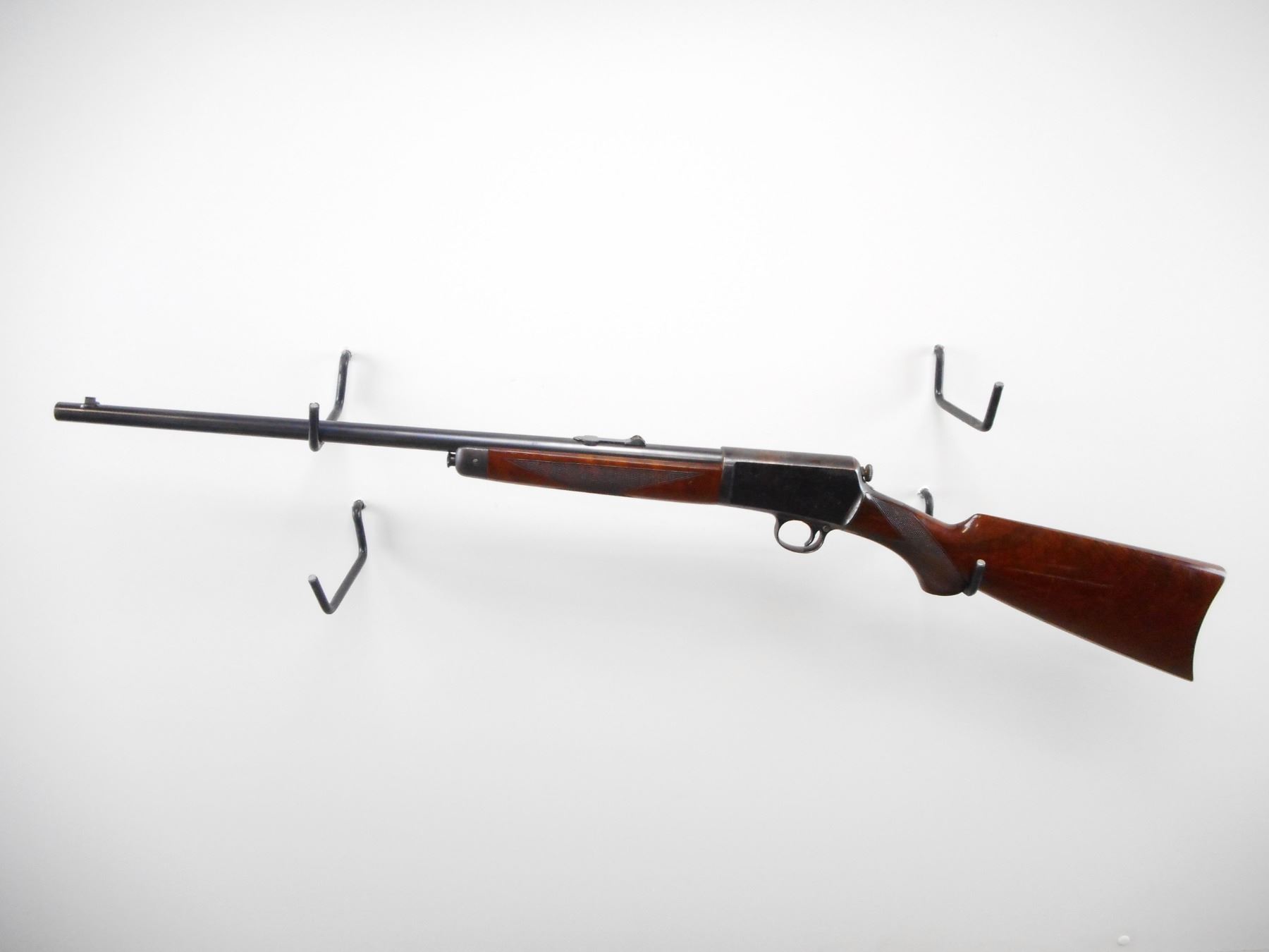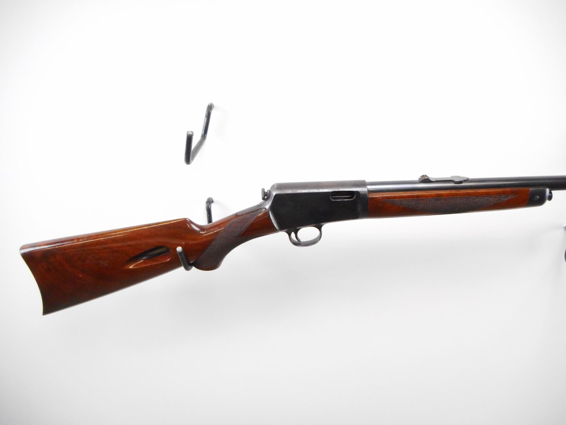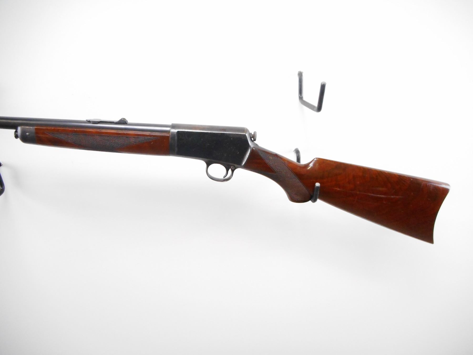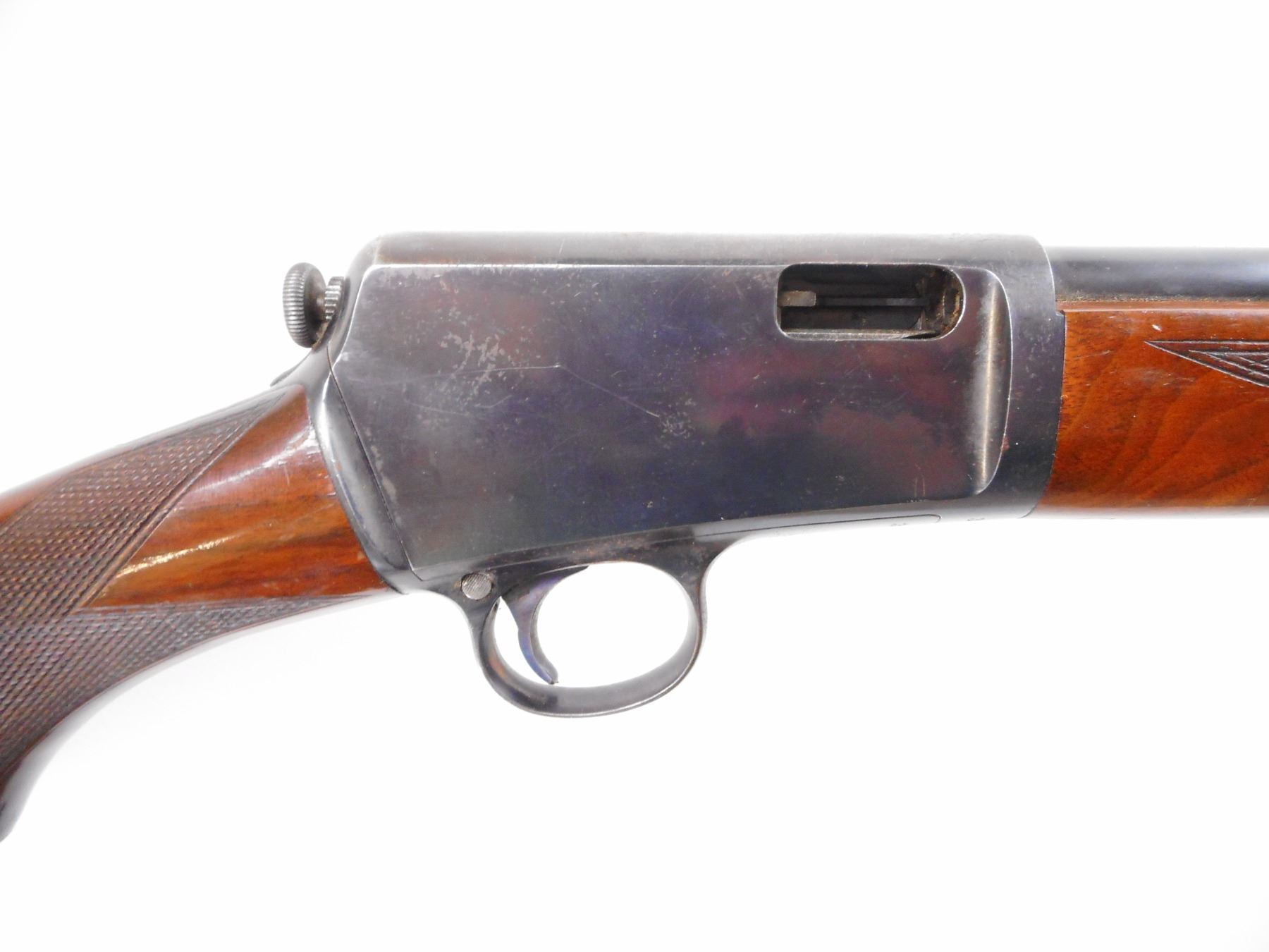 WINCHESTER , MODEL: 1903 , CALIBER: 22 CAL AUTO , BORE IS GOOD. BLADE FRONT SIGHT. U NOTCH ADJUSTABLE REAR SIGHT. POLISHED BLUE ON METAL PARTS. TWO PIECE WOOD STOCKS, HIGH GLOSS FINISH. CHECKERED FOREARM AND PISTOL GRIPS. CURVED STEEL BUTT PLATE. WINCHESTER GRIP CAP. STOCK SHOWS NICE FIGURING IN GRAIN. BLUEING SHOWS HANDLING MARKS. TOP OF RECEIVER SHOWS WEAR. STOCK SHOWS DING AND SCRATCHES. , ACTION: SEMI AUTO RIFLE , BARREL LENGTH: 20" , SERIAL # 37058 , CONDITION: 7/10 , CLASS: CANADIAN NON RESTRICTED CLASS