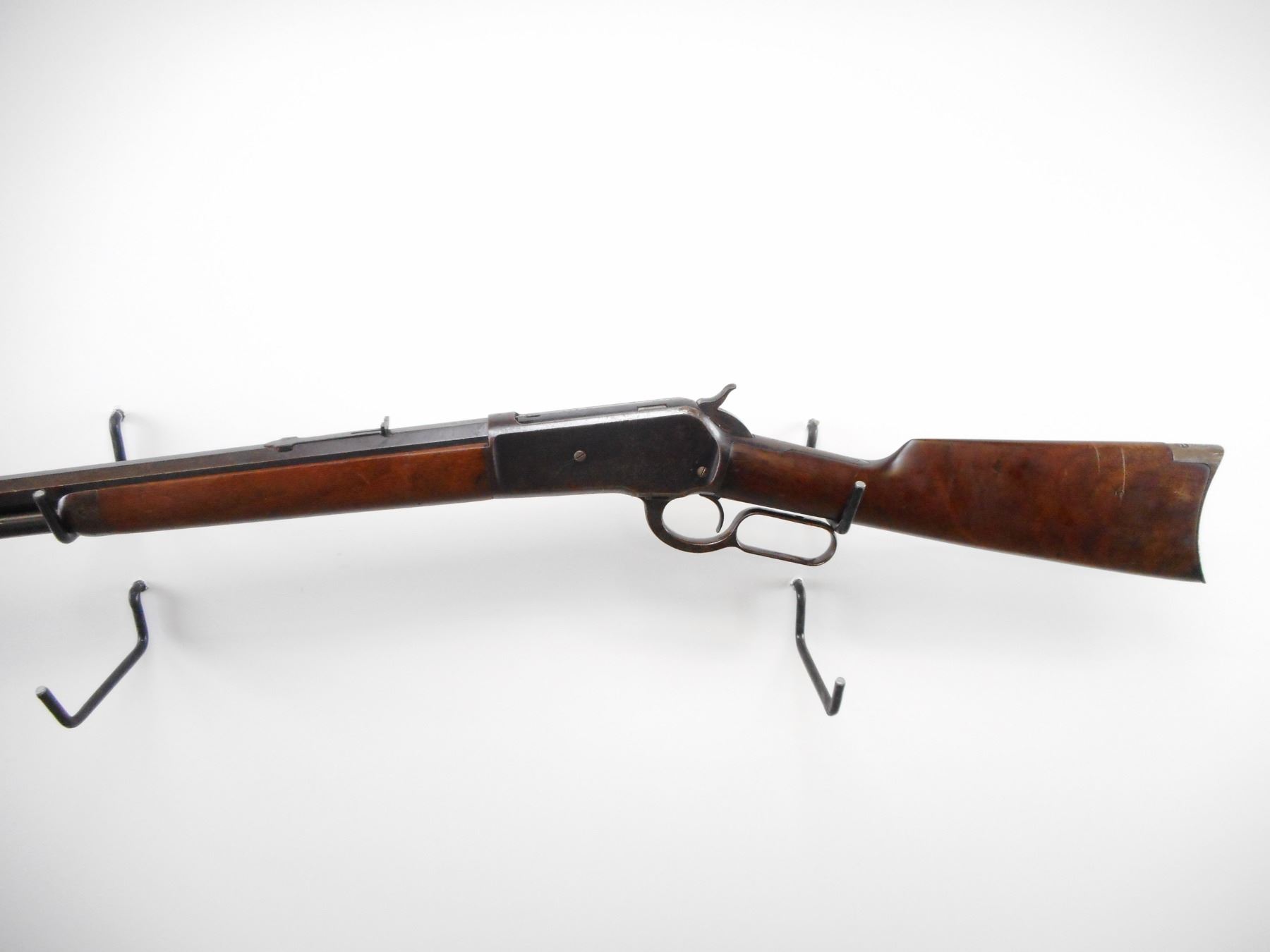 WINCHESTER , MODEL: 1886 , CALIBER: 38-56 , BORE IS GOOD, SOME SHINE, LIGHT PITTING. MFG'D 1905. BLADE FRONT SIGHT. V-NOTCH REAR SIGHT, MISSING ELEVATOR. BLUED OCTAGONAL BARREL AND RECEIVER. TANG DRILLED AND TAPPED FOR PEEP SIGHT. TWO PIECE SMOOTH WOOD STOCKS. CURVED STEEL BUTT PLATE. STEEL FOREND CAP. FULL LENGTH MAG TUBE. BLUEING SHOWS LIGHT PITTED SPOTS AND WEAR. RECEIVER SHOWS LIGHT PITTED SPOTS AND WEAR. STOCK SHOWS DINGS SCRATCHES AND WEAR. , ACTION: LEVER ACTION , BARREL LENGTH: 26" , SERIAL # 136651 , CONDITION: 6 1/2/10 , CLASS: CANADIAN NON RESTRICTED CLASS