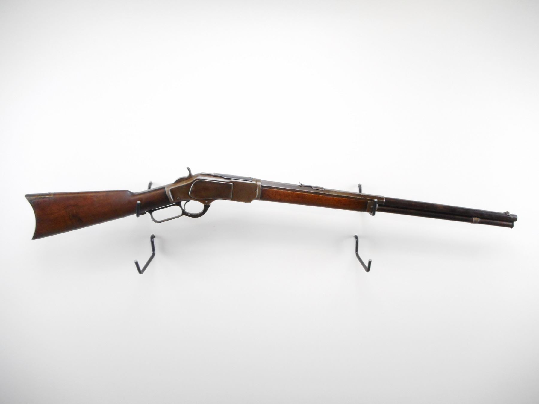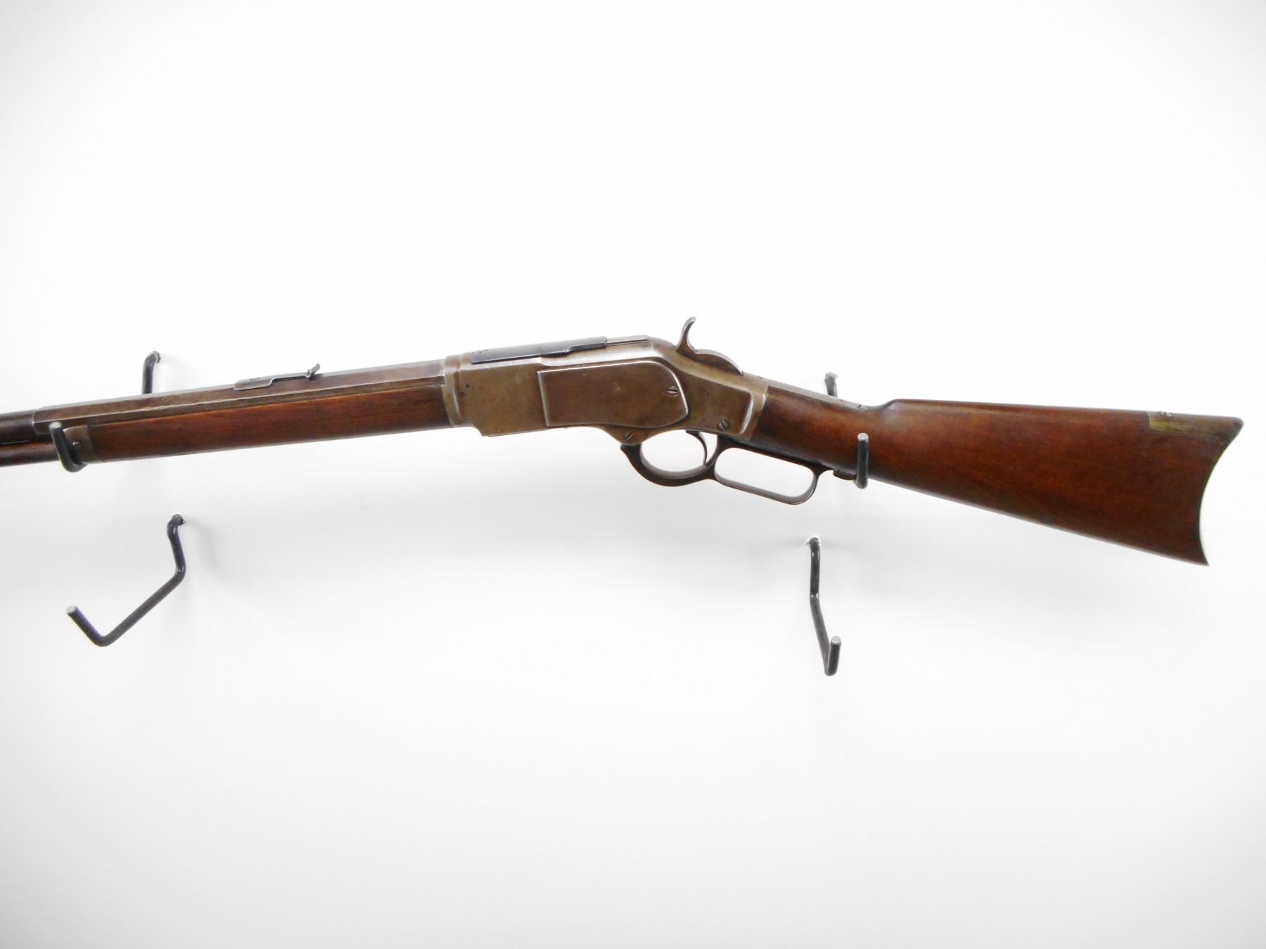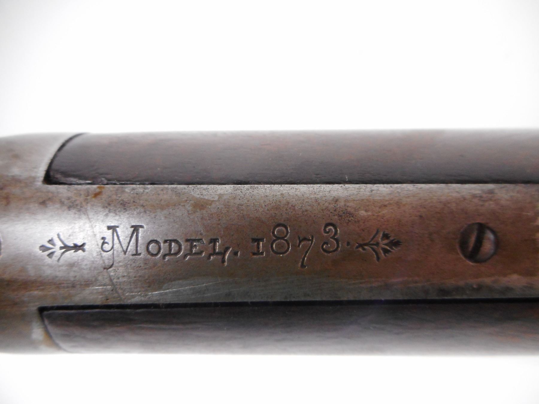 WINCHESTER , MODEL: 1873 SPECIAL ORDER , CALIBER: 22 SHORT , BORE IS FAIR, DARK, LIGHT PITTING. MFG'D 1884 (USA ANTIQUE). BLADE FRONT SIGHT. REPLACED U NOTCH ADJUSTABLE REAR SIGHT.HALF ROUND, HALF OCTAGONAL BARREL. HAS DUST COVER. TWO PIECE SMOOTH WOOD STOCKS. CURVED STEEL BUTT PLATE. STEEL FOREND CAP. FULL LENGTH MAG TUBE. INNER MAG TUBE APPEARS COMPLETE. SOME BLUEING REMAINING ON BARREL. SHOWS LIGHT RUST SPECKLES AND HANDLING MARKS. BARREL HAS DINGS ON THE FLATS. STOCKS SHOWS HANDLING MARKS DINGS AND WEAR. , ACTION: LEVER ACTION RIFLE , BARREL LENGTH: 24 1/4" , SERIAL # 174983A , CONDITION: 6/10 , CLASS: CANADIAN NON RESTRICTED CLASS