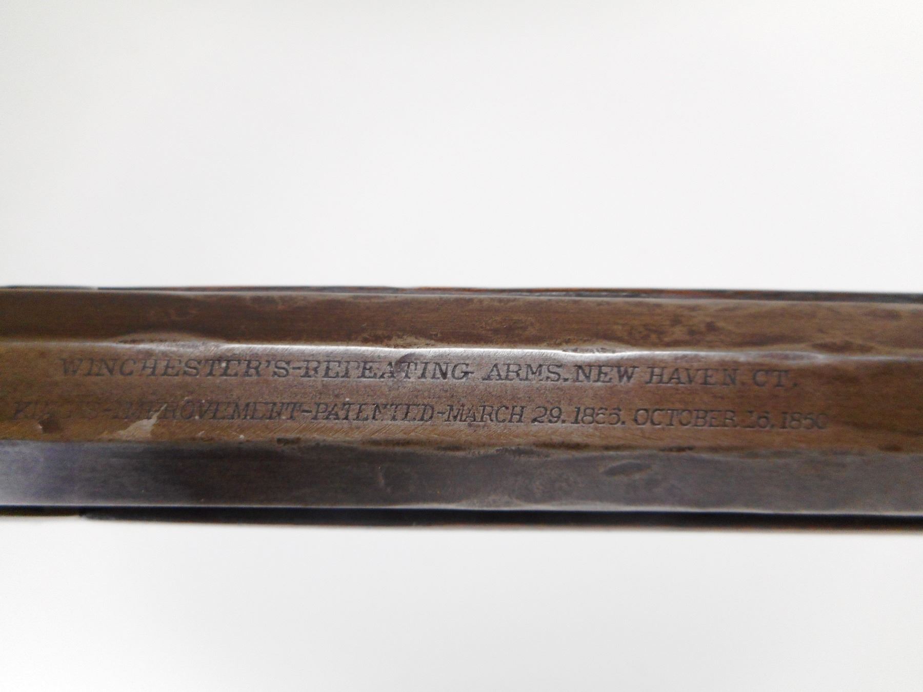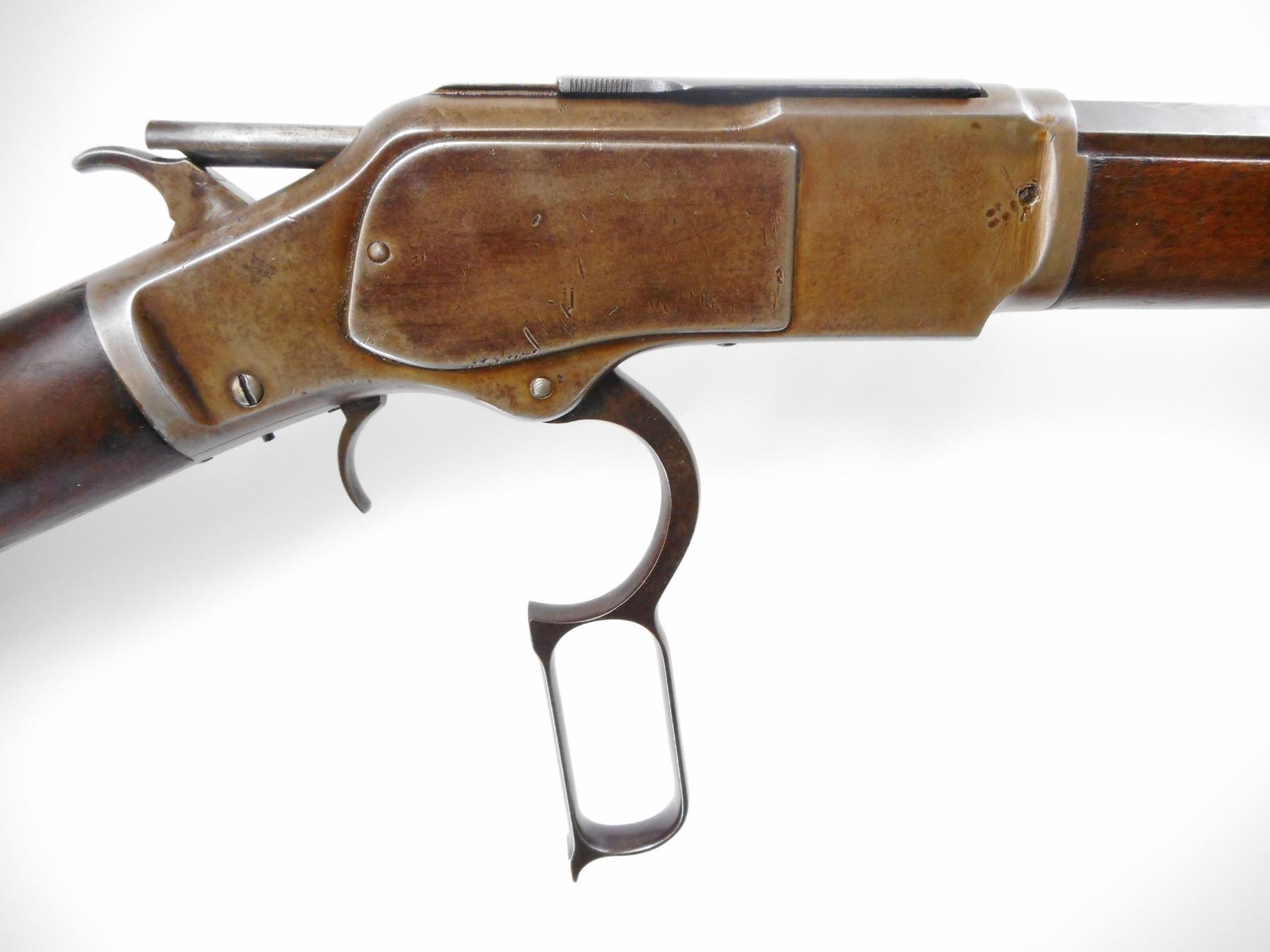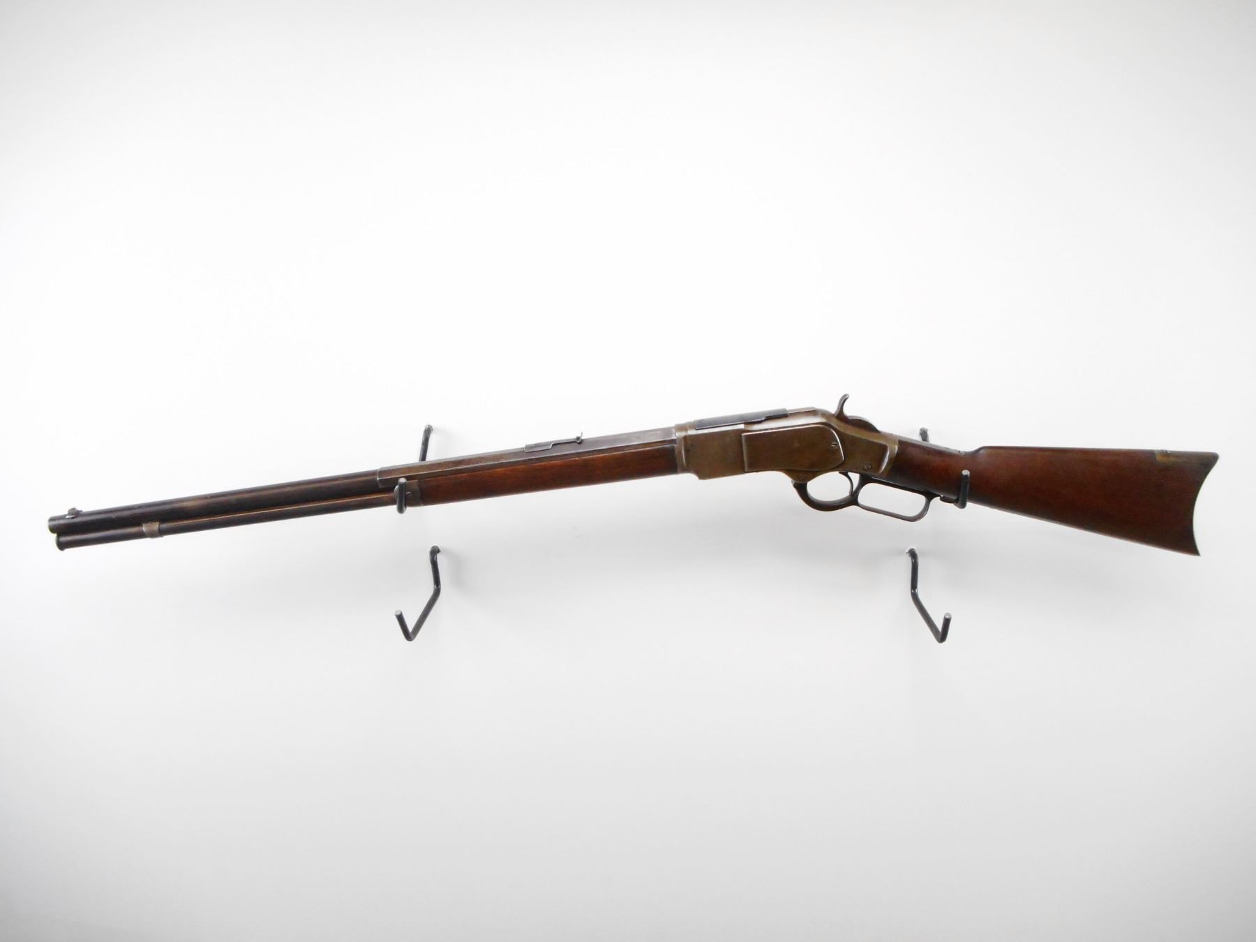 WINCHESTER , MODEL: 1873 SPECIAL ORDER , CALIBER: 22 SHORT , BORE IS FAIR, DARK, LIGHT PITTING. MFG'D 1884 (USA ANTIQUE). BLADE FRONT SIGHT. REPLACED U NOTCH ADJUSTABLE REAR SIGHT.HALF ROUND, HALF OCTAGONAL BARREL. HAS DUST COVER. TWO PIECE SMOOTH WOOD STOCKS. CURVED STEEL BUTT PLATE. STEEL FOREND CAP. FULL LENGTH MAG TUBE. INNER MAG TUBE APPEARS COMPLETE. SOME BLUEING REMAINING ON BARREL. SHOWS LIGHT RUST SPECKLES AND HANDLING MARKS. BARREL HAS DINGS ON THE FLATS. STOCKS SHOWS HANDLING MARKS DINGS AND WEAR. , ACTION: LEVER ACTION RIFLE , BARREL LENGTH: 24 1/4" , SERIAL # 174983A , CONDITION: 6/10 , CLASS: CANADIAN NON RESTRICTED CLASS