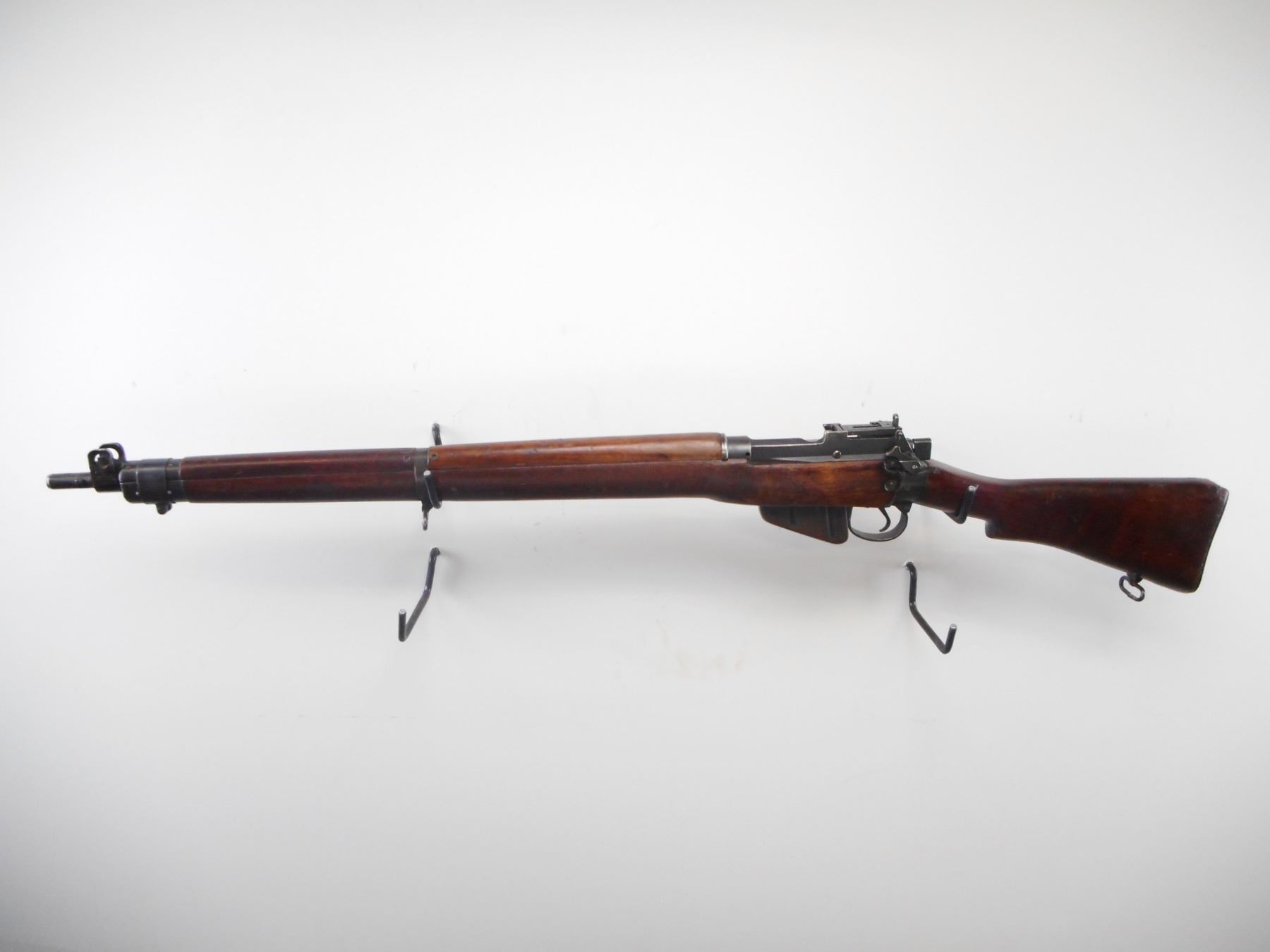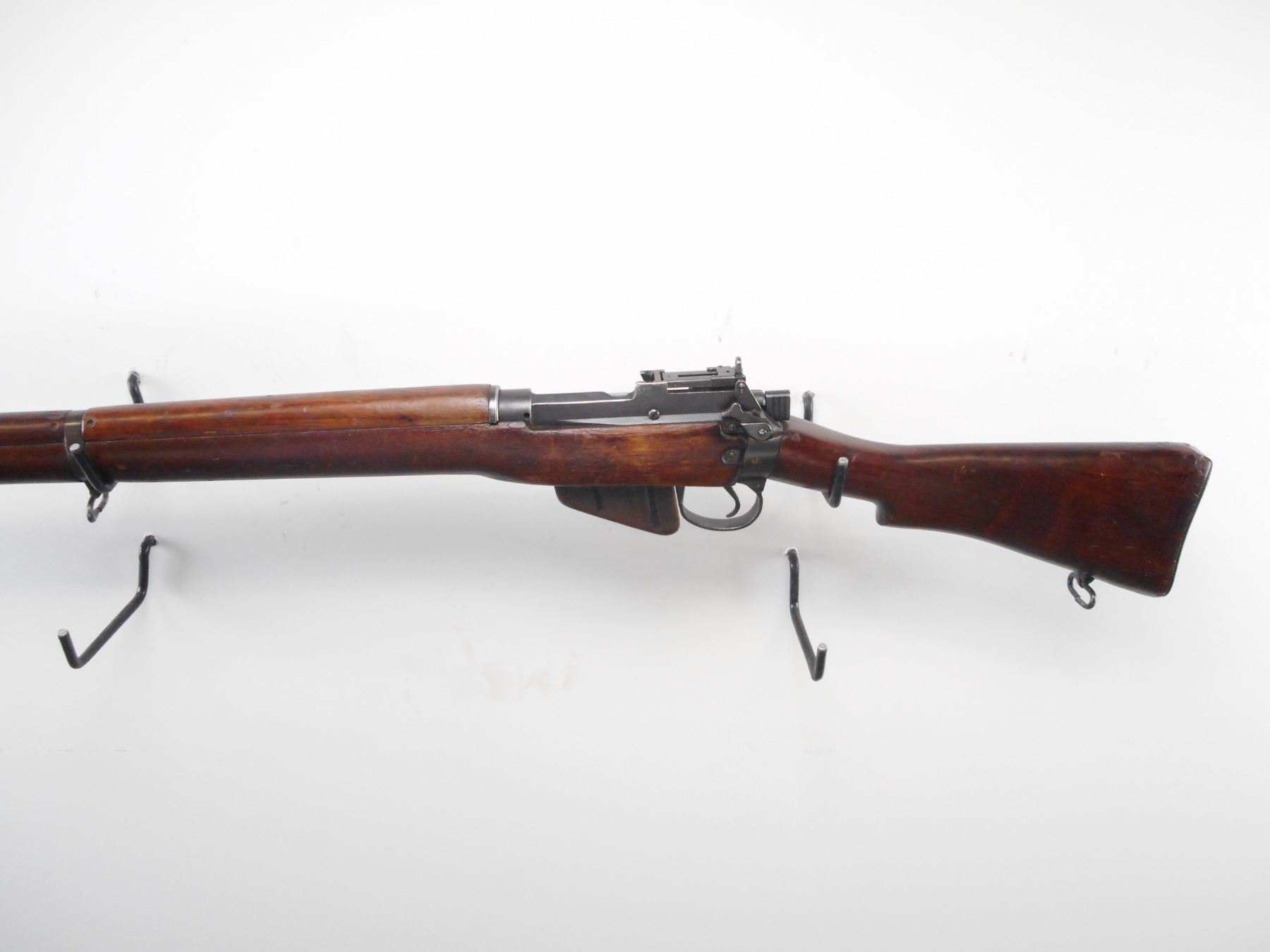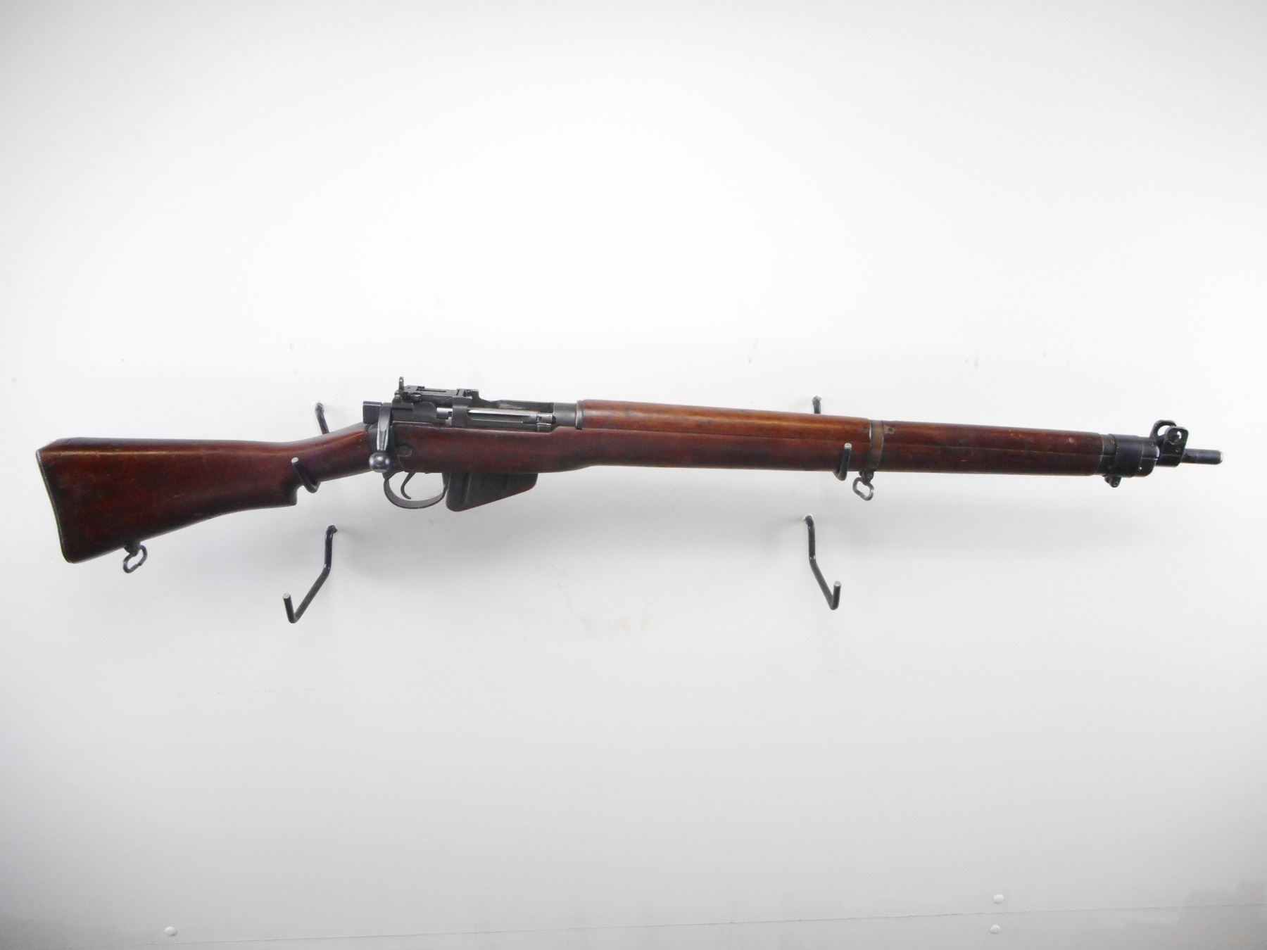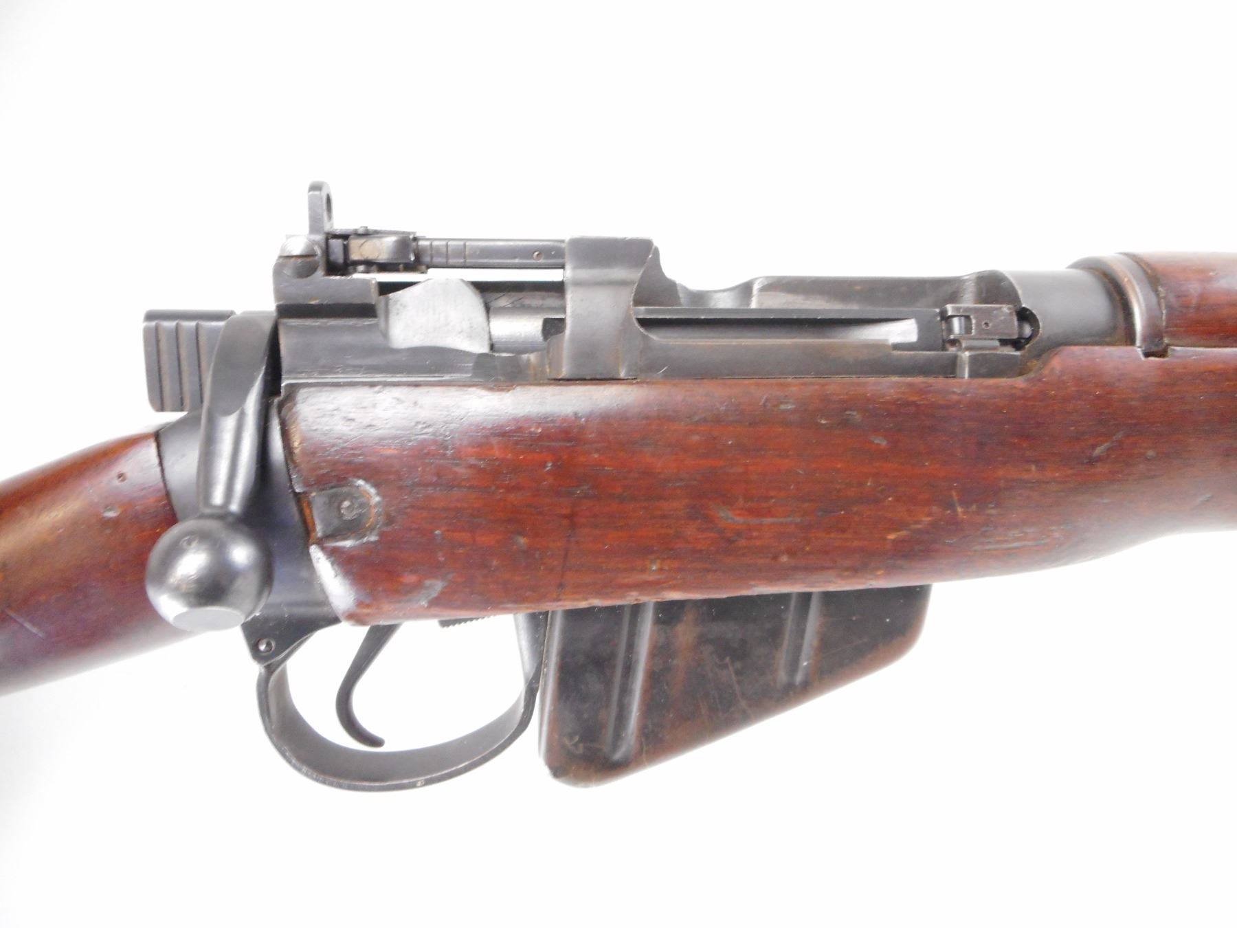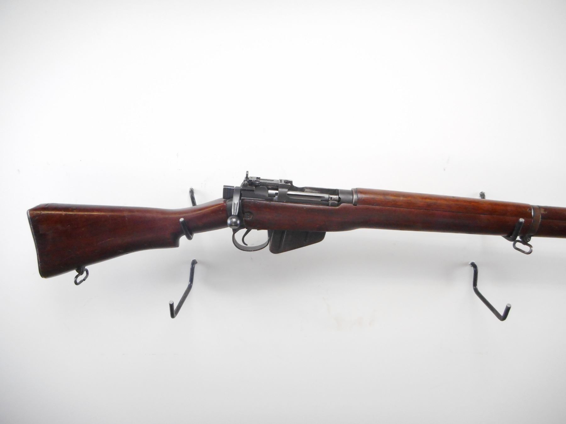 RARE, DOCUMENTED RCMP, LEE ENFIELD , MODEL: NO 4 MK1 STAR , CALIBER: 303 BR ,THIS SERIAL # IS LISTED ON PAGE 194 OF THE BOOK ARMS & ACCOURTREMENTS OF THE RCMP. BORE IS VERY GOOD, 5 GROOVE. MFG'D BY LONG BRANCH 1945. BLADE FRONT SIGHT WITH STAMPED EARS. ADJUSTABLE REAR PEEP SIGHT. BUTT SOCKET DRILLED AND TAPPED ON LEFT SIDE FOR PEEP SIGHT. CHARGER GUIDE MARKED MP ON LEFT SIDE INDICATING RCMP ISSUE. FOUR PIECE FULL MILITARY WALNUT STOCKS. STEEL BUTT PLATE. SLING SWIVELS. METAL SHOWS SOME WEAR AND HANDLING MARKS. STOCK SHOWS SOME DING AND HANDLING MARKS, SMALL GOUGES. , ACTION: BOLT ACTION RIFLE , BARREL LENGTH: 25 1/4" , SERIAL # 82L9504 , CONDITION: 7/10 , CLASS: CANADIAN NON RESTRICTED CLASS