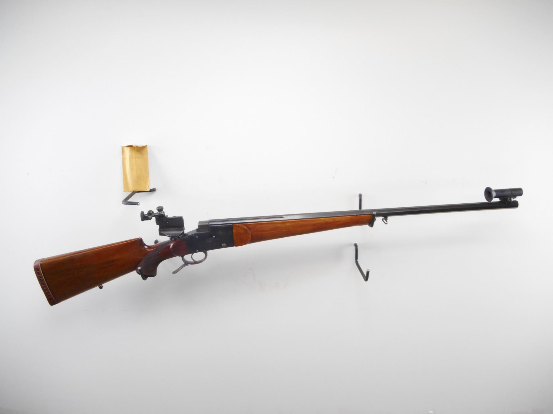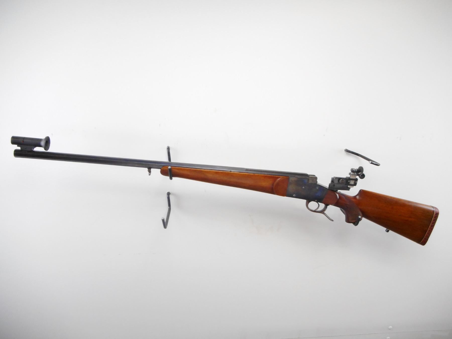 GERMAN , MODEL: FREE RIFLE , CALIBER: 22 LR , BORE IS EXCELLENT. MARKED FL-KLEIN KALIBERBUCHSE ON LEFT SIDE OF OCTAGONAL BARREL. GLOBE FRONT SIGHT WITH ORANGE INSERT, INCLUDES 10 SPARE INSERTS. SCOPE GROOVES ON TOP OF BARREL. ORIGINAL REAR PEEP SIGHT, NOT INCLUDED. MODIFIED MOUNT WITH RED FIELD OLYMPIC MODEL REAR PEEP SIGHT. SMOOTH TWO PIECE STOCKS. CHEKCERED FOREARM AND PISTOL GRIP. RED VENTED RUBBER RECOIL PAD. STEEL GRIP CAP. REAR SWIVEL STUD. FRONT SWIVEL. METAL SHOWS SOME WEAR. LIGHT RUST SPECKLES. STOCK SHOWS SOME WEAR AND HANDLING MARKS , ACTION: SINGLE SHOT FALLING BLOCK , BARREL LENGTH: 28" , SERIAL # 1335 , CONDITION: 7/10 , CLASS: CANADIAN NON RESTRICTED CLASS
