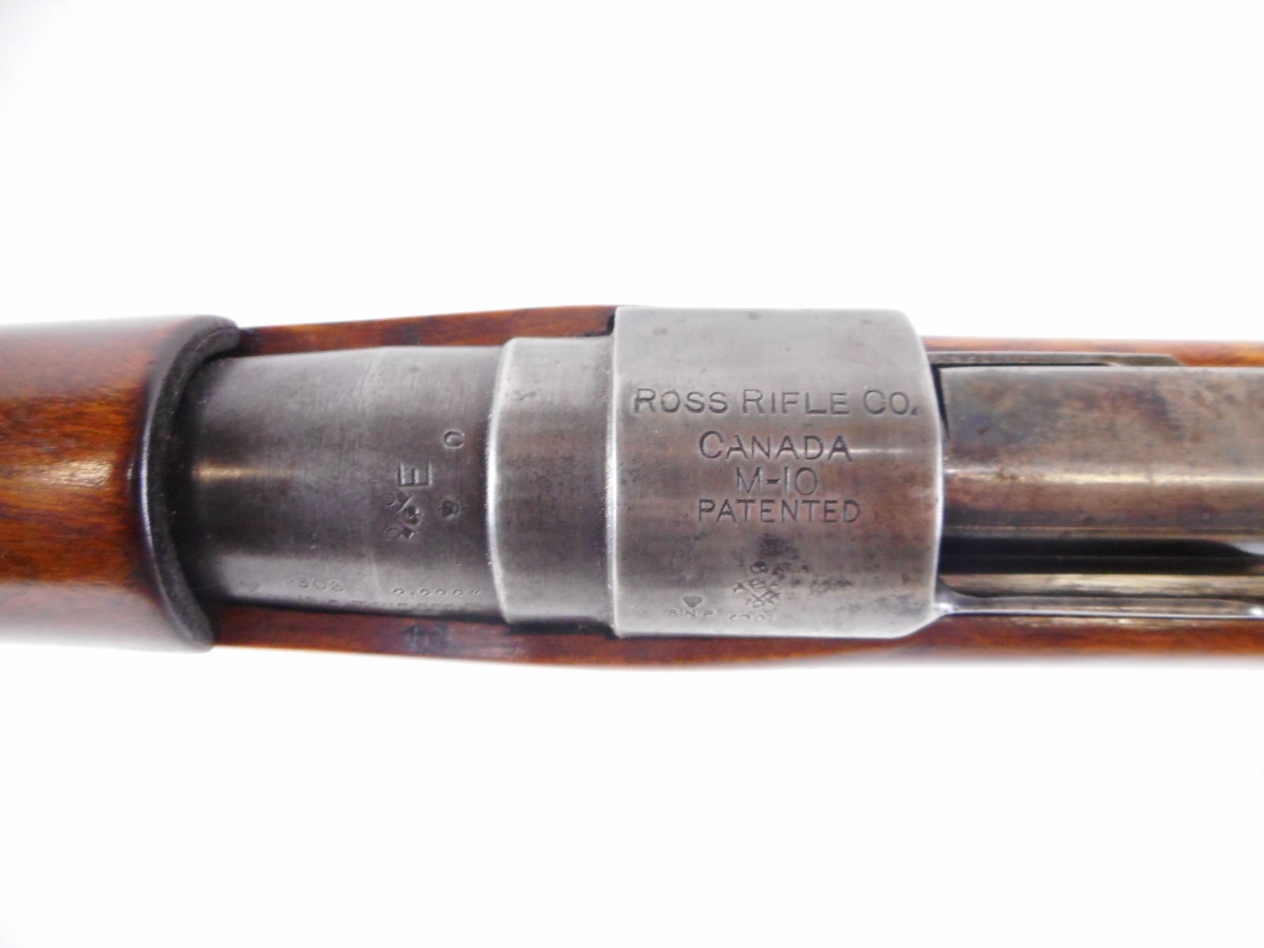 ROSS , MODEL: 1910 MK III , CALIBER: 303 BR , BORE IS GOOD. WORN. BLADE FRONT SIGHT WITH HOOD. ADJUSTABLE REAR PEEP SIGHT. METAL FINISH TURNED SILVER/GREY. BRITISH PROOF MARKS. UNPINNED BOLT. TWO PIECE FULL MILITARY STOCKS, REFINISHED. ROSS ROUNDEL/MARKINGS ON RIGHT SIDE OF BUTT. SMOOTH STEEL BUTT PLATE, WITH BRASS TRAP. FOUR SWIVELS. STAMPED FRONT BAND. METAL SHOWS HANDLING MARKS AND WEAR. STOCK SHOWS HANDLING MARKS , ACTION: STRAIGHT PULL RIFLE , BARREL LENGTH: 30 1/2" , SERIAL # 632GN , CONDITION: 6/10 , CLASS: CANADIAN NON RESTRICTED CLASS