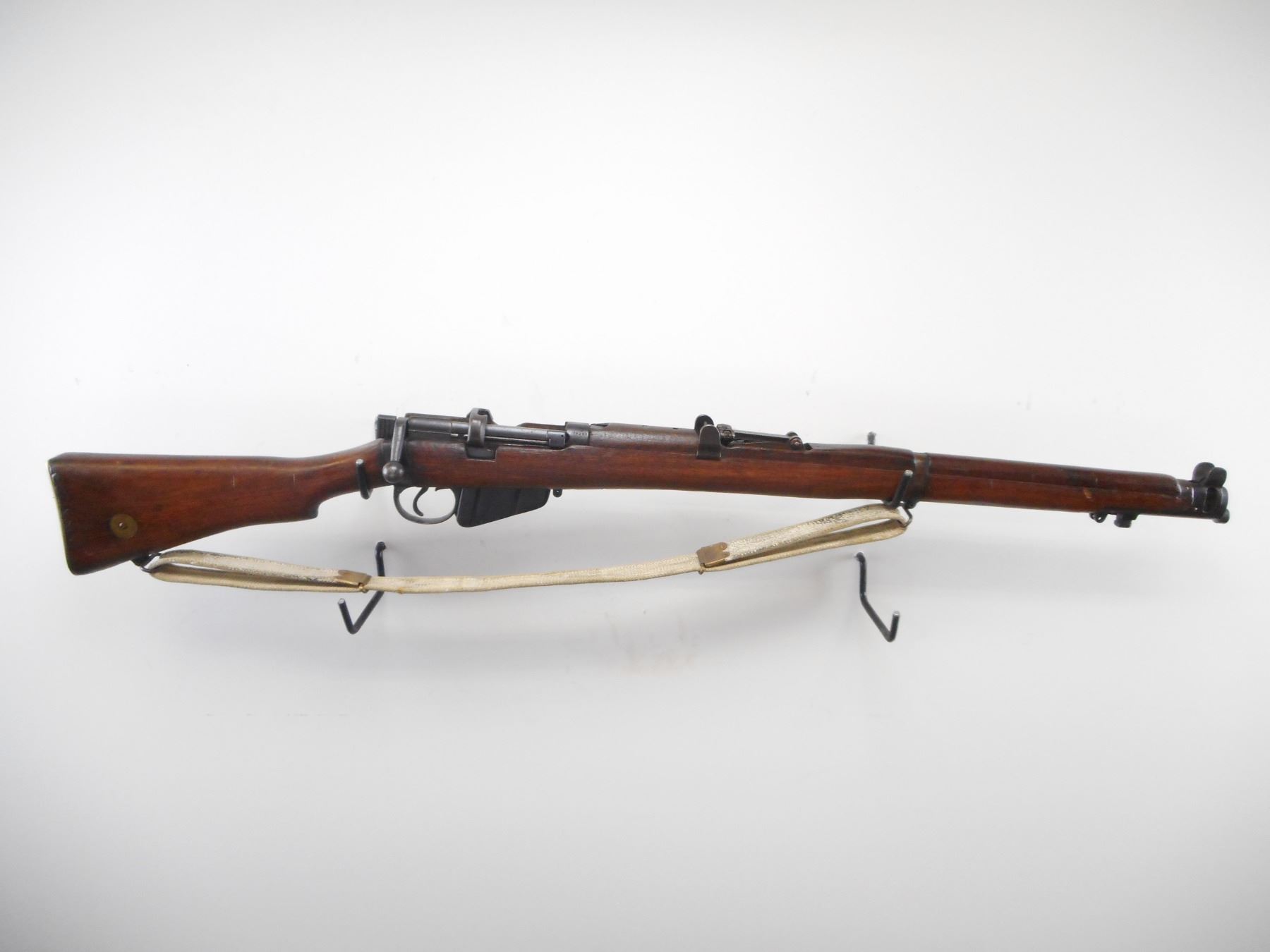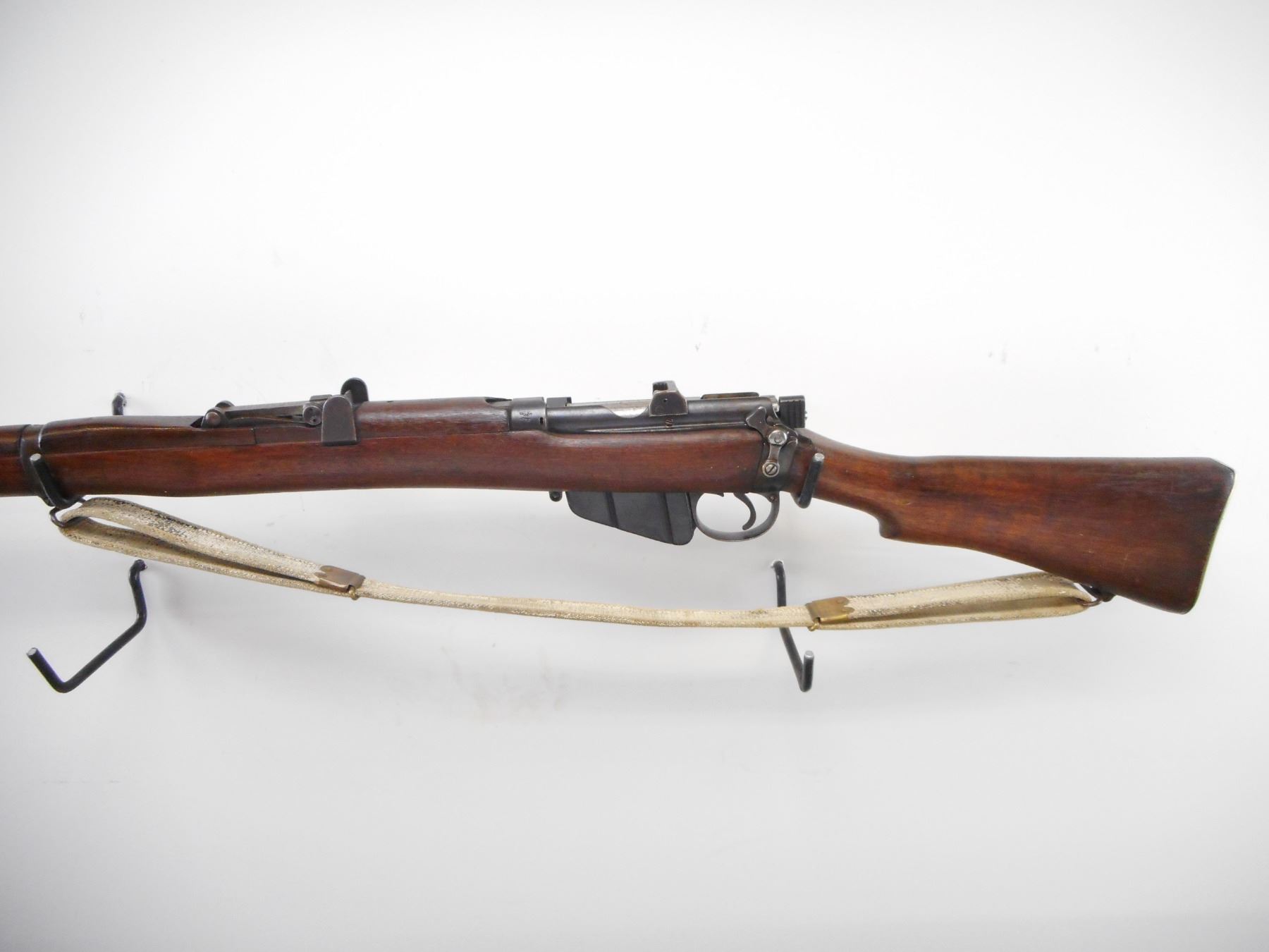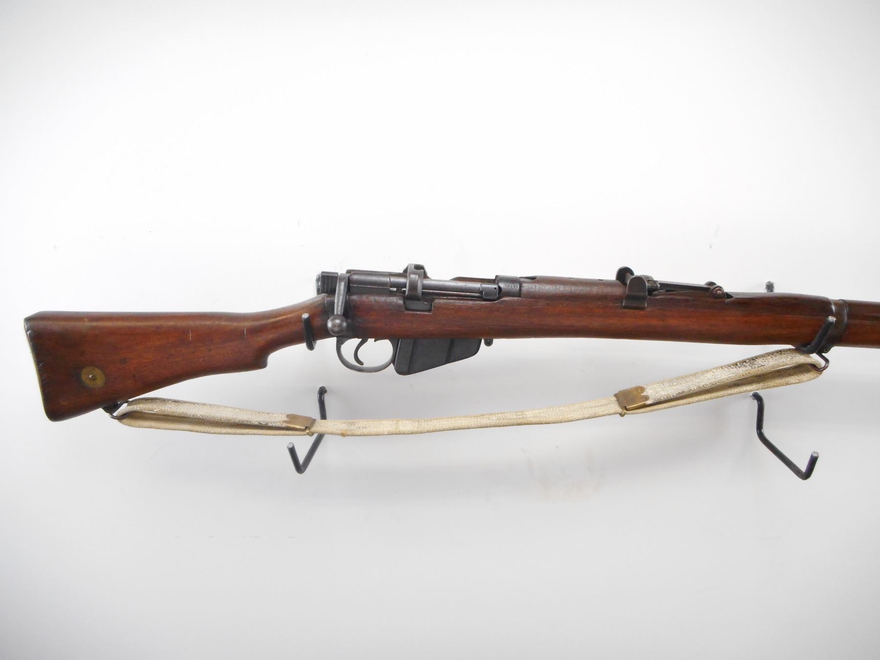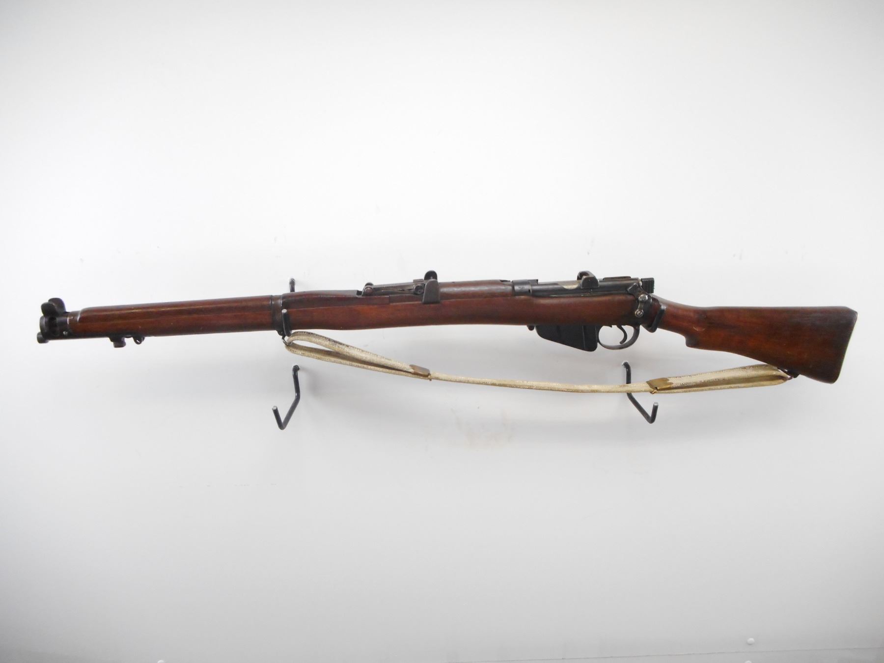LEE ENFIELD , MODEL: NO1 MK 3*, CALIBER: 303 BR , BORE IS GOOD. MFG'D BY BSA, 1918. CANADIAN MILITARY MARKED. BUTT STOCK DISC TO GOVERN GENERAL FOOT GUARD NO75. VISIBLE NUMBER MATCH. BLADE FRONT SIGHT WITH EARS. AJUSTABLE U NOTCH REAR SIGHT WITH EARS. BLUED FINISH ON METAL PARTS. FOUR PIECE FULL MILITARY STOCKS. BRASS BUTT PLATE WITH TRAP. CLING SWIVELS WITH CANVAS MILITARY SLING. METAL SHOWS SOME HANDLING MARKS AND WEAR. STOCK SHOWS SOME DINGS, HANDLING MARKS AND WEAR. , ACTION: BOLT ACTION RIFLE , BARREL LENGTH: 25 1/4" , SERIAL # J29248 , CONDITION: 7/10 , CLASS: CANADIAN NON RESTRICTED CLASS