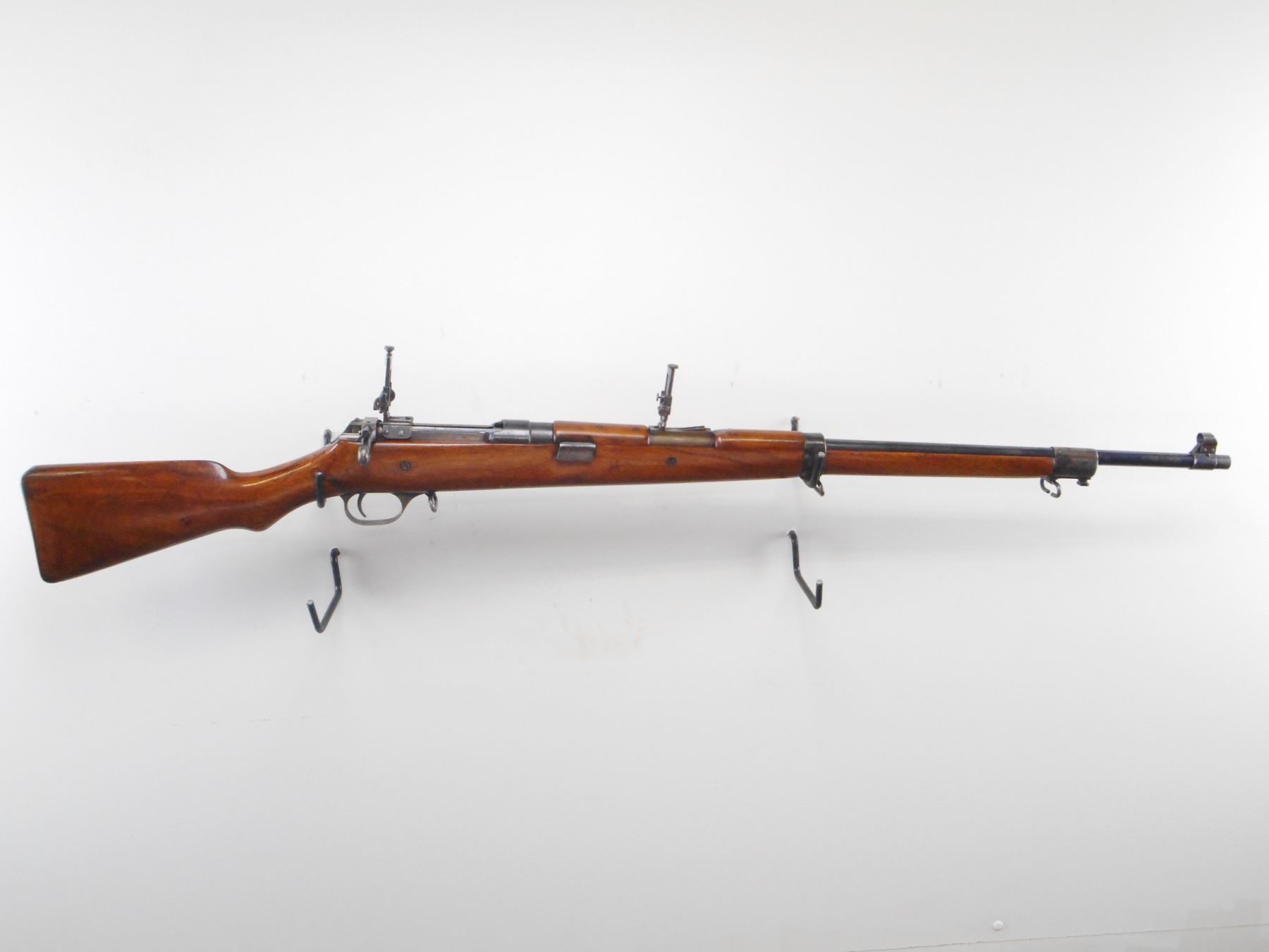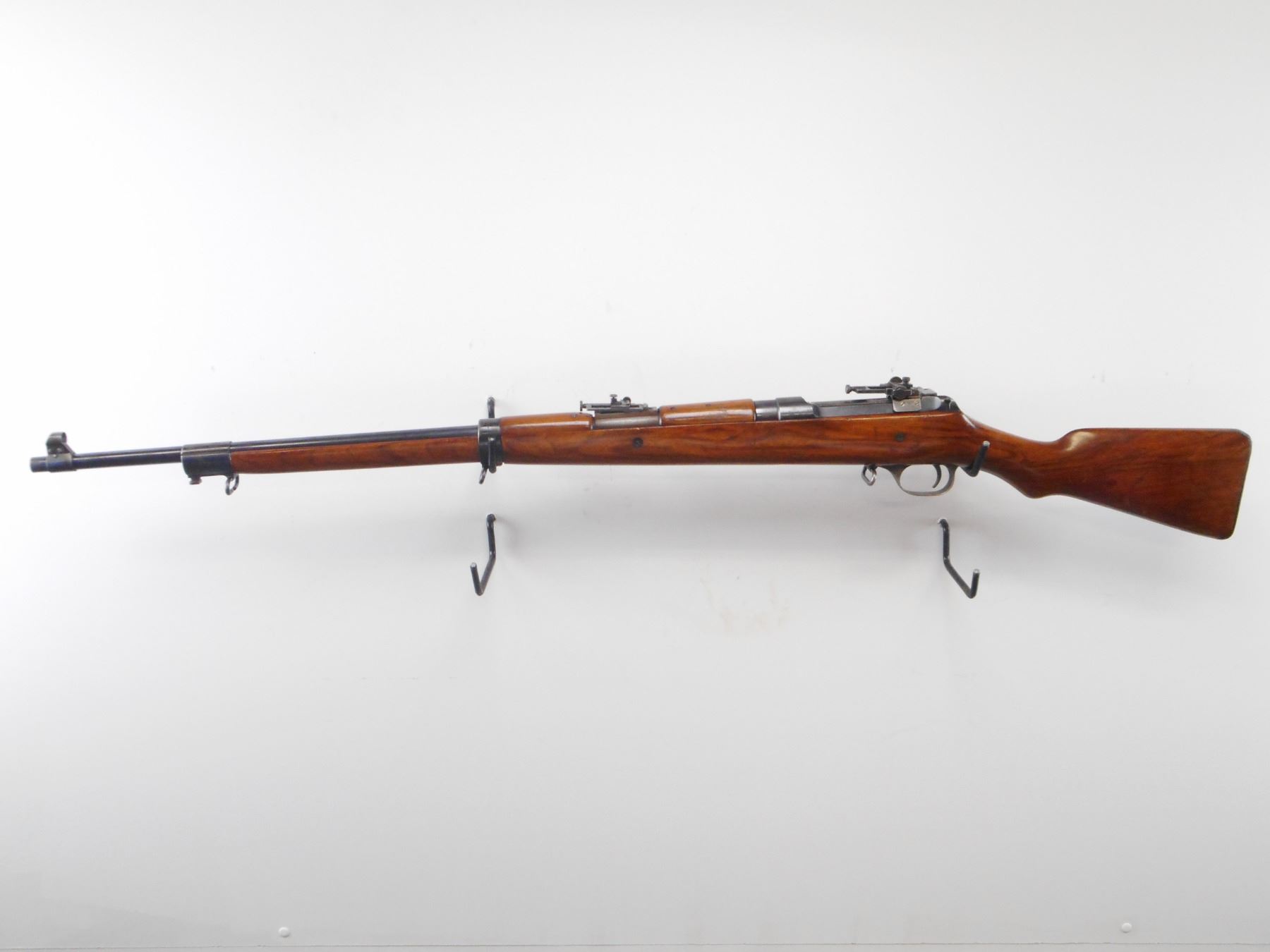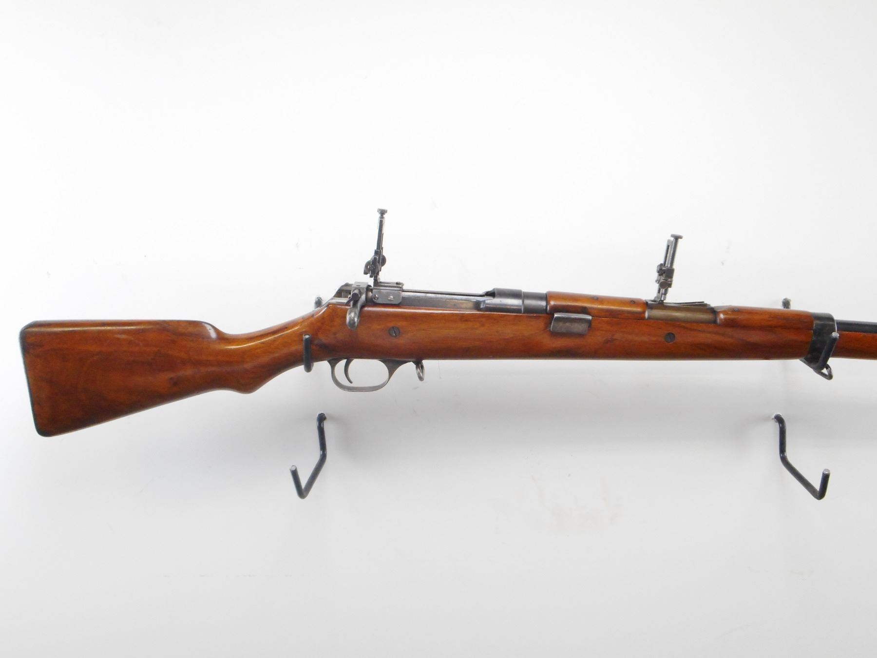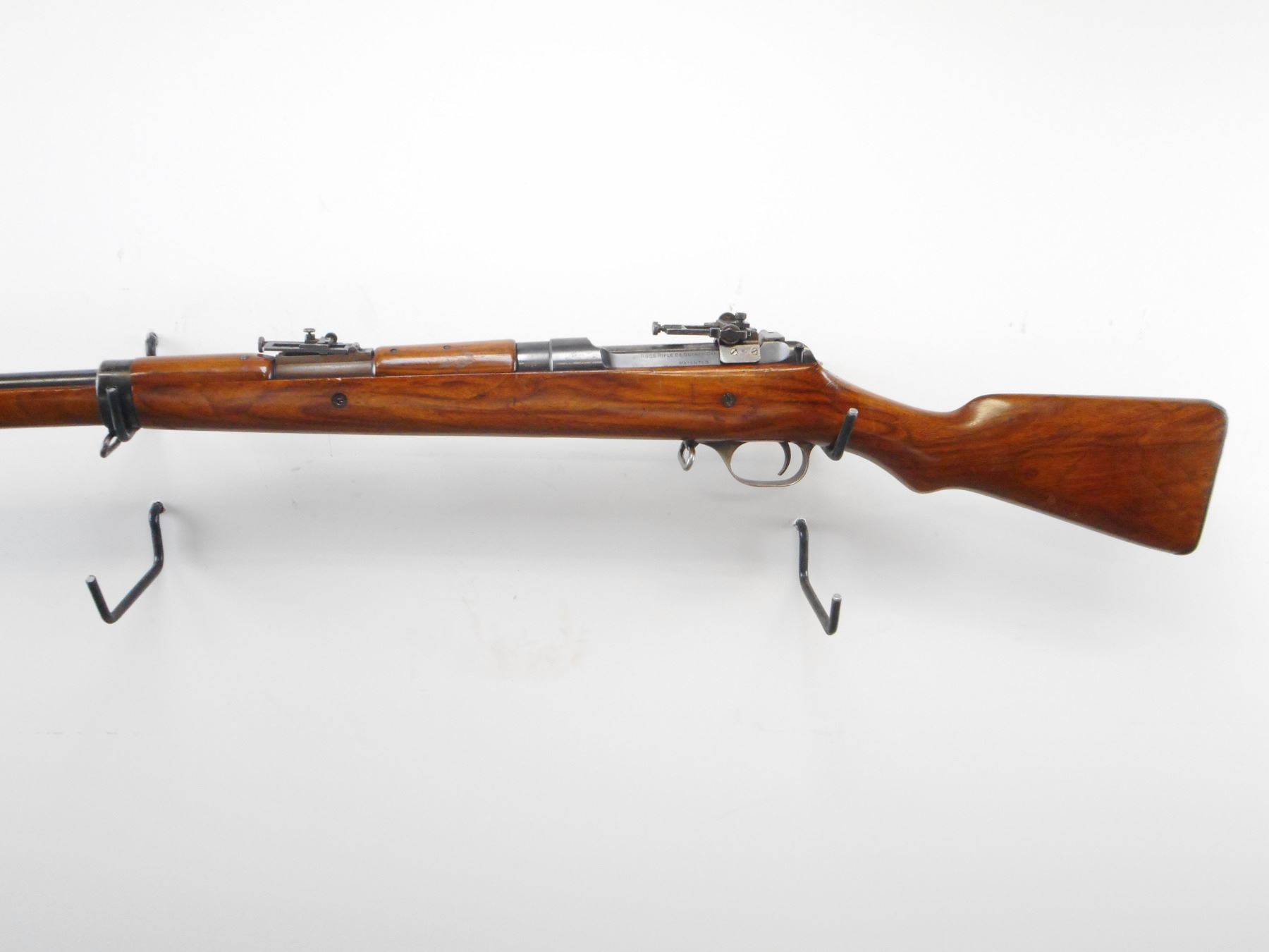 ROSS, MODEL: 1905 MKII** CIVILIAN TARGET RIFLE , CALIBER: 303 BR , BORE IS GOOD, WORN. BLADE FRONT SIGHT WITH HOOD. AJUSTABLE BSA MARTIN REAR SIGHT, MOUNTED ON RECEIVER, SUTHERLAND U NOTCH LADDER REAR SIGHT ON BARREL, LOADING LEVER. FLAG TYPE SAFETY. THREE PIECE FULL LENGTH STOCK THAT INCLUDES EARLY PRODUCTION TWO PIECE TOP WOOD. SMOOTH STEEL BUTT PLATE WITH TRAP. THREE SWIVELS. FOREND SHORTENED TO PREVENT USE OF BAYONET. BLUEING SHOWS SOME WEAR AND HANDLING MARKS. STOCK SHOWS DINGS SCRATCHES AND HANDLING MARKS , ACTION: BOLT ACTION RIFLE , BARREL LENGTH: 30 1/2" , SERIAL # 6533 , CONDITION: 7 1/2/10 , CLASS: CANADIAN NON RESTRICTED CLASS