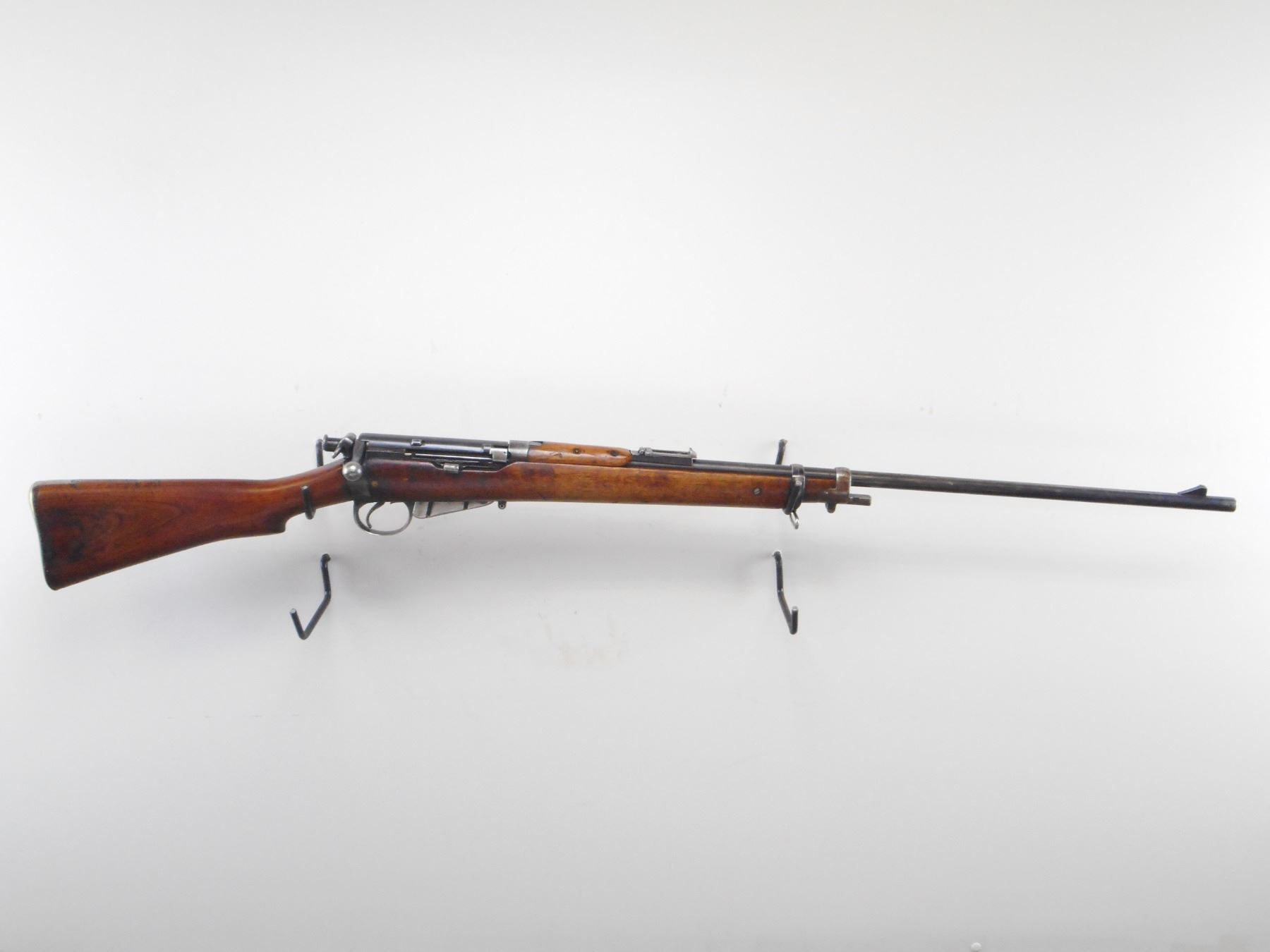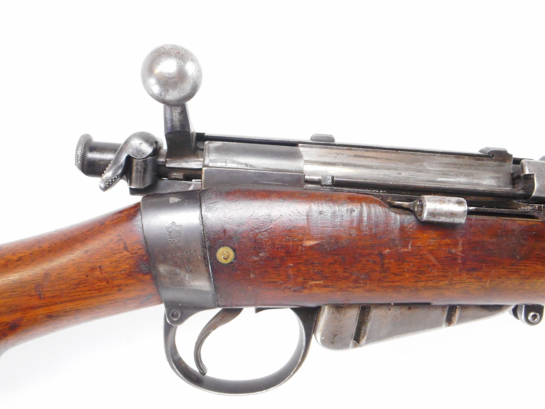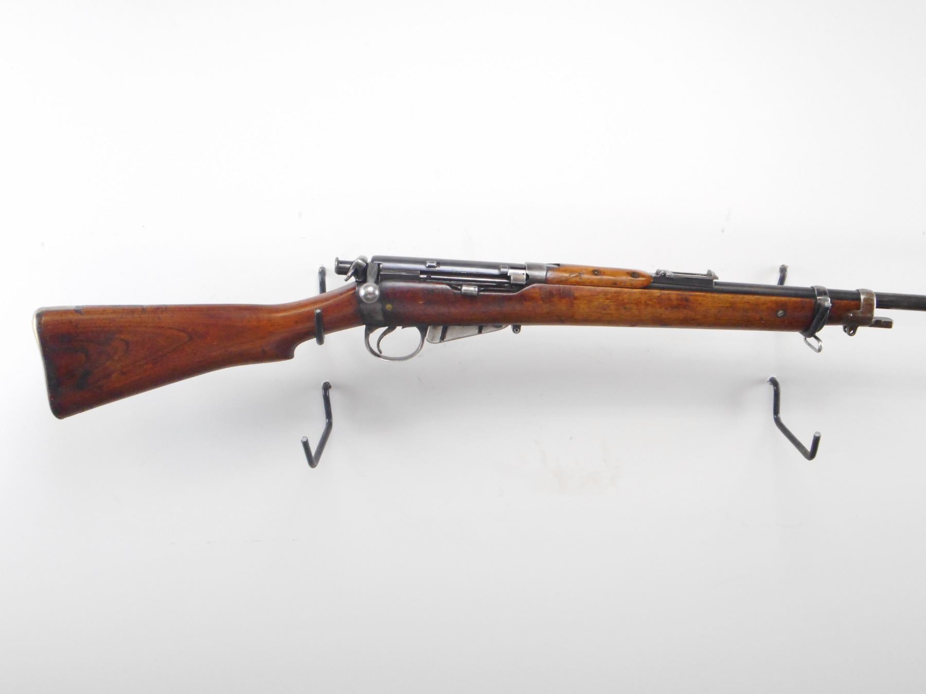 LONG LEE ENFIELD , MODEL: MK1* SPORTER , CALIBER: 303 BR , COMES WITH MAGAZINE CUT DOWN. BORE IS GOOD, WORN. RARE MANUFACTURE LSA CO 1896 WITH UNUSUALLY LOW SERIAL #. BOLT, RECEIVER, BARREL, REAR SIGHT ALL NUMBERED 8. TWO PIECE CUT DOWN STOCKS NICLEY DONE.RETAINS VOLLEY SIGHTS. BRASS BUTT PLATE WITH TRAP. TANG MARKED 6H/70. ONE SWIVELS. STOCK RETAINS MIDDLE BAND AND NOSE CAP. BAYONET LUG. BLUEING SHOWS SOME HANDLING MARKS AND WEAR. STOCK SHOWS, NUMEROUS DINGS, HANDLING MARKS AND WEAR. , ACTION: BOLT ACTION RIFLE , BARREL LENGTH: 30 1/4" , SERIAL # 8 , CONDITION: 6/10 , CLASS: CANADIAN NON RESTRICTED CLASS