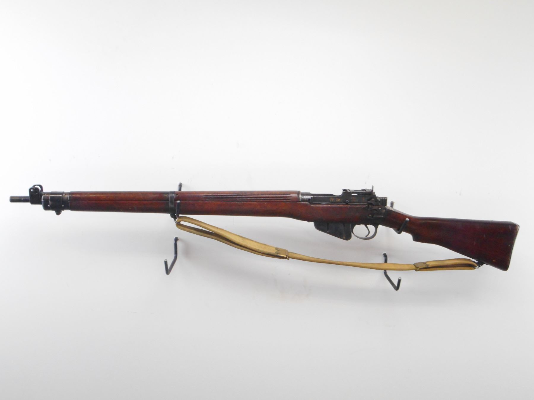 BELGIAN LEE ENFIELD , MODEL: NO4 MK1* TRAINER , CALIBER: 22LR , COMES WITH MAGAZINE. BORE IS VERY GOOD. RECEIVER MARKED BELGIAN PROOFS AS.ARM NO 576 22LR 1948. PARTS MATCHING. LOADING PLATFORM IN MAGAZINE WITH EJECTOR. BARREL SLEEVED. BOLT FACE RECESSED FOR RIM, HAS CORRESPONDING EJECTOR SLOT. BLADE FRONT SIGHT WITH EARS. ONE HUNDRED YARD ADJUSTABLE PEEP SIGHT. FOUR PIECE FULL MILITARY STOCKS. GROOVED REAR HAND GUARD. STEEL BUTT PLATE WITH TRAP. SWIVELS WITH CANVAS MILITARY SLING. BARREL HAD BAYONET LUGS. BLUEING SHOWS SOME HANDLING MARKS AND WEAR. STOCK SHOWS NUMEROUS SCRATCHES HANDLING MARKS AND WEAR. , ACTION: BOLT ACTION RIFLE , BARREL LENGTH: 25 1/4" , SERIAL # 576 , CONDITION: 7/10 , CLASS: CANADIAN NON RESTRICTED CLASS