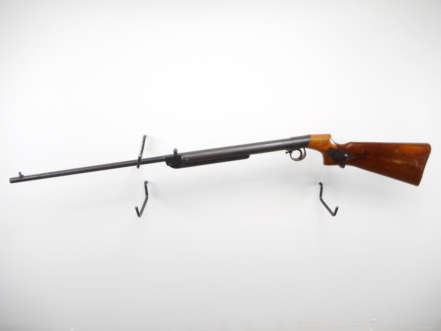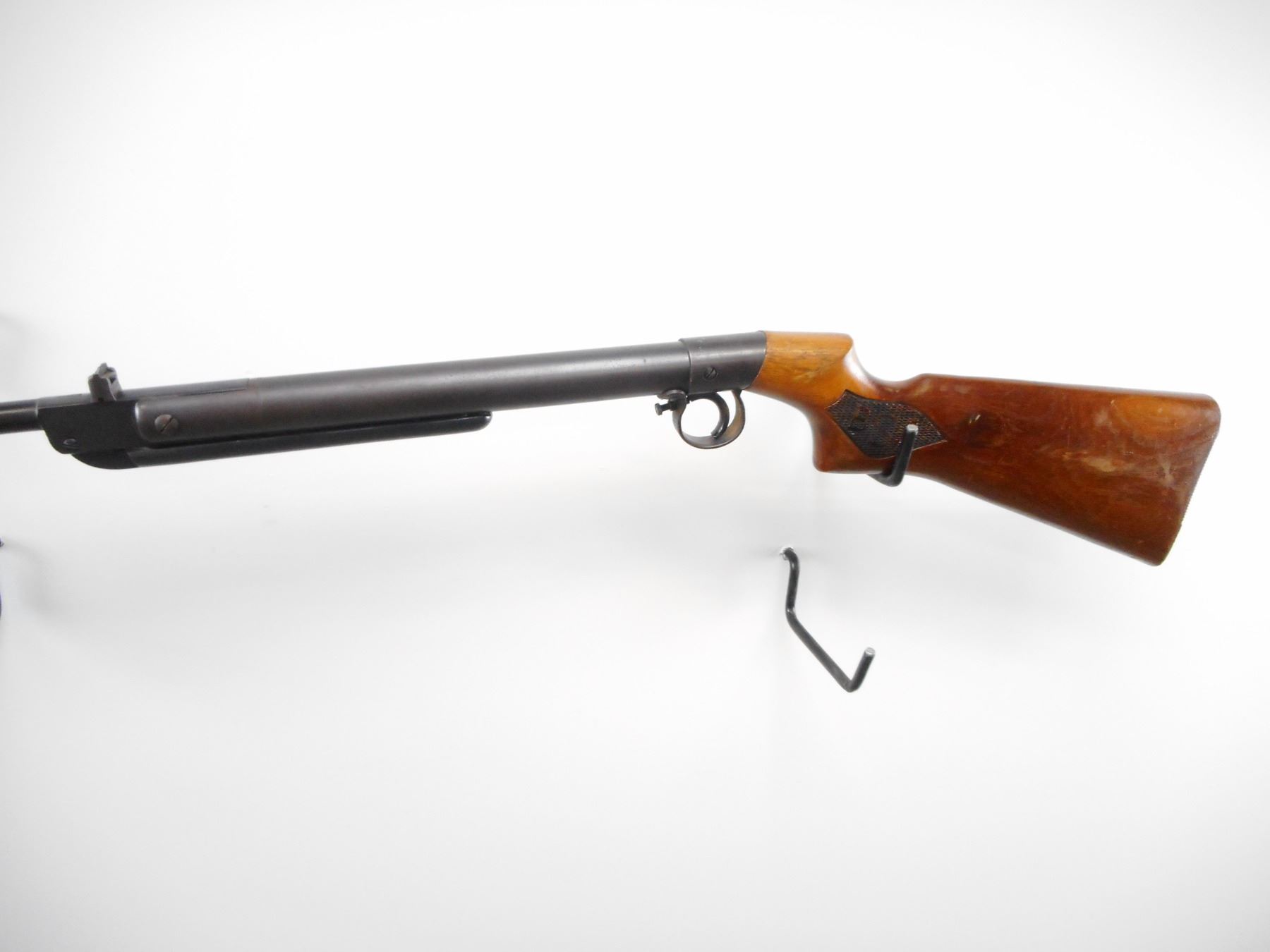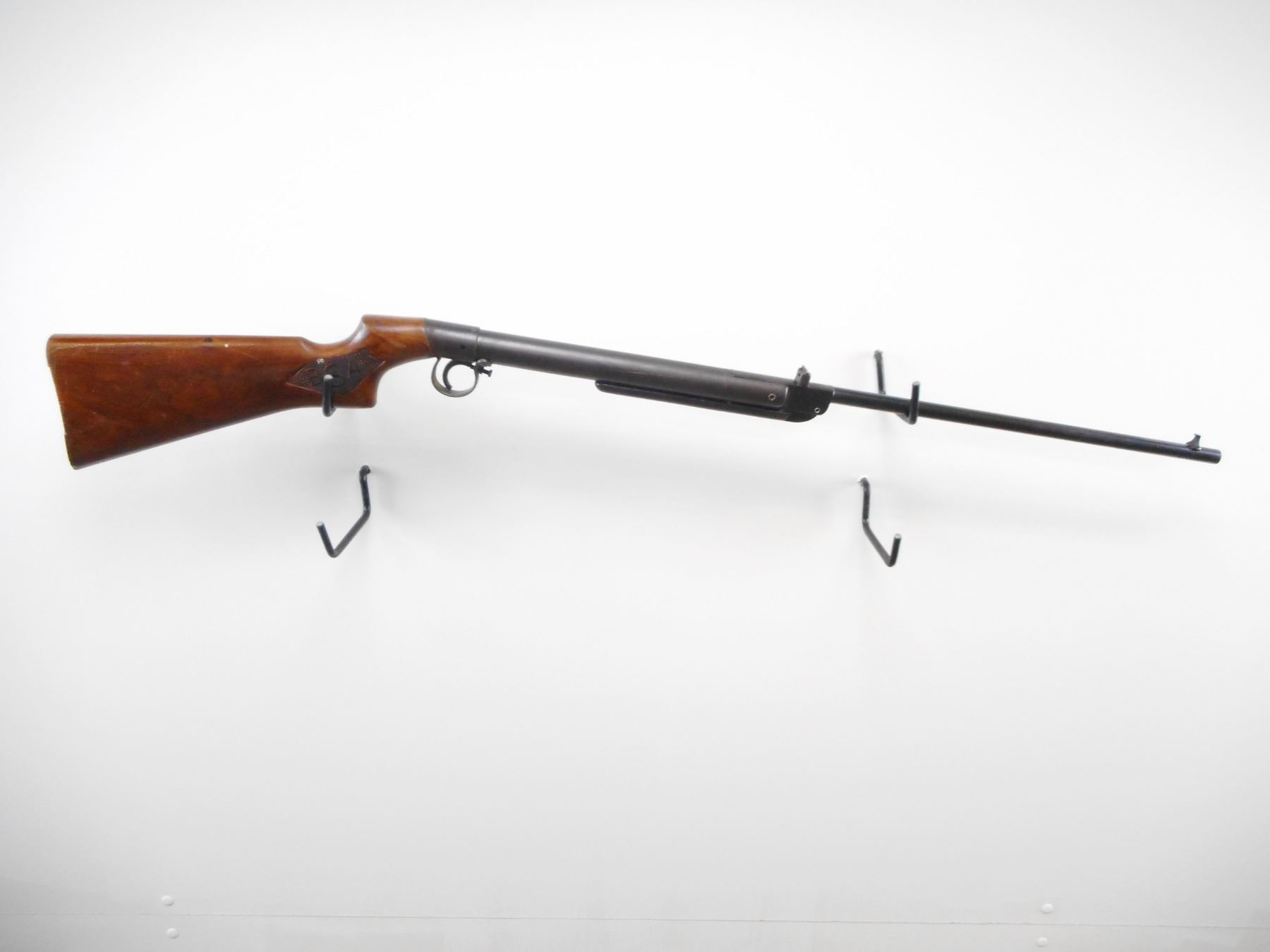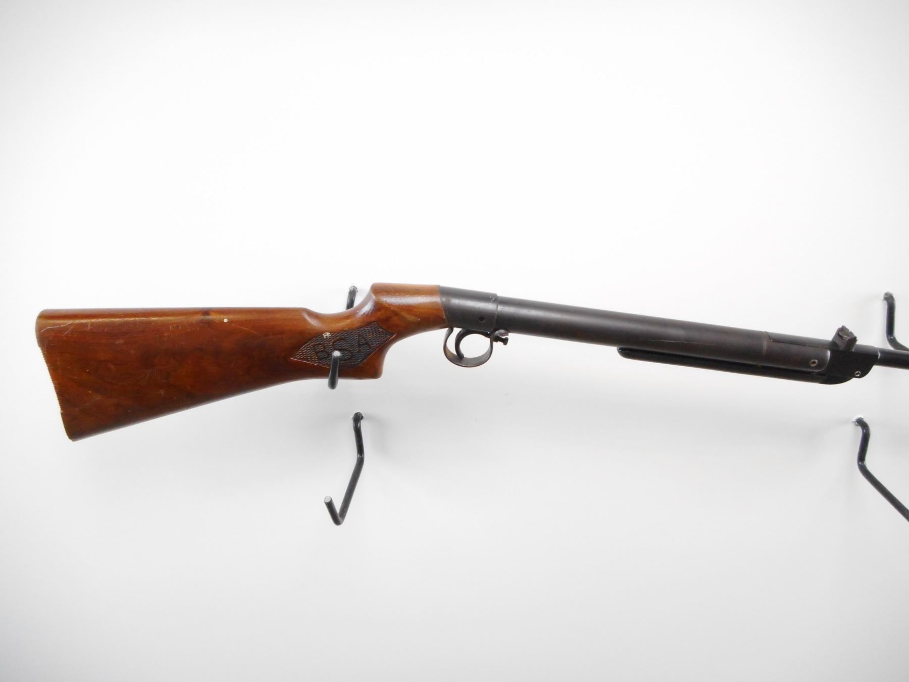 BSA , MODEL: AIR RIFLE , CALIBER: 177 , BORE IS VERY GOOD. BLADE FRONT SIGHT. ADJUSTABLE U NOTCH REAR SIGHT. BARREL AND REVIEVER MARKED WITH BSA LOGO. WOOD BUTT STOCK WITH PISTOL GRIP. CHECKERED BSA LOGO. REAR OF STOCK GROOVED. NO BUTT PLATE. ADJUSTABLE TRIGGER. METAL SHOWS LIGHT RUST AND WEAR. STOCK SHOWS LIGHT WEAR AND HANDLING MARKS. , ACTION: HINGE SINGLE SHOT , BARREL LENGTH: 18 1/2" , SERIAL # B872 , CONDITION: 7/10 , CLASS: CANADIAN NON RESTRICTED CLASS