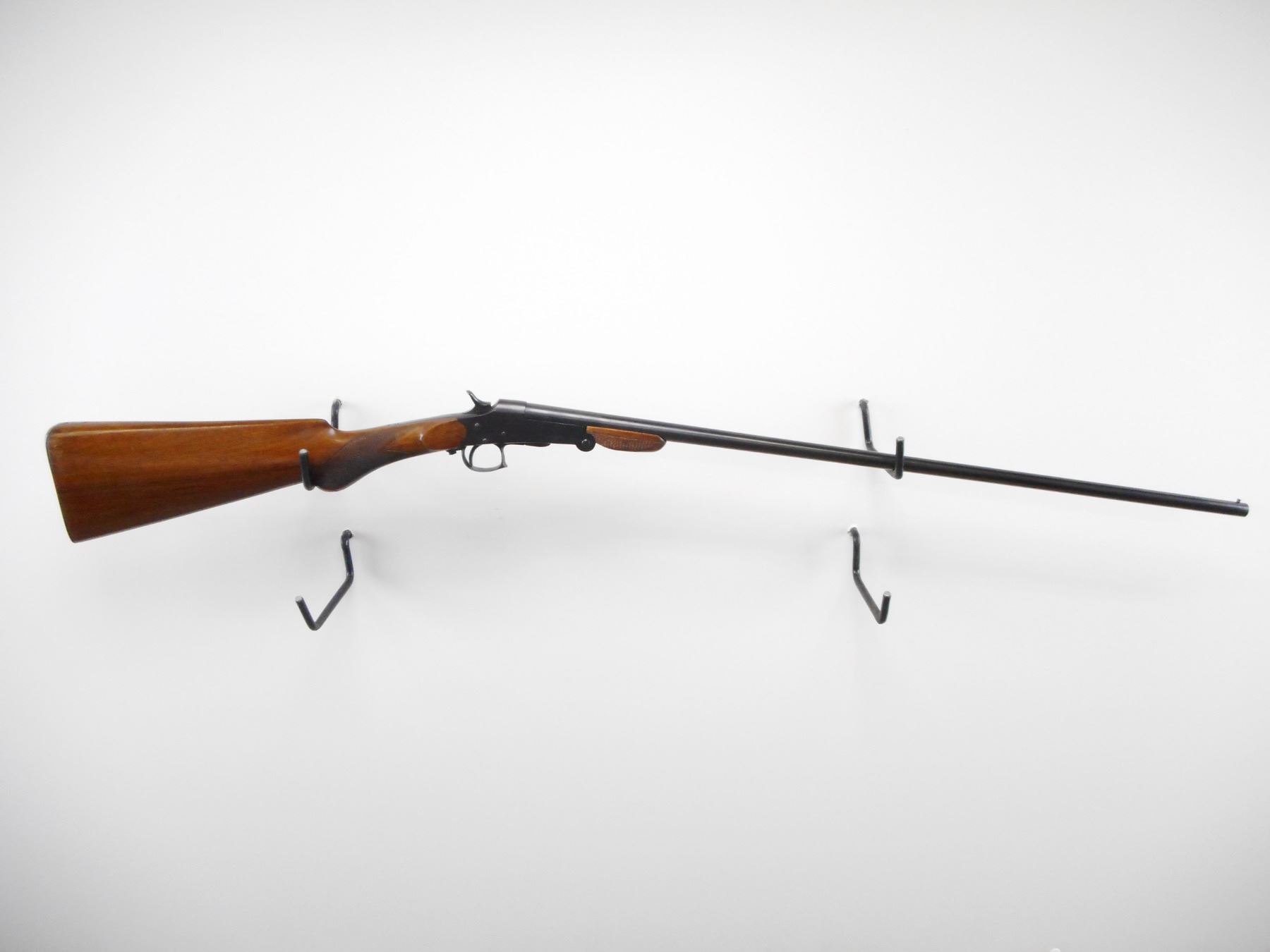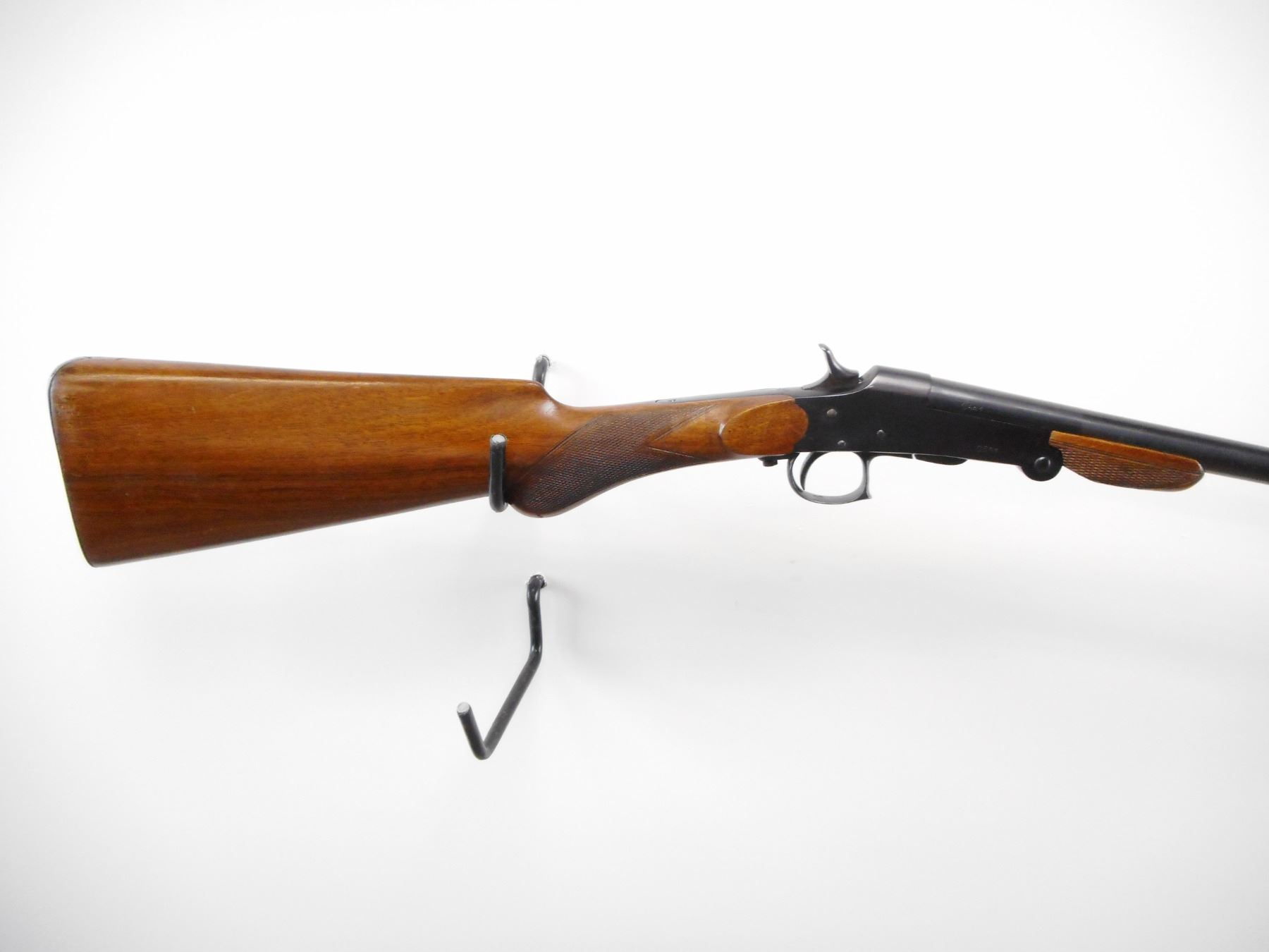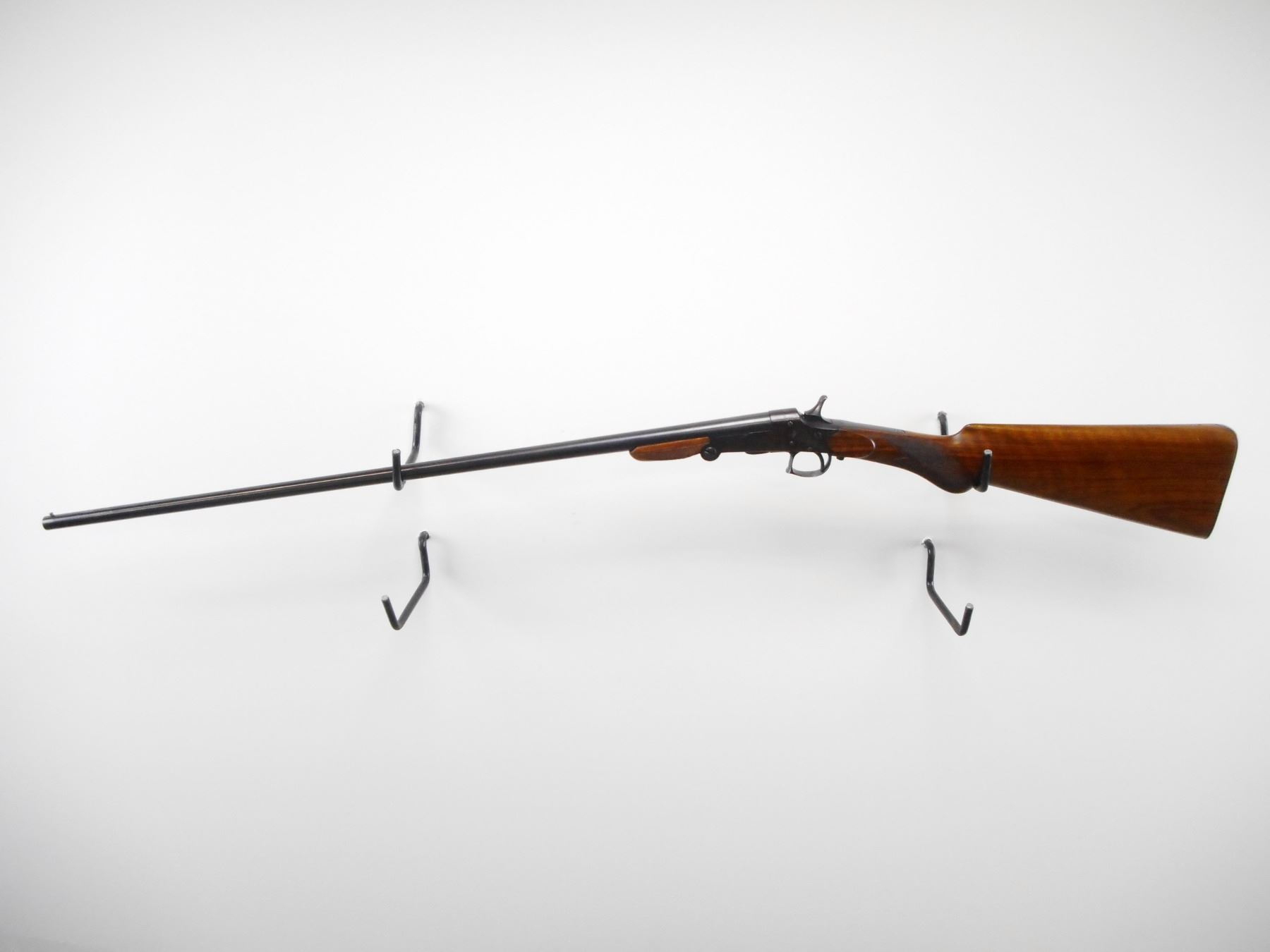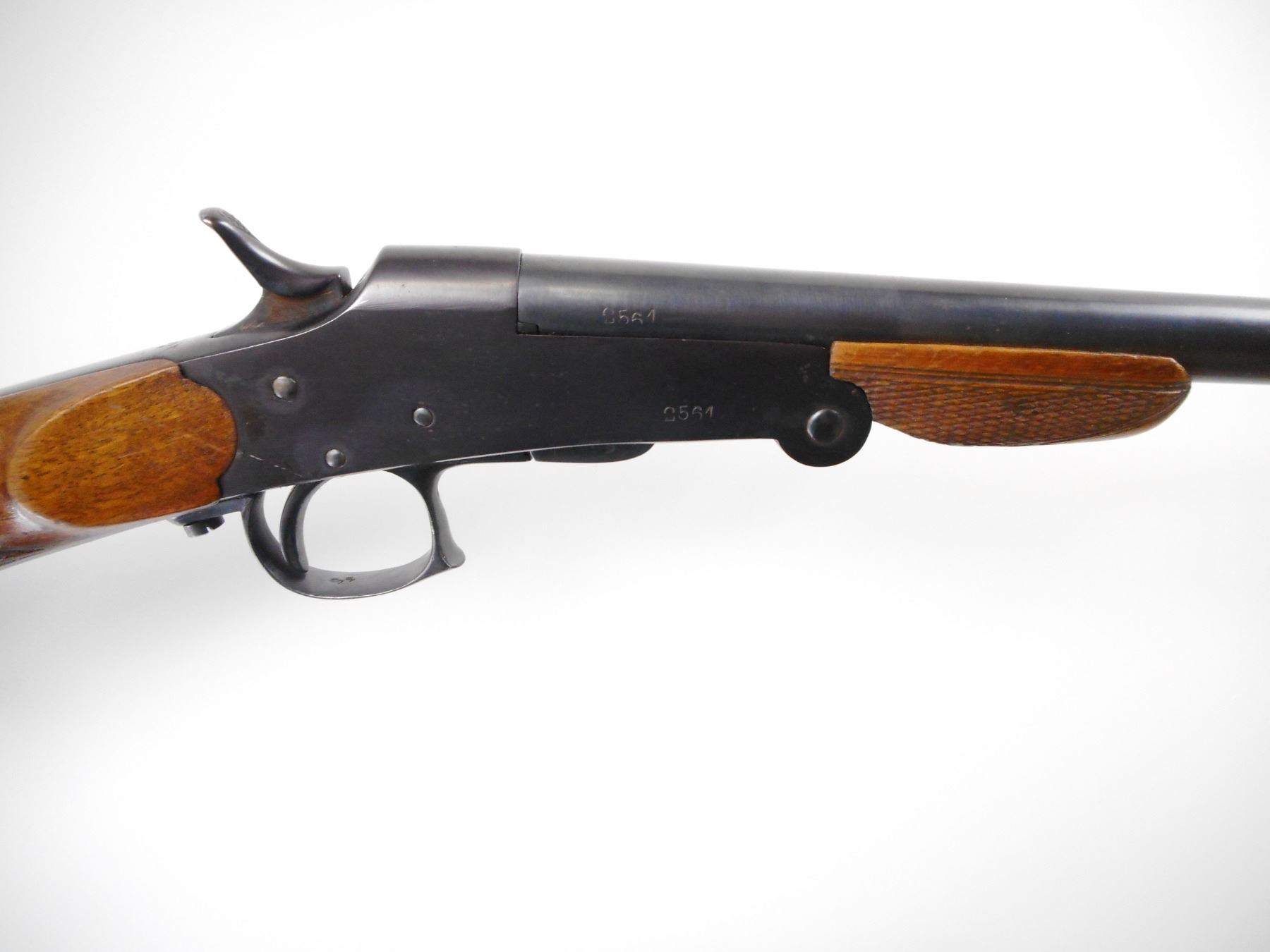 BELGIAN , MODEL: LITTLE GEM , CALIBER: 410 X 2 1/2" , I/M CHOKE. BORE IS VERY GOOD. BRASS BEAD. ROUND BARREL. BLUED FINISH ON METAL PARTS. HAMMER OFFSET TO RIGHT. TRIGGER GUARD OPENS ACTION. TWO PIECE WOOD STOCKS. CHECKERED FORARM ND PISTOL GRIPS. SMOOTH STEEL BUTT PLATE. METAL SHOWS SOME WEAR AND HANDLING MARKS. STOCKS SHOWS SOME WEAR AND HANDLING MARKS. , ACTION: HINGED SINGLE SHOT, SHOTGUN , BARREL LENGTH: 25 1/4" , SERIAL # 2561 , CONDITION: 7/10 , CLASS: CANADIAN NON RESTRICTED CLASS