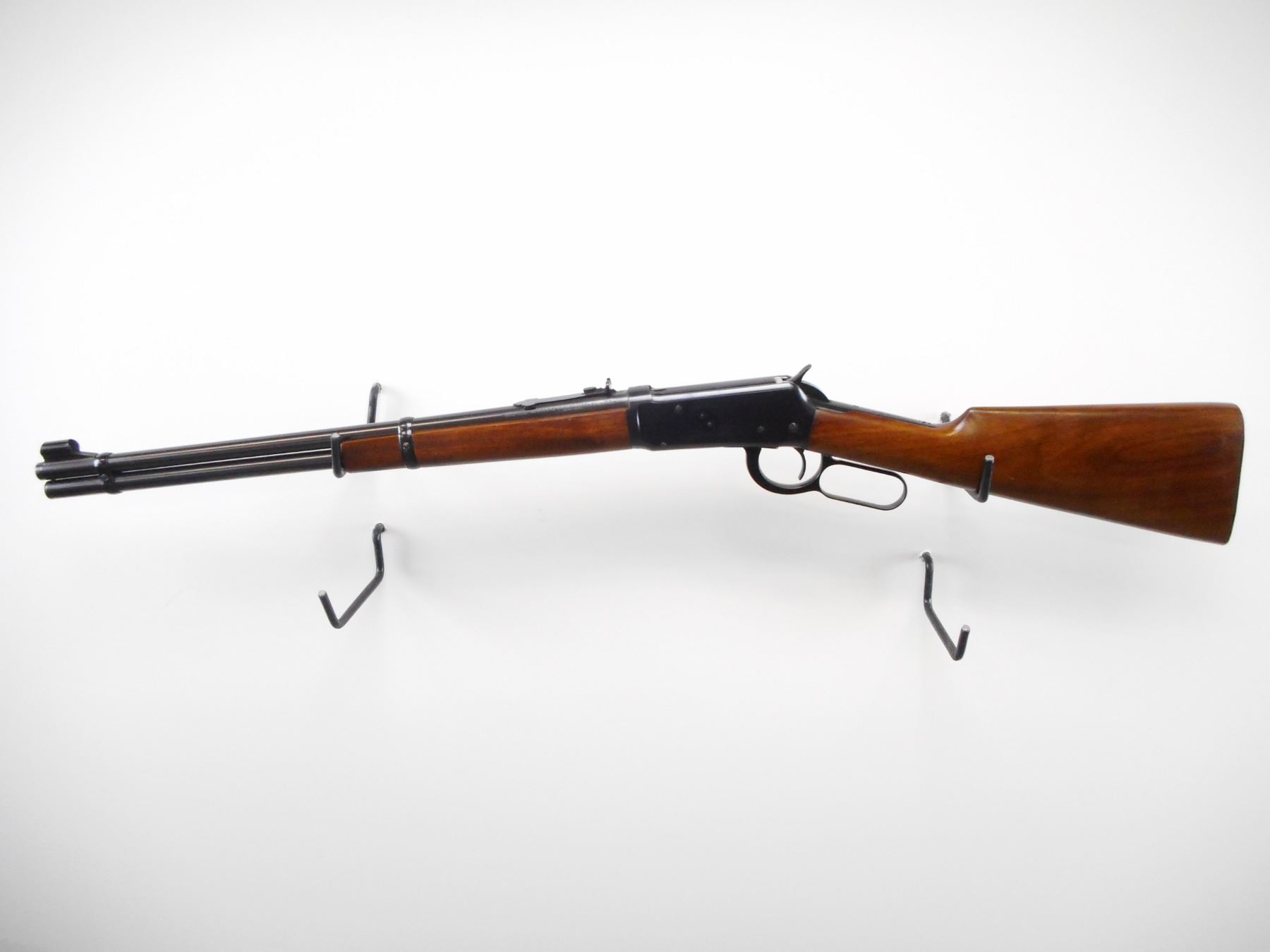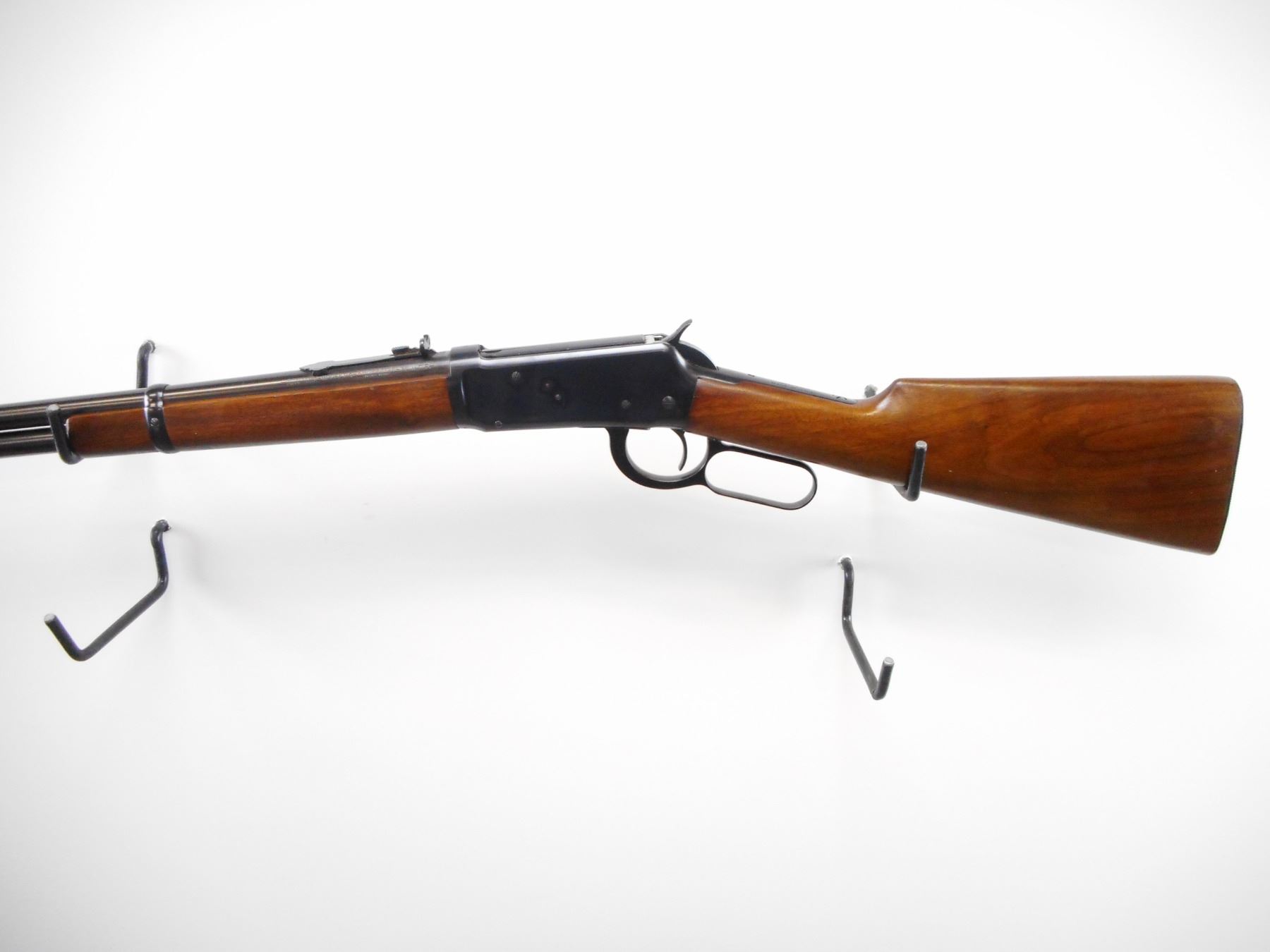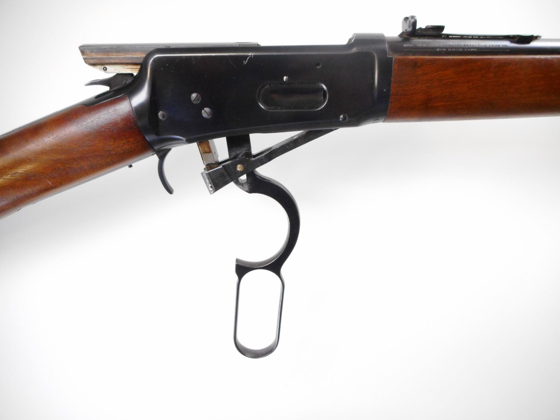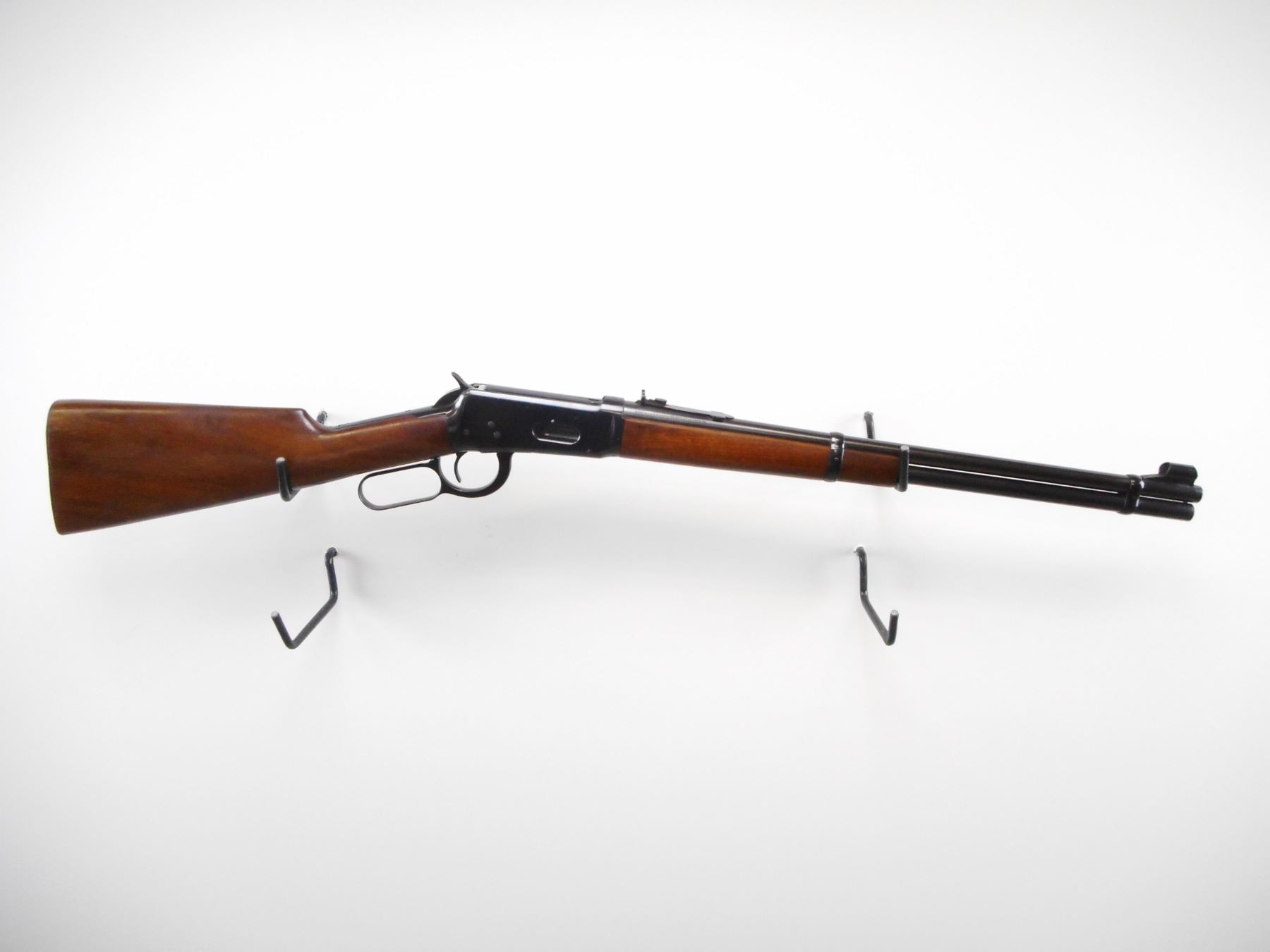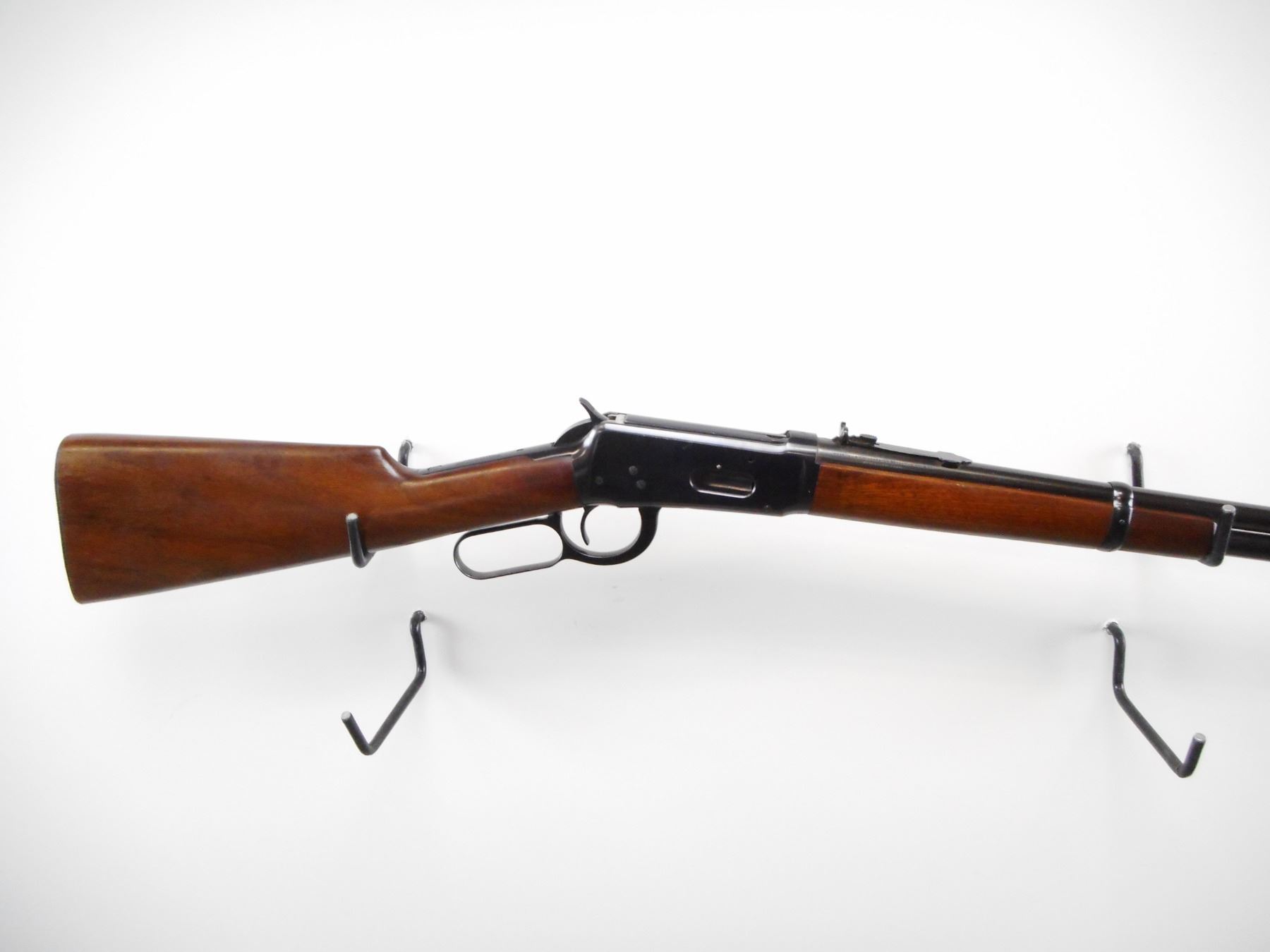 WINCHESTER , MODEL: 94 PRE 64 , CALIBER: 30 WCF , BORE IS VERY GOOD. MFG'D 1940. BLADE FRONT SIGHT WITH RAMP AND HOOD. ADJUSTABLE U NOTCH REAR SIGHT. TWO PIECE SMOOTH WOOD STOCKS. GROOVED STEEL BUTT PLATE. TANG DRILLED AND TAPPED FOR PEEP SIGHT. FULL LENGTH MAG TUBE. BLUEING SHOWS SOME WEAR AND MARKS. STOCKS SHOWS SMALL SCRATCHES. , ACTION: LEVER ACTION RIFLE , BARREL LENGTH: 20" , SERIAL # 1221467 , CONDITION: 8/10 , CLASS: CANADIAN NON RESTRICTED CLASS