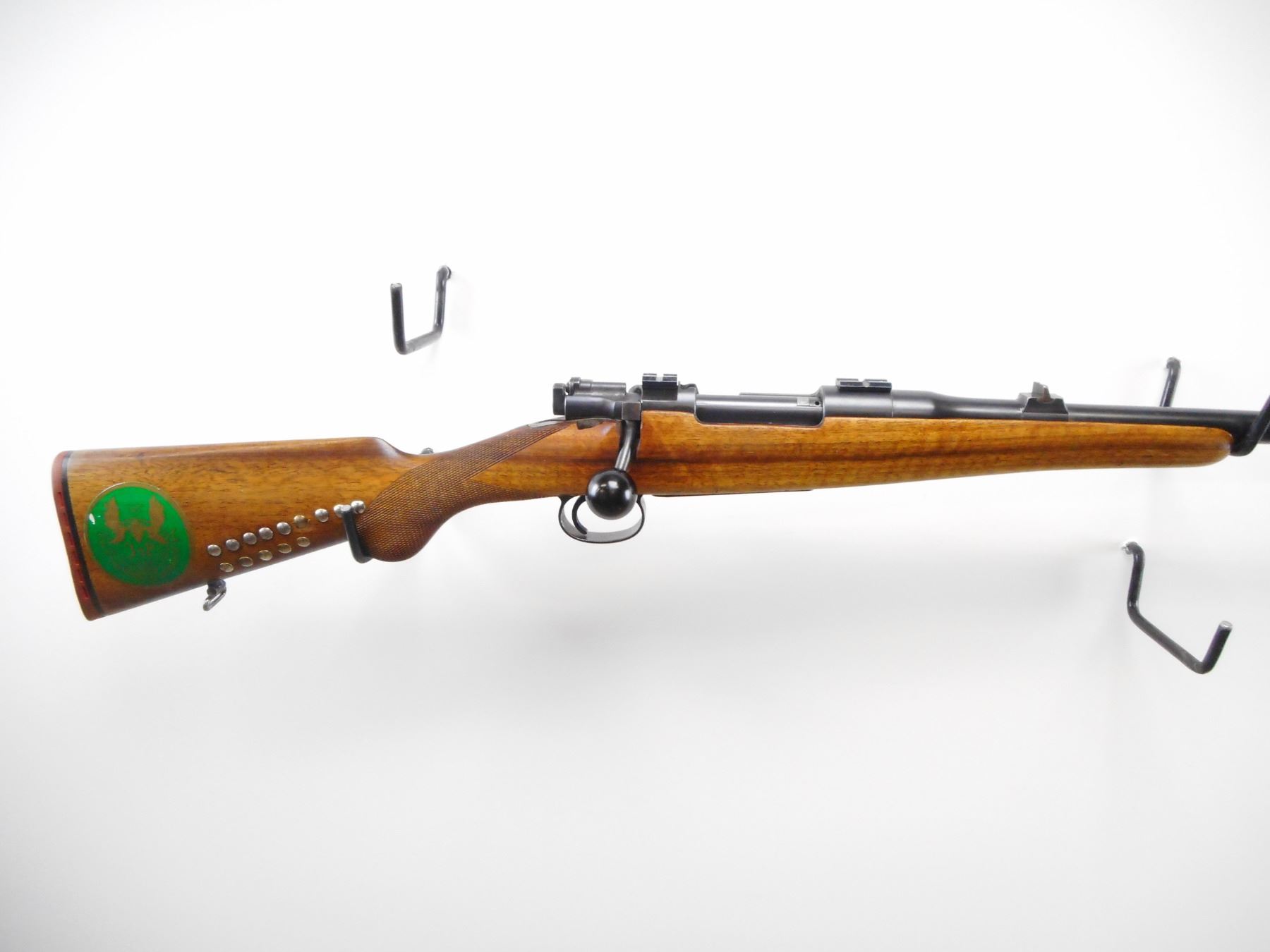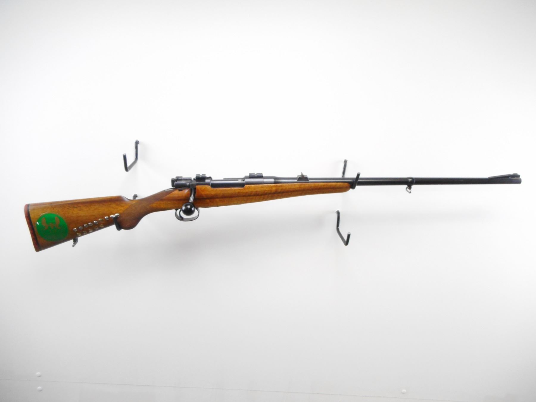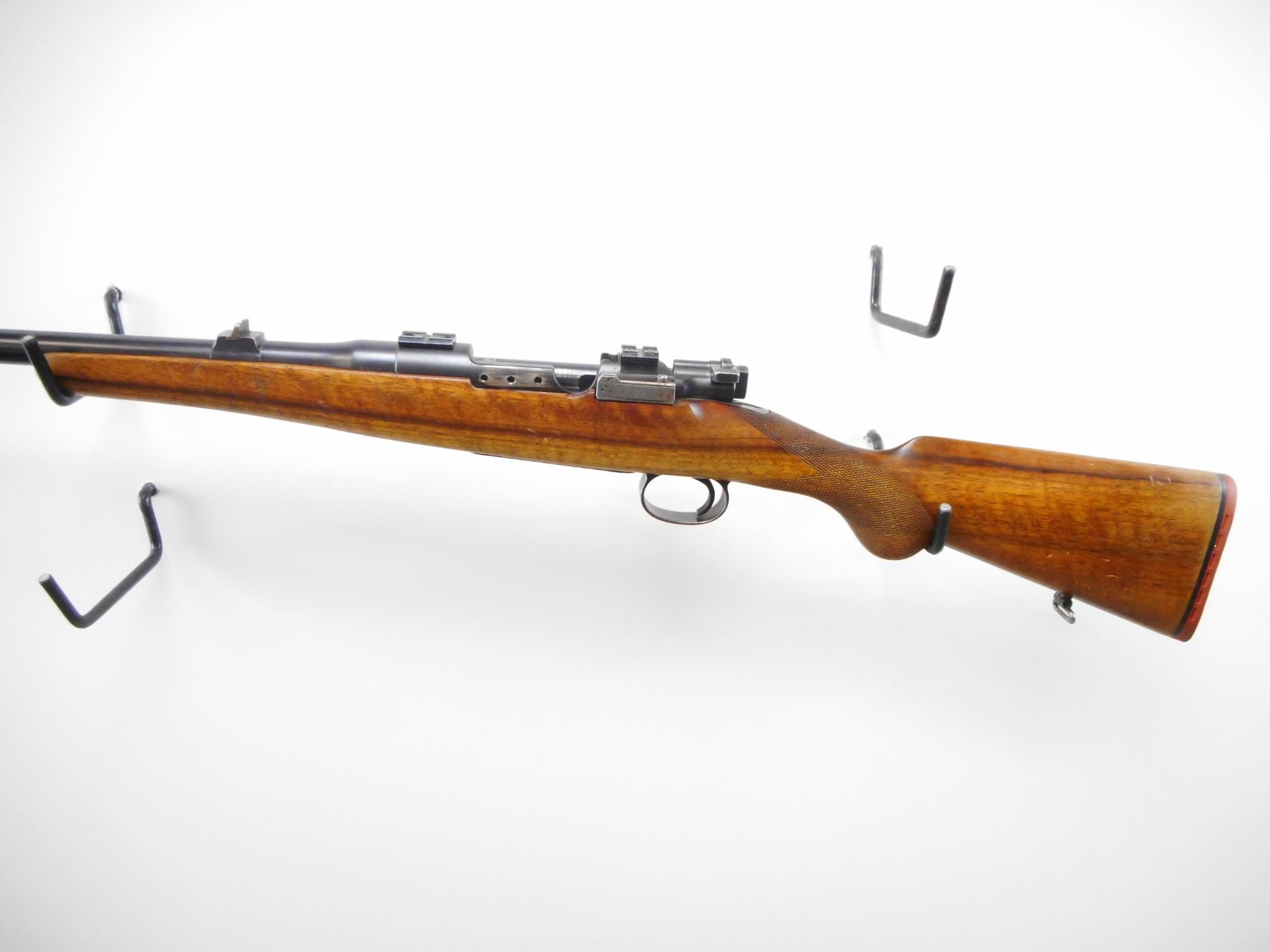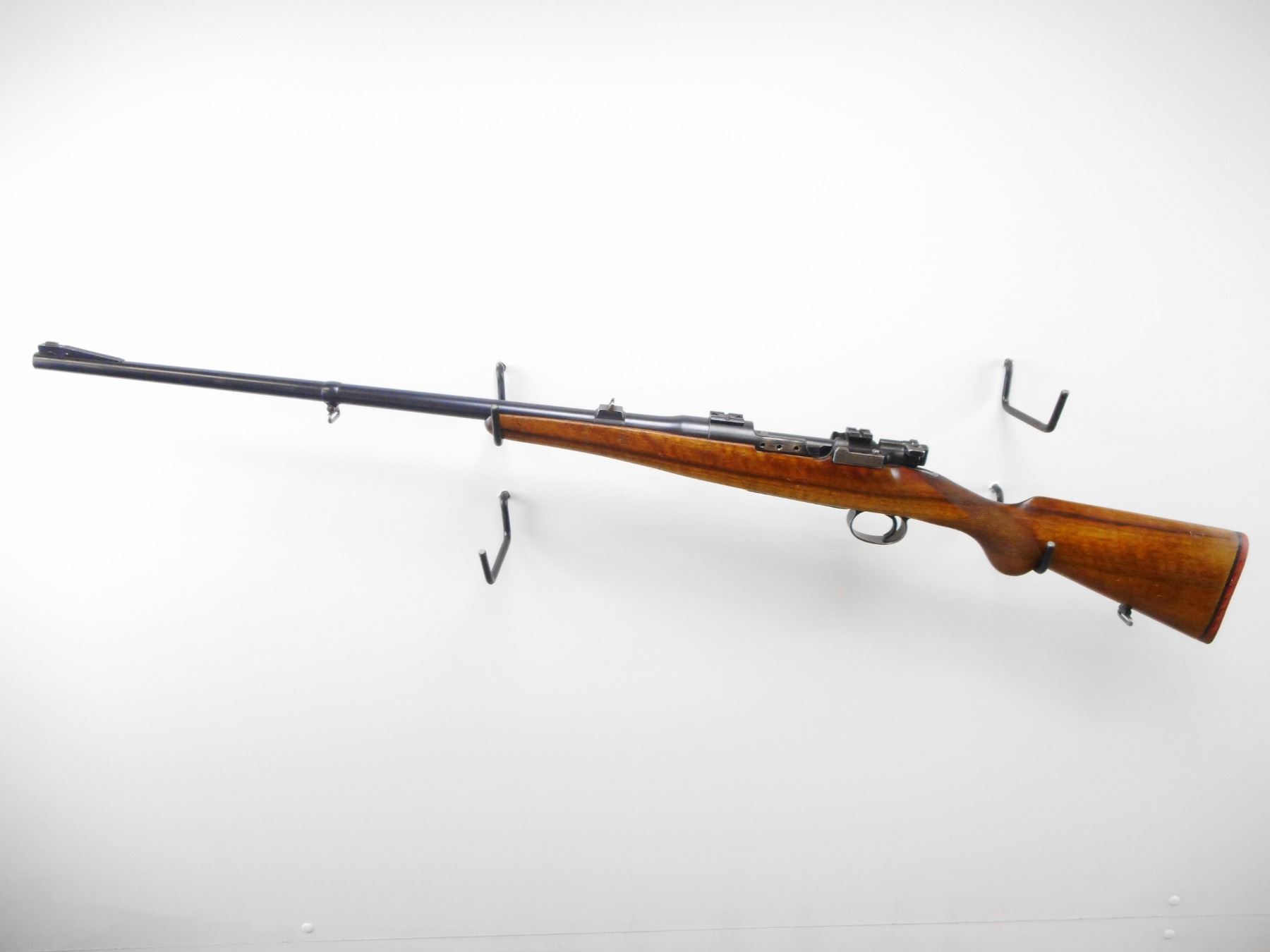 HUSQUVARNA , MODEL: MAUSER SPORTER , CALIBER: 9.3 X 57MM , BORE IS VERY GOOD. BLADE FRONT SIGHT WITH RAMP. U NOTCH REAR SIGHT. RECEIVER DRILLED AND TAPPED WITH WEAVER BASES. THREE HOLES DRILLED AND TAPPED AFTER RECEIVER. ONE PIECE WOOD STOCK. CHECKERED PISTOL GRIP. RED VENTED RUBBER RECOIL PAD. SLING SWIVELS. STOCK CRACKED BEHIND TANG. BLUEING SHOWS SOME WEAR AND HANDLING MARKS. STOCK SHOWS SOME DINGS SMALL CHIP, HANDLING MARKS. , ACTION: BOLT ACTION RIFLE , BARREL LENGTH: 23 1/2" , SERIAL # 9465 , CONDITION: 7/10 , CLASS: CANADIAN NON RESTRICTED CLASS