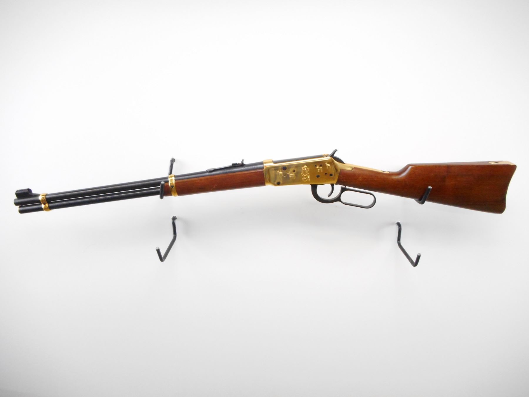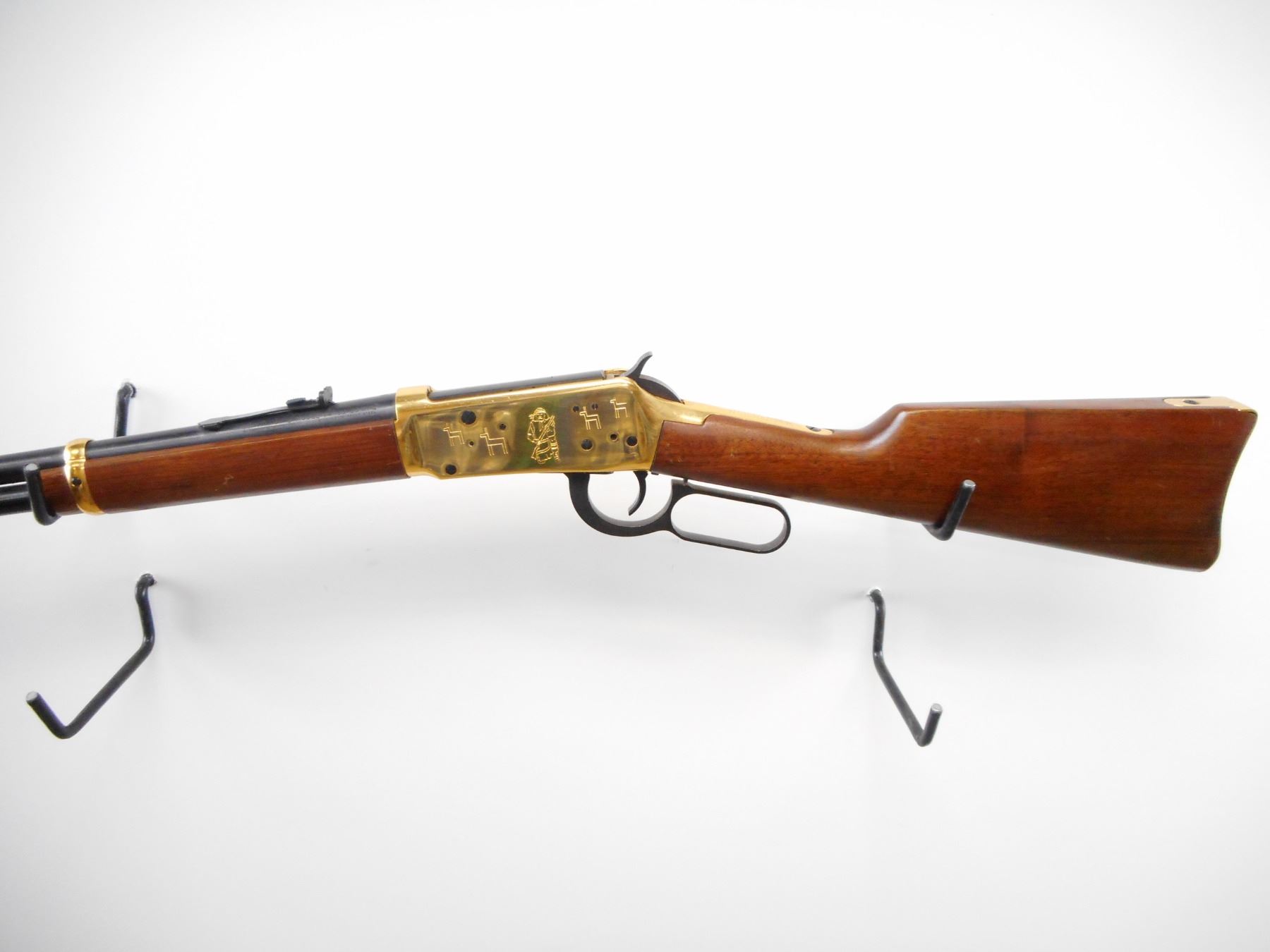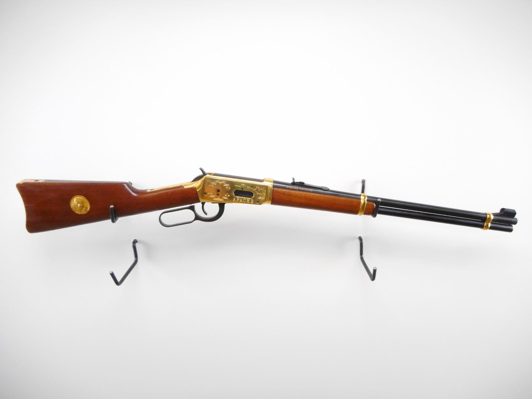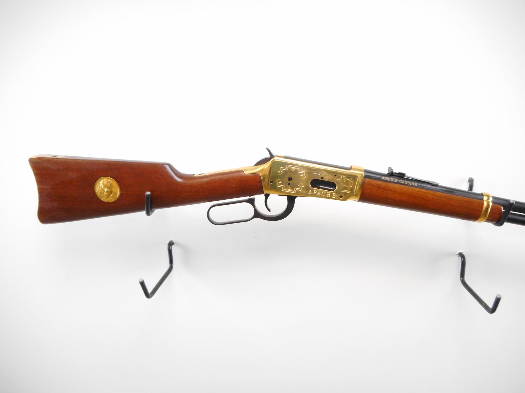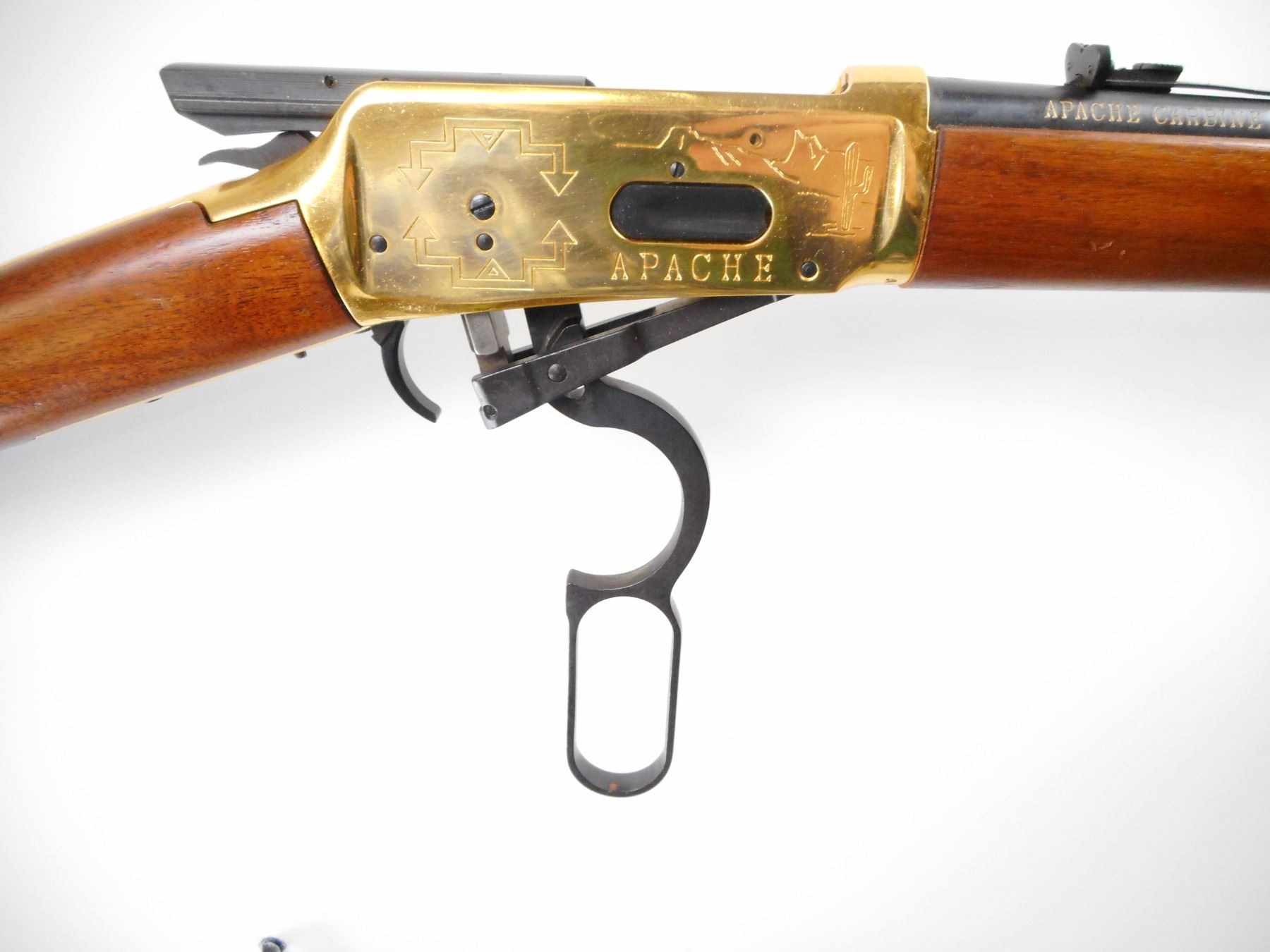 WINCHESTER , MODEL: 1894 APACHE CARBINE , CALIBER: 30-30 WIN , BORE IS VERY GOOD.. BLADE FRONT SIGHT WITH RAMP AND HOOD. U NOTCH ADJUSTABLE REAR SIGHT. BLUED BARREL AND FULL LENGTH MAG TUBE. GOLD REICEVER WITH ENGRAVED SCENES, AND BARREL BANDS. TWO PIECE SMOOTH WOOD STOCKS. CURVED GOLD BUTT PLATE. BLUEING SHOWS SLIGHT HANDLING MARKS AND WEAR. STOCK SHOWS SMALL DINGS SCRATCHES AND WEAR. , ACTION: LEVER ACTION RIFLE , BARREL LENGTH: 20" , SERIAL # AC6935 , CONDITION: 7/10 , CLASS: CANADIAN NON RESTRICTED CLASS