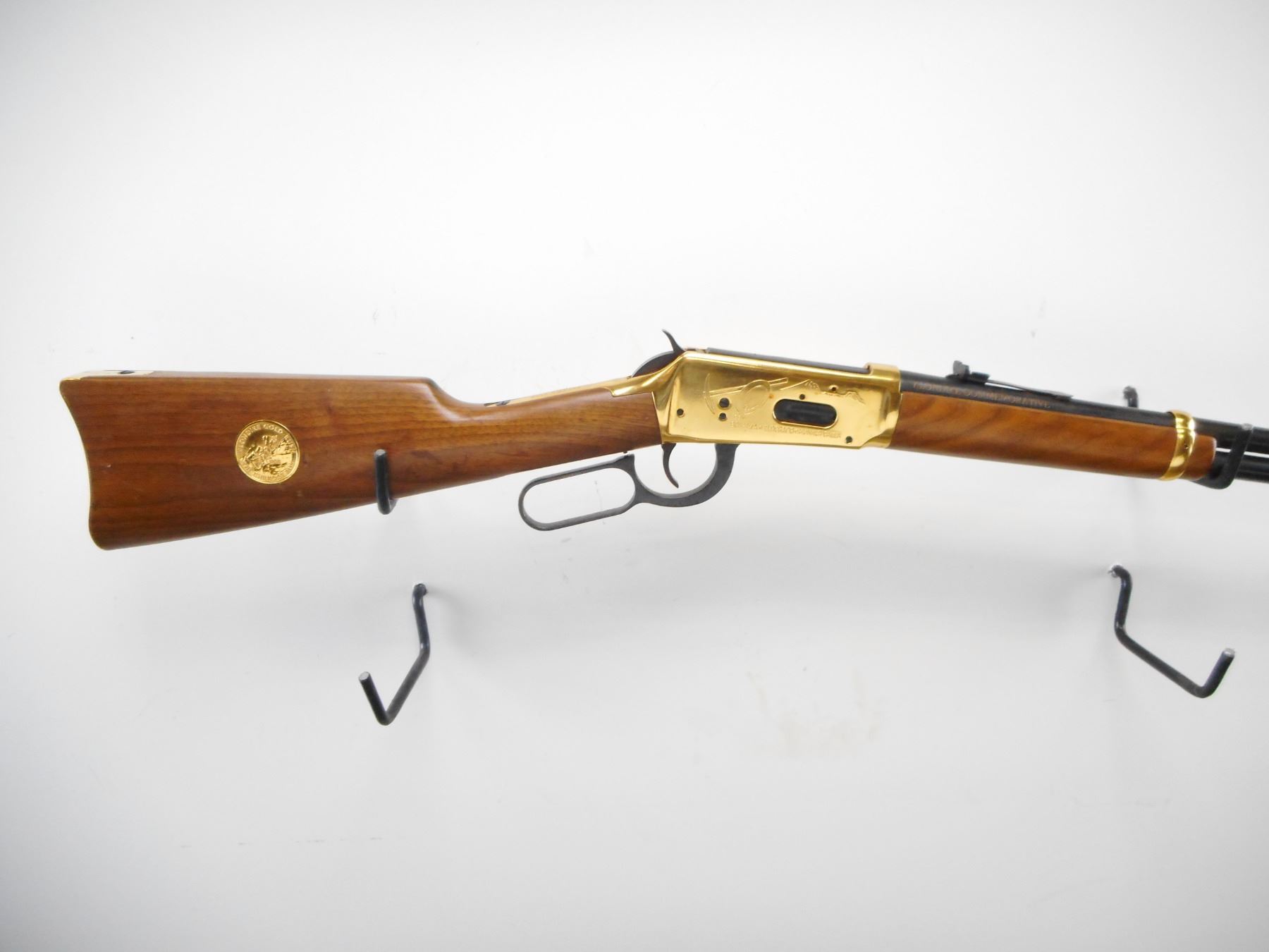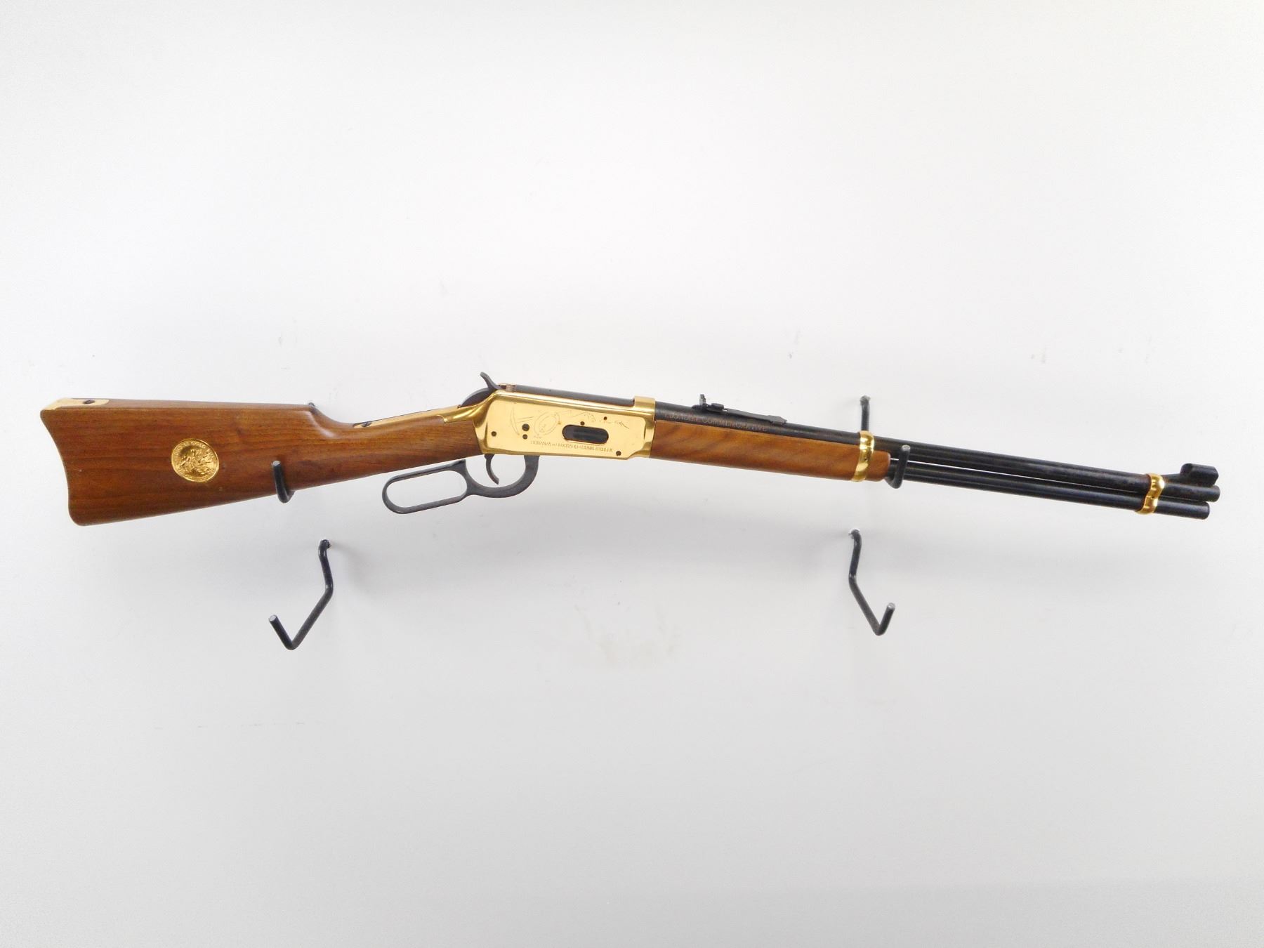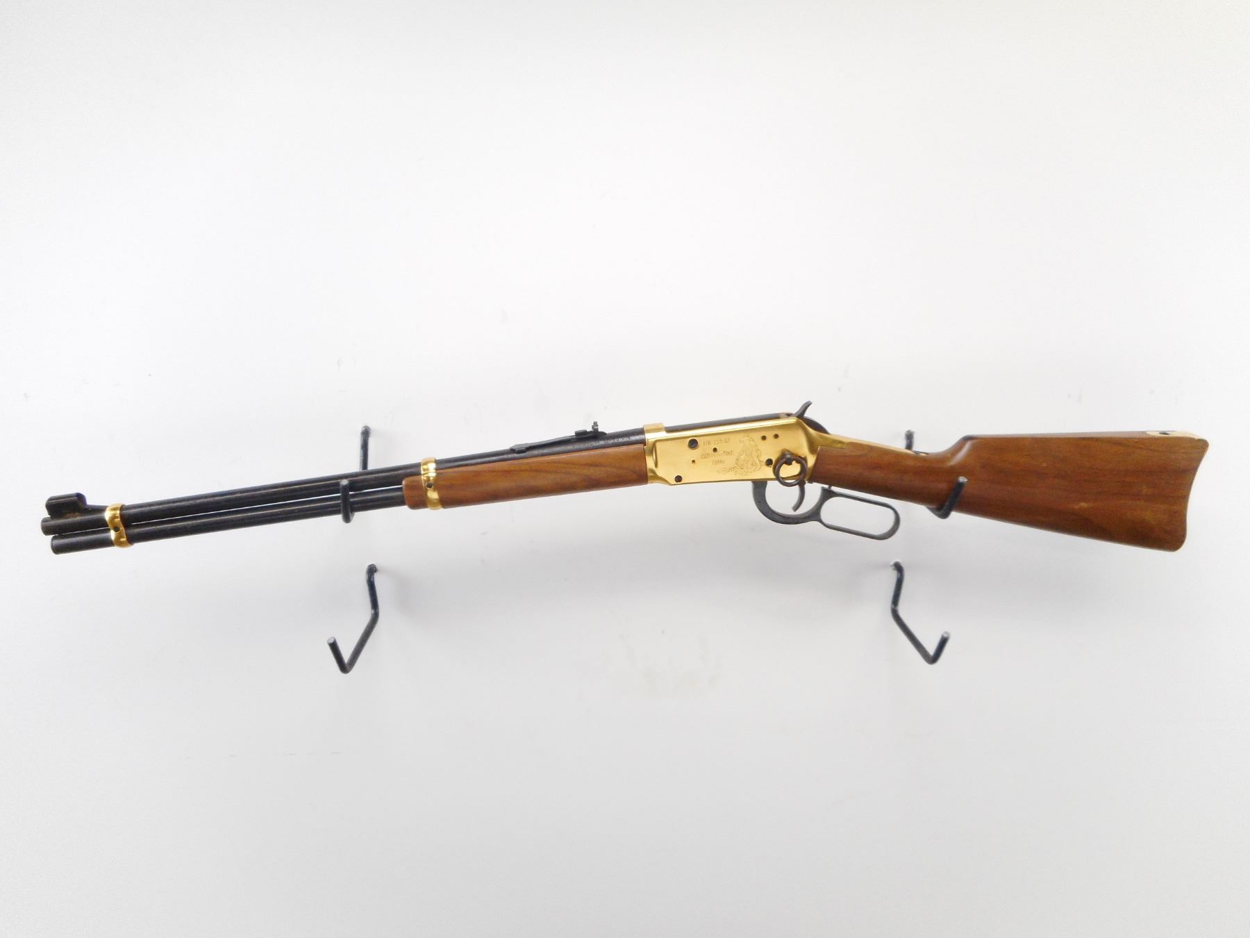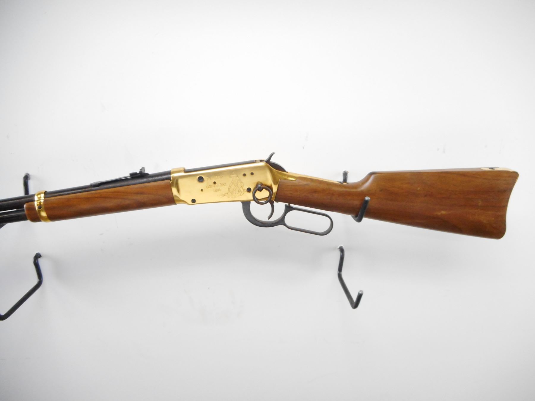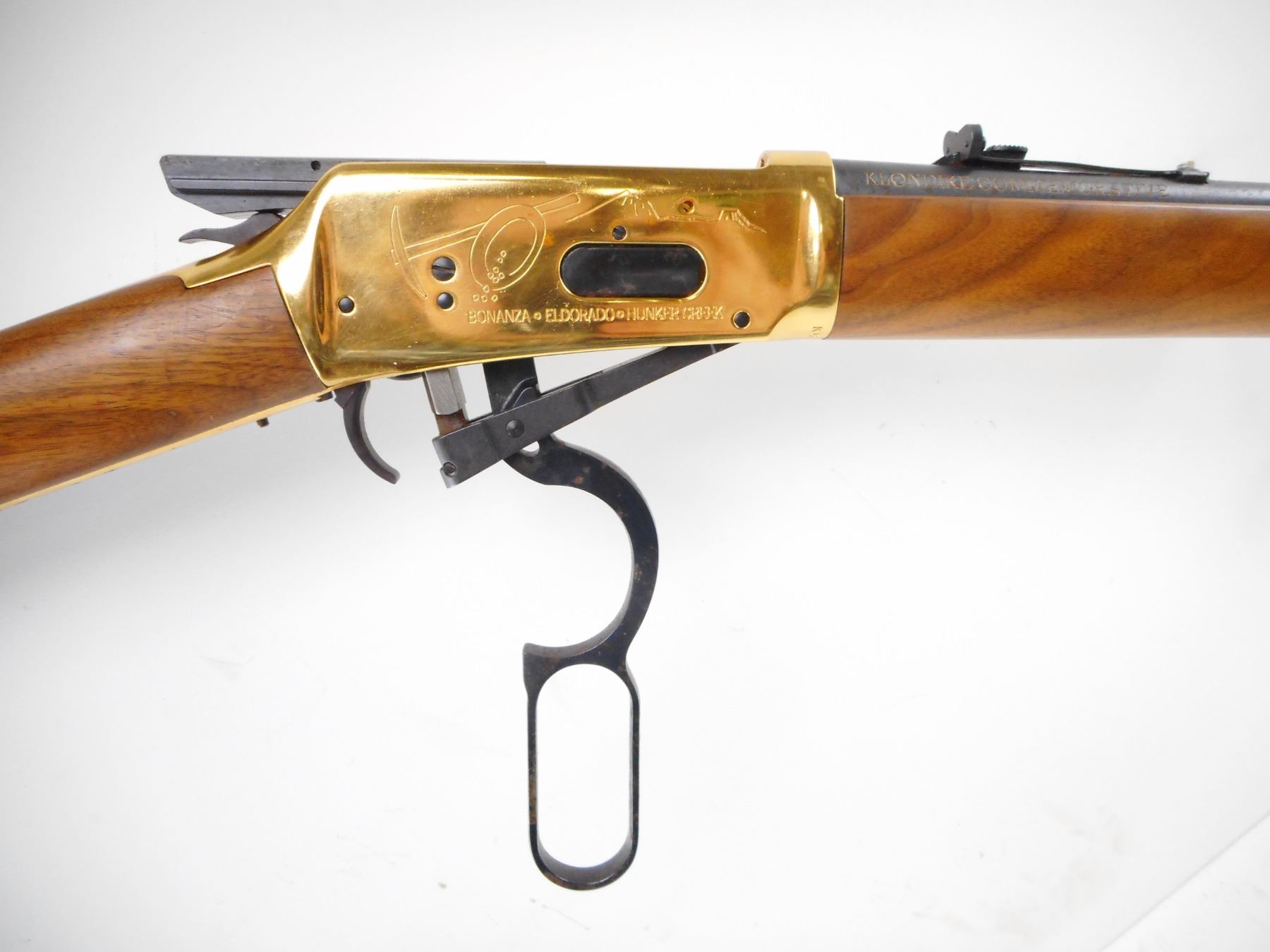 WINCHESTER , MODEL: 1894 KLONDIKE COMMEMORATIVE , CALIBER: 30-30 WIN , BORE IS VERY GOOD. BLADE FRONT SIGHT WITH RAMP AND HOOD. U NOTCH ADJUSTABLE REAR SIGHT. BLUED BARREL AND FULL LENGTH MAG TUBE. GOLD REICEVER WITH ENGRAVED SCENES,SADDLE RING, STUD AND BARREL BANDS. TWO PIECE SMOOTH WOOD STOCKS. CURVED GOLD BUTT PLATE. BLUEING SHOWS LIGHT RUST SPECKLNG, HANDLING MARKS AND WEAR. STOCK SHOWS SMALL DINGS SCRATCHES AND WEAR. , ACTION: LEVER ACTION RIFLE , BARREL LENGTH: 20" , SERIAL # KRG1944 , CONDITION: 6/10 , CLASS: CANADIAN NON RESTRICTED CLASS