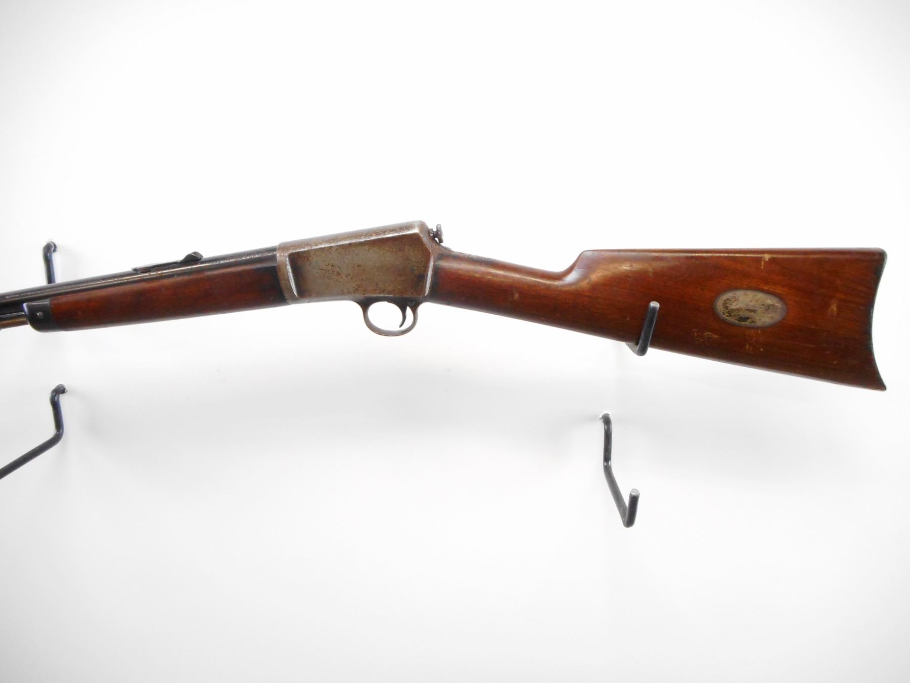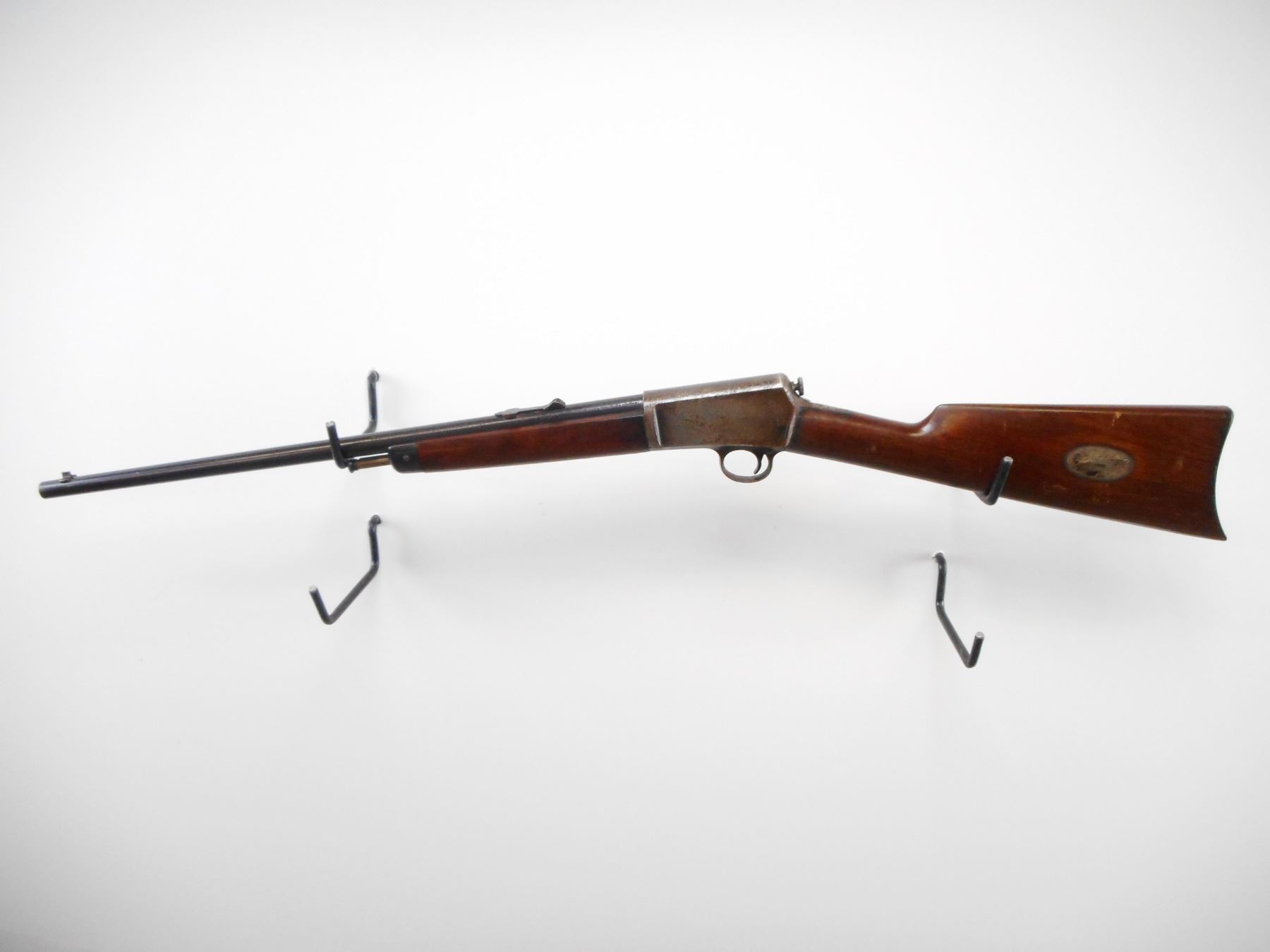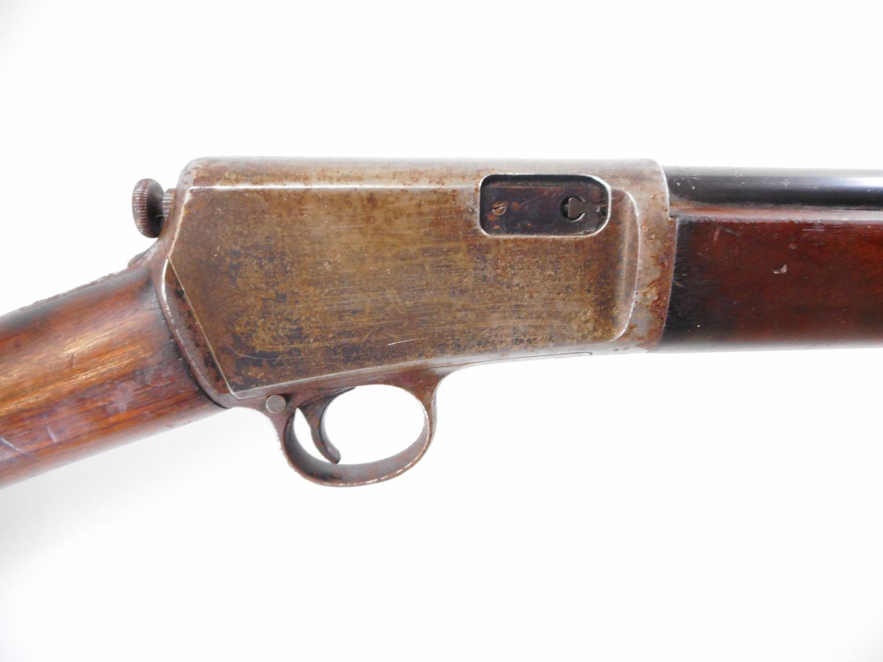 WINCHESTER , MODEL: 1903 , CALIBER: 22 WIN AUTO , BORE IS VERY GOOD. MFG'D 1911. BLADE FRONT SIGHT WITH HOOD. U NOTCH ADJUSTABLE REAR SIGHT. TWO PIECE SMOOTH WOOD STOCKS. STRAIGHT GRIP. CURVED STEEL BUTT PLATE. SILVER PLATE WITH GN NAME PROCTOR JR BOSTON ON LEFT SIDE OF STOCK. BARREL SHOWS LIGHT RUST SPECKLES AND WEAR. RECEIVER SILVER/GREY. PITTED SPOTS. STOCKS SHOWS HANDLING MARK AND DINGS , ACTION: SEMI AUTO RIFLE , BARREL LENGTH: 20" , SERIAL # 64522 , CONDITION: 6/10 , CLASS: CANADIAN NON RESTRICTED CLASS