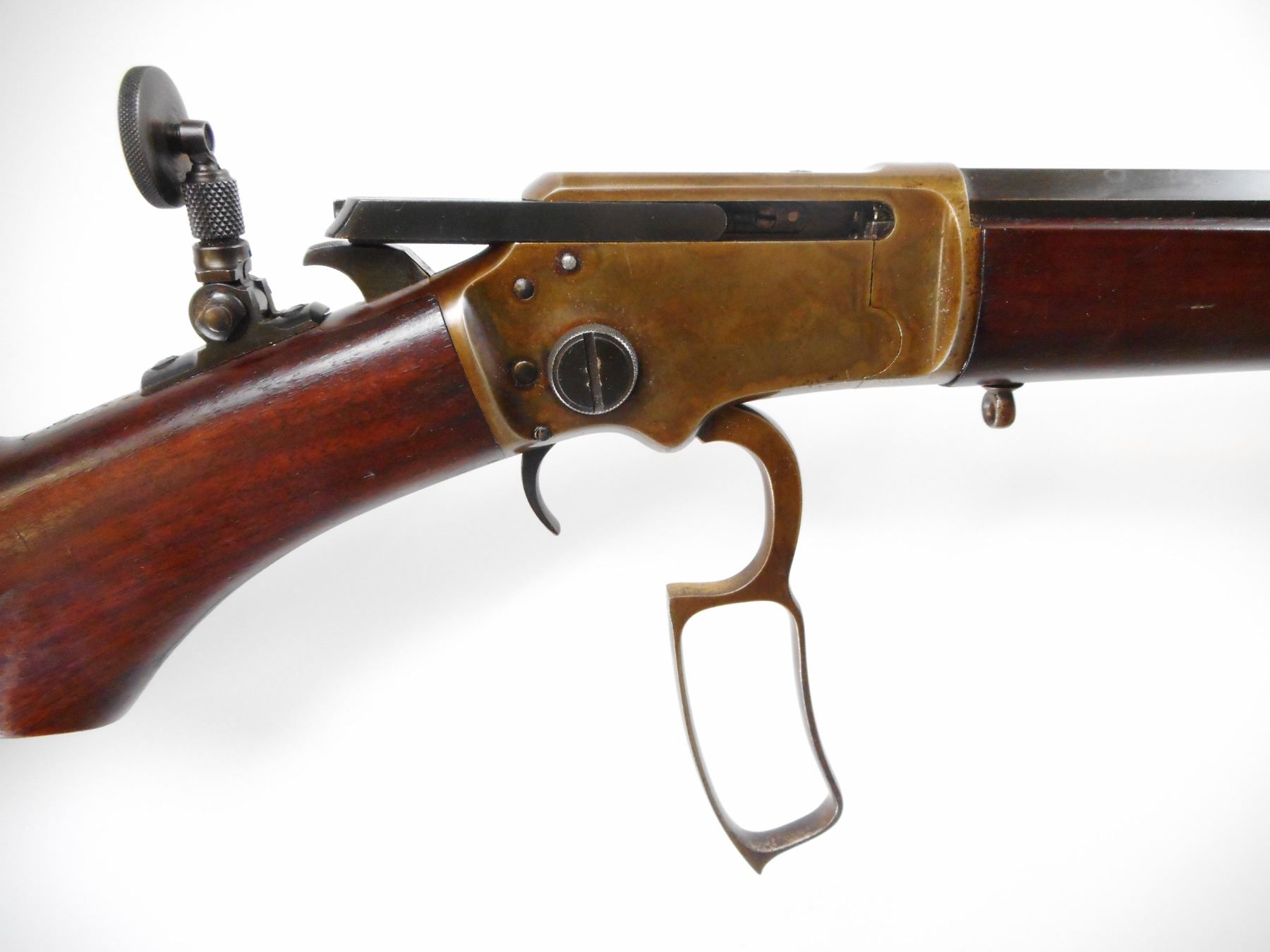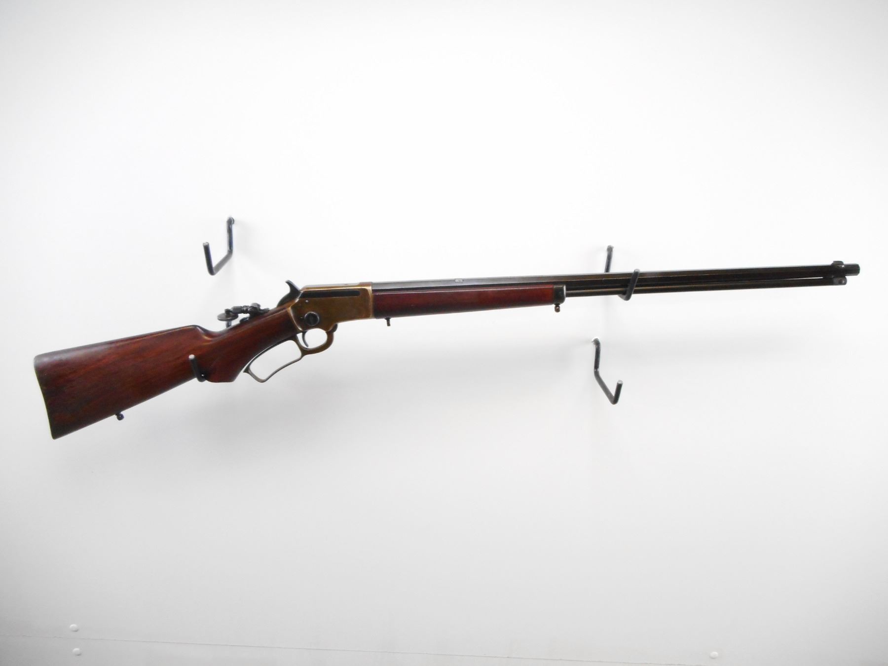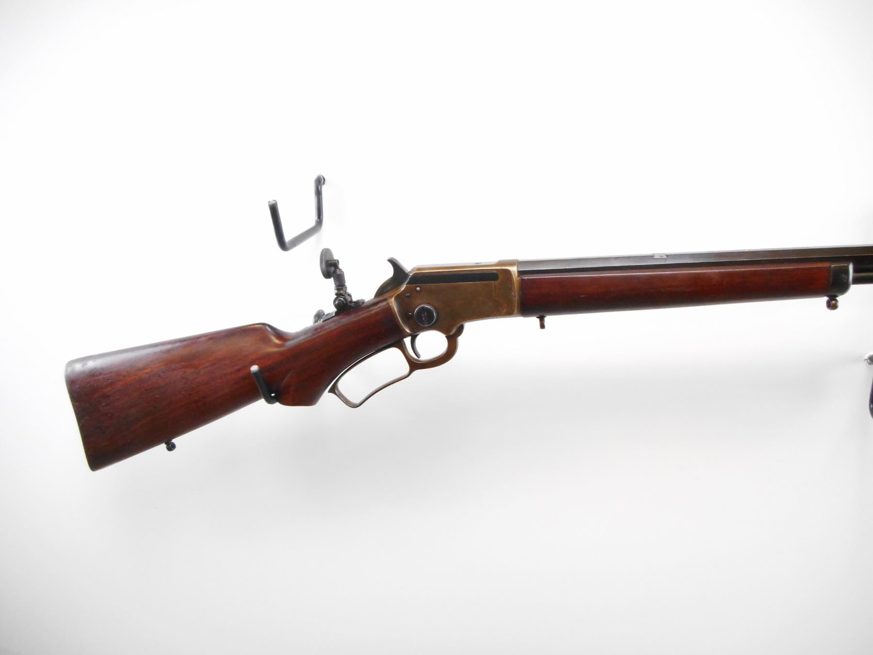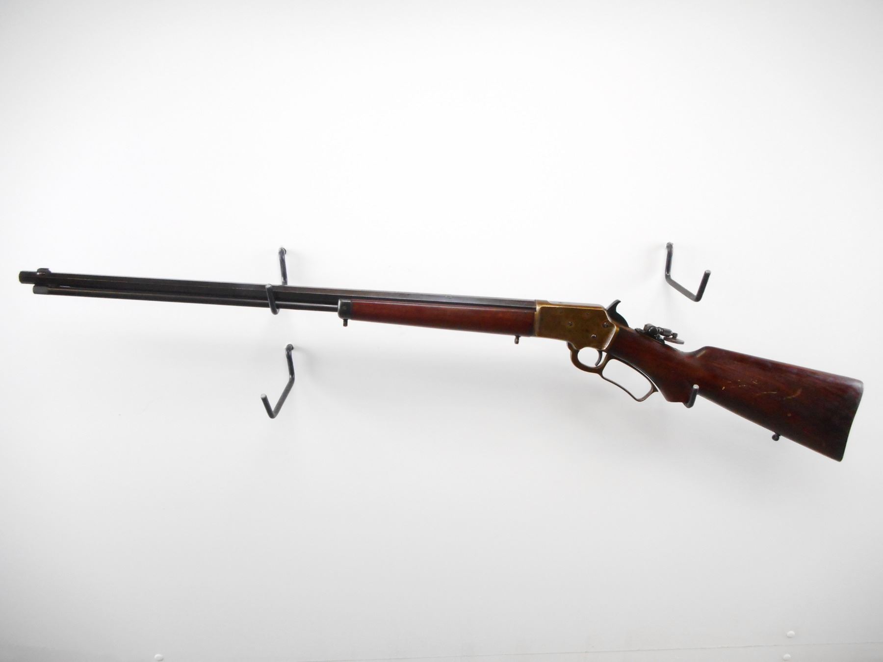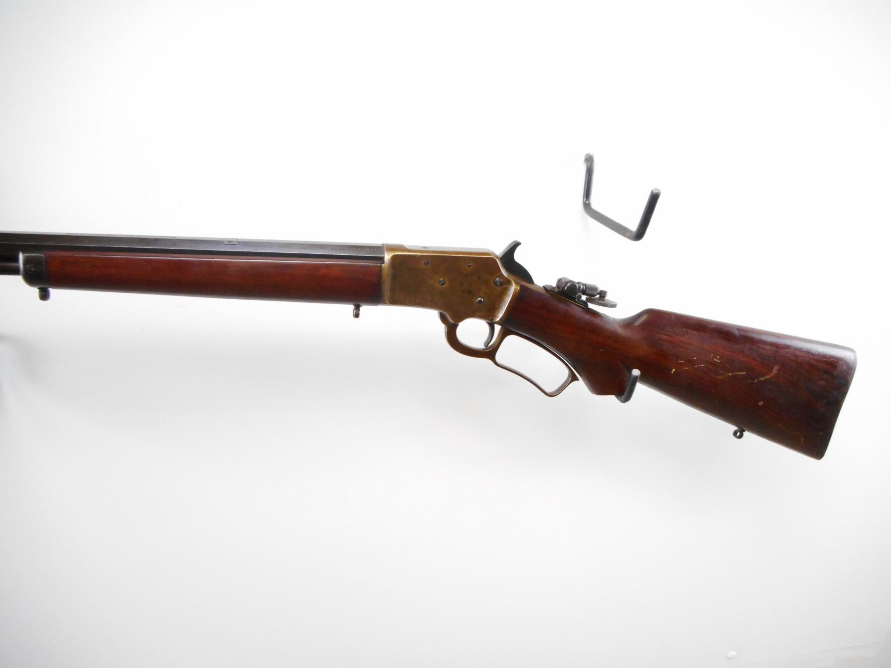 MARLIN , MODEL: MODEL 39 , CALIBER: 22 LR , BORE IS VERY GOOD. MFG'D BETWEEN 1921-1925. BLADE FRONT SIGHT. REAR SIGHT REMOVED. SLOT BLANK INSTALLED. FOLDING TANG PEEP SIGHT WITH LARGE EYE PIECE. OCTAGONAL BARREL. TWO PIECE SMOOTH WOOD STOCKS. PISTOL GRIP WITH CLASSIC S" CUT ON BOTTOM. SLING STUDS, AND MARLING BULLSEYE ON BOTTOM OF STOCK. CHECKERED MARLIN CURVED BUTT PLATE. STEEL FOREND CAP. FULL LENGTH MAG TUBE. BLUEING SHOWS SOME WEAR AND HANDLING MARKS. RECEIVER SHOWS FAINT COLOUR CASE HARDENING. STOCK SHOWS HANDLING MARKS AND DINGS , ACTION: LEVER ACTION RIFLE , BARREL LENGTH: 24" , SERIAL # 10428 , CONDITION: 7/10 , CLASS: CANADIAN NON RESTRICTED CLASS