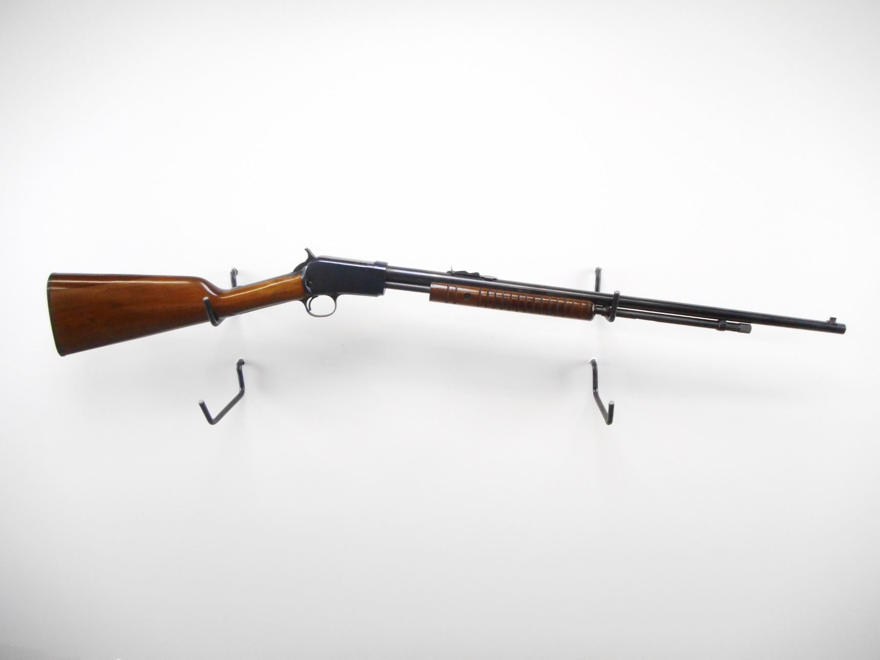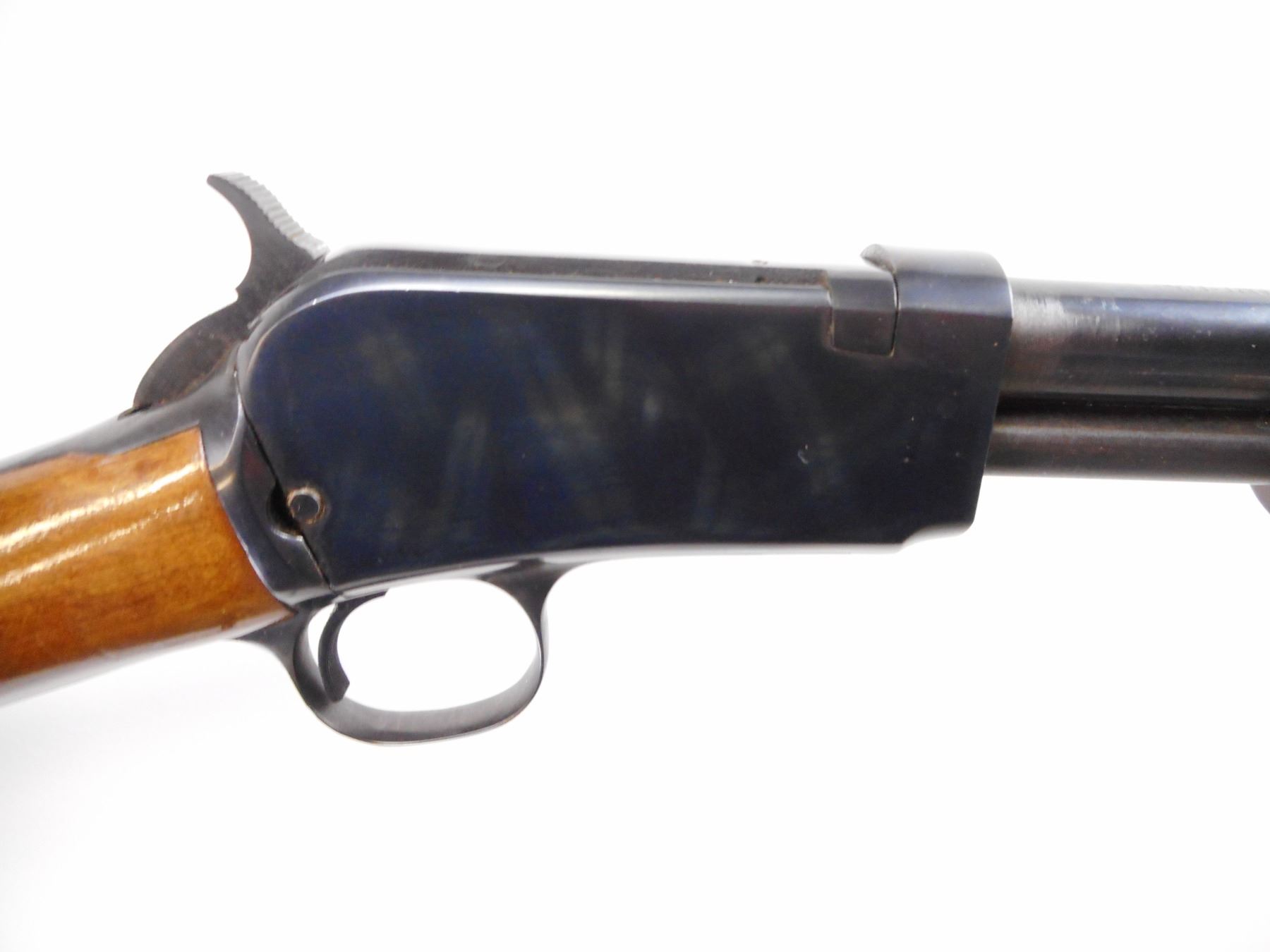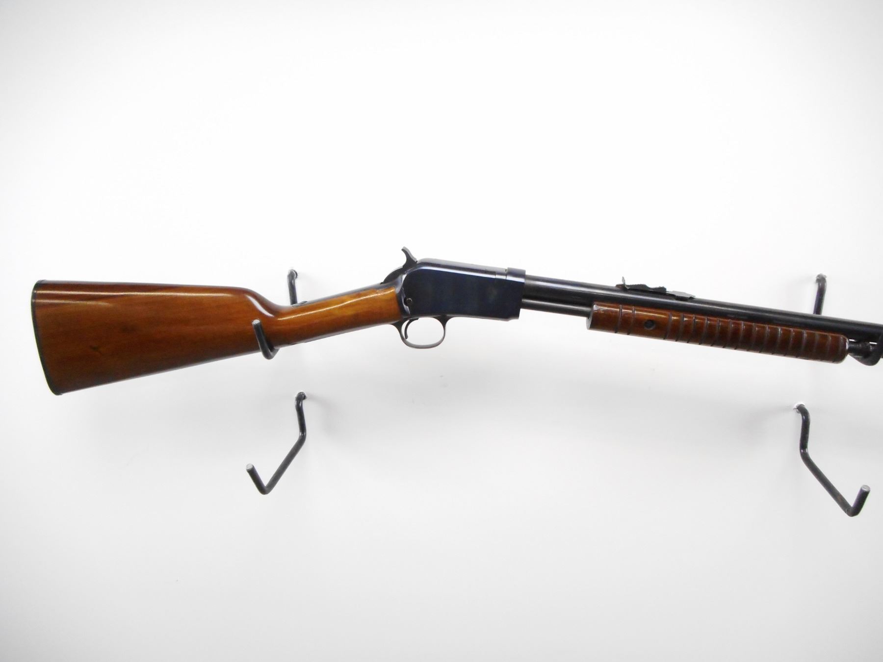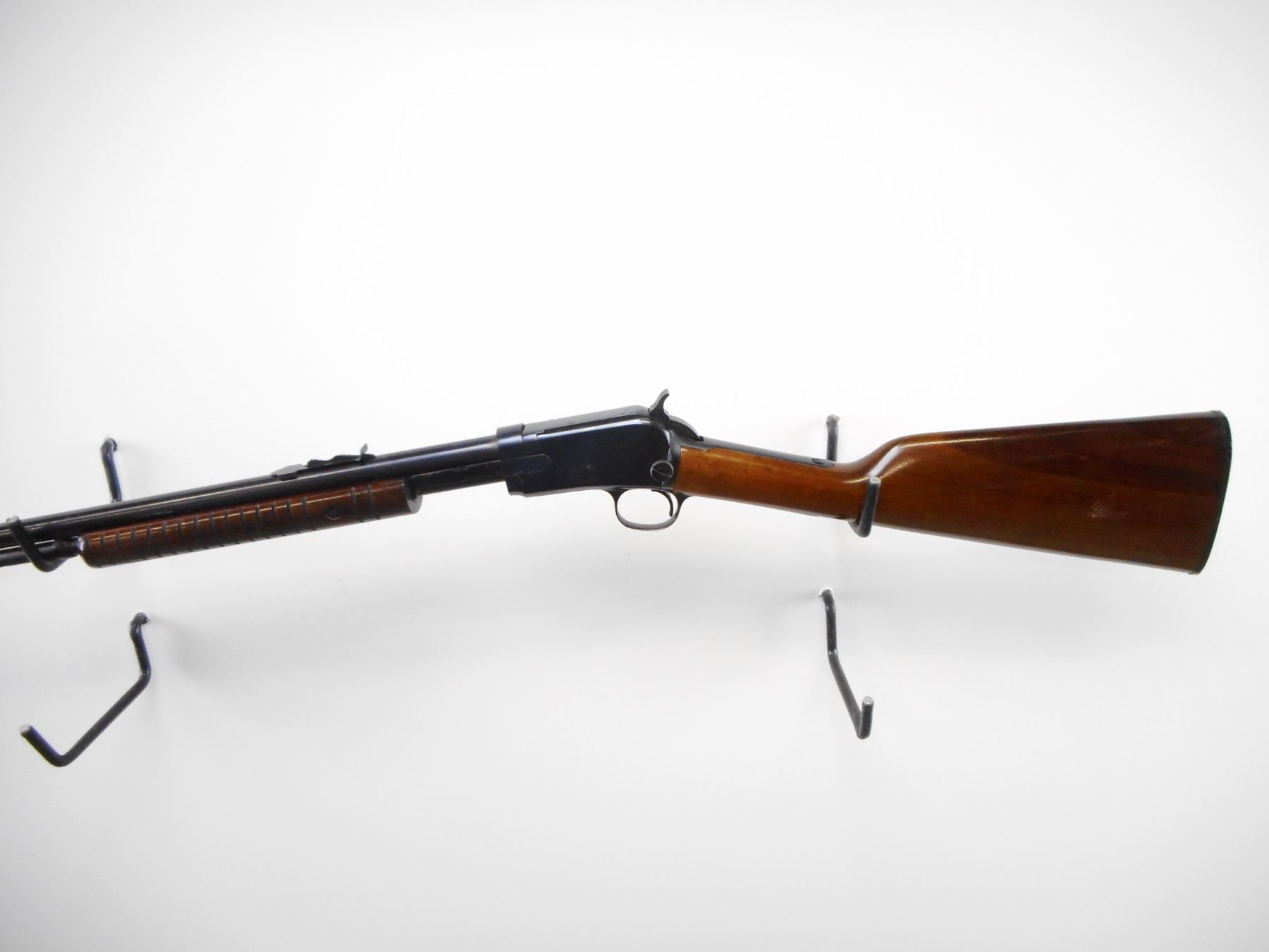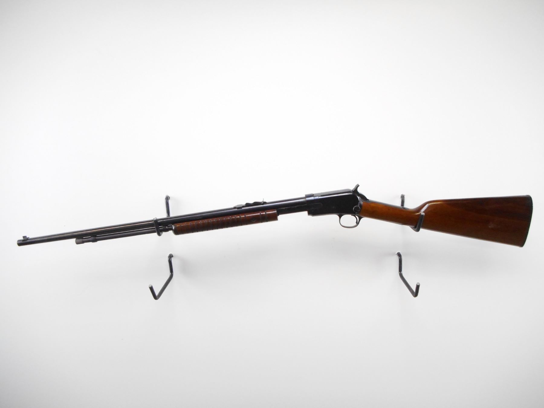 ROSSI , MODEL: 62 , CALIBER: 22 LR , BORE IS VERY GOOD. BLADE FRONT SIGHT. U NOTCH ADJUSTABLE REAR SIGHT. BLUED FINISH ON METAL PARTS. GROOVED WOOD FOREND. SMOOTH STRAIGHT GRIP STOCKS. GROOVED BLACK POLYMER BUTT PLATE. BLUED FINISH SHOWS SOME WEAR AND HANDLING MARKS. STOCK SHOWS SOME HANDLING MARKS AND DINGS. , ACTION: PUMP ACTION RIFLE , BARREL LENGTH: 23" , SERIAL # G99239 , CONDITION: 8/10 , CLASS: CANADIAN NON RESTRICTED CLASS
