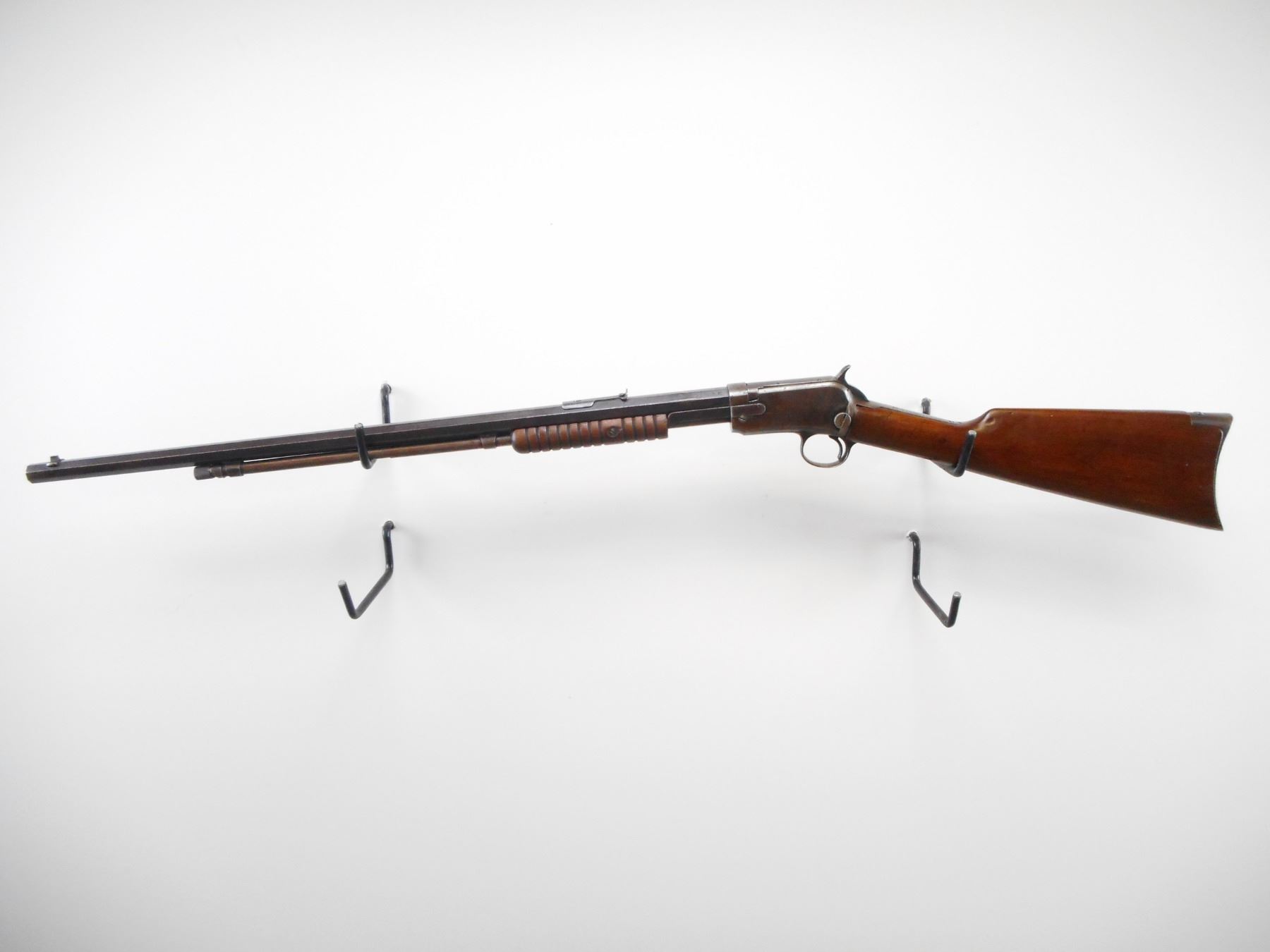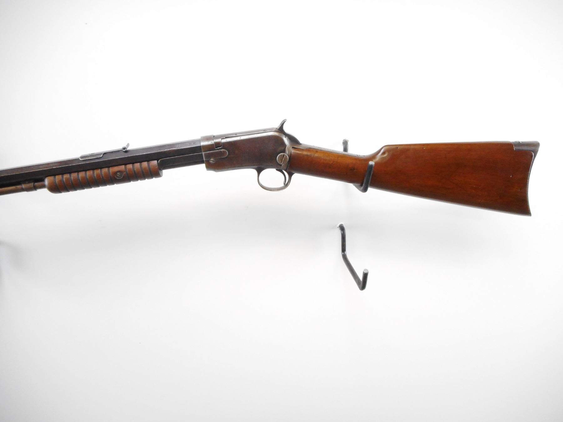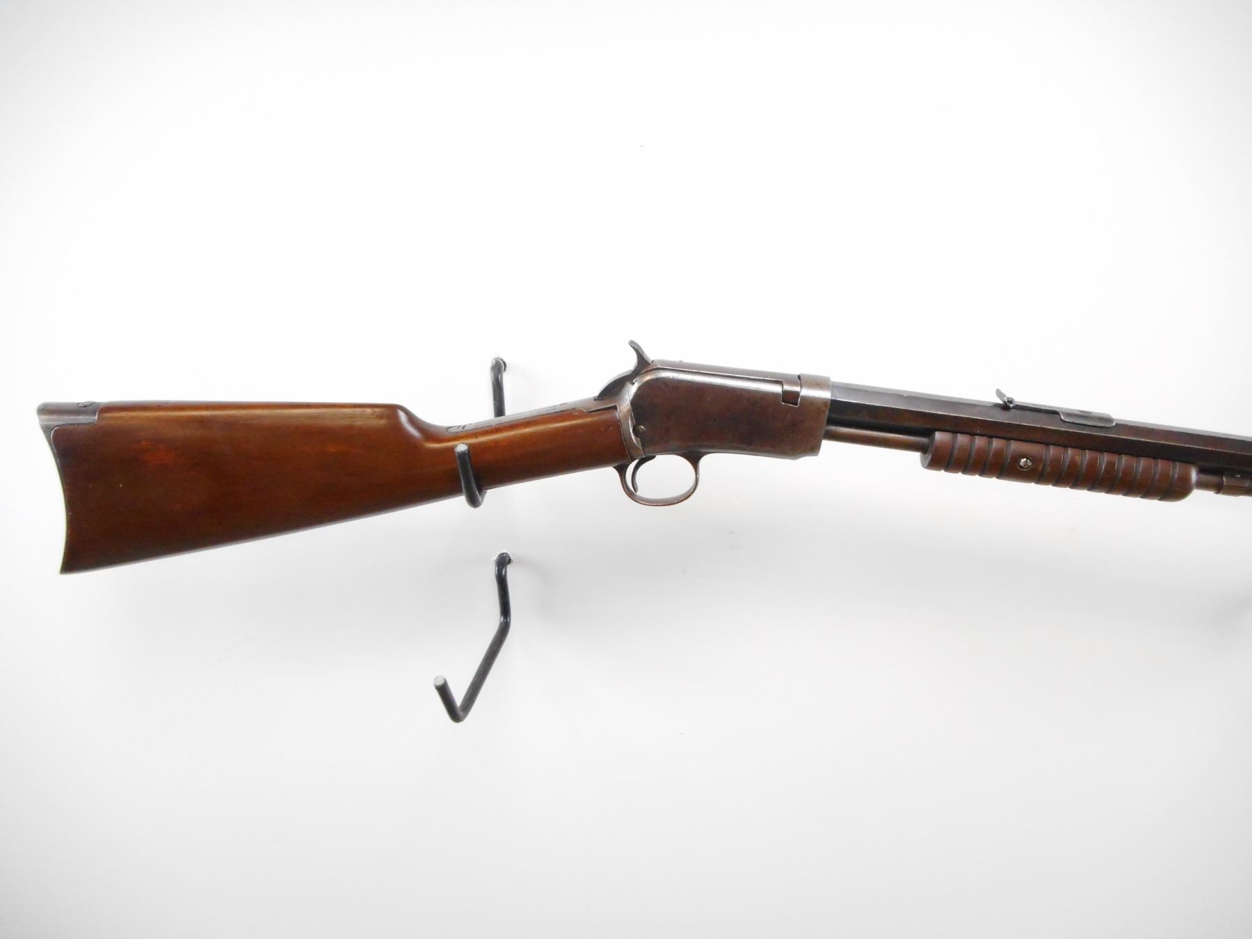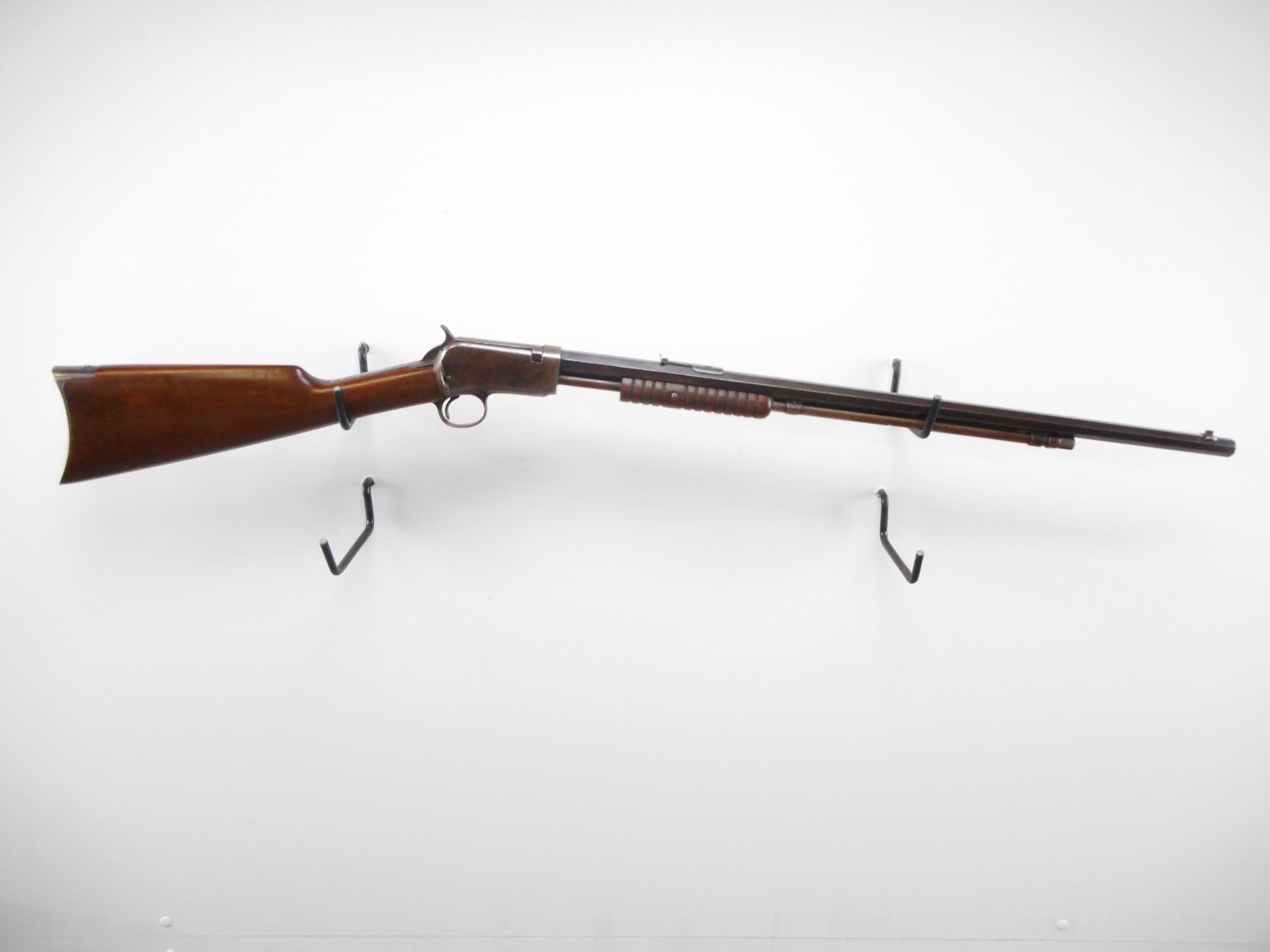 WINCHESTER , MODEL: 1890 , CALIBER: 22 WRF , BORE IS GOOD. MFG'D 1911. BLADE FRONT SIGHT. U NOTCH REAR SIGHT. OCTAGONAL BARREL. BLUED FINISH ON METAL PARTS. TANG DRILLED AND TAPPED FOR PEEP SIGHT. GROOVED WOOD FOREND. SMOOTH WOOD BUTT STOCK. CURVED STEEL BUTT PLATE. BLUEING SHOWS SOME WEAR AND HANDLING MARKS, LIGHT RUST SPECKLES. STOCK SHOWS DINGS, SCRATCHES AND HANDLING MARKS , ACTION: PUMP ACTION RIFLE. , BARREL LENGTH: 24" , SERIAL # 631095 , CONDITION: 6/10 , CLASS: CANADIAN NON RESTRICTED CLASS