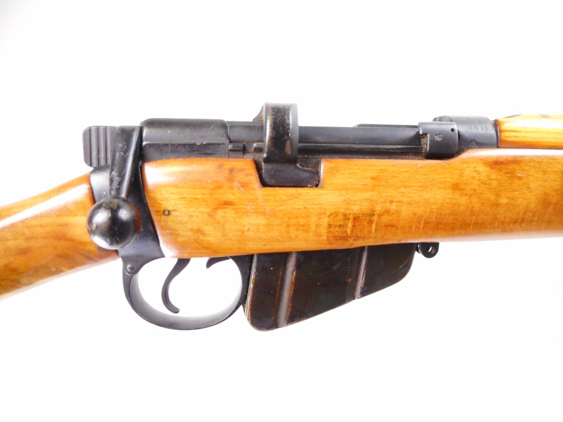 LEE ENFIELD , MODEL: NO 1 MK 3 SPORTER , CALIBER: 303 BR , COMES WITH MAGAZINE. BORE IS FAIR, PITTED.MFG'D BSA 1916. . BOLT MATCHES RECEIVER. BLADE FRONT SIGHT WITH RAMP, U NOTCH ADJUSTABLE REAR SIGHT. RECEIVER MARKED FTR 1953. SMOOTH THREE PIECE WOOD STOCKS. BRASS BUTT PLATE WITH TRAP. REAR SWIVEL ONLY. METAL SHOWS HANDLING MARKS AND WEAR. STOCK SHOWS HANDLING MARKS AND WEAR. , ACTION: BOLT ACTION RIFLE , BARREL LENGTH: 25 1/4" , SERIAL # 90630A , CONDITION: 7/10 , CLASS: CANADIAN NON RESTRICTED CLASS