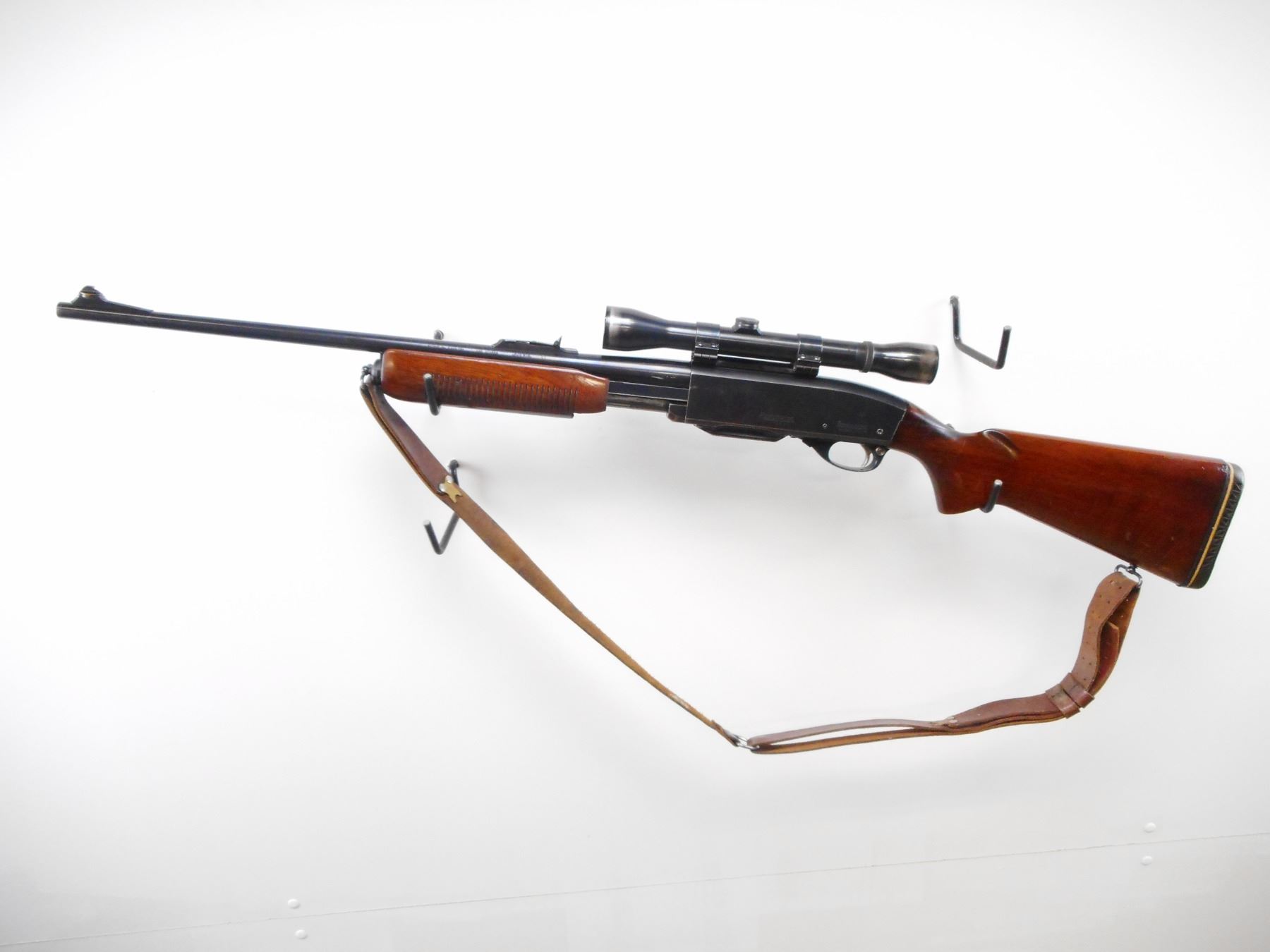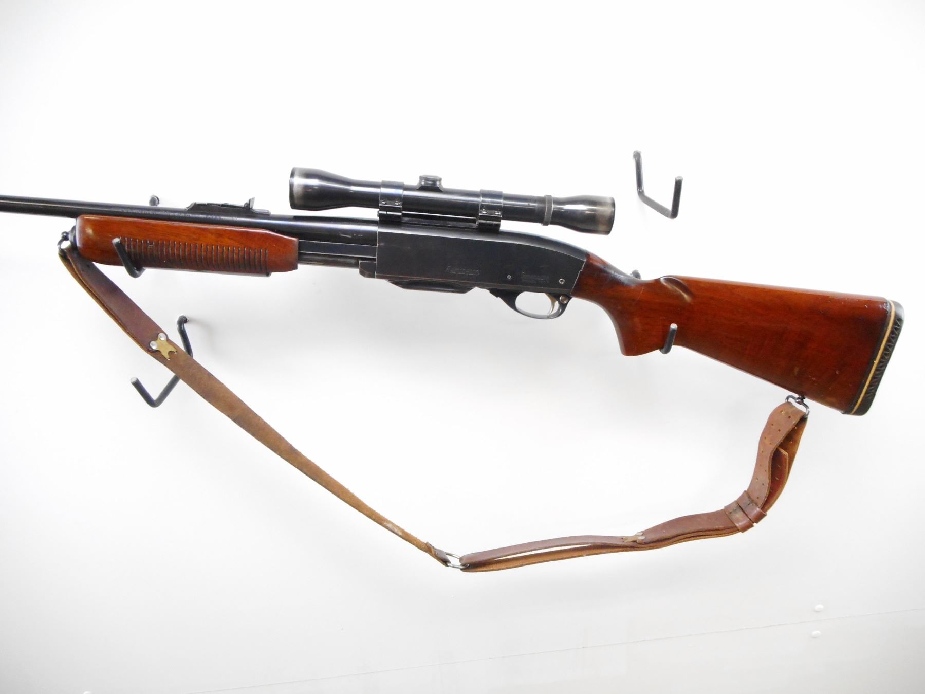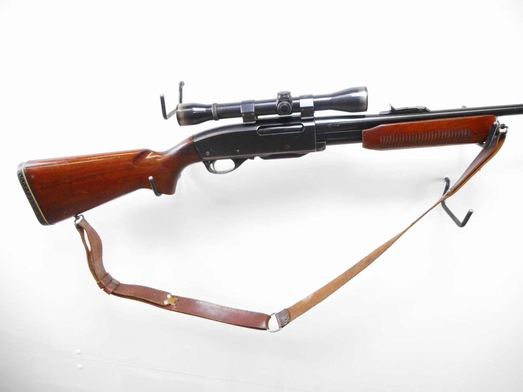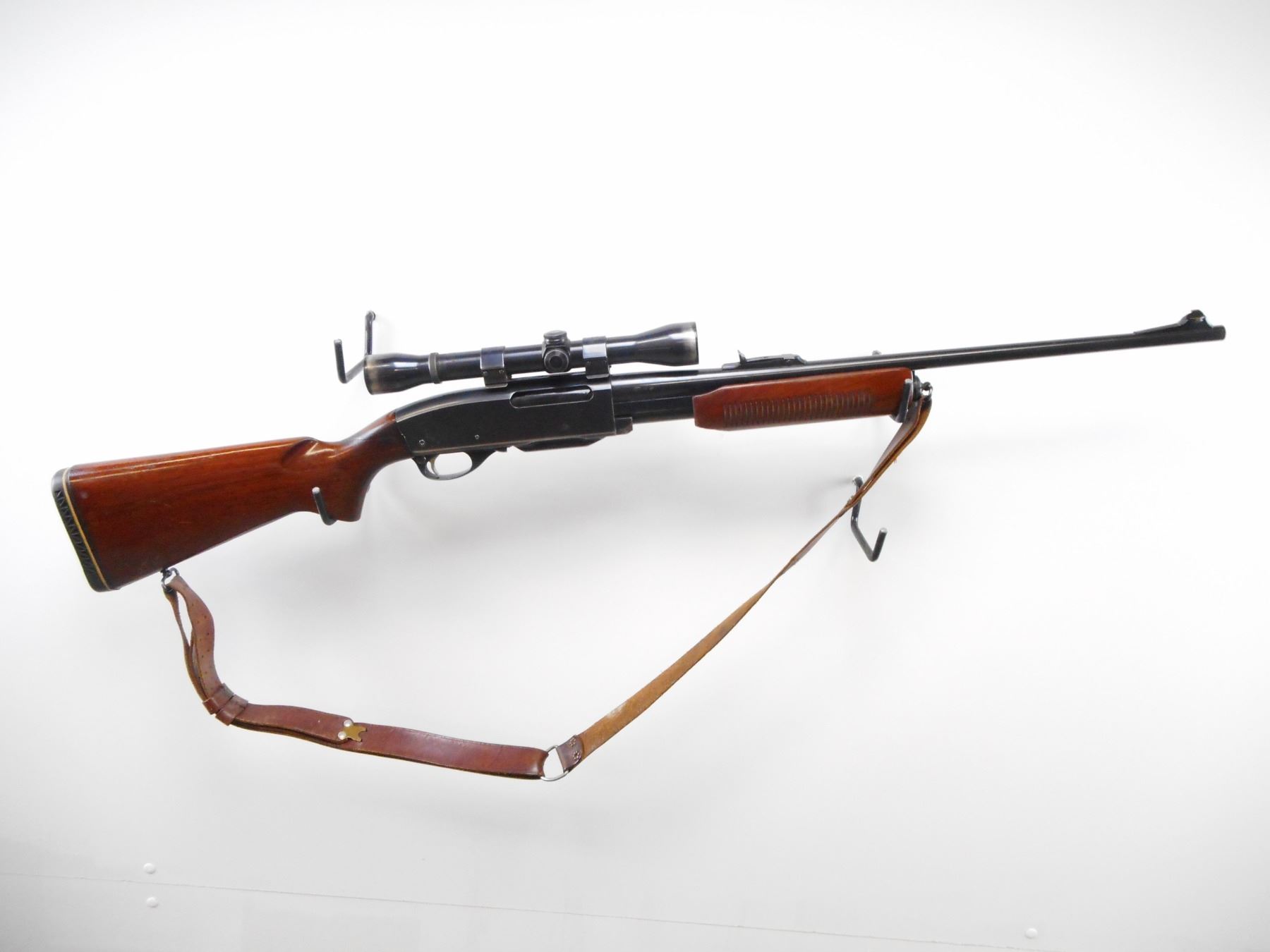 REMINGTON , MODEL: 760 GAME MASTER , CALIBER: 308 WIN , COMES WITH MAGAZINE. BORE IS VERY GOOD. BLADE FRONT SIGHT WITH RAMP. ADJUSTABLE U NOTCH REAR SIGHT. WEAVER K-4 SCOPE. CLEAR OPTICS. FINE CROSS HAIRS. BLUED FINISH ON METAL PARTS. GROOVED WOOD FOREND. SMOOTH PISTOL GRIP WOOD BUTT STOCK. BROKEN AND REPAIRED BEHIND RECEIVER. BLACK VENTED RUBBER RECOIL PAD. SLING SWIVELS WITH BROWN LEATHER SLING. METAL SHOWS SOME HANDLING MARKS AND WEAR. STOCK SHOWS HANDLING MARKS AND WEAR. , ACTION: PUMP ACTION RIFLE , BARREL LENGTH: 22" , SERIAL # 378655 , CONDITION: 6/10 , CLASS: CANADIAN NON RESTRICTED CLASS