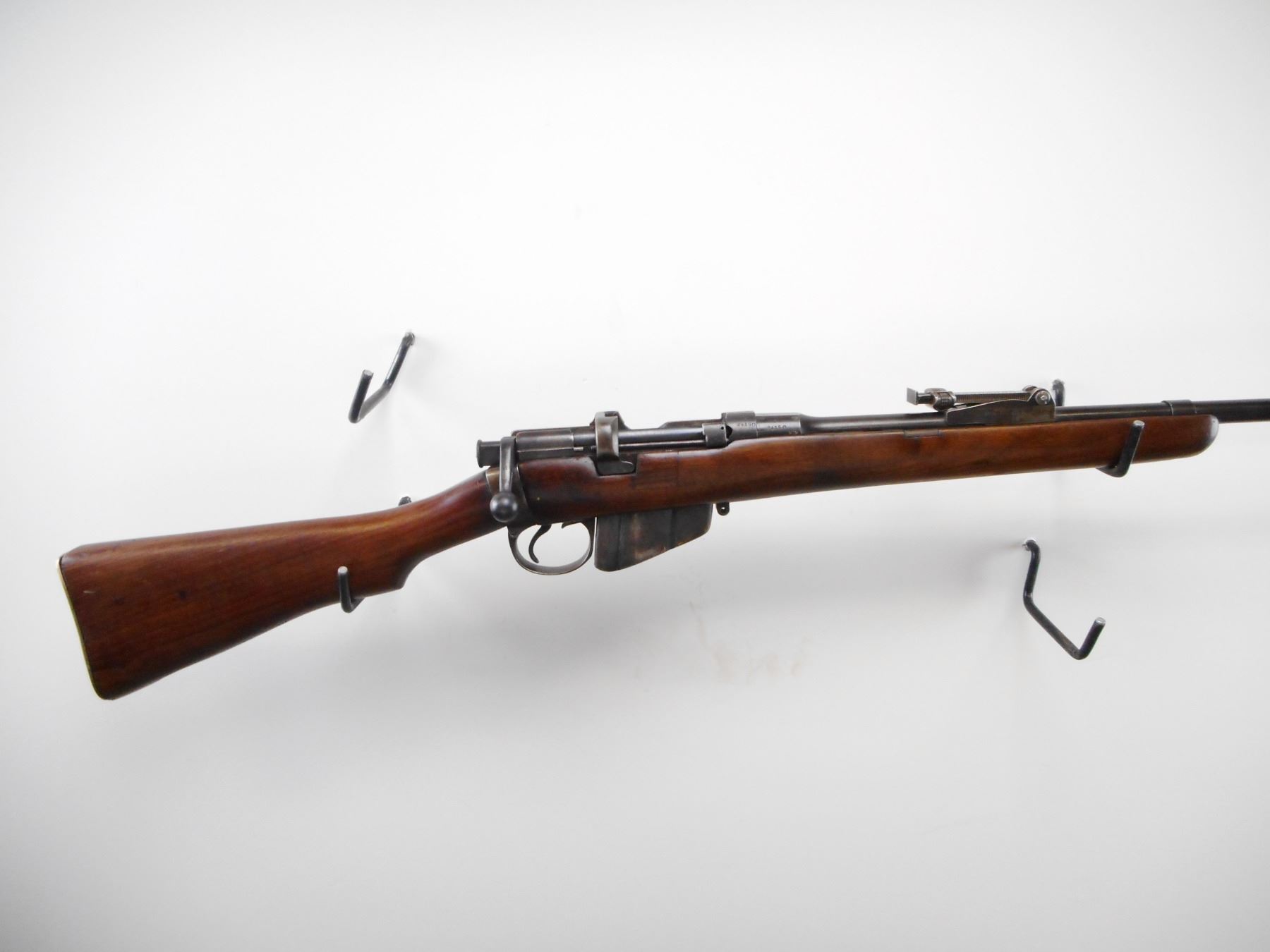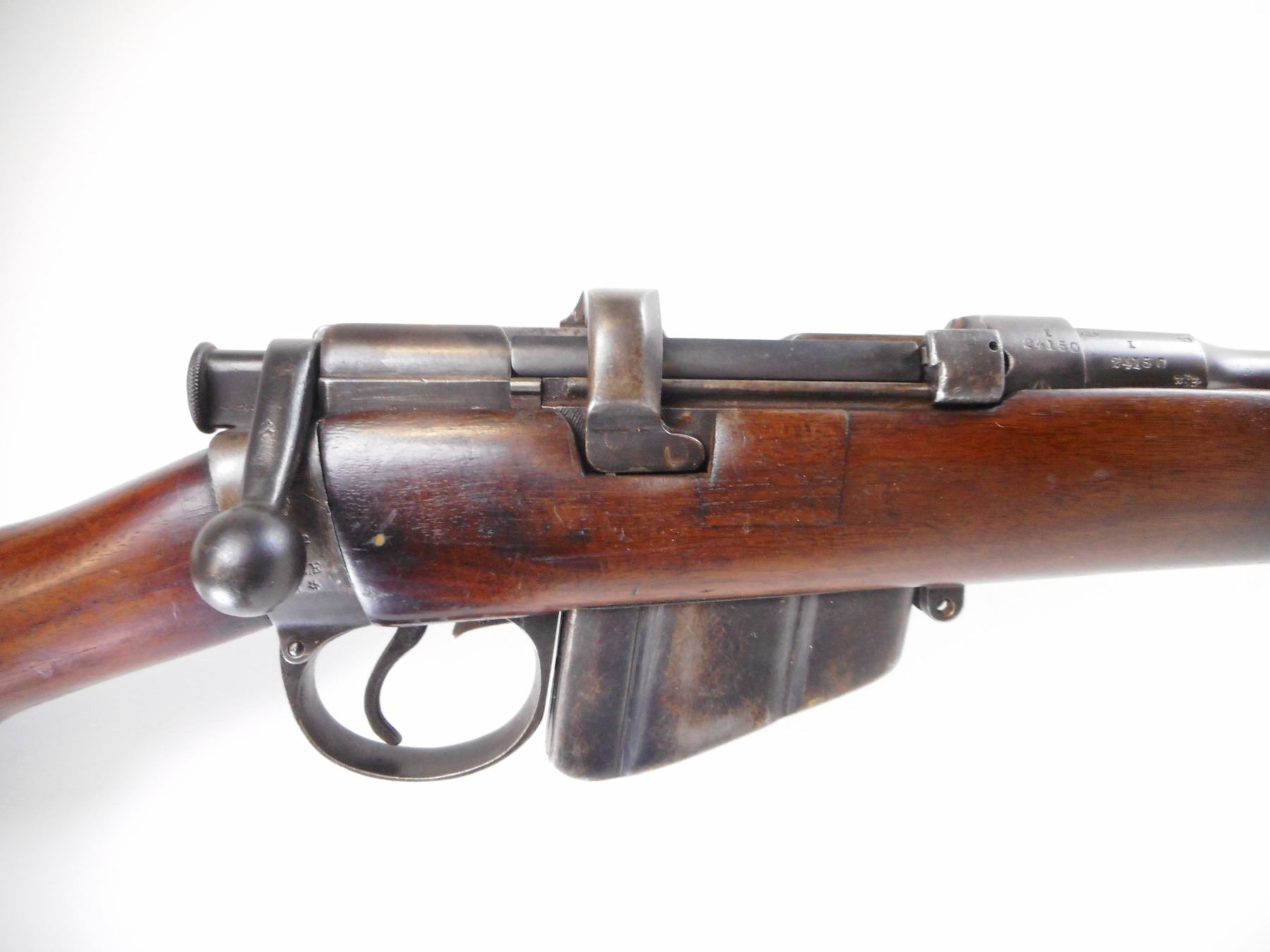 LEE ENFIELD , MODEL: NO1 MK3 SPORTER , CALIBER: 303 BR , COMES WITH MAGAZINE. BORE IS GOOD LIGHT PITTING. MFG'D BY BSA 1918. BOLT MISMATCHED. RECEIVER AND BARREL MARKED WITH C-BROAD ARROW. "CANADIAN OWNERSHIP" BROAD ARROW CN " CANADIAN NAVY". BLADE FRONT SIGHT WITH RAMP. U NOTCH ADJUSTABLE REAR SIGHT. TWO PIECE SMOOTH WOOD STOCKS. BRASS BUTT PLATE WITH TRAP. METAL SHOWS HANDLING MARKS AND WEAR. STOCK SHOWS HANDLING MARKS AND WEAR. , ACTION: BOLT ACTION RIFLE , BARREL LENGTH: 25" , SERIAL # I24150 , CONDITION: 7/10 , CLASS: CANADIAN NON RESTRICTED CLASS